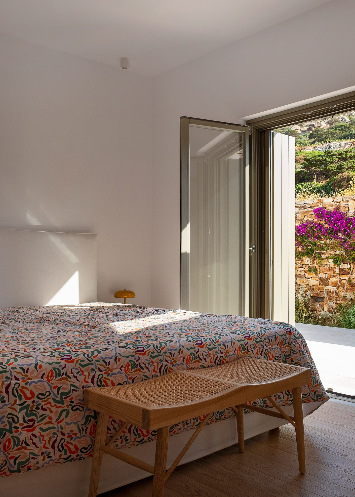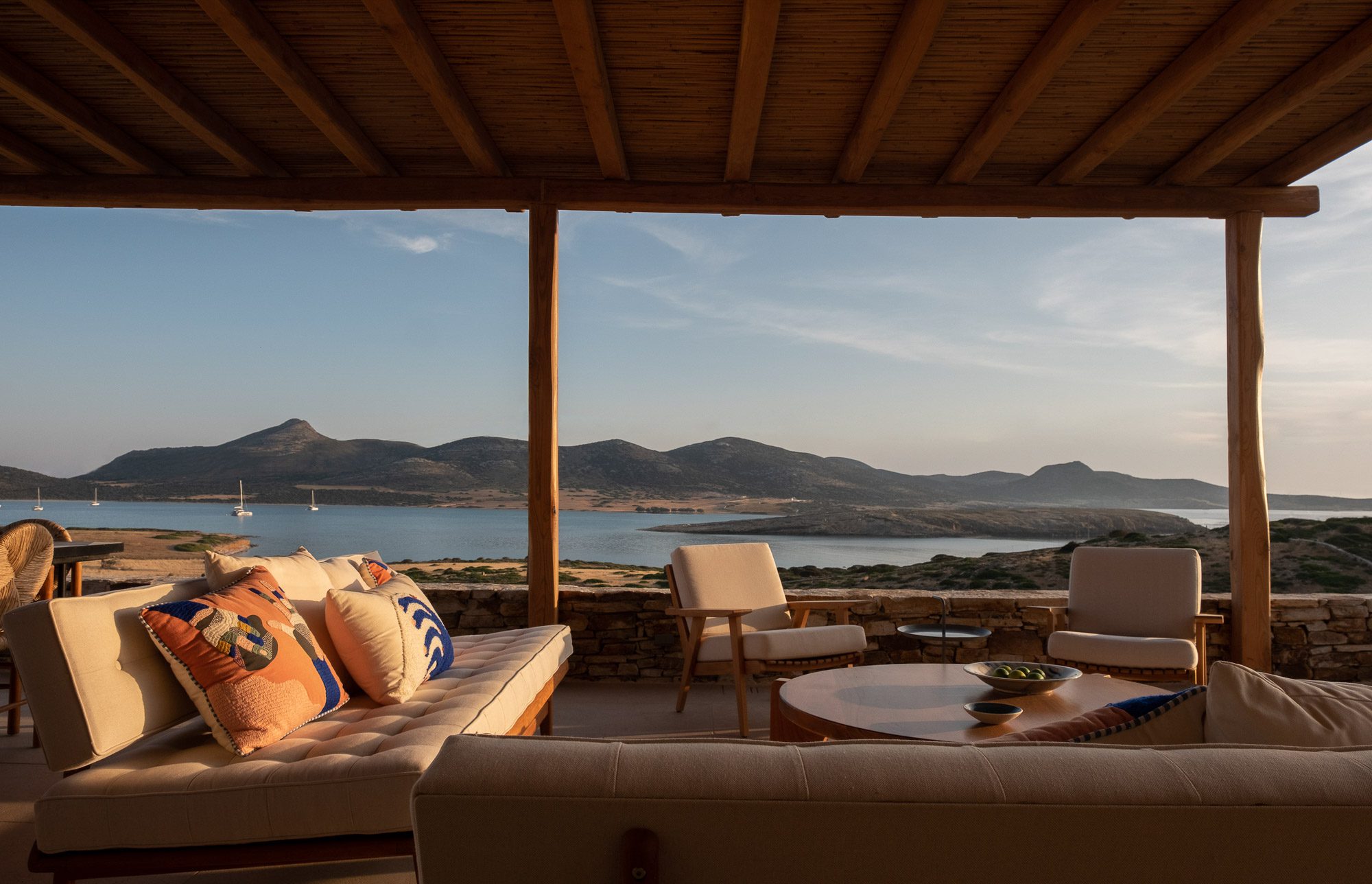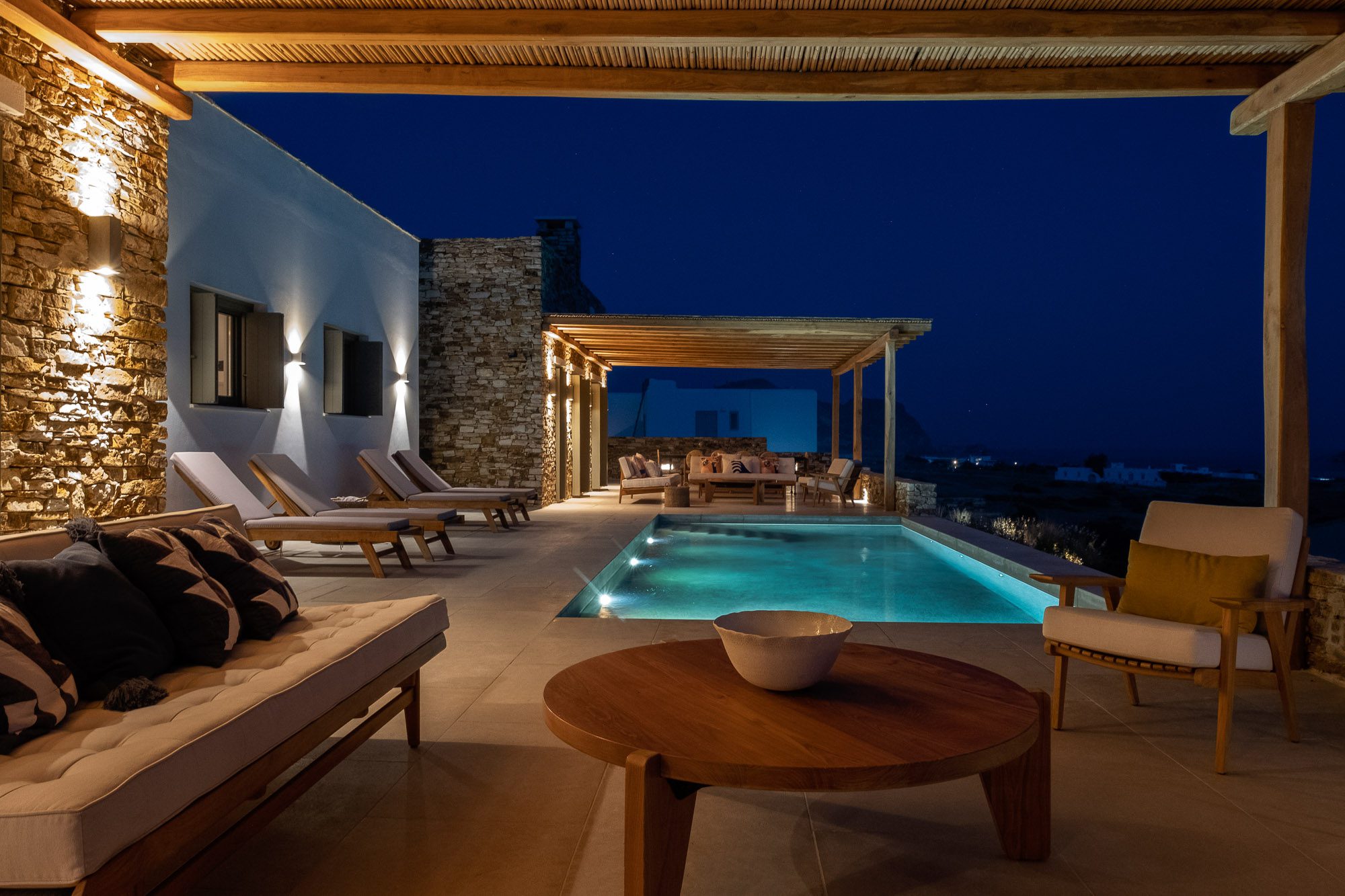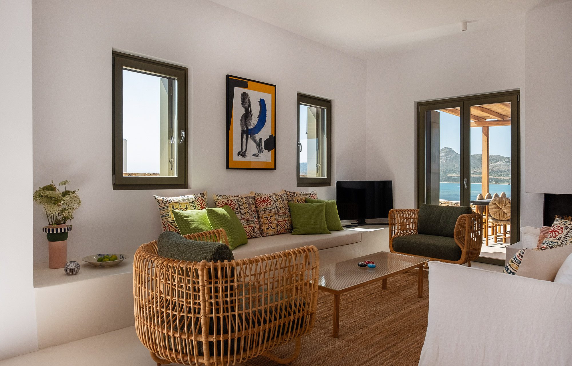 There are comfortable sun beds and a pool shower. Terraced patios are planted with an array of colourful indigenous plants and cacti. You could easily spend ages here just gazing across the plains at the sparkling waters of the Aegean.