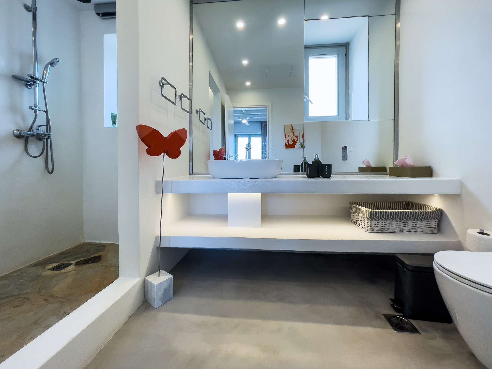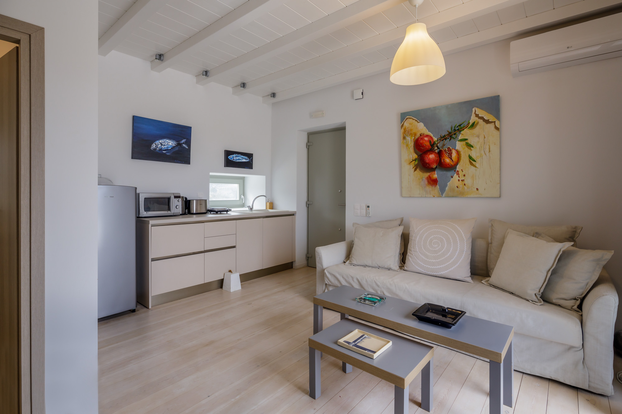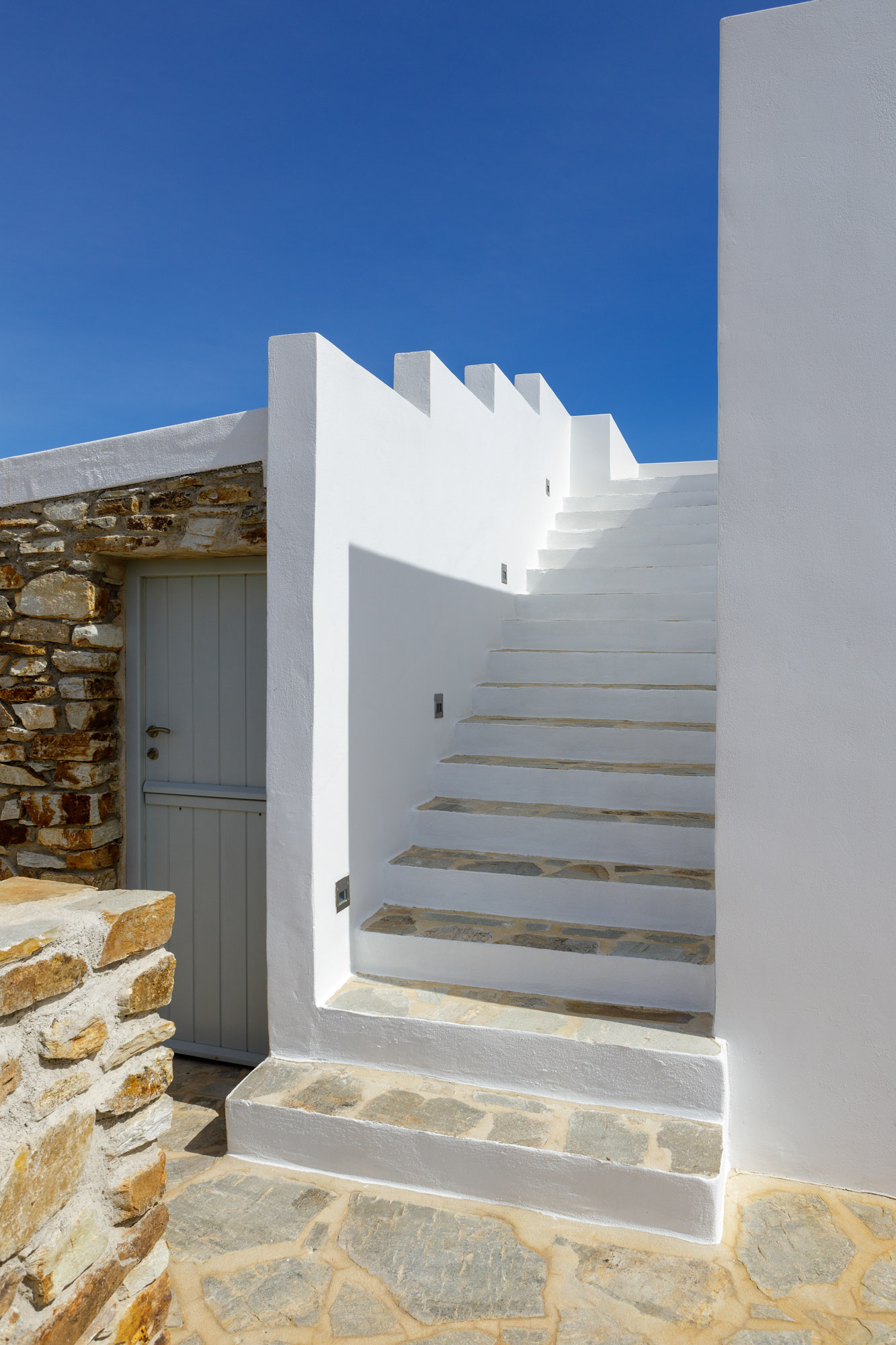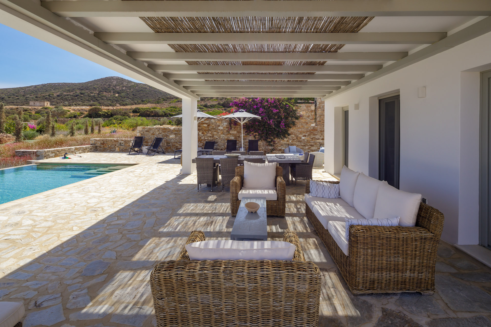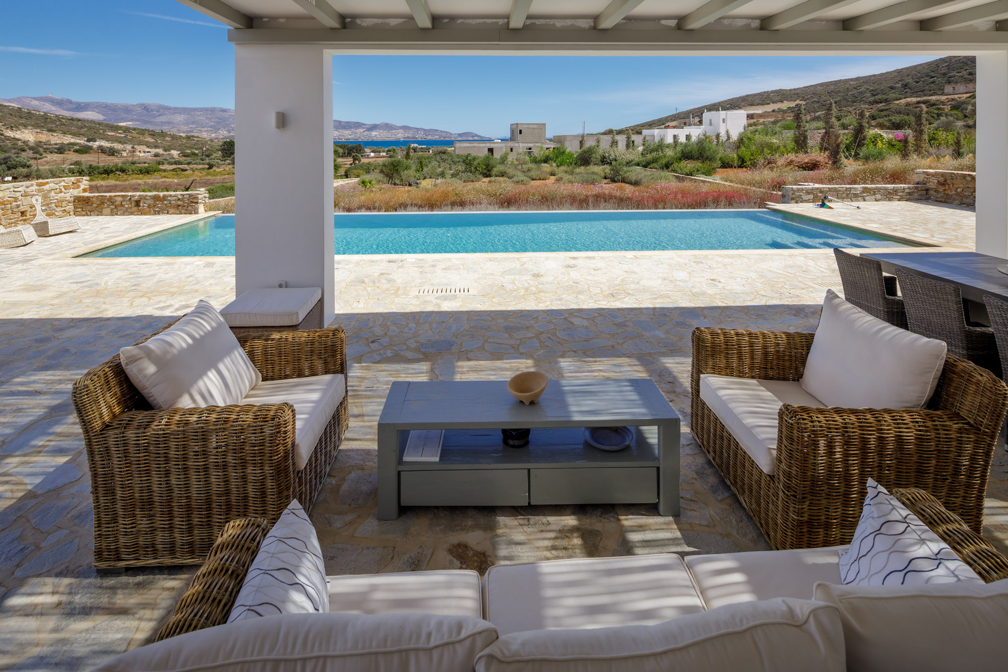 The closest beach on the eastern coast, Glyfa, is just 900m away, with crystal-clear waters and rugged, rocky hills all around, a wonderfully peaceful spot. The nearest taverna, Taverna Peramataki, is a short drive away near Soros beach. The busier port town of Antiparos is 4.5km away, just 10 minutes by car, offering a selection of eateries, a small marketplace, and a regular ferry service in the summer months to the nearby island of Paros.
