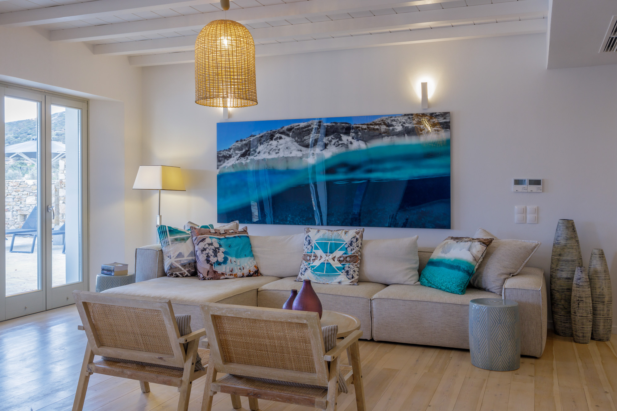 There is ample space for up to ten guests in four beautifully imagined bedrooms, one of which has its own sitting room with a fold-out sofa bed, kitchen and balcony. Each room is decorated with a piece of local artwork, breathing colour into an otherwise neutral space. The bedrooms are all ensuite and equipped with a television, air conditioning, and a silent ceiling fan. There is a large, open-plan living and dining area with a variety of seating choices and floor-to-ceiling windows that bathe the space in sunshine.