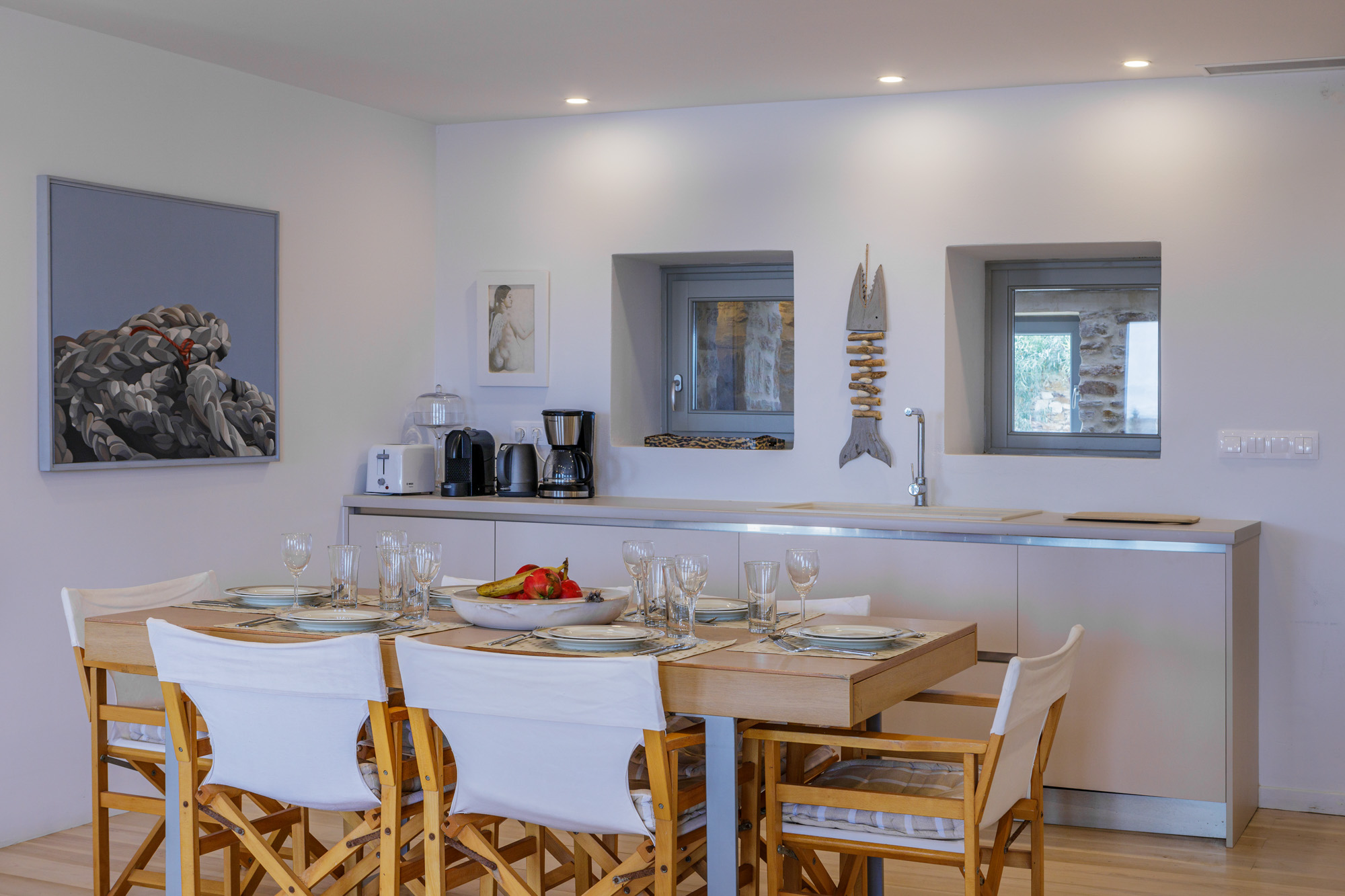 One of two adjacent villas, this modern, bright and airy house stands out for its high-quality amenities. Natural materials are used throughout, creating a soft aesthetic that blends seamlessly with the peaceful, rural surroundings.