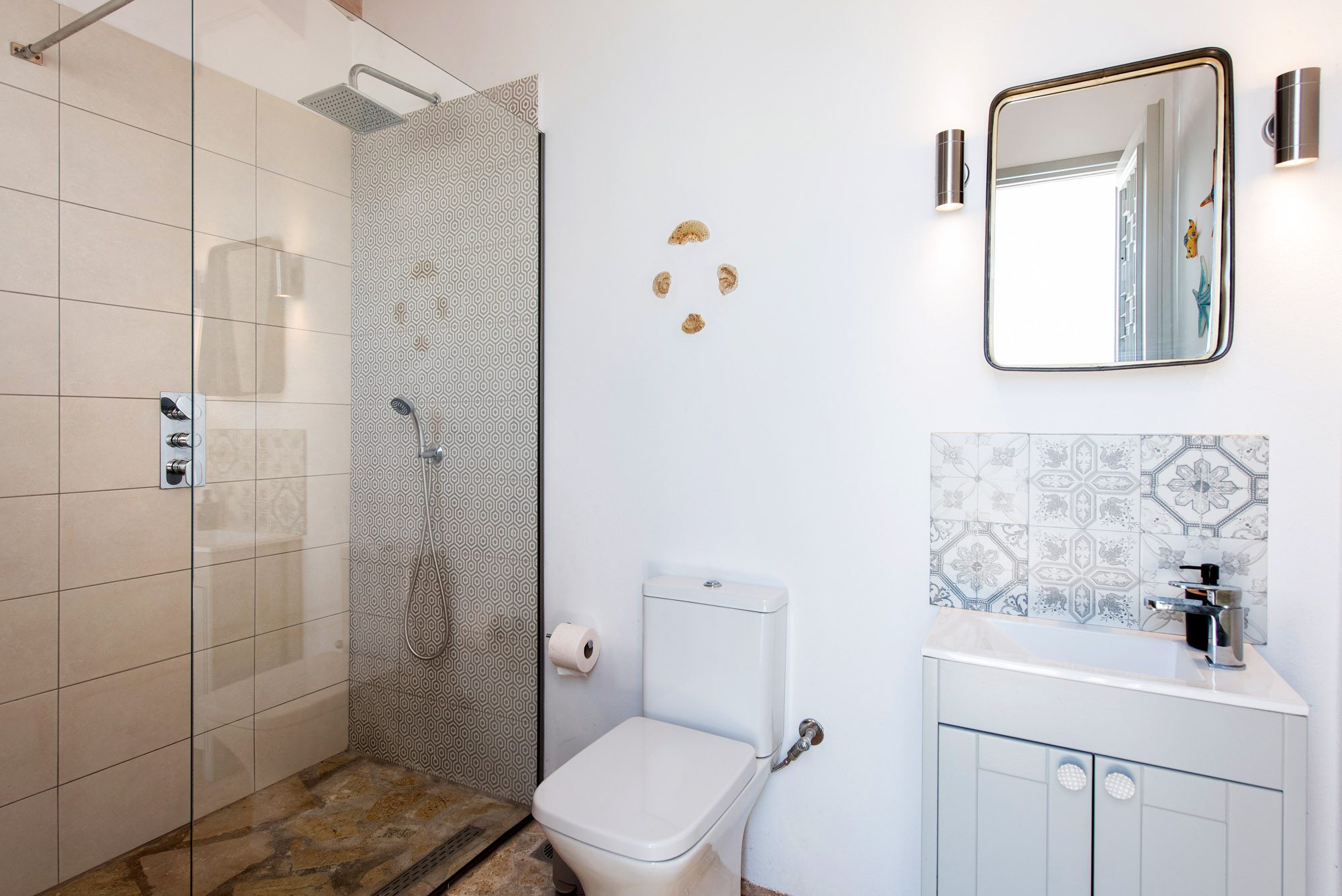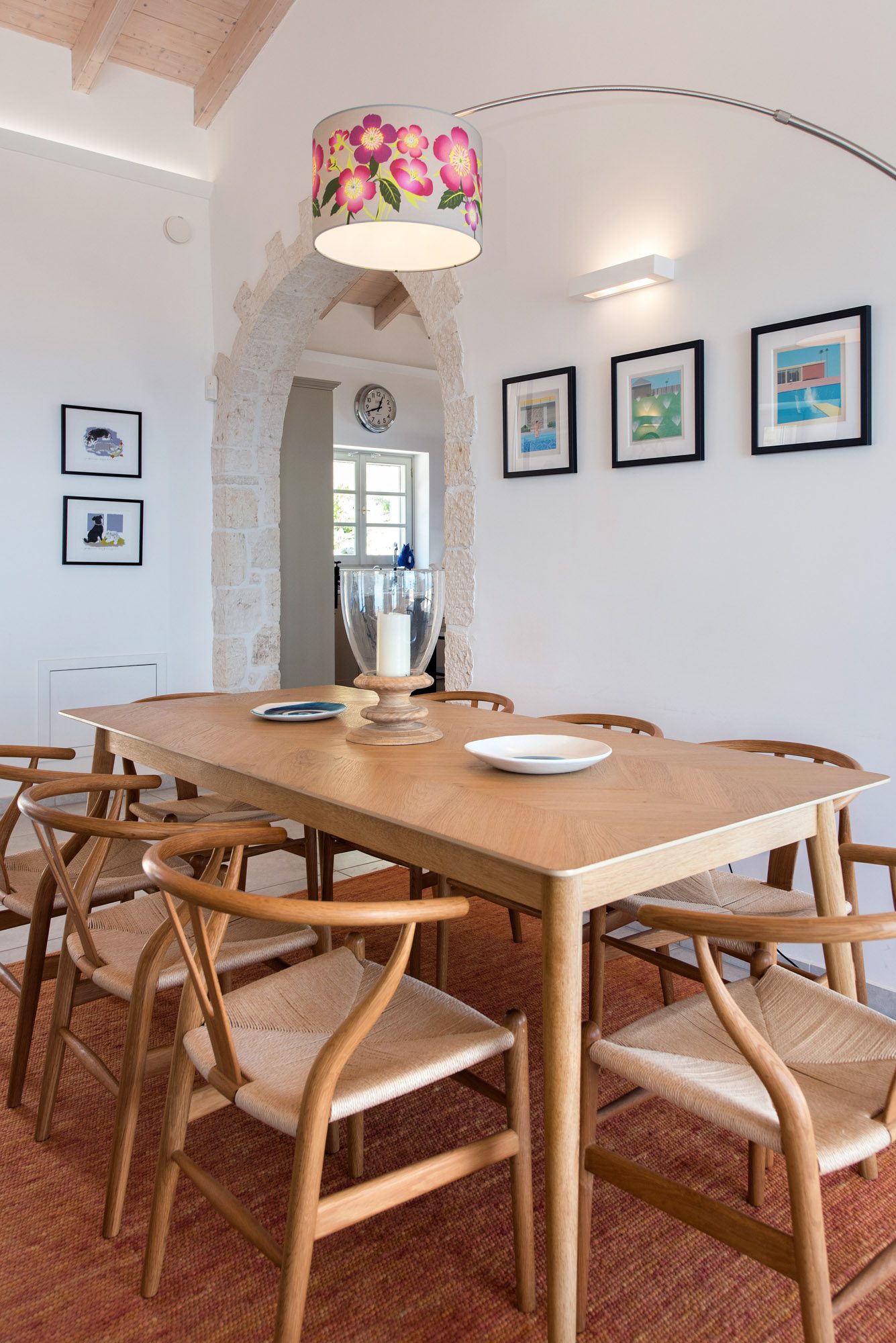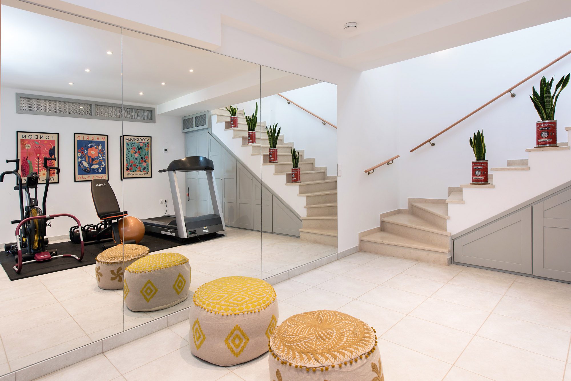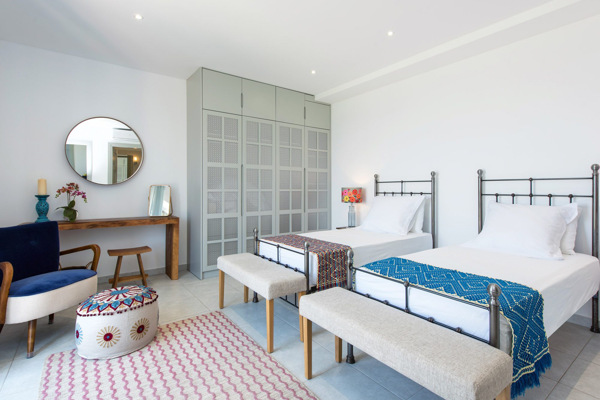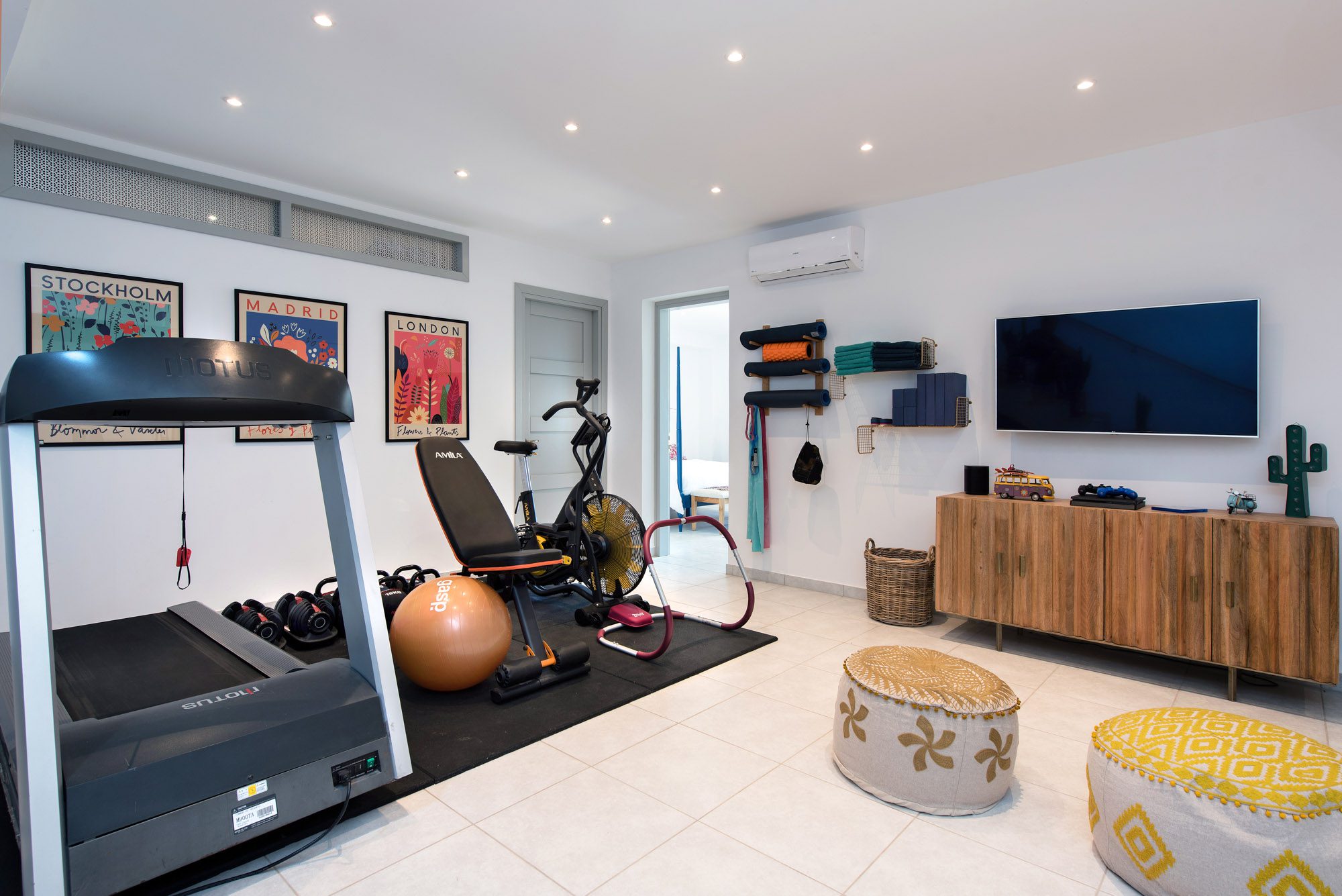 These work well with white walls, natural, wooden-beamed ceilings, and smart, contemporary furniture. Five good-sized bedrooms are spread across the two floors, all with outside terraces and one with a four-poster bed. There's also a large vaulted living room, with big blue sofas and a dining area, a well-equipped gym and TV games room, and a proper chef's kitchen.