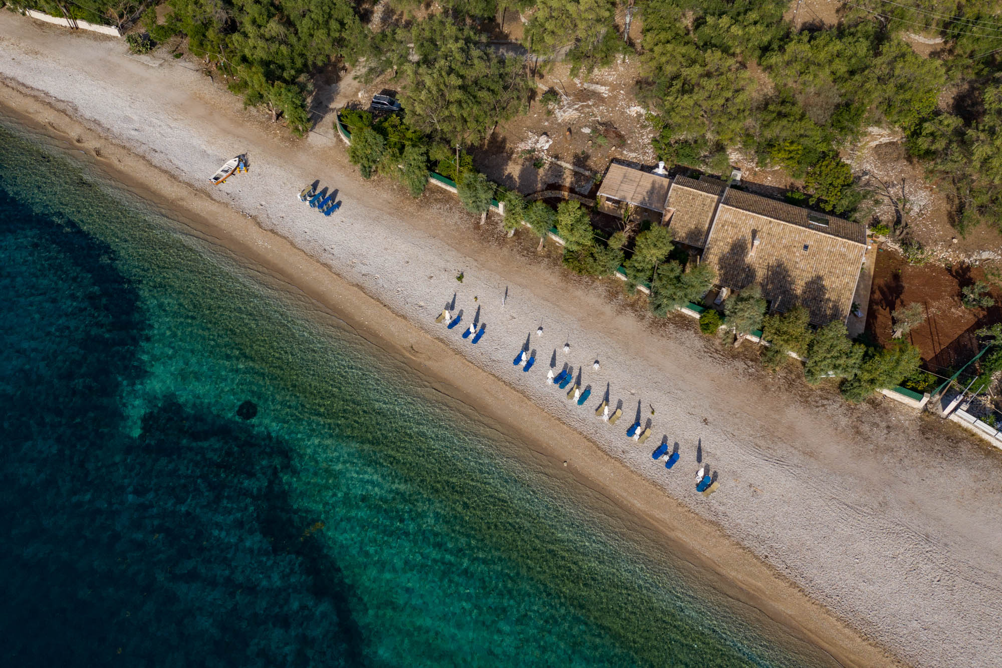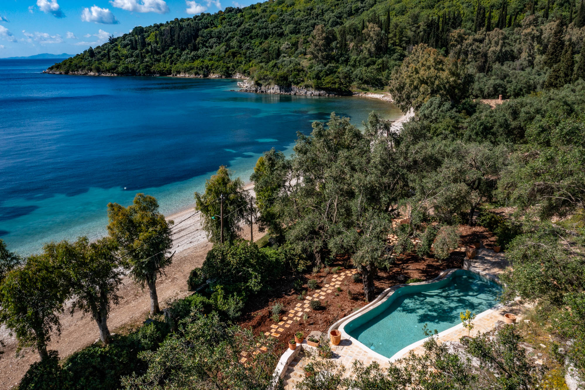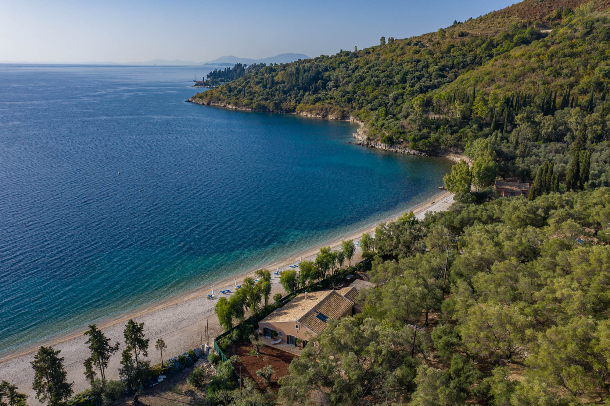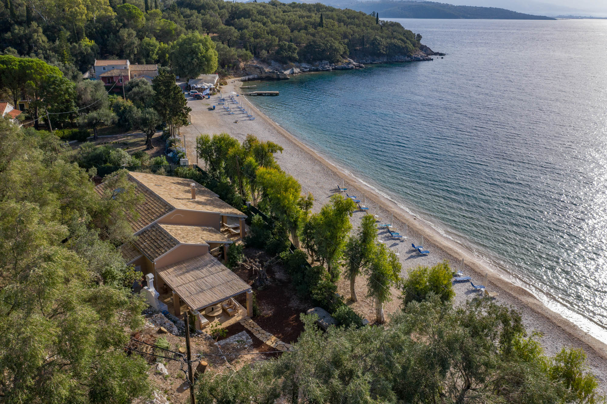 The four-bedroom house is situated on Kerasia beach and backs onto a large olive grove. Protected by a fence, the property retains privacy while being only a few steps away from the sea. Kerasia Tavena sits at the far end of the beach - family run and offering traditional dishes. It's a great spot for a long lunch or evening sundowners. Guests can also access the taverna’s wooden jetty for boat hire.