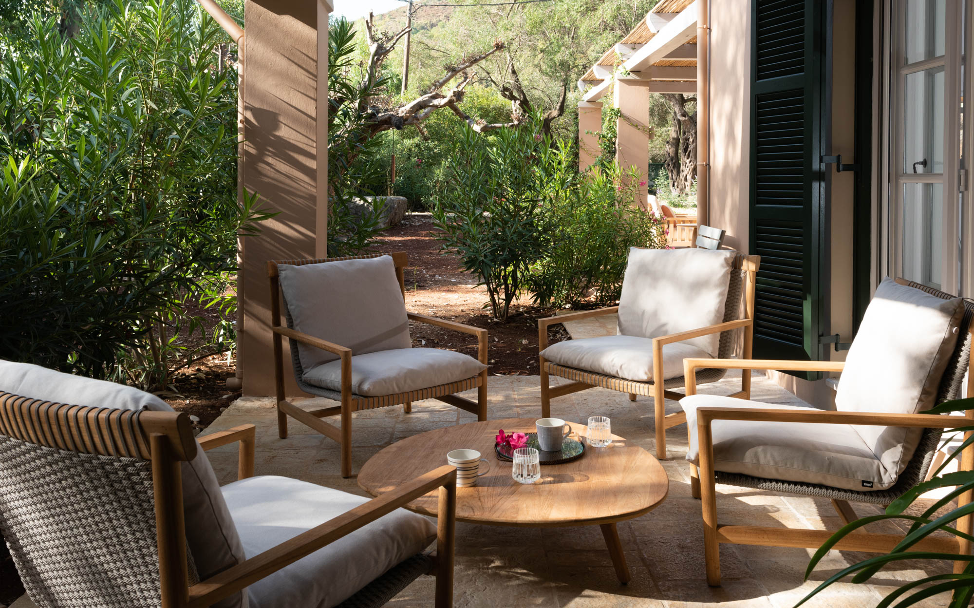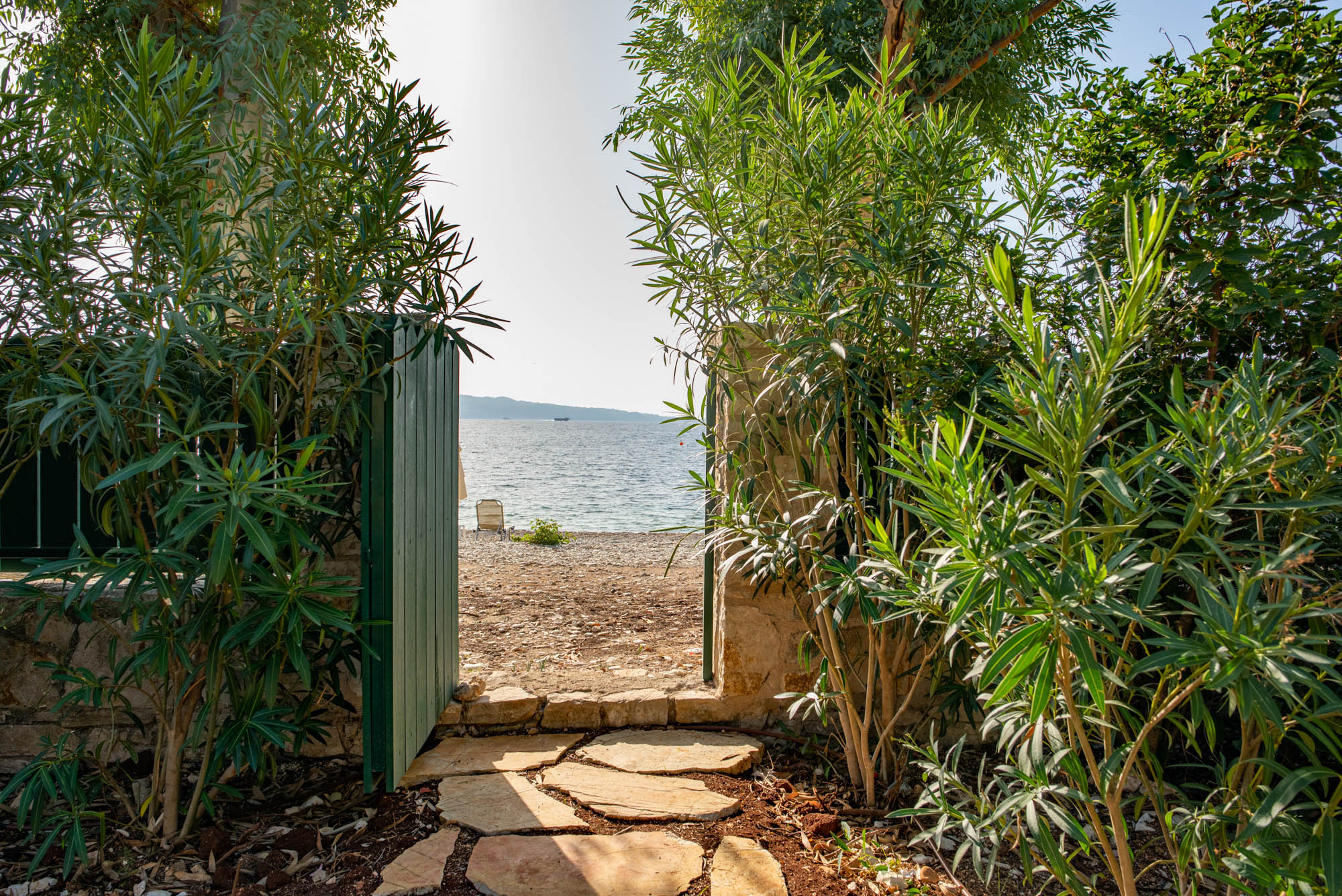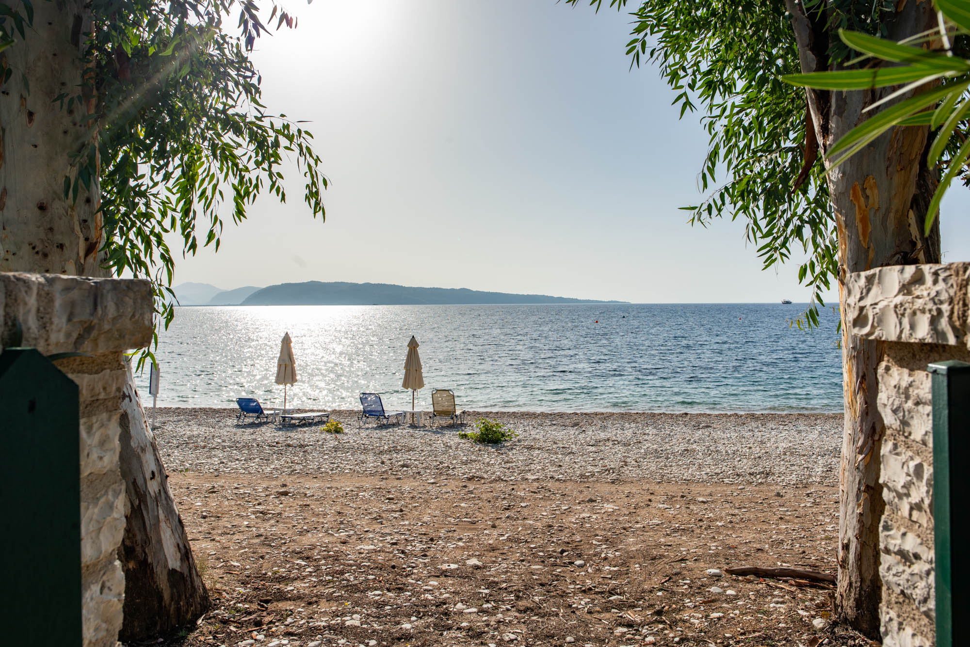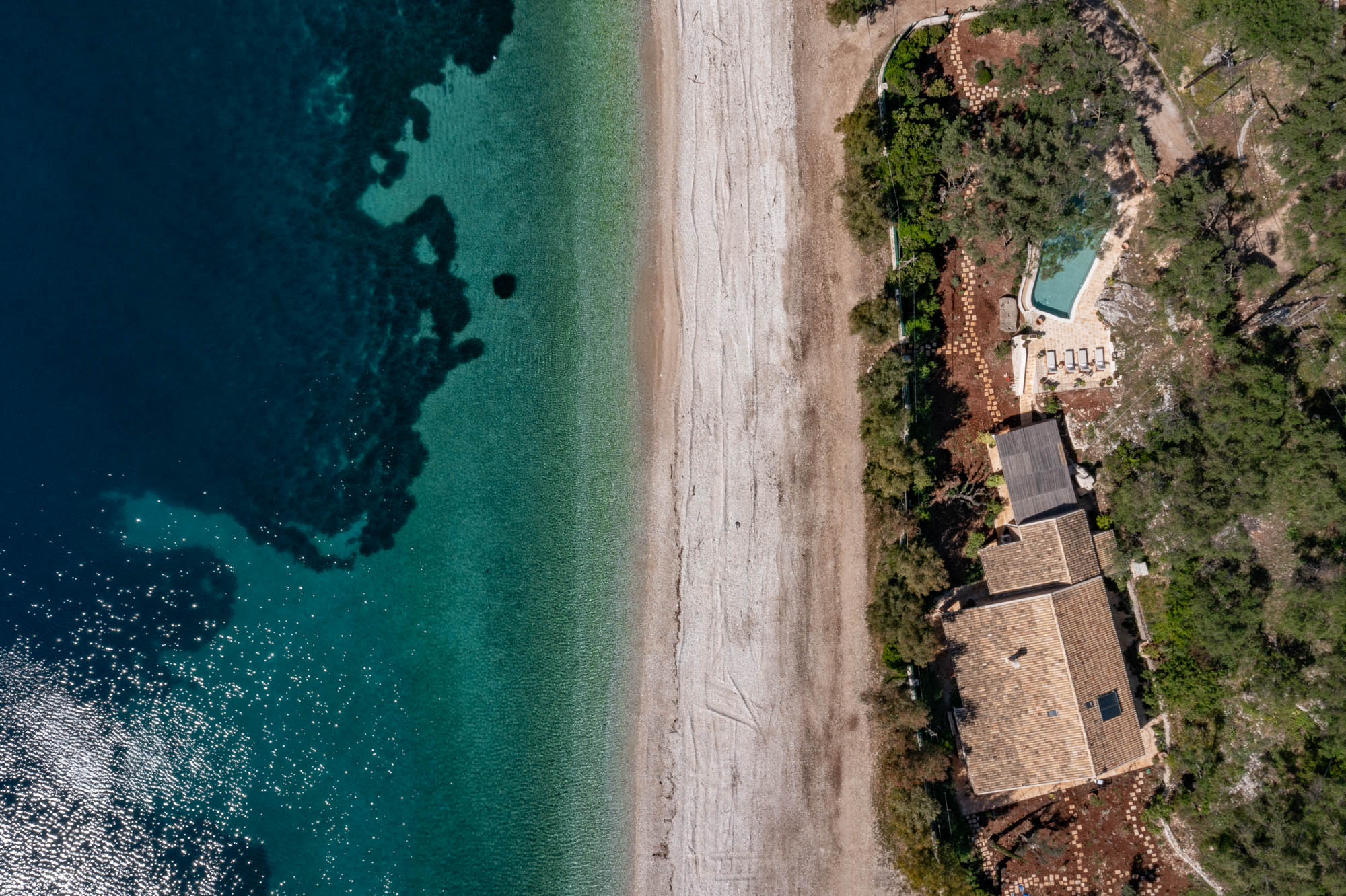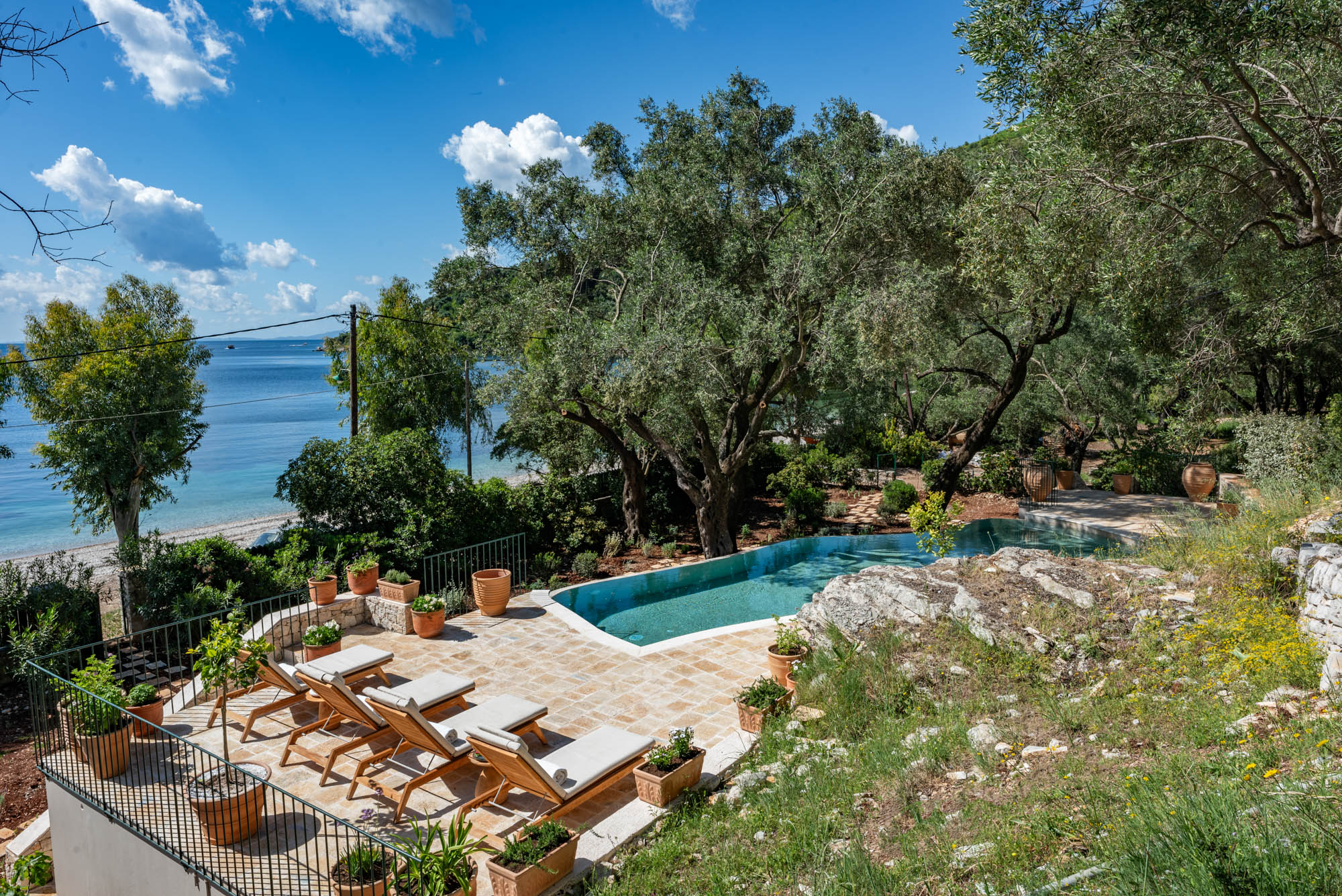 The four-bedroom house is situated on Kerasia beach and backs onto a large olive grove. Protected by a fence, the property retains privacy while being only a few steps away from the sea. Kerasia Tavena sits at the far end of the beach - family run and offering traditional dishes. It's a great spot for a long lunch or evening sundowners. Guests can also access the taverna’s wooden jetty for boat hire.