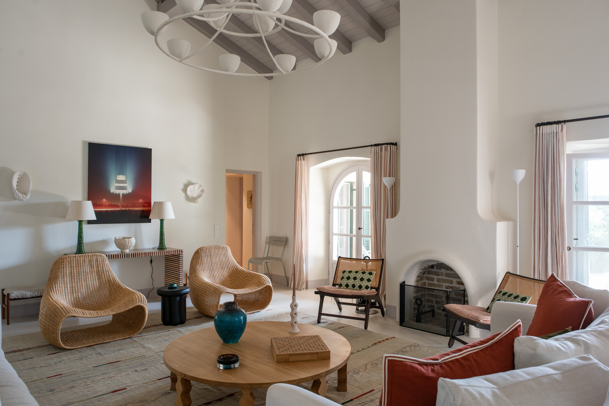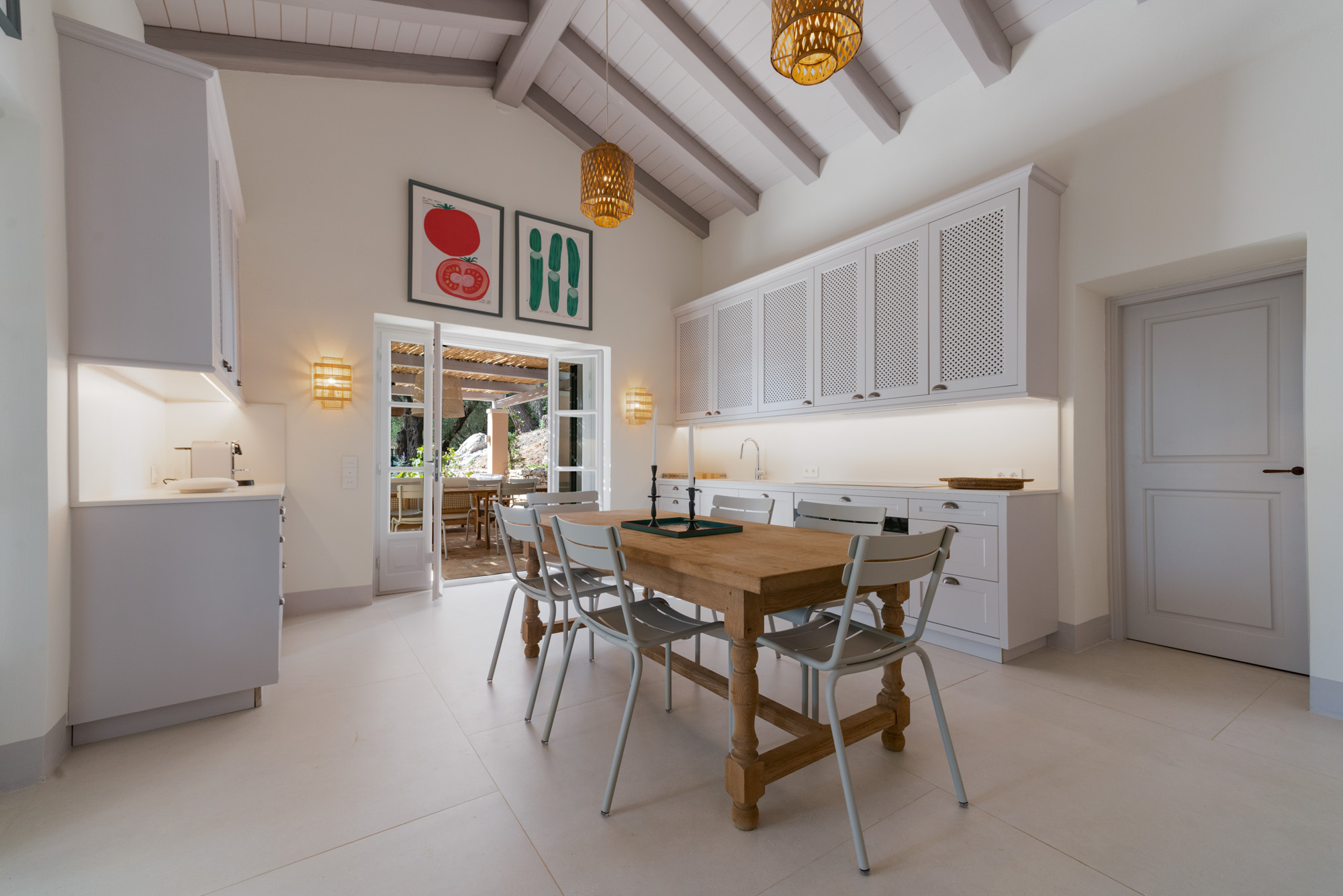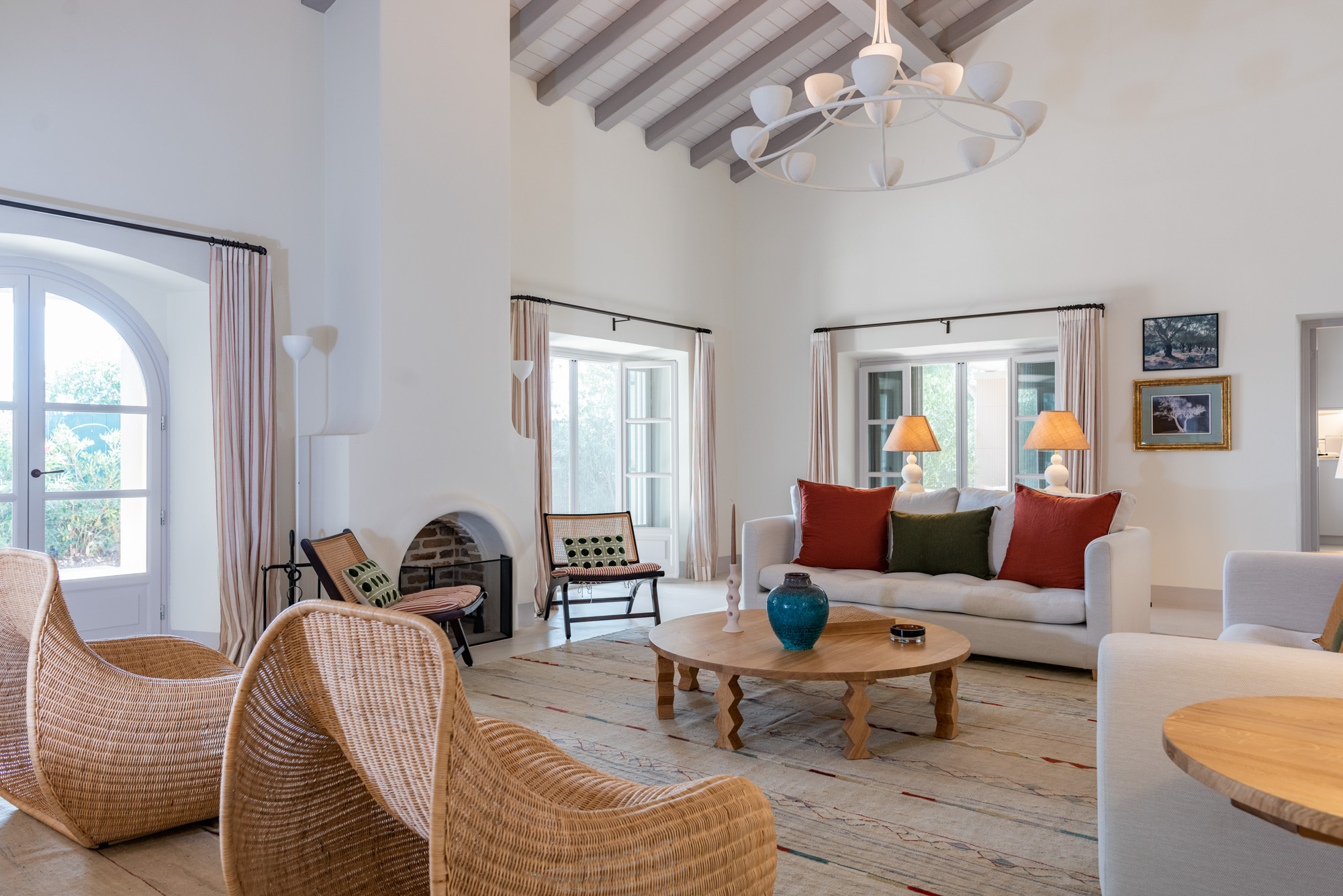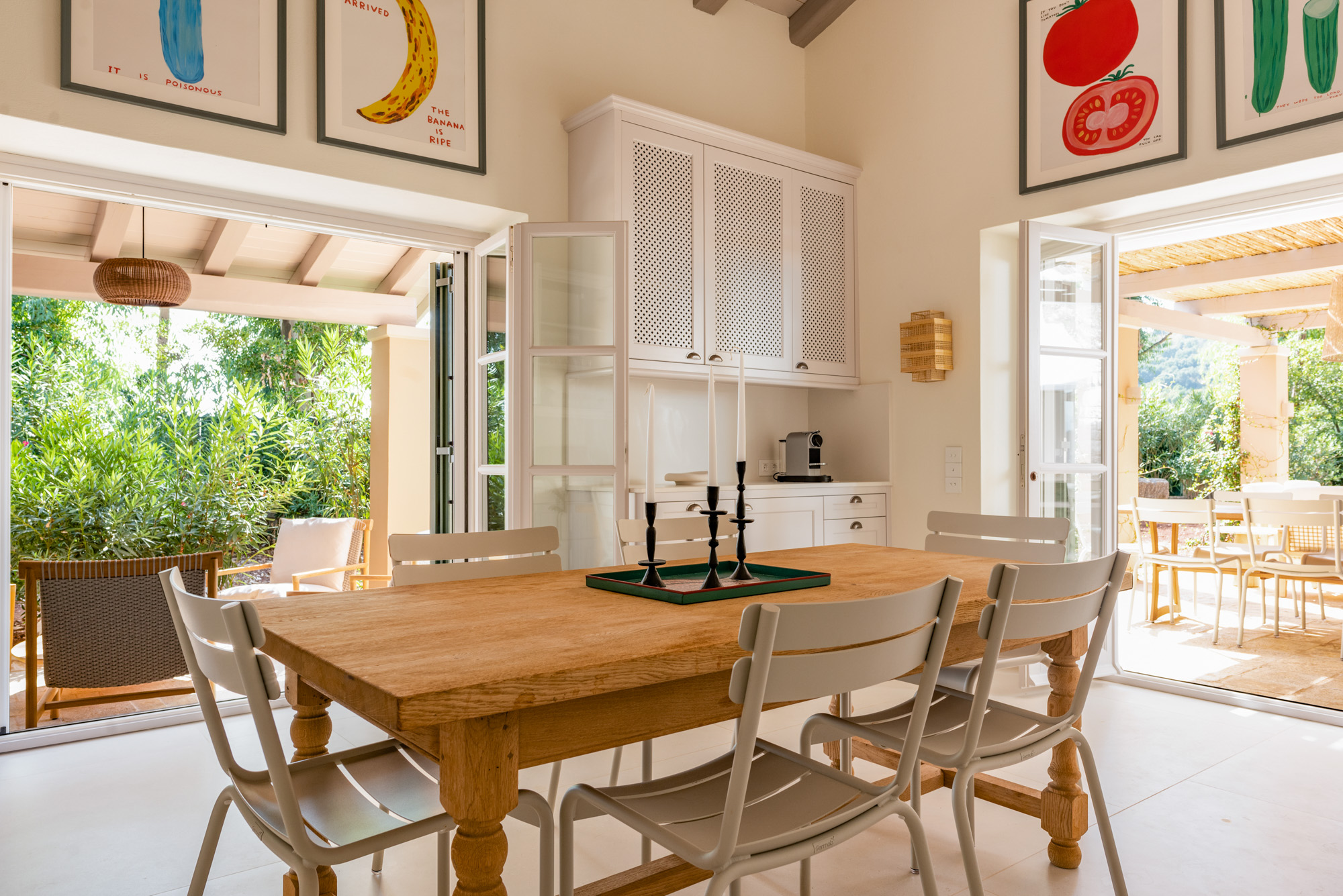 Pale walls set off interesting pieces of furniture and decorative art, creating a tapestry of texture and pattern with a fresh, contemporary feel. A bright, modern kitchen has a double-height ceiling, walls adorned with colourful prints, and an airy indoor dining space. The large open-plan sitting room, with an open fireplace and eclectic mix of seating, has doors to the garden and terrace. The en-suite bedrooms are all air-conditioned and have access to the terrace. The beds are dressed in crisp white bed linen and beautiful fabric-covered headboards.