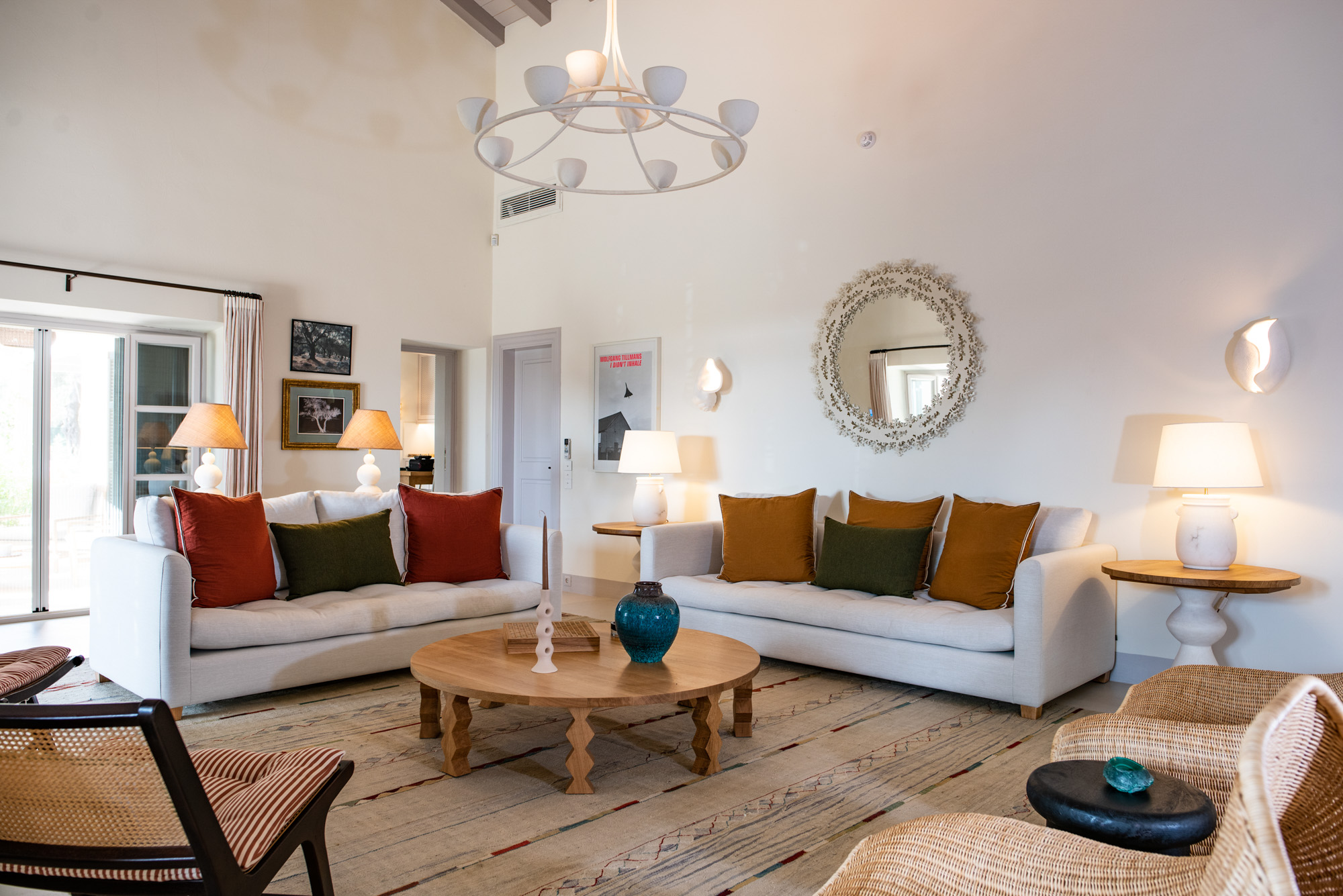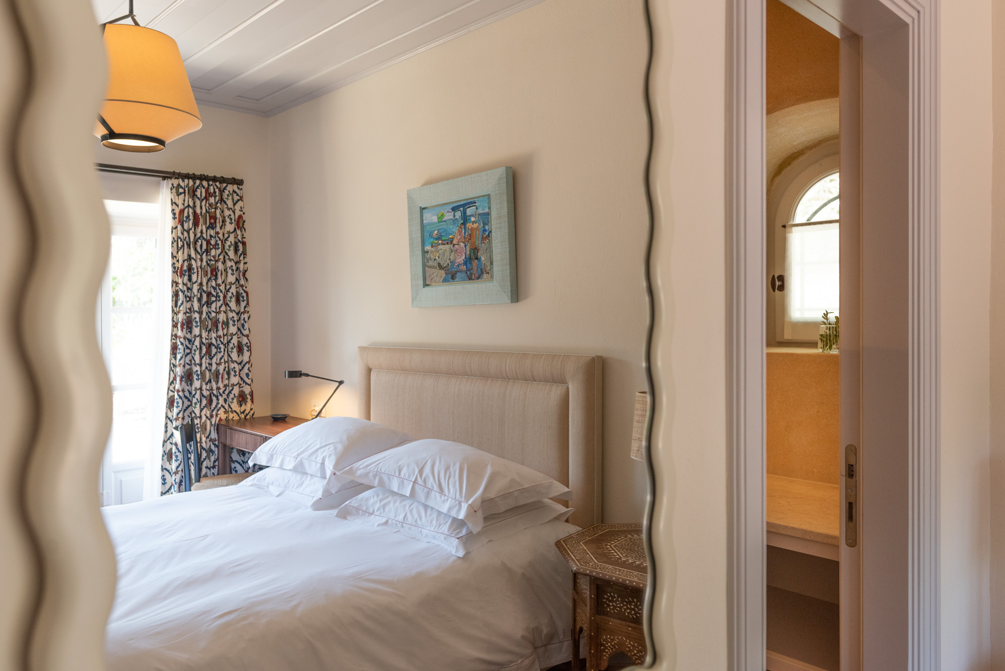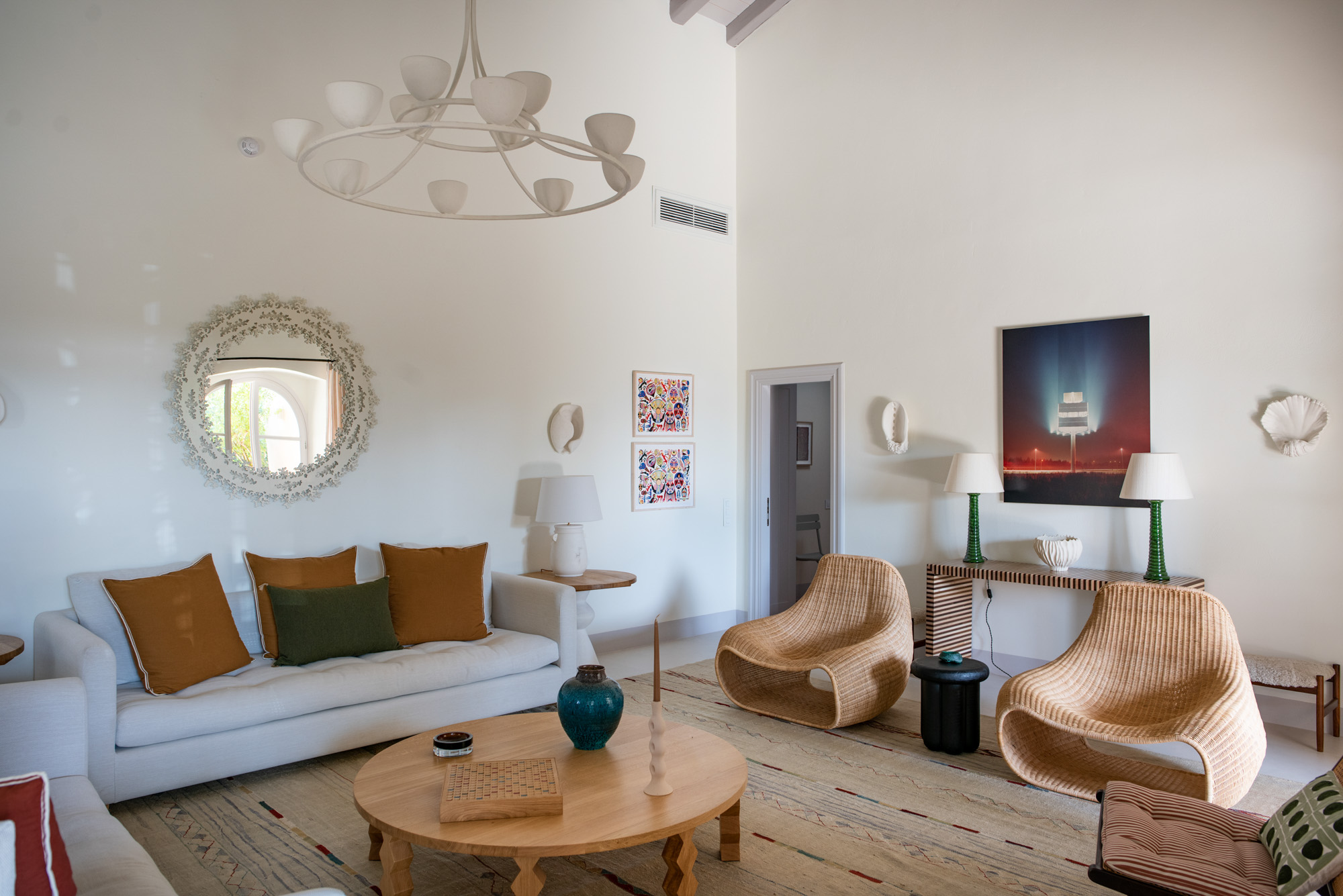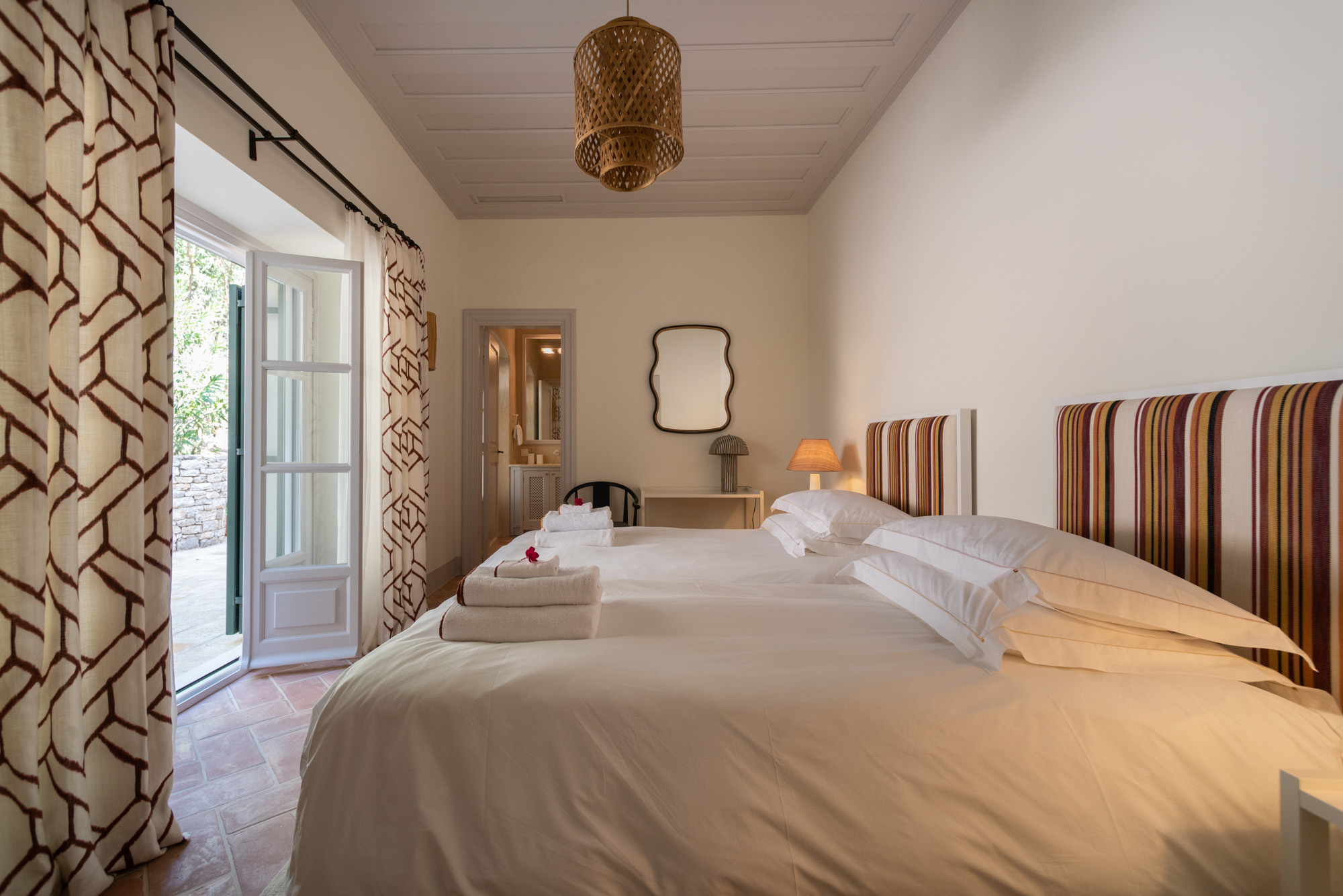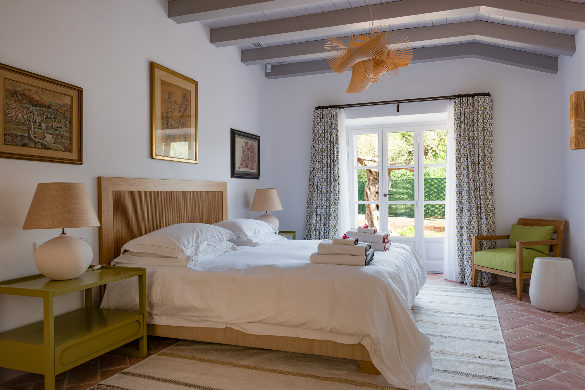 Pale walls set off interesting pieces of furniture and decorative art, creating a tapestry of texture and pattern with a fresh, contemporary feel. A bright, modern kitchen has a double-height ceiling, walls adorned with colourful prints, and an airy indoor dining space. The large open-plan sitting room, with an open fireplace and eclectic mix of seating, has doors to the garden and terrace. The en-suite bedrooms are all air-conditioned and have access to the terrace. The beds are dressed in crisp white bed linen and beautiful fabric-covered headboards.
