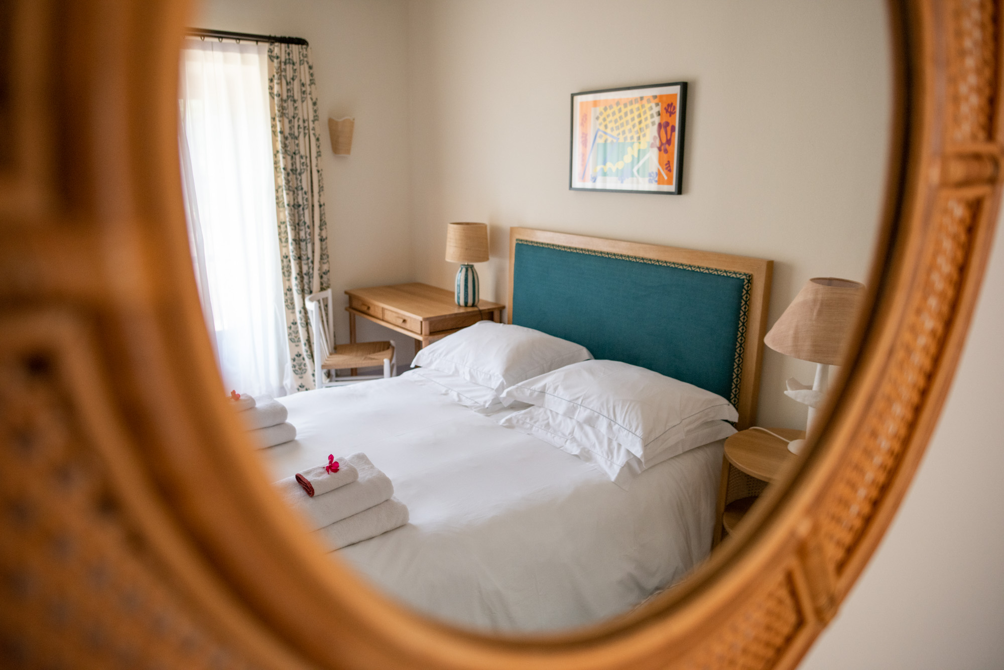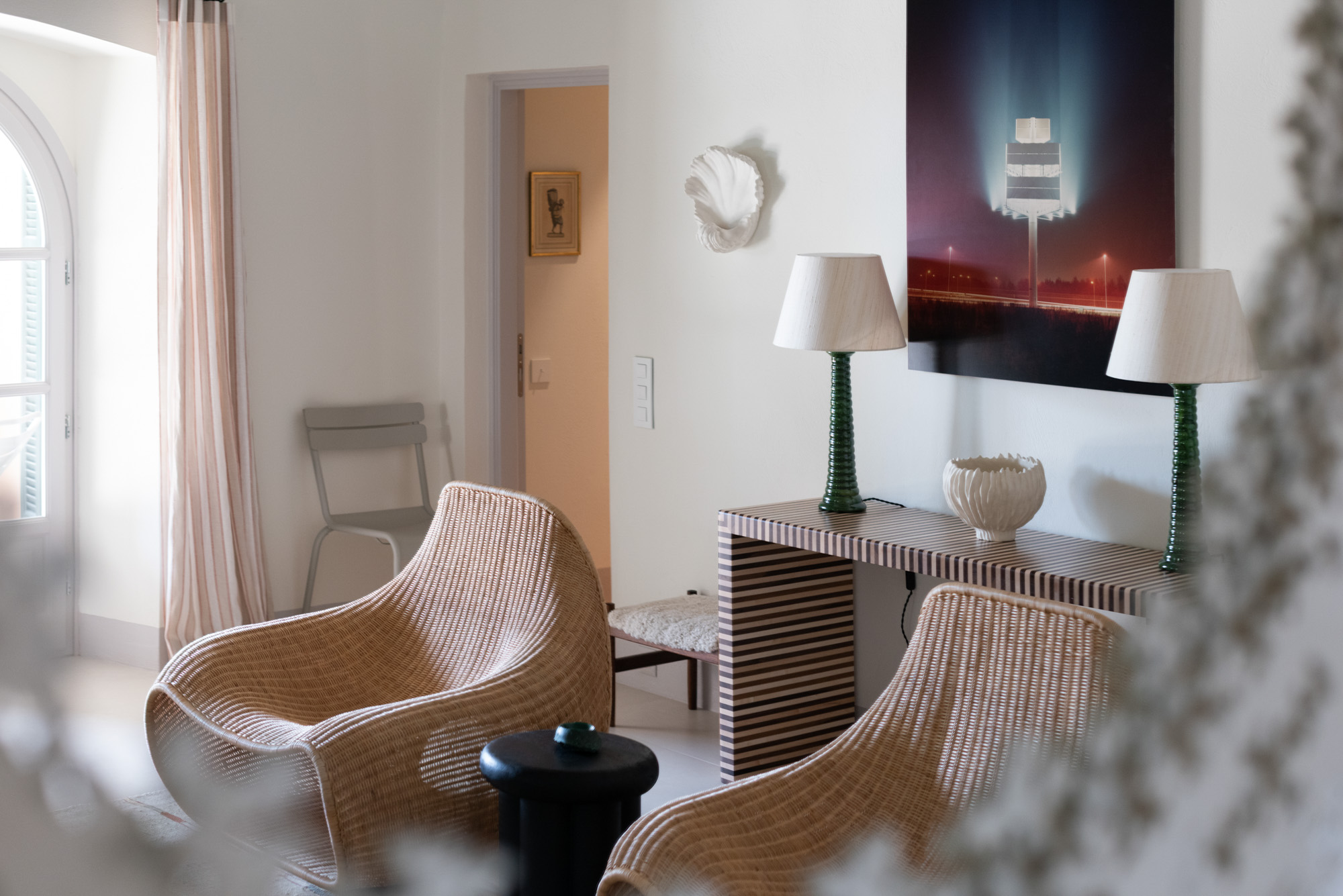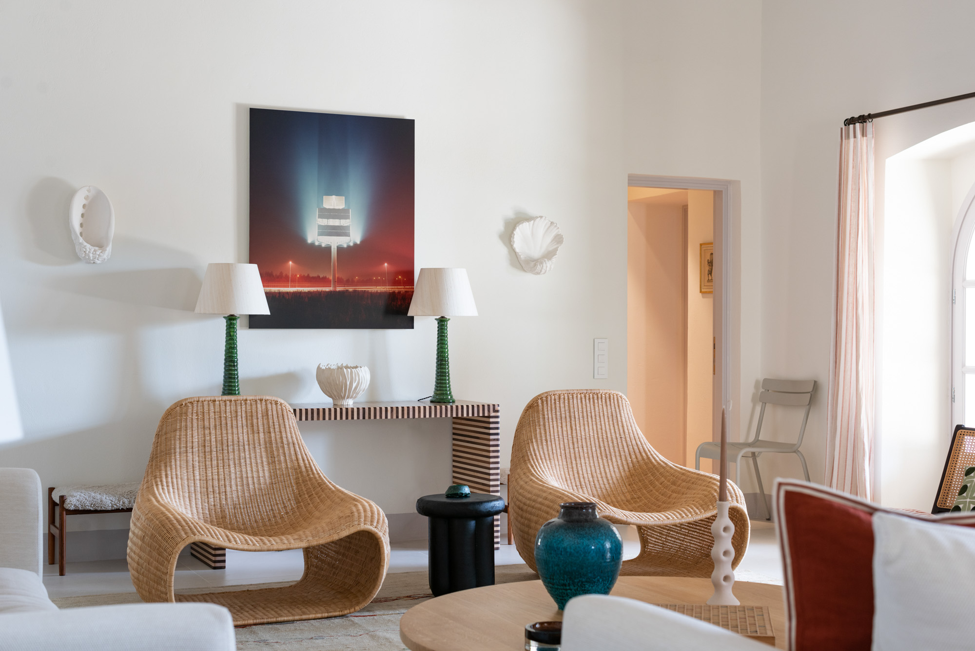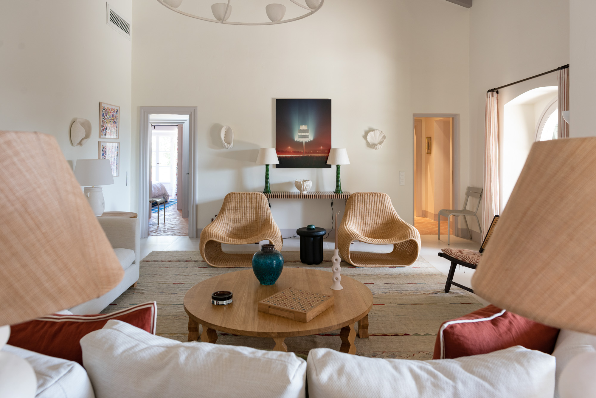 Pale walls set off interesting pieces of furniture and decorative art, creating a tapestry of texture and pattern with a fresh, contemporary feel. A bright, modern kitchen has a double-height ceiling, walls adorned with colourful prints, and an airy indoor dining space. The large open-plan sitting room, with an open fireplace and eclectic mix of seating, has doors to the garden and terrace. The en-suite bedrooms are all air-conditioned and have access to the terrace. The beds are dressed in crisp white bed linen and beautiful fabric-covered headboards.