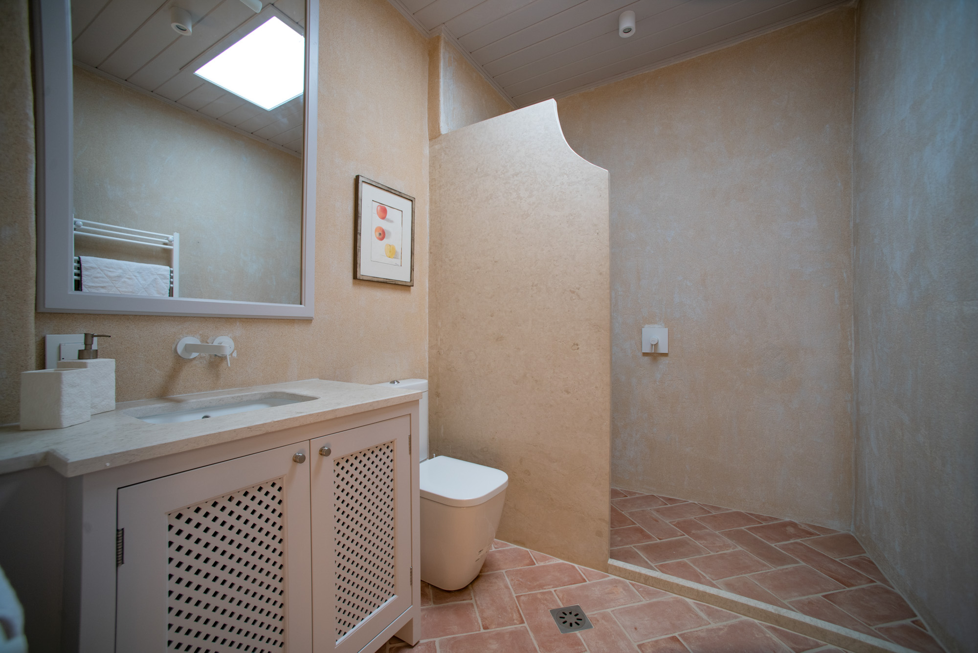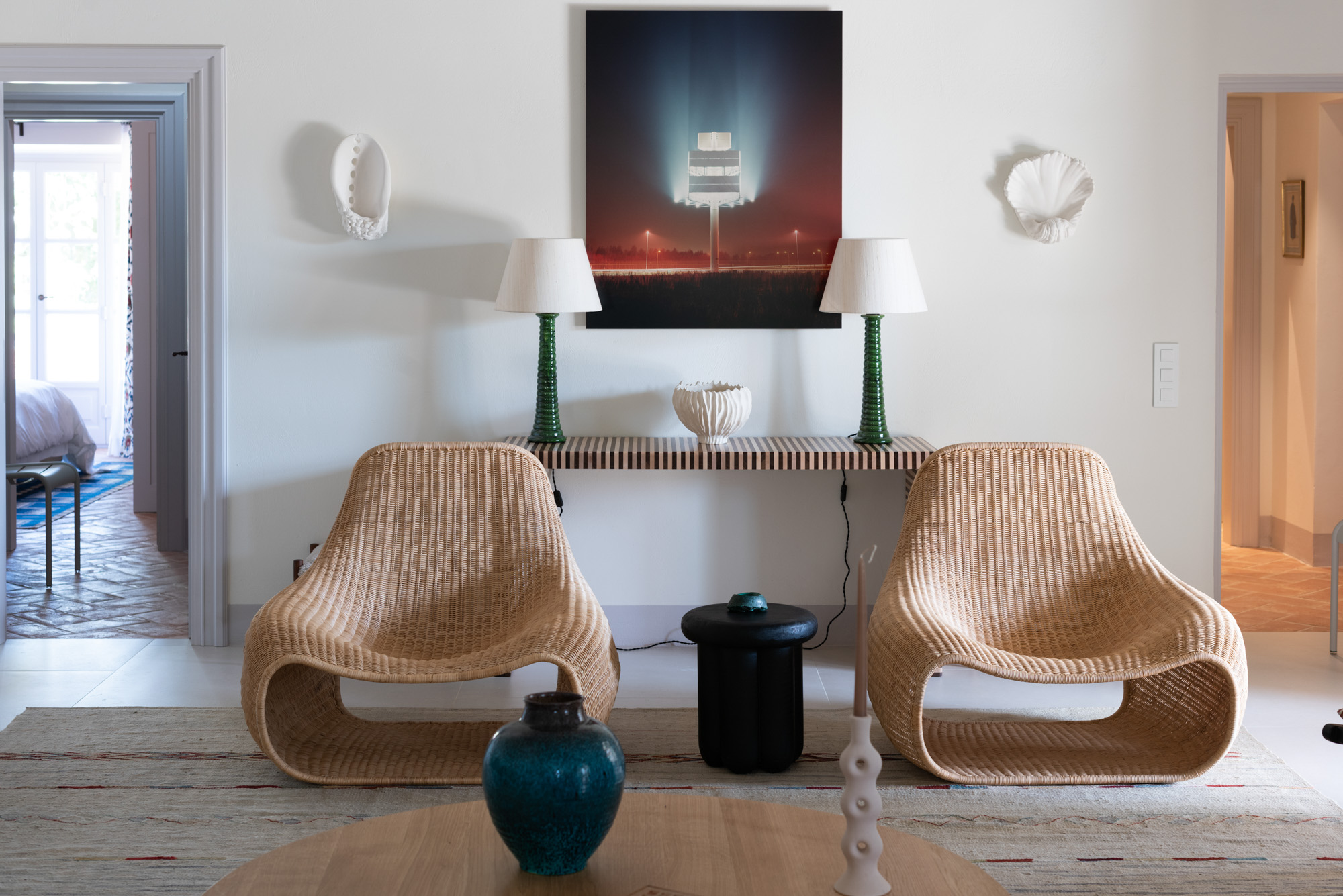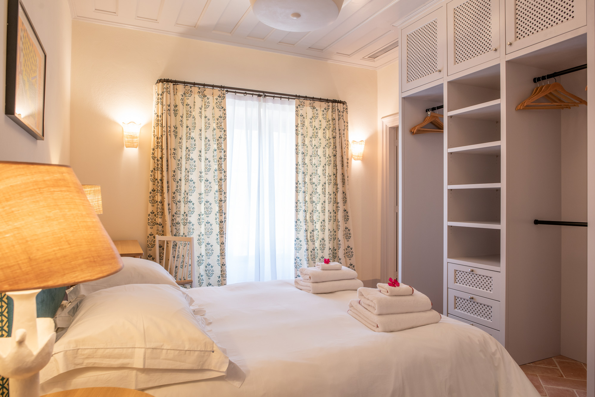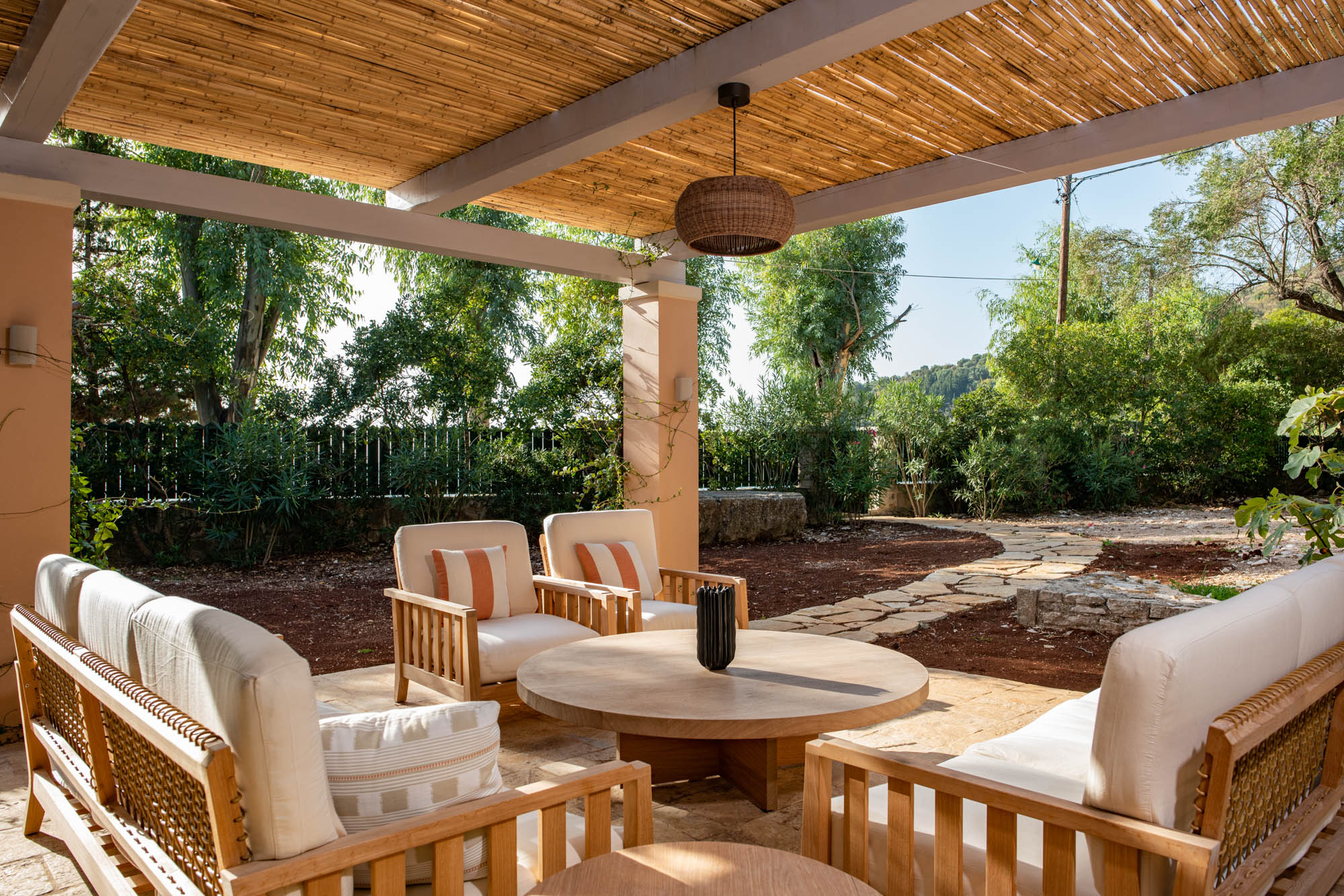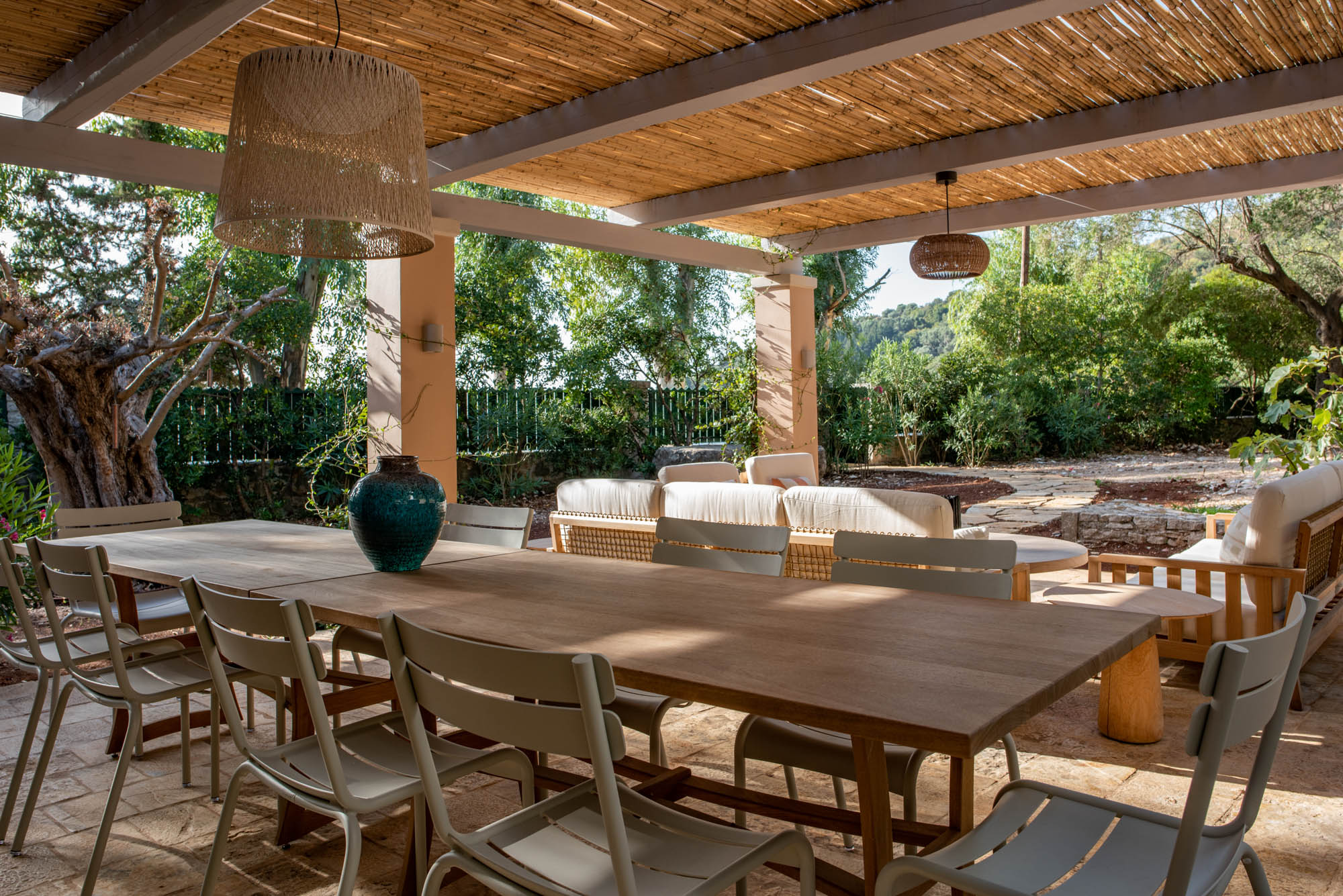 Pale walls set off interesting pieces of furniture and decorative art, creating a tapestry of texture and pattern with a fresh, contemporary feel. A bright, modern kitchen has a double-height ceiling, walls adorned with colourful prints, and an airy indoor dining space. The large open-plan sitting room, with an open fireplace and eclectic mix of seating, has doors to the garden and terrace. The en-suite bedrooms are all air-conditioned and have access to the terrace. The beds are dressed in crisp white bed linen and beautiful fabric-covered headboards.