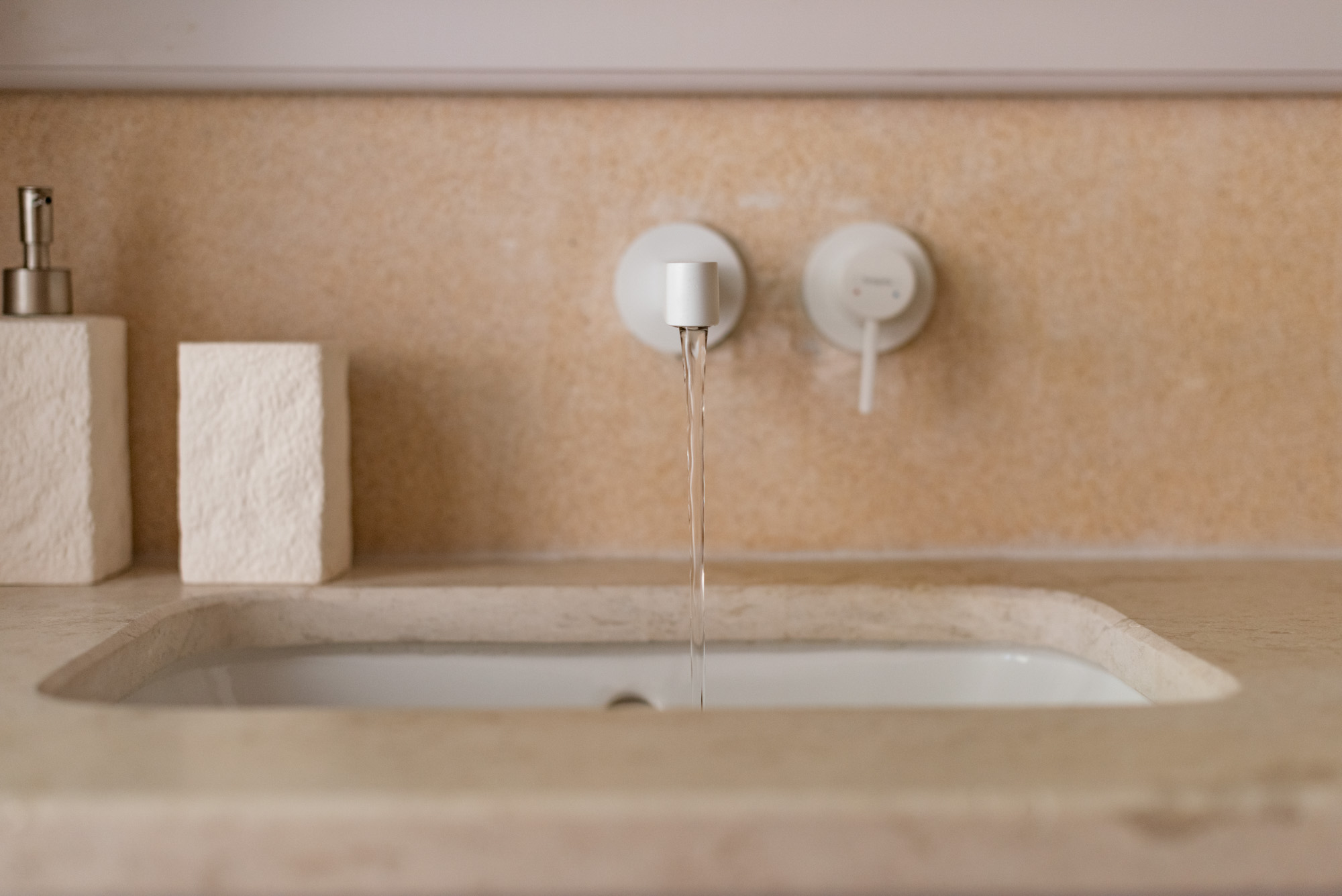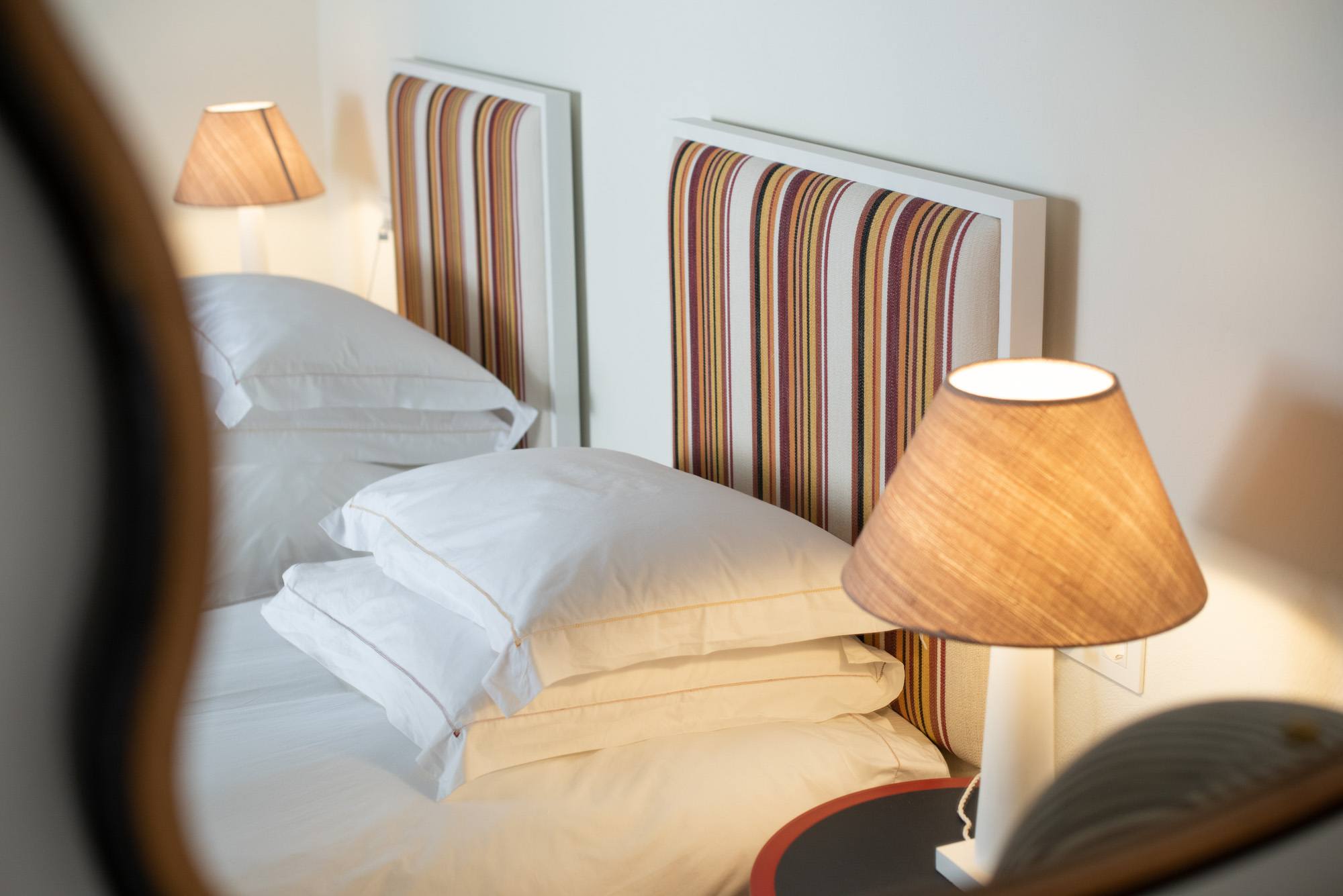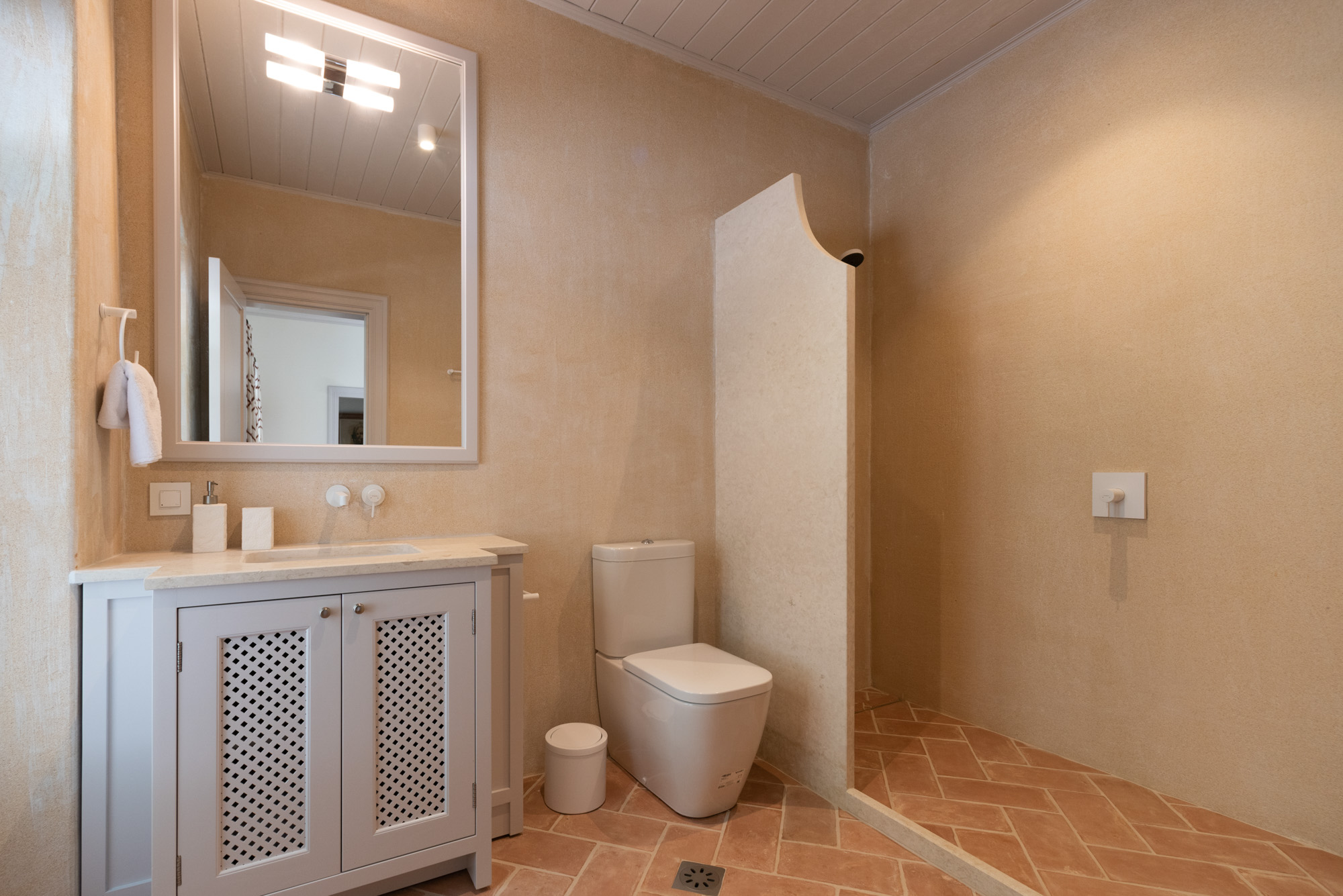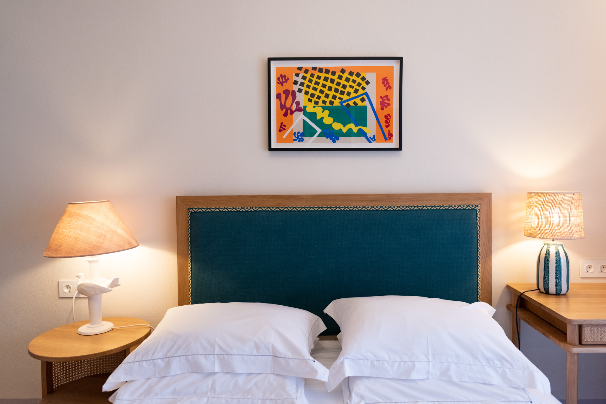 Pale walls set off interesting pieces of furniture and decorative art, creating a tapestry of texture and pattern with a fresh, contemporary feel. A bright, modern kitchen has a double-height ceiling, walls adorned with colourful prints, and an airy indoor dining space. The large open-plan sitting room, with an open fireplace and eclectic mix of seating, has doors to the garden and terrace. The en-suite bedrooms are all air-conditioned and have access to the terrace. The beds are dressed in crisp white bed linen and beautiful fabric-covered headboards.