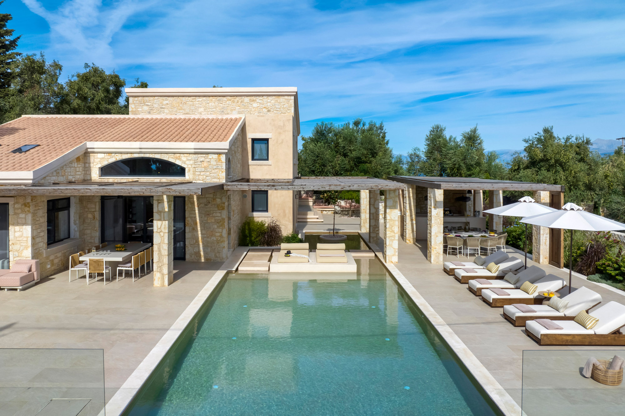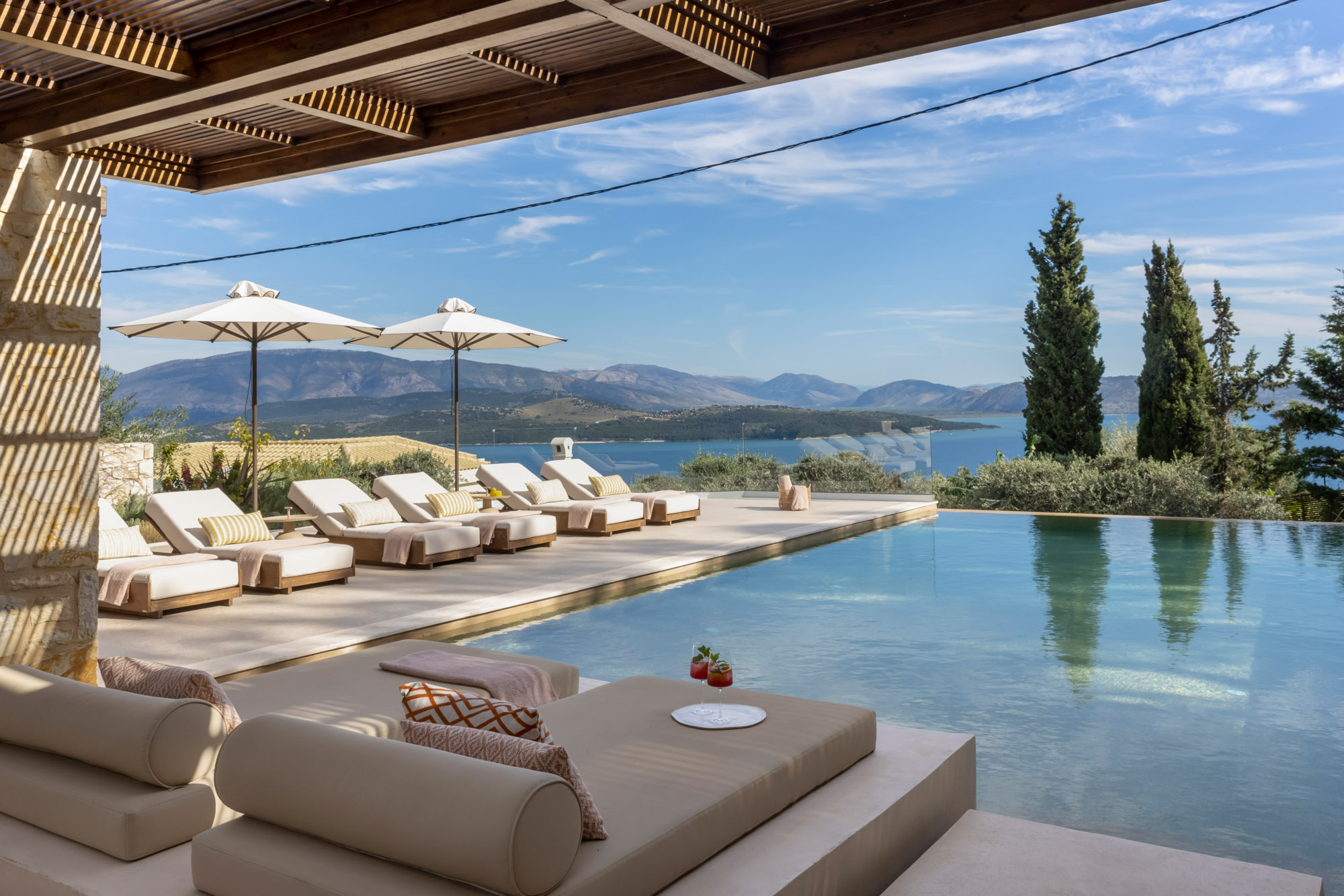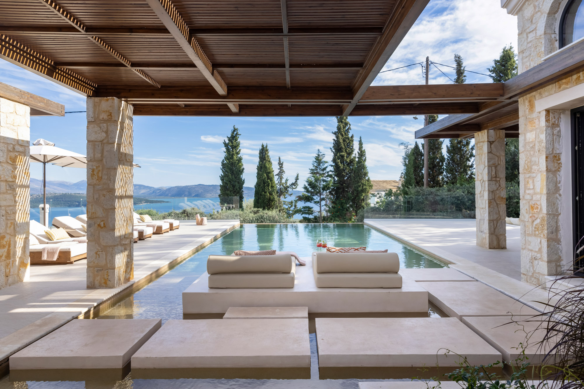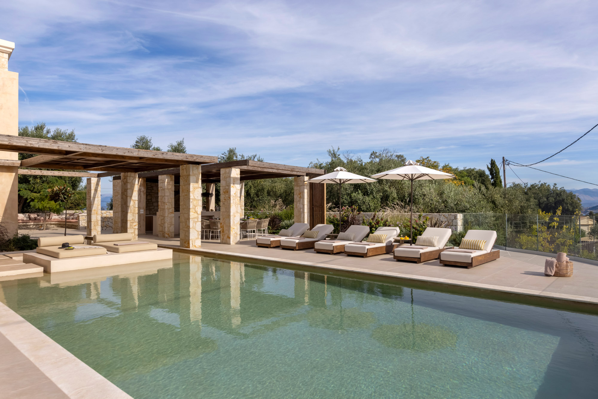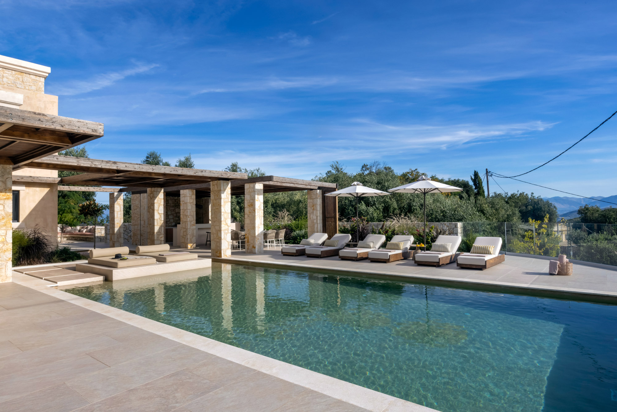 Either side of the infinity pool wooden pergolas shade two separate dining areas, one with a circular table seating 12 and the other a stone rectangular table. Comfortable wooden loungers sit along one side of the pool and further seating, plentiful scatter cushions, and sofa with fire pit, are across the terrace. Theres also a bar area and barbecue and funky occasional tables.