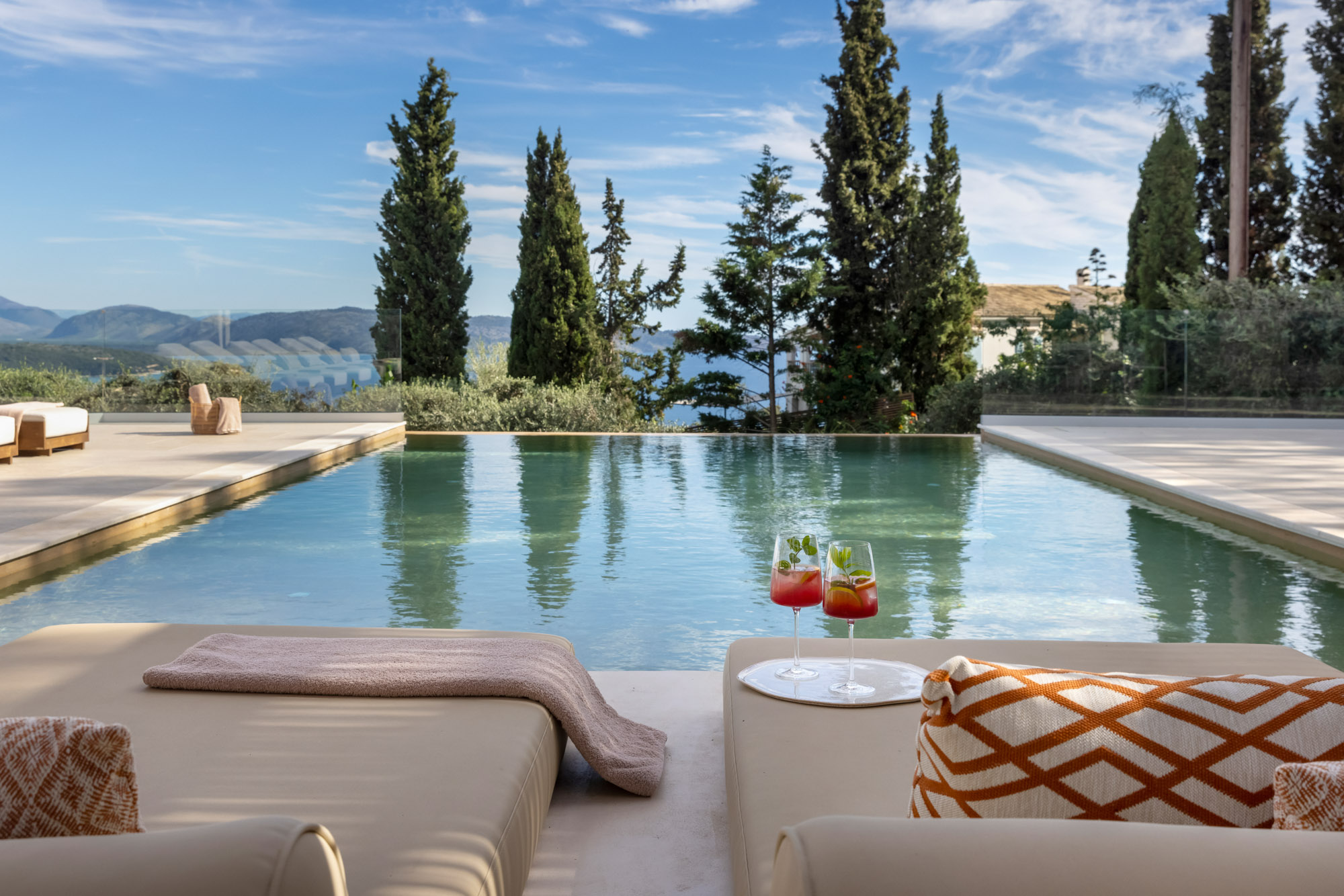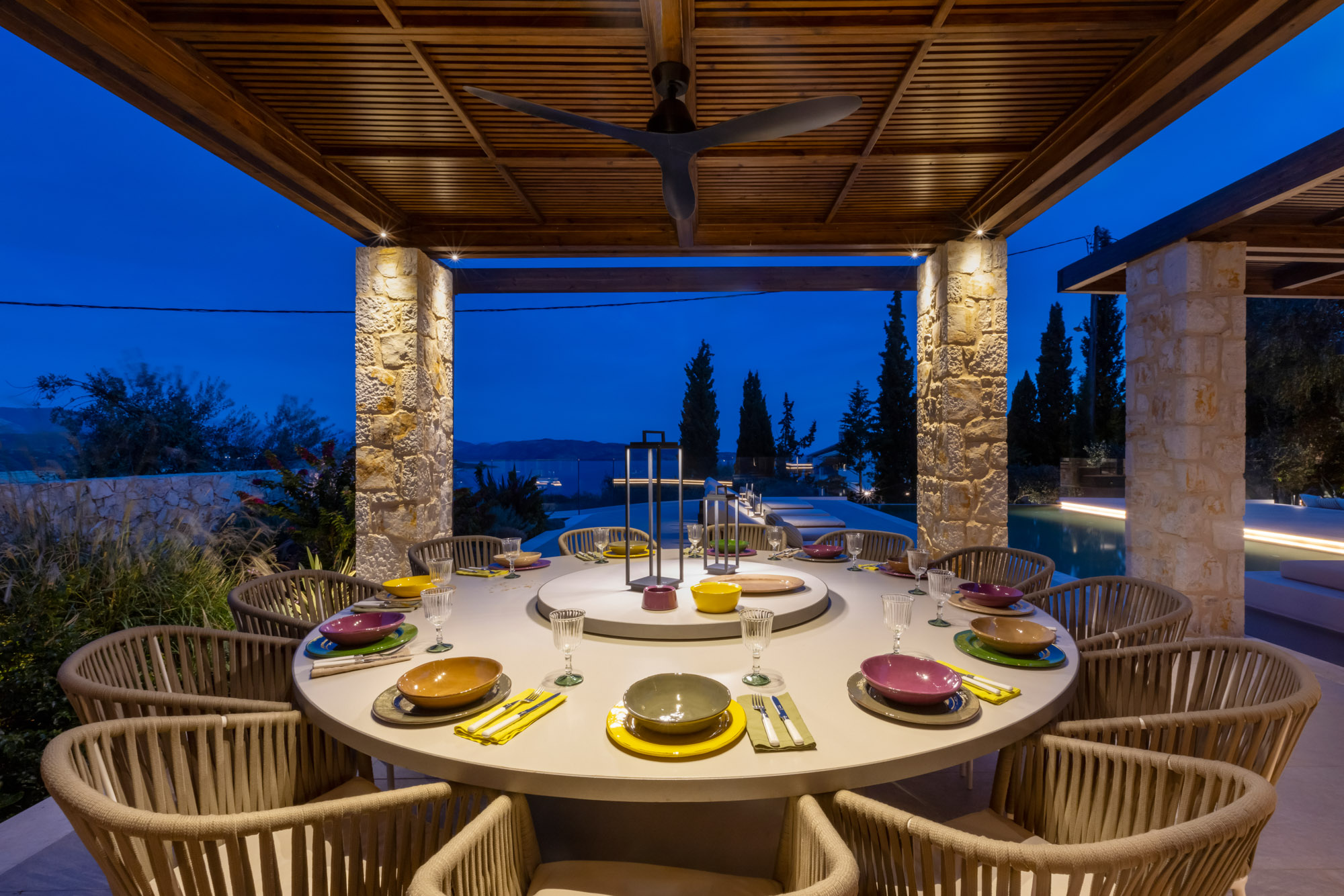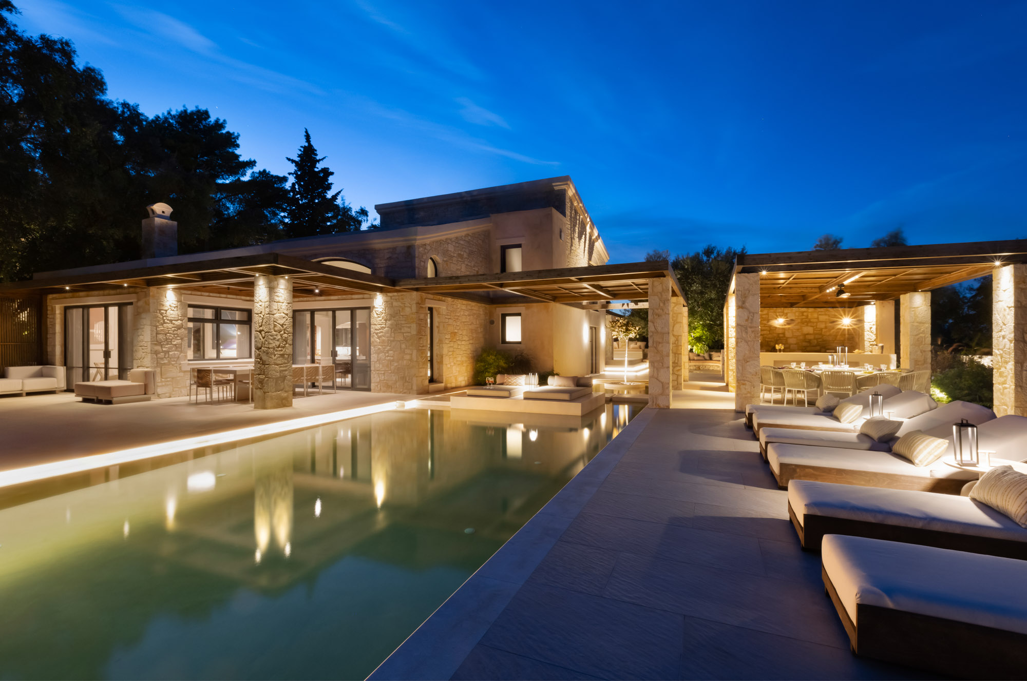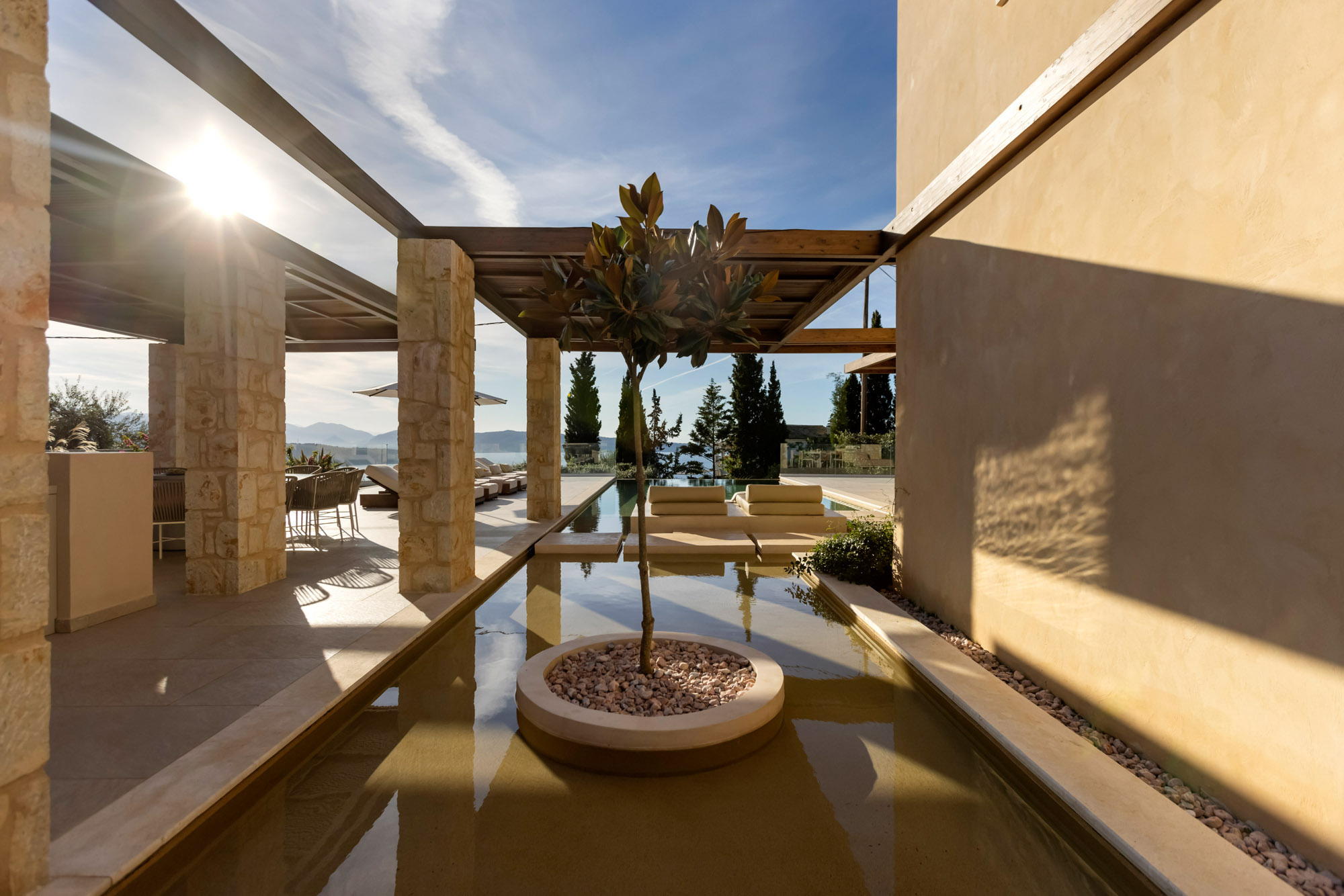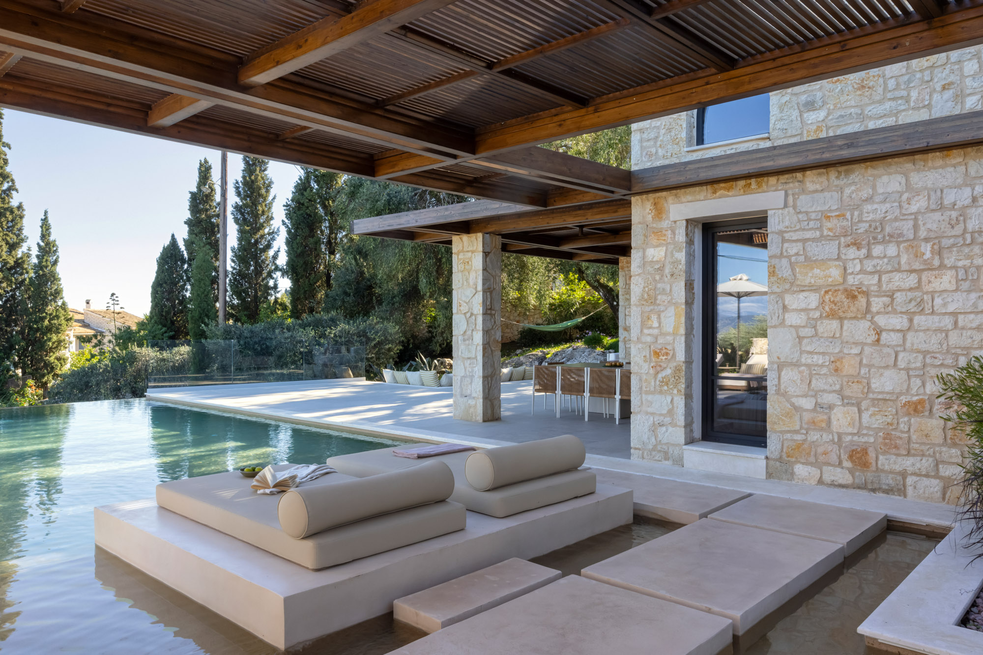 Either side of the infinity pool wooden pergolas shade two separate dining areas, one with a circular table seating 12 and the other a stone rectangular table. Comfortable wooden loungers sit along one side of the pool and further seating, plentiful scatter cushions, and sofa with fire pit, are across the terrace. Theres also a bar area and barbecue and funky occasional tables.