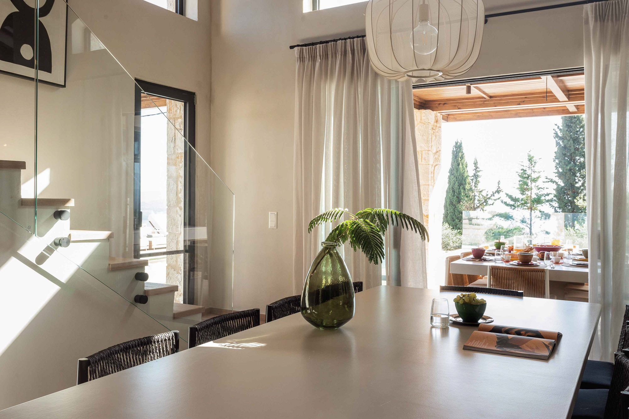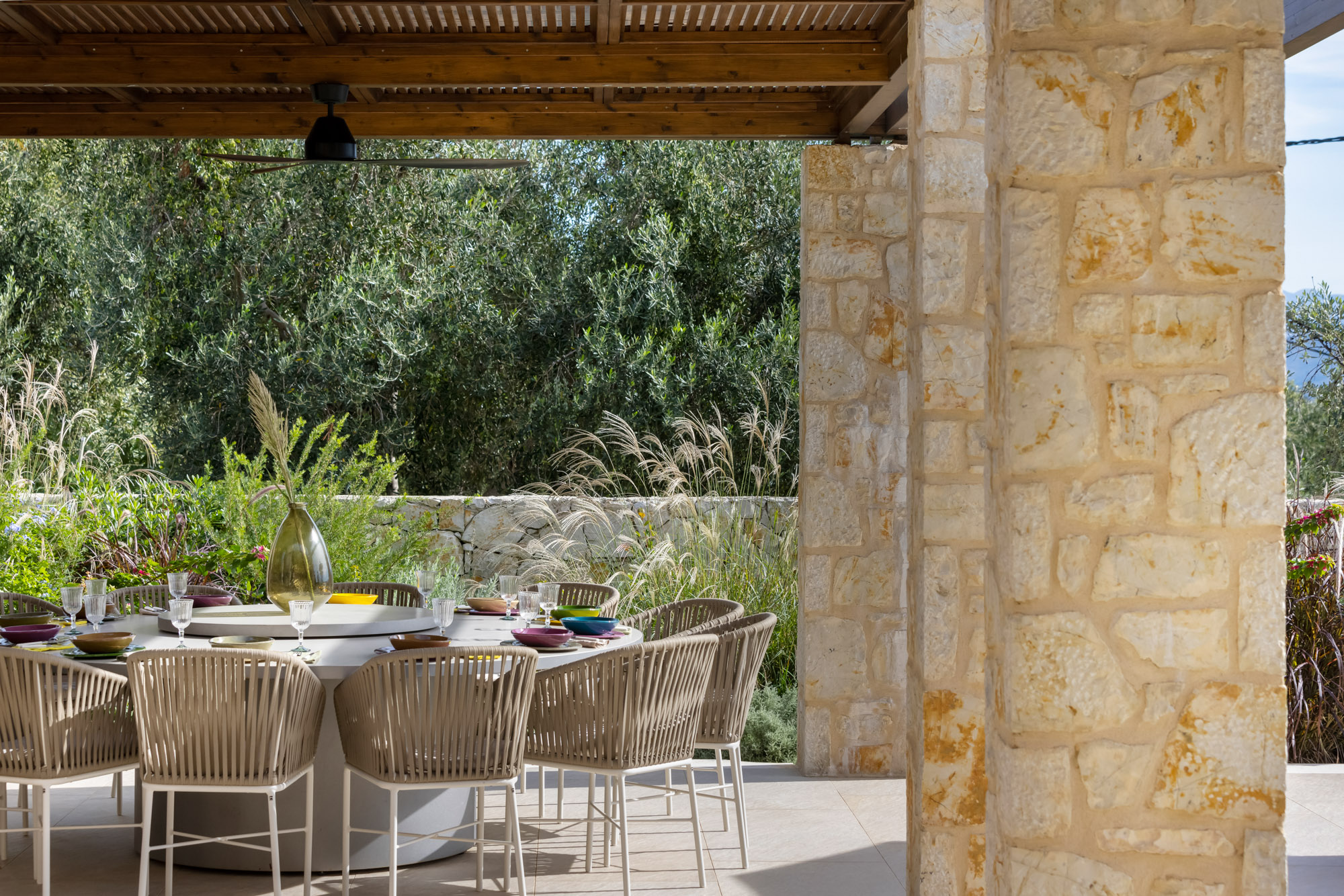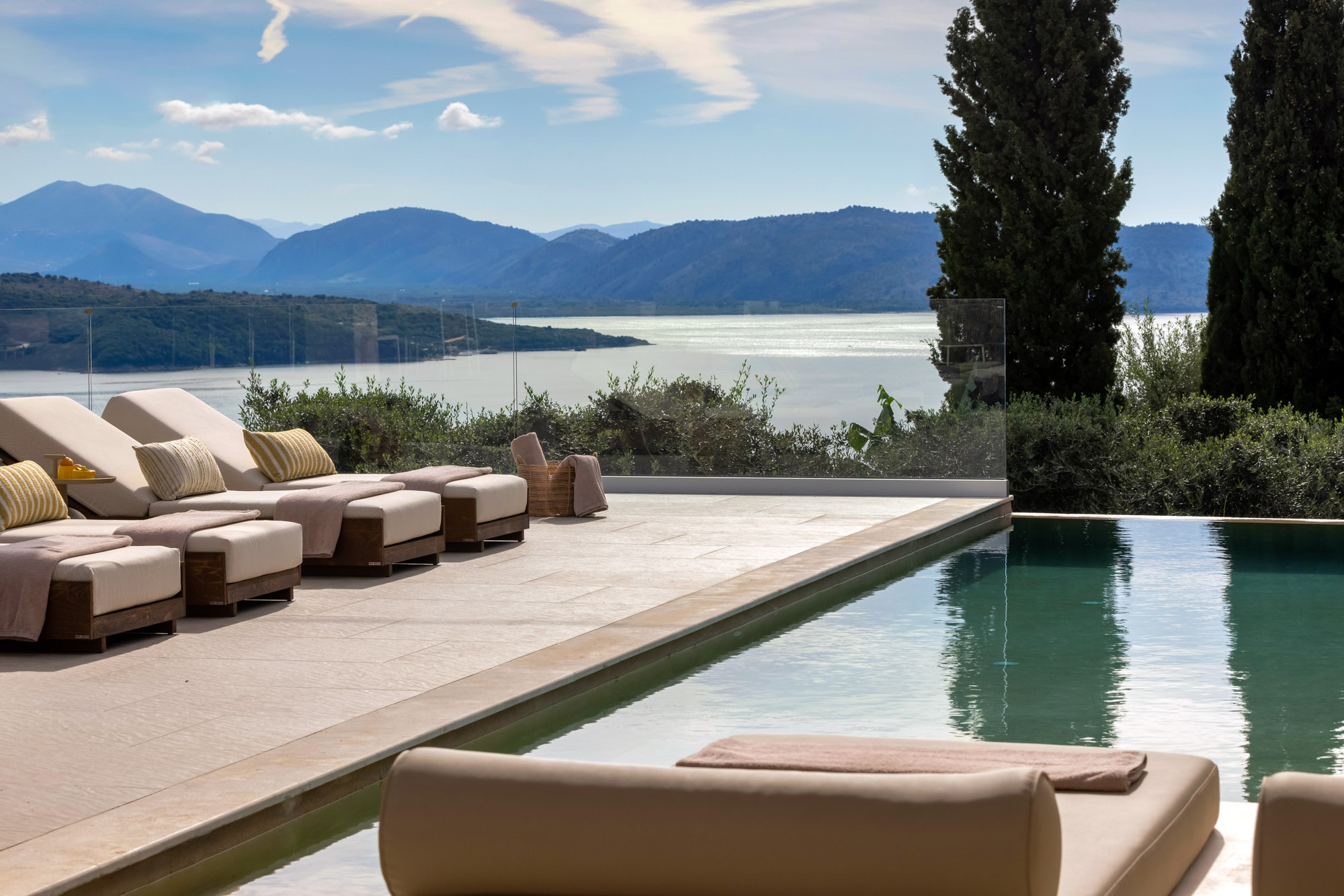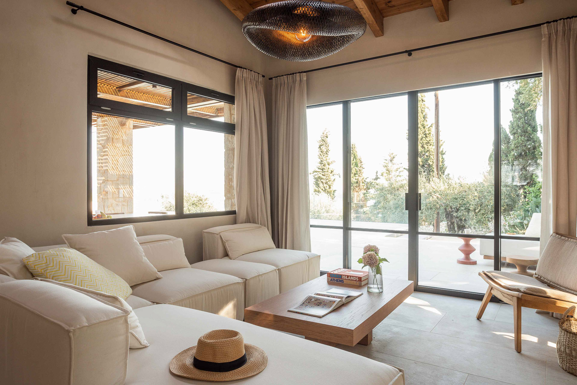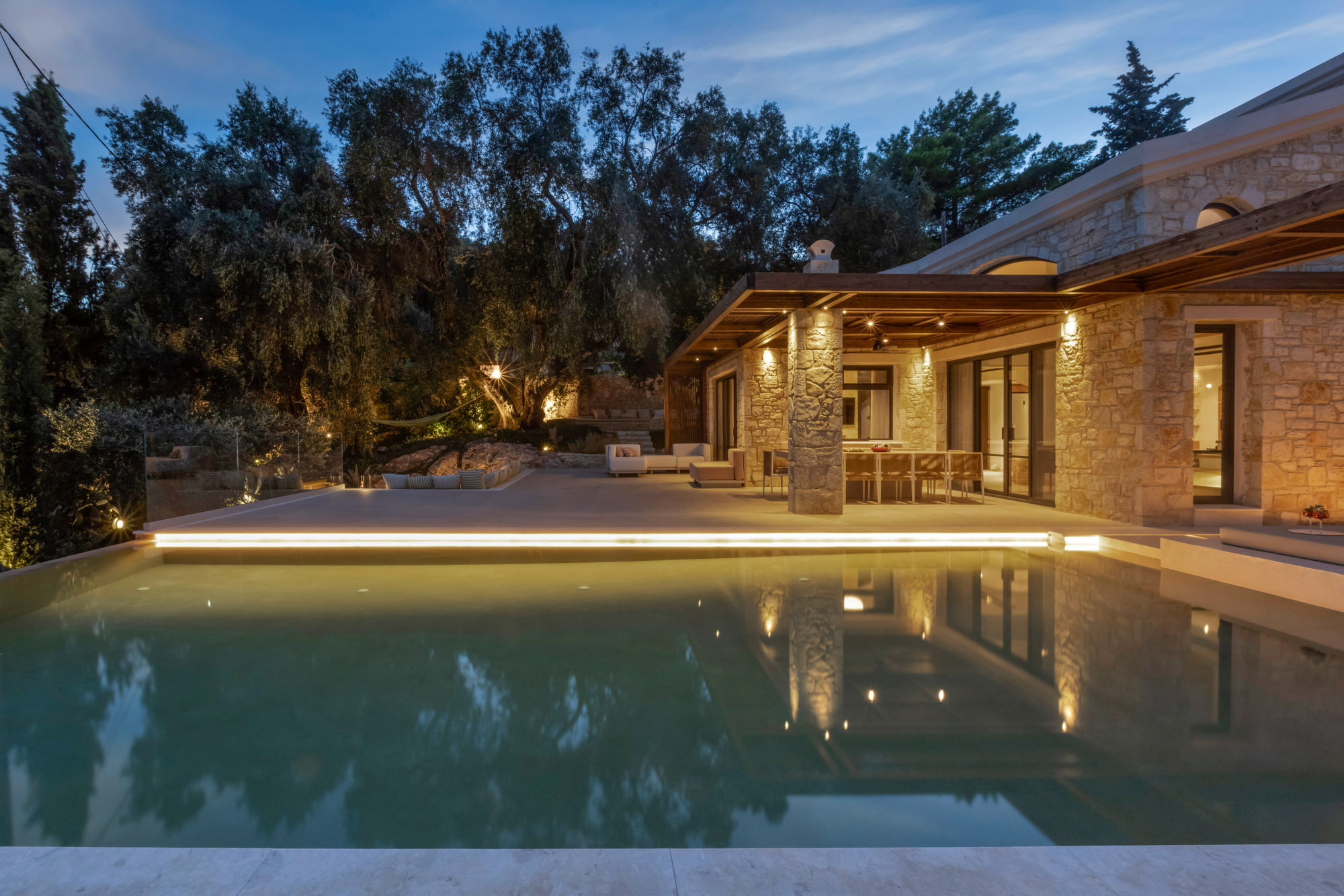 Either side of the infinity pool wooden pergolas shade two separate dining areas, one with a circular table seating 12 and the other a stone rectangular table. Comfortable wooden loungers sit along one side of the pool and further seating, plentiful scatter cushions, and sofa with fire pit, are across the terrace. Theres also a bar area and barbecue and funky occasional tables.