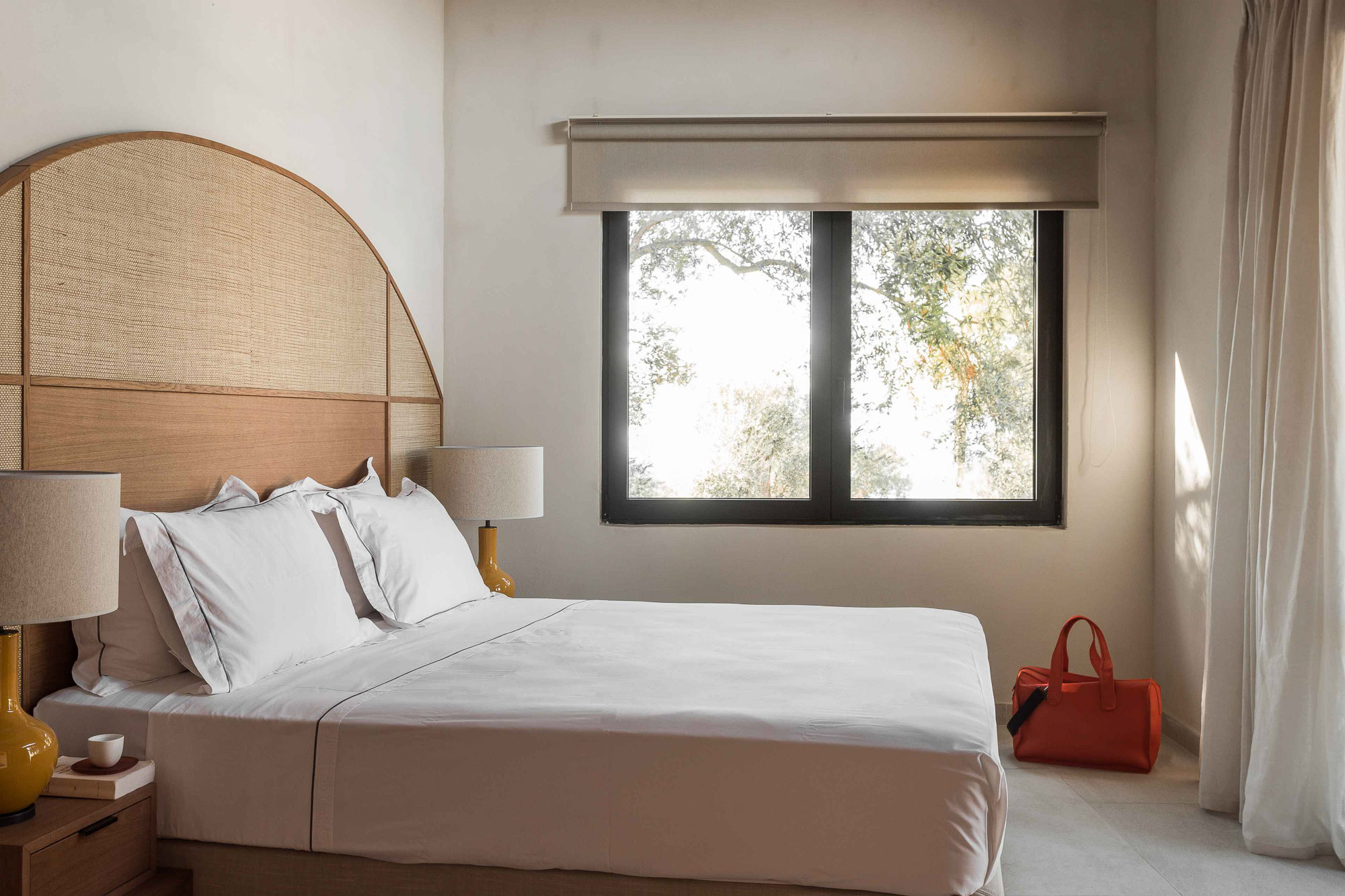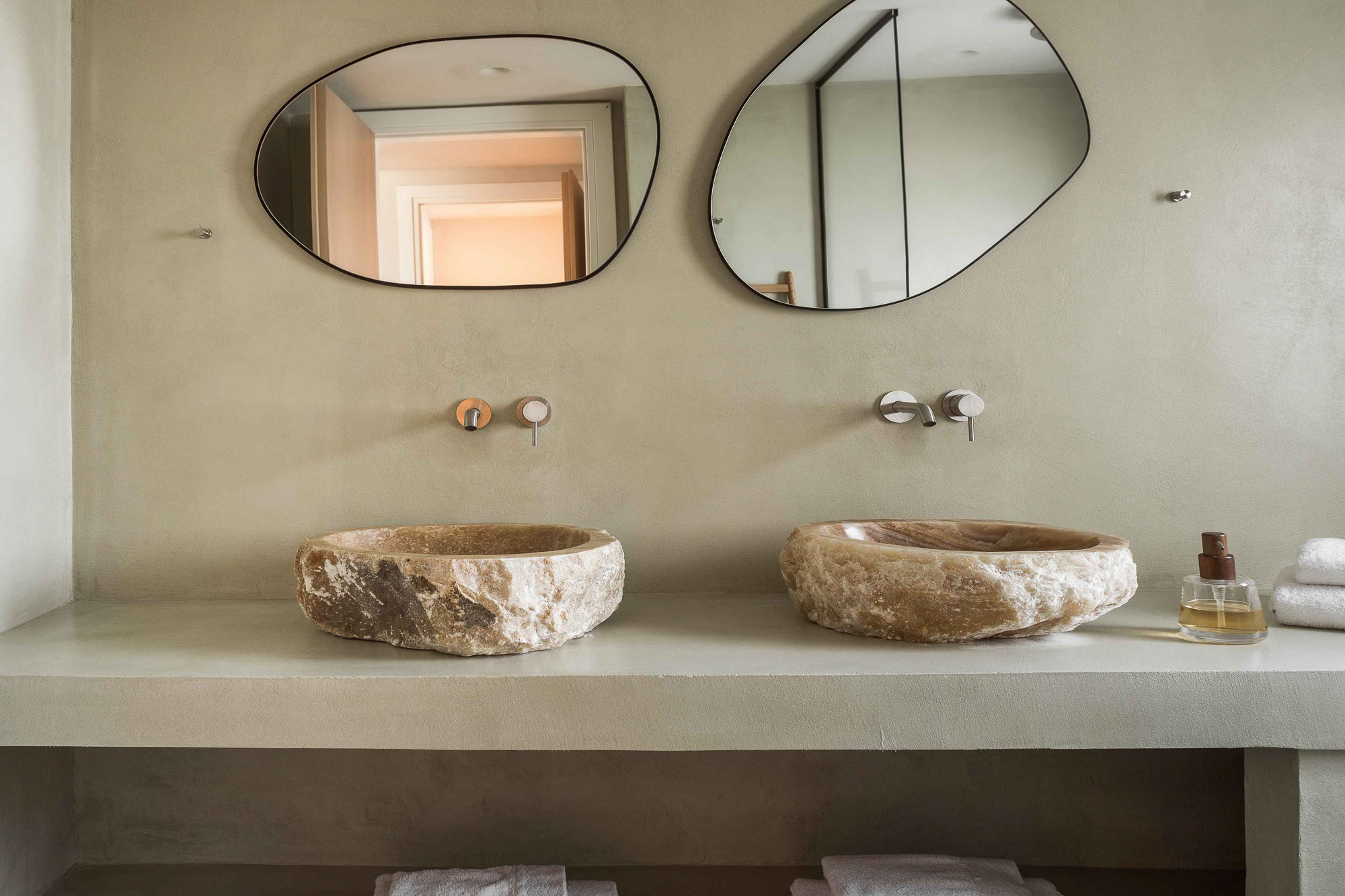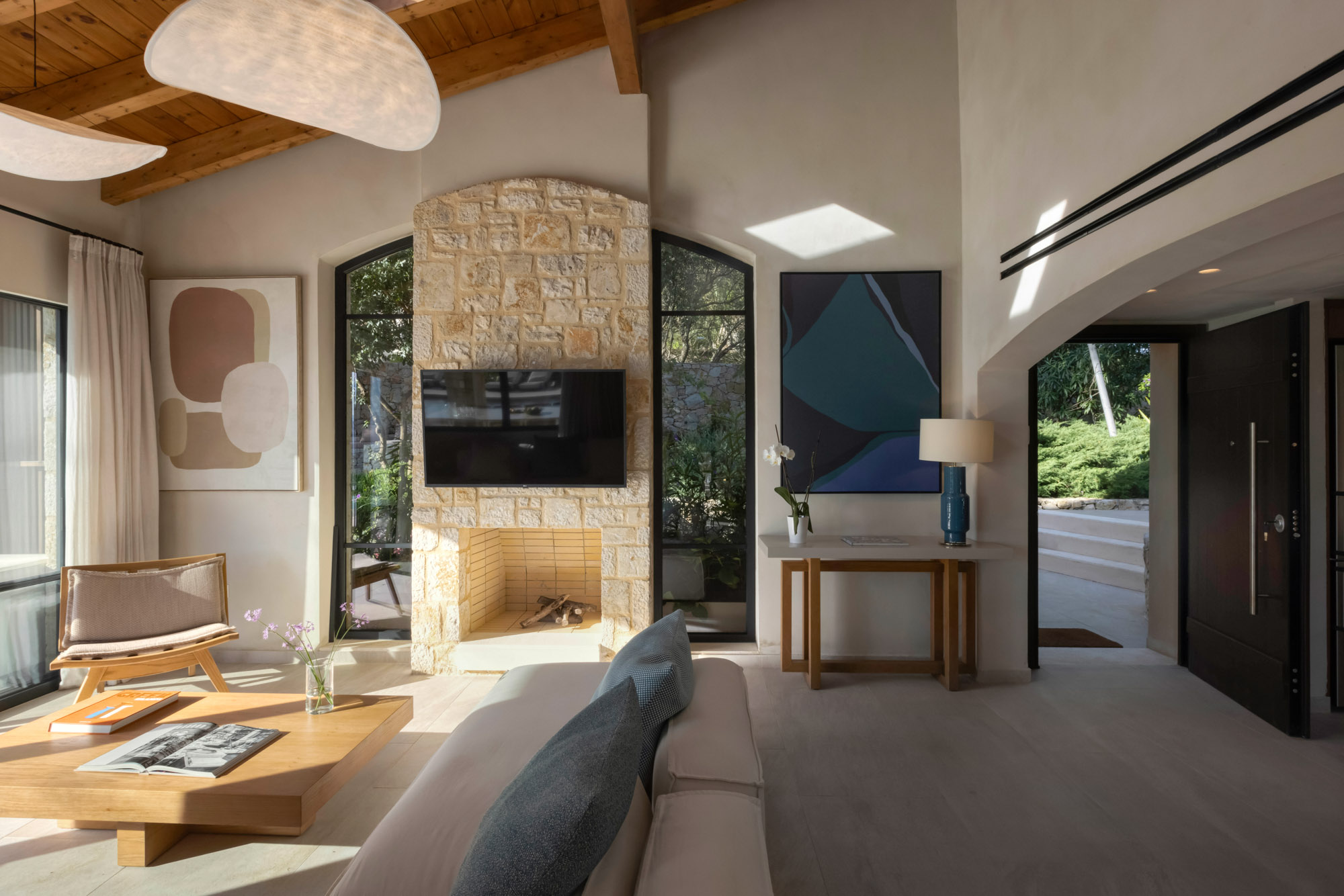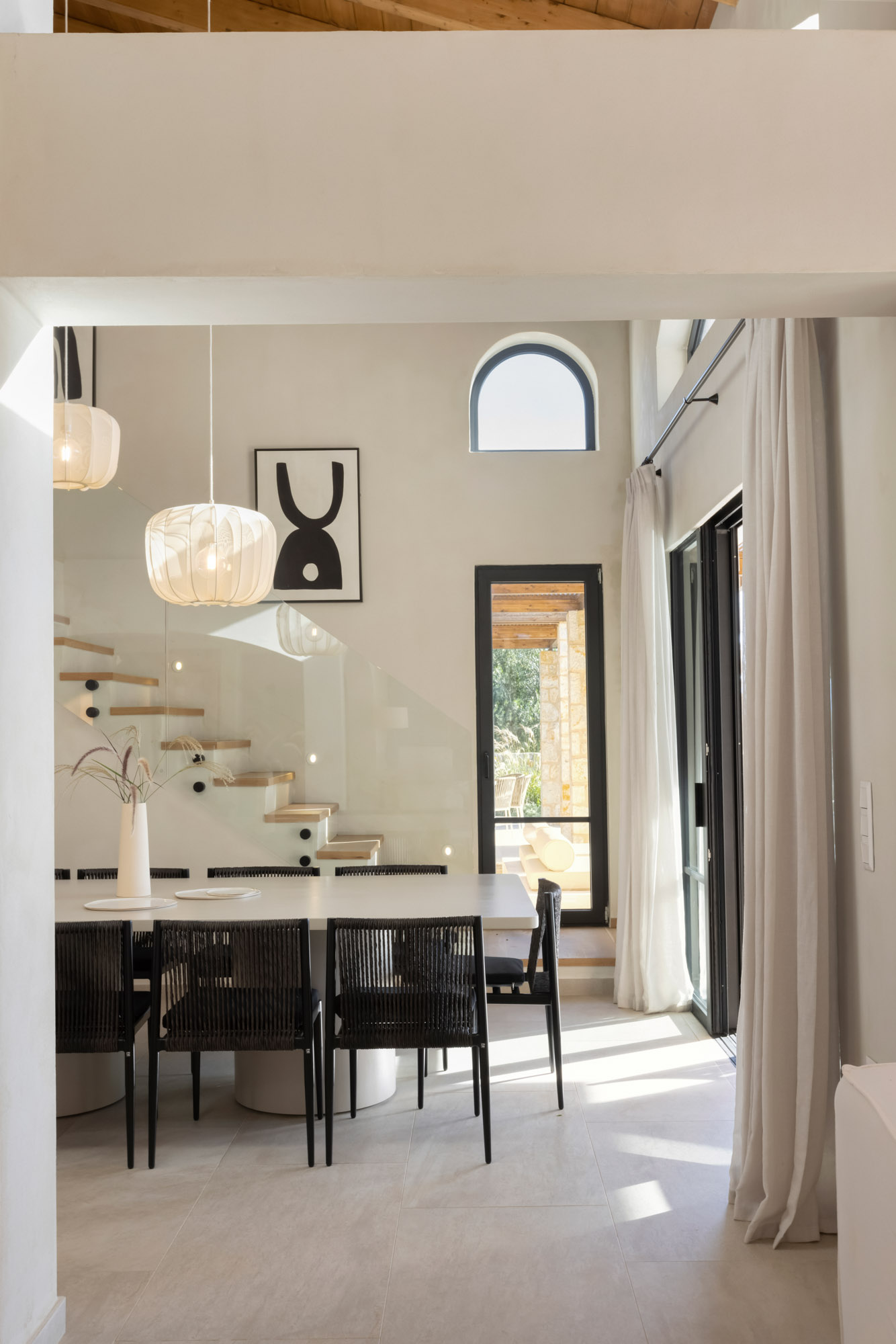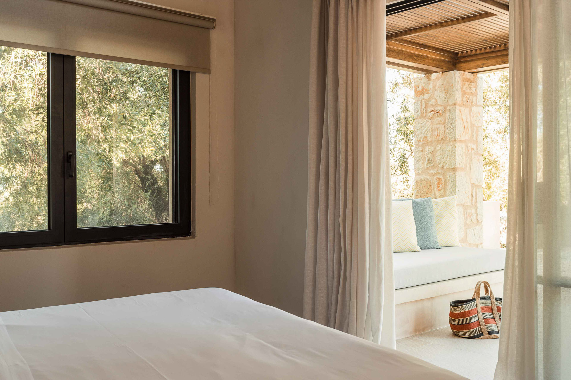 Either side of the infinity pool wooden pergolas shade two separate dining areas, one with a circular table seating 12 and the other a stone rectangular table. Comfortable wooden loungers sit along one side of the pool and further seating, plentiful scatter cushions, and sofa with fire pit, are across the terrace. Theres also a bar area and barbecue and funky occasional tables.