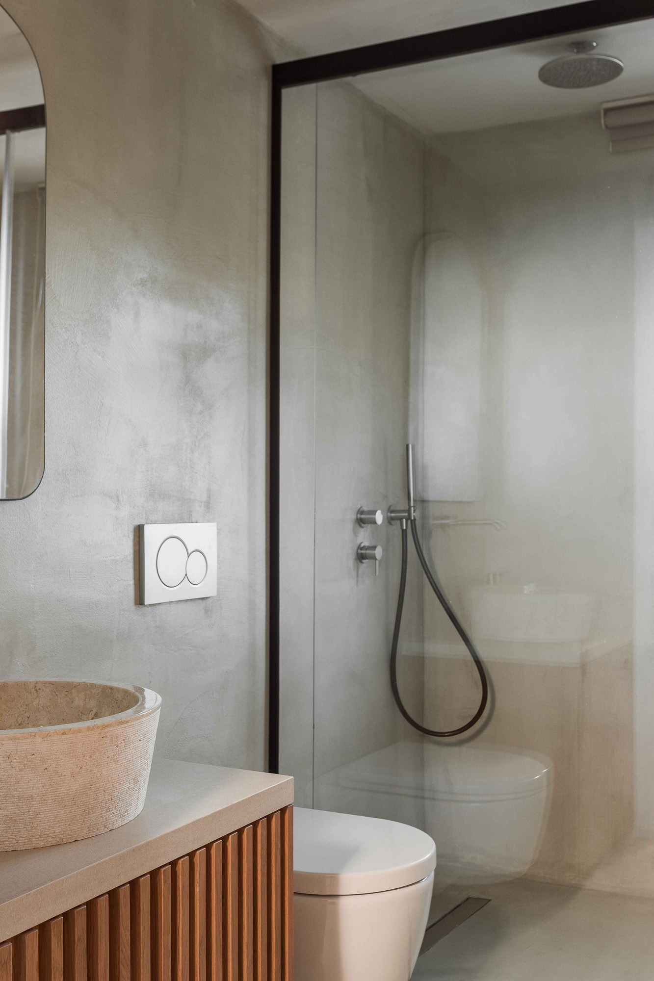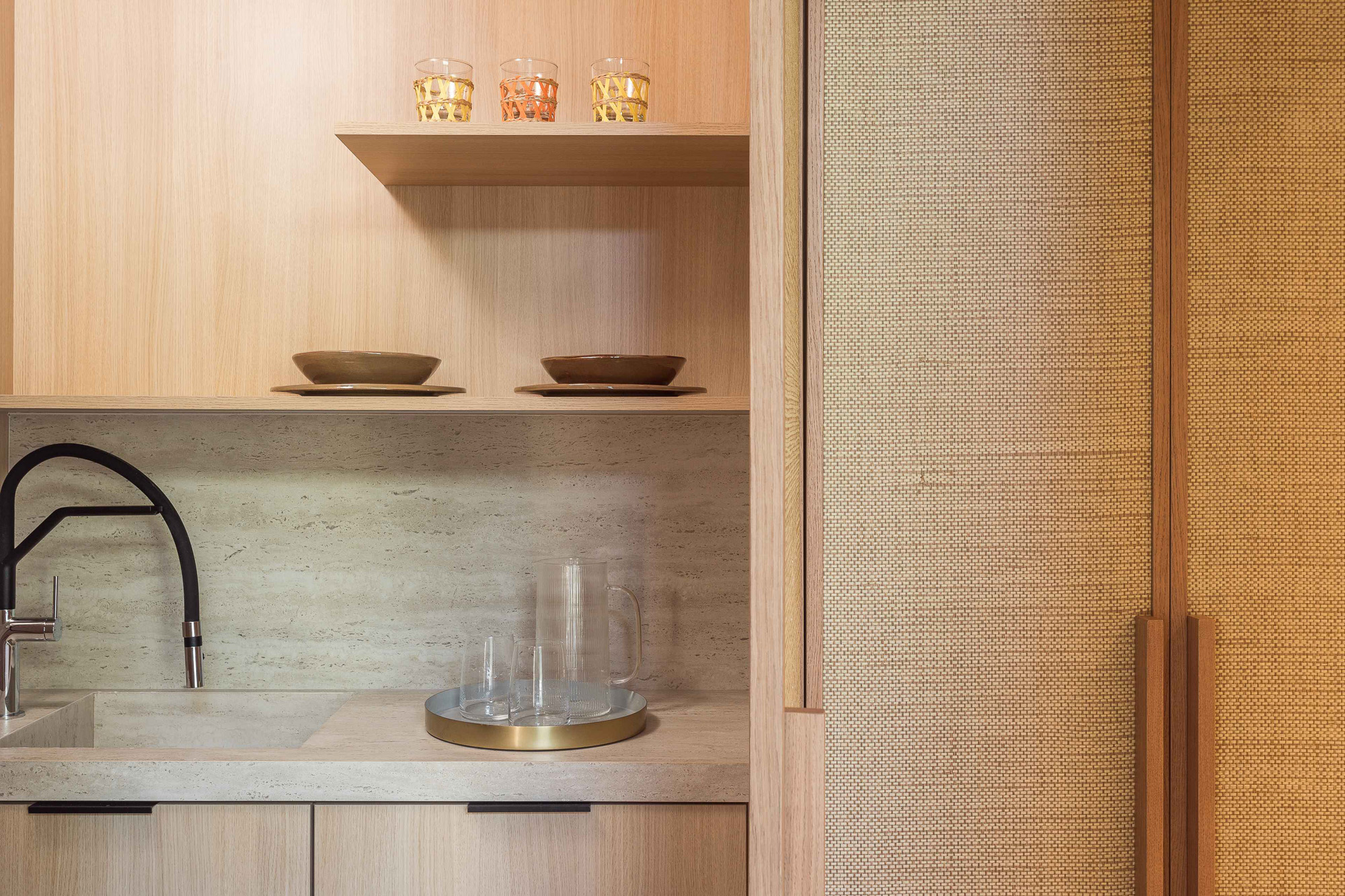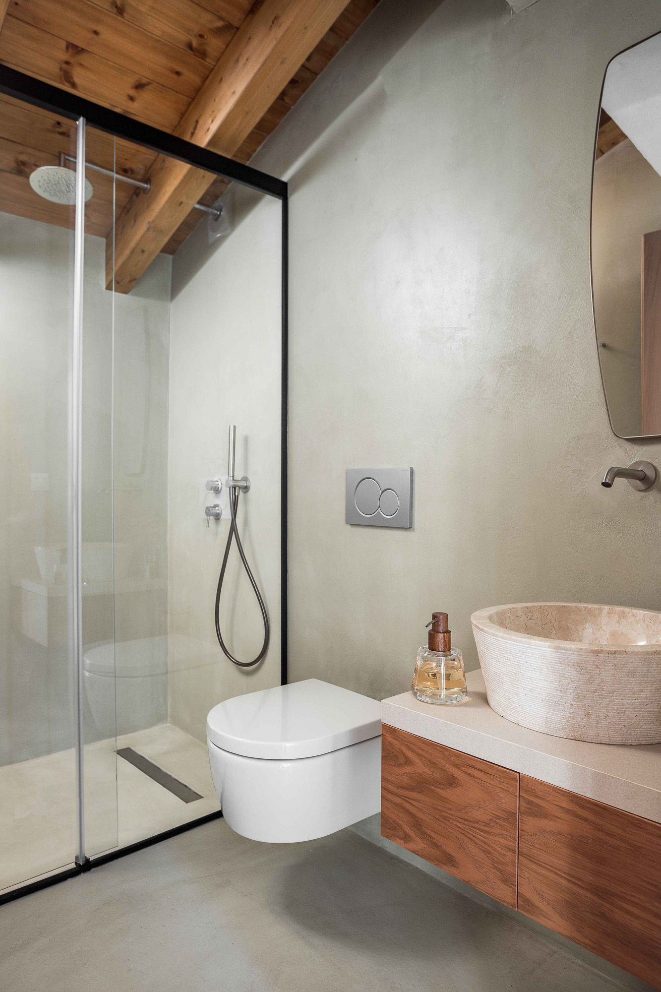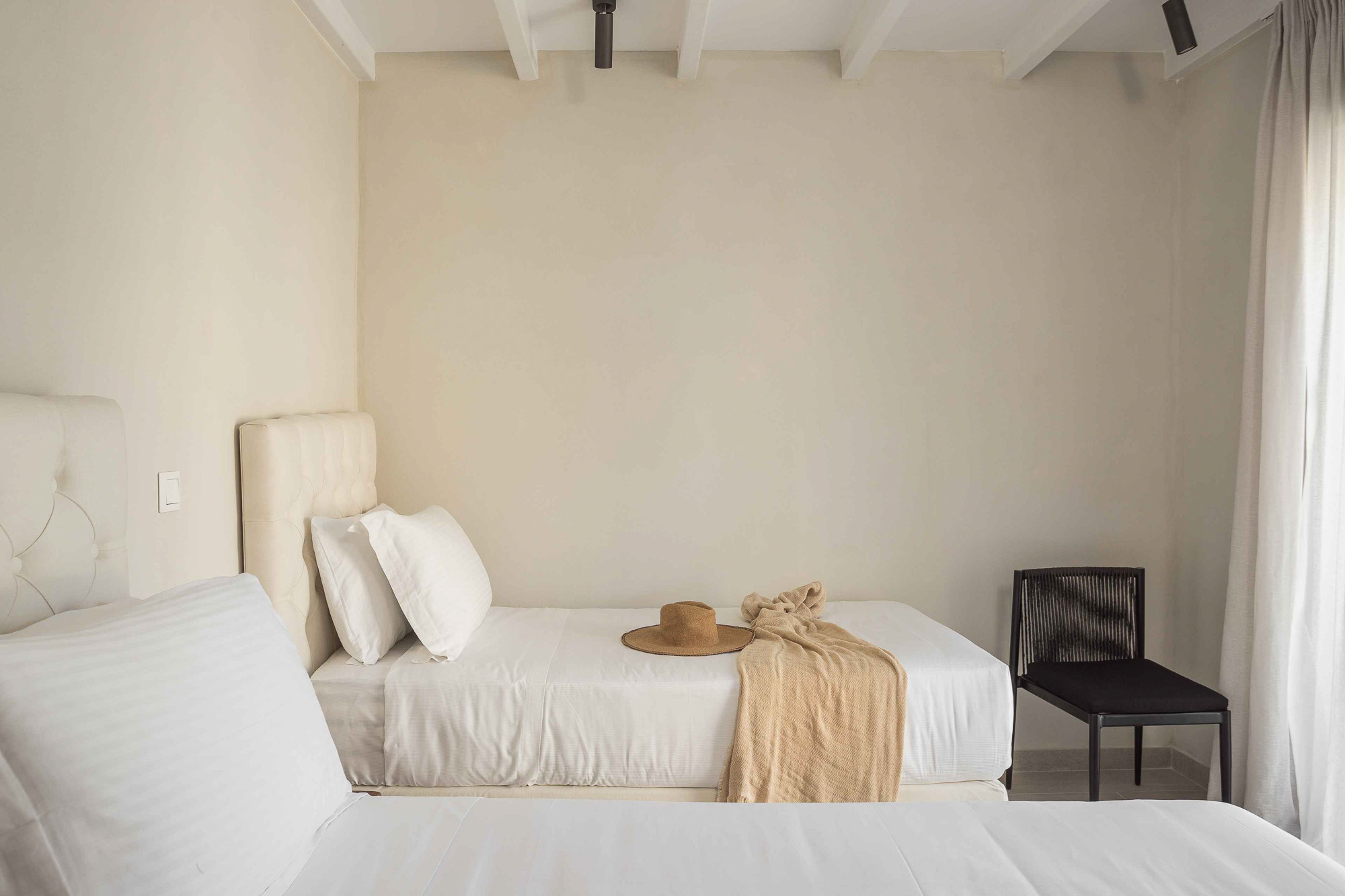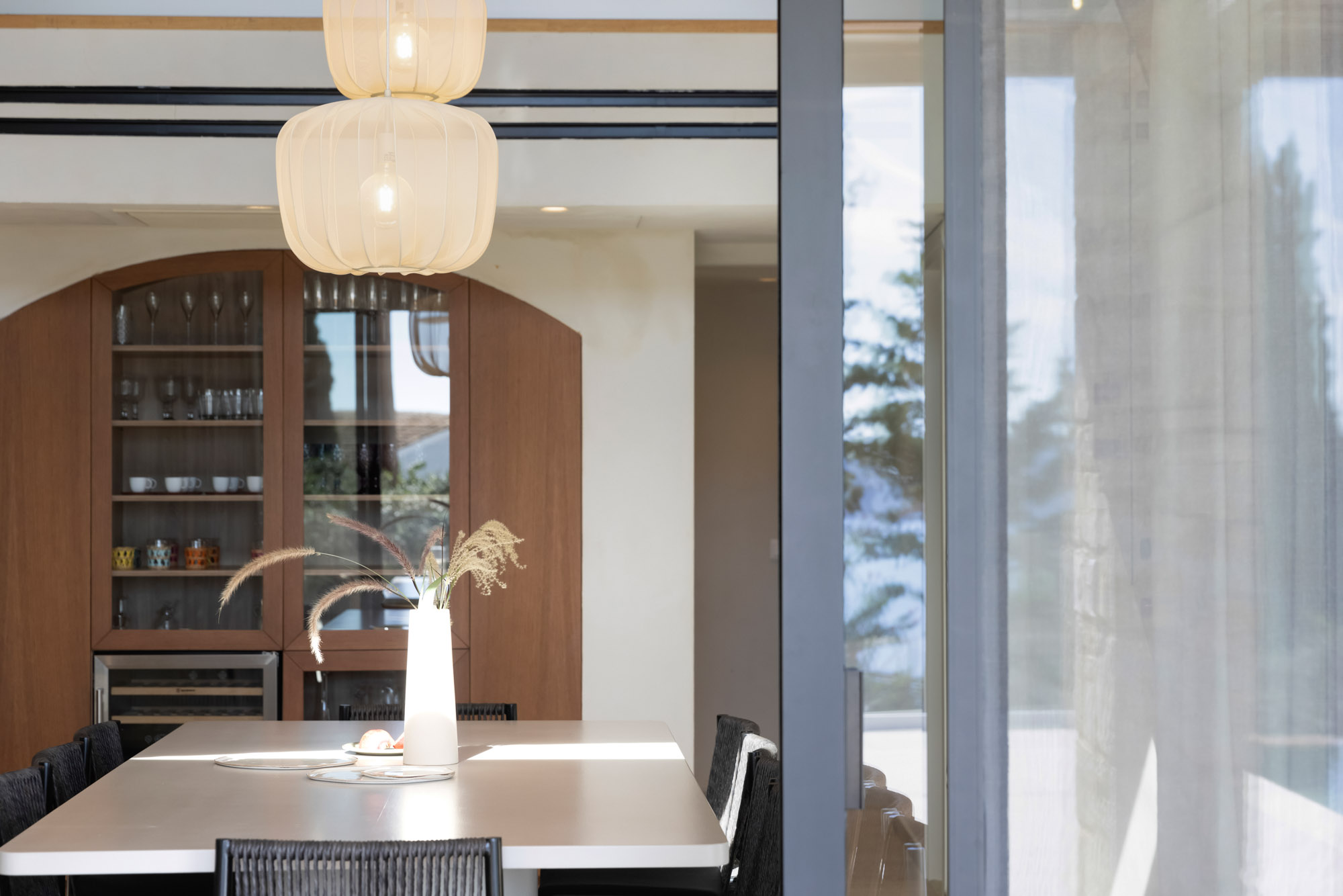 Either side of the infinity pool wooden pergolas shade two separate dining areas, one with a circular table seating 12 and the other a stone rectangular table. Comfortable wooden loungers sit along one side of the pool and further seating, plentiful scatter cushions, and sofa with fire pit, are across the terrace. Theres also a bar area and barbecue and funky occasional tables.