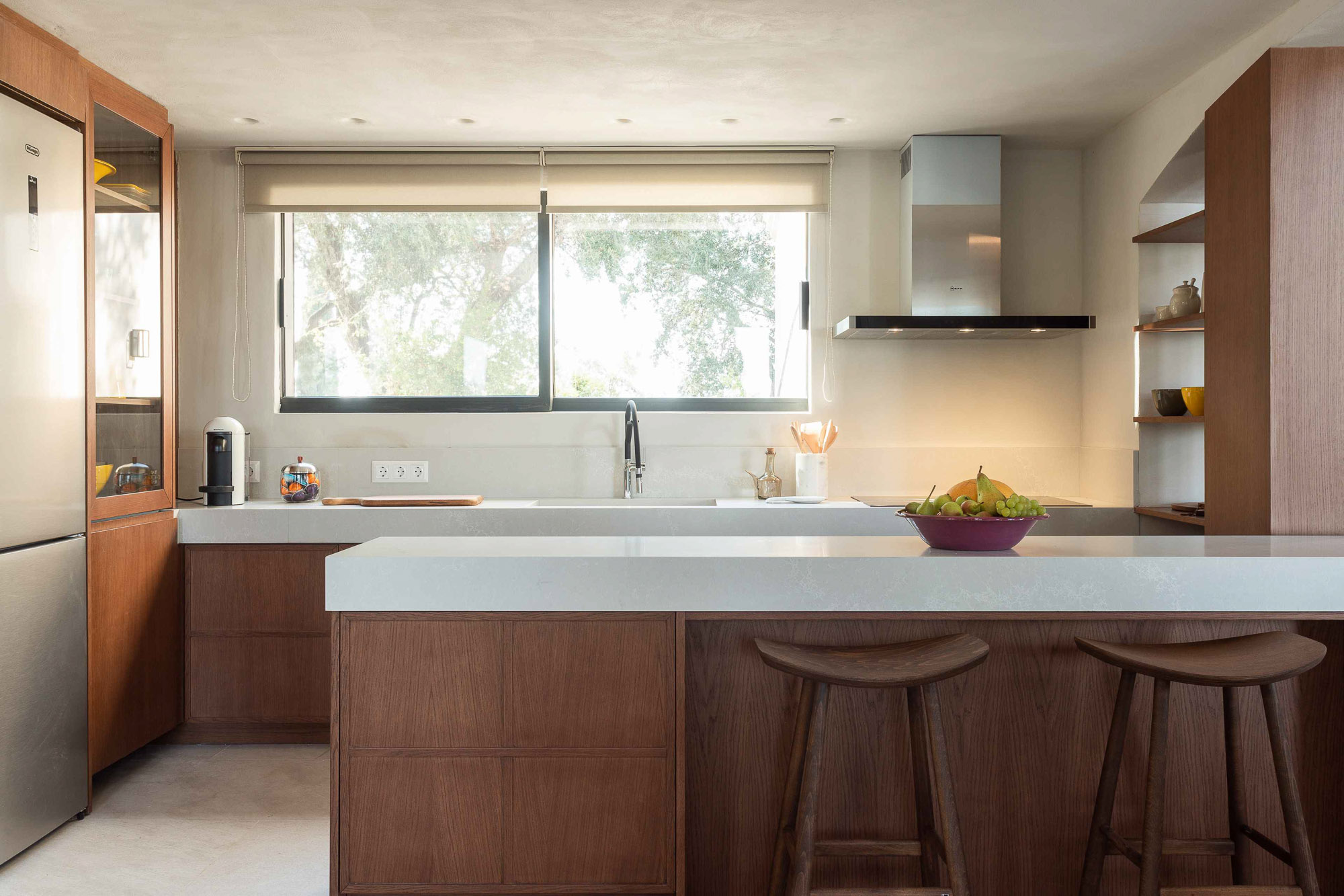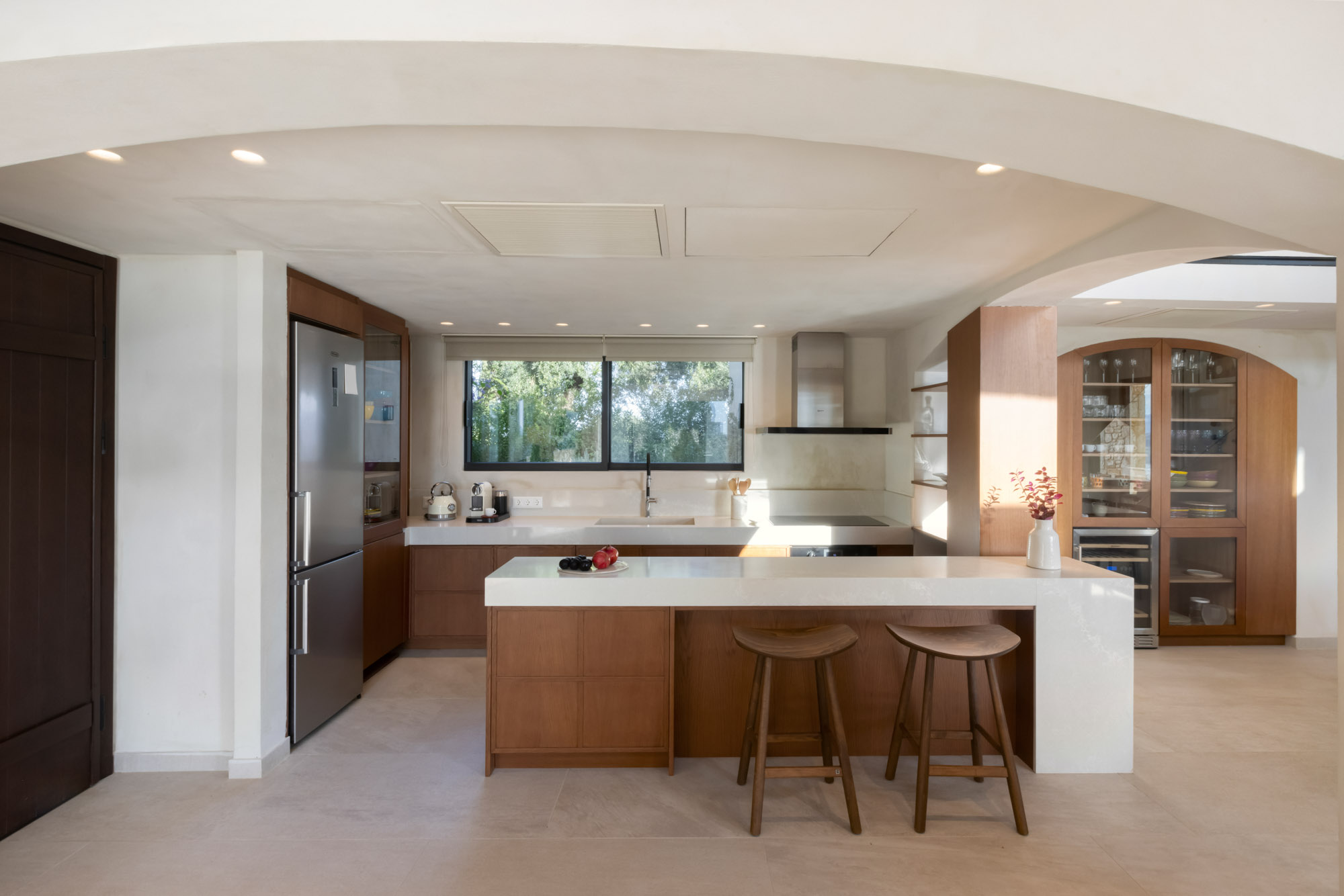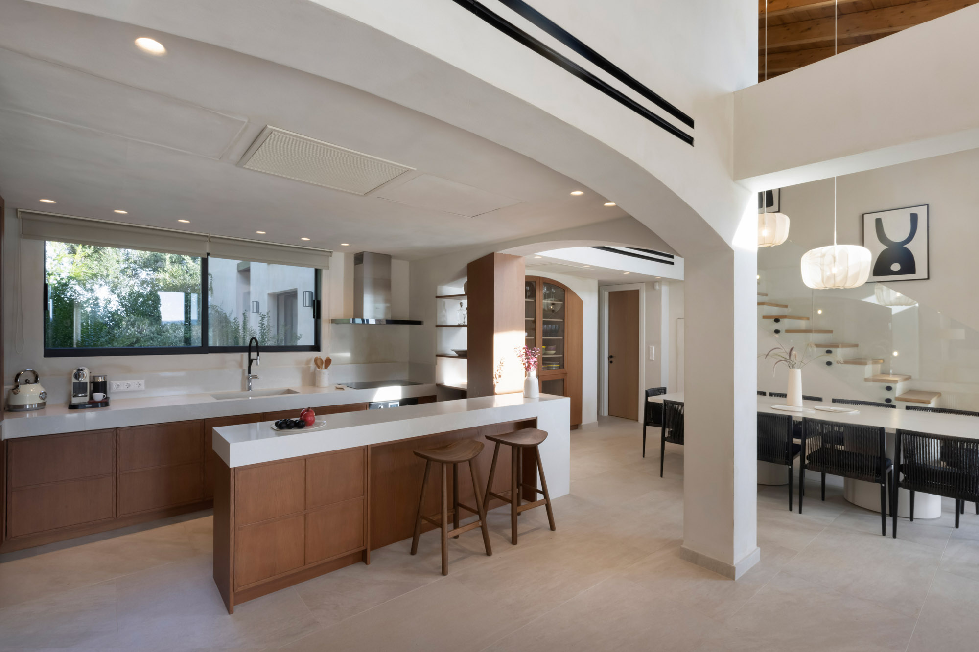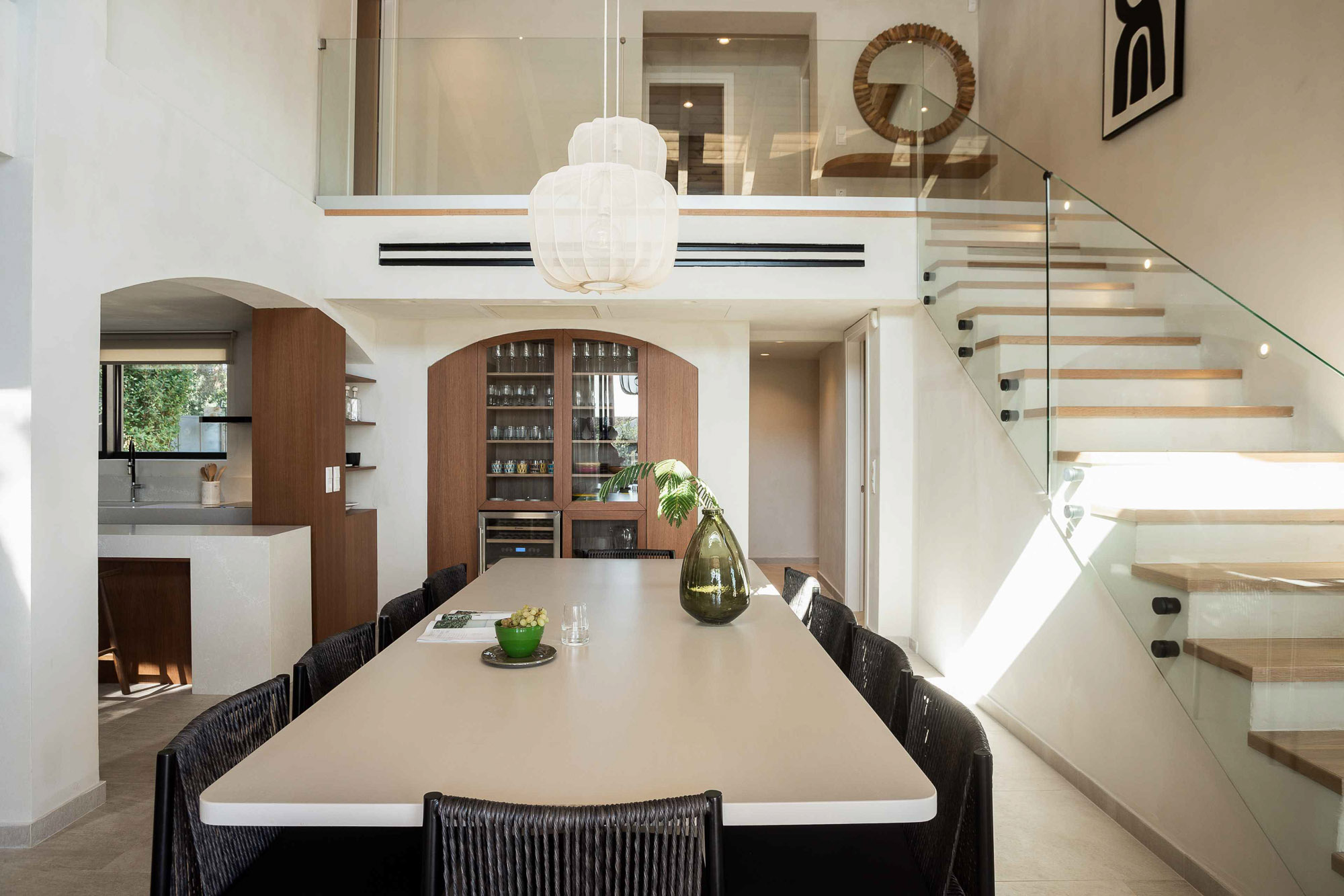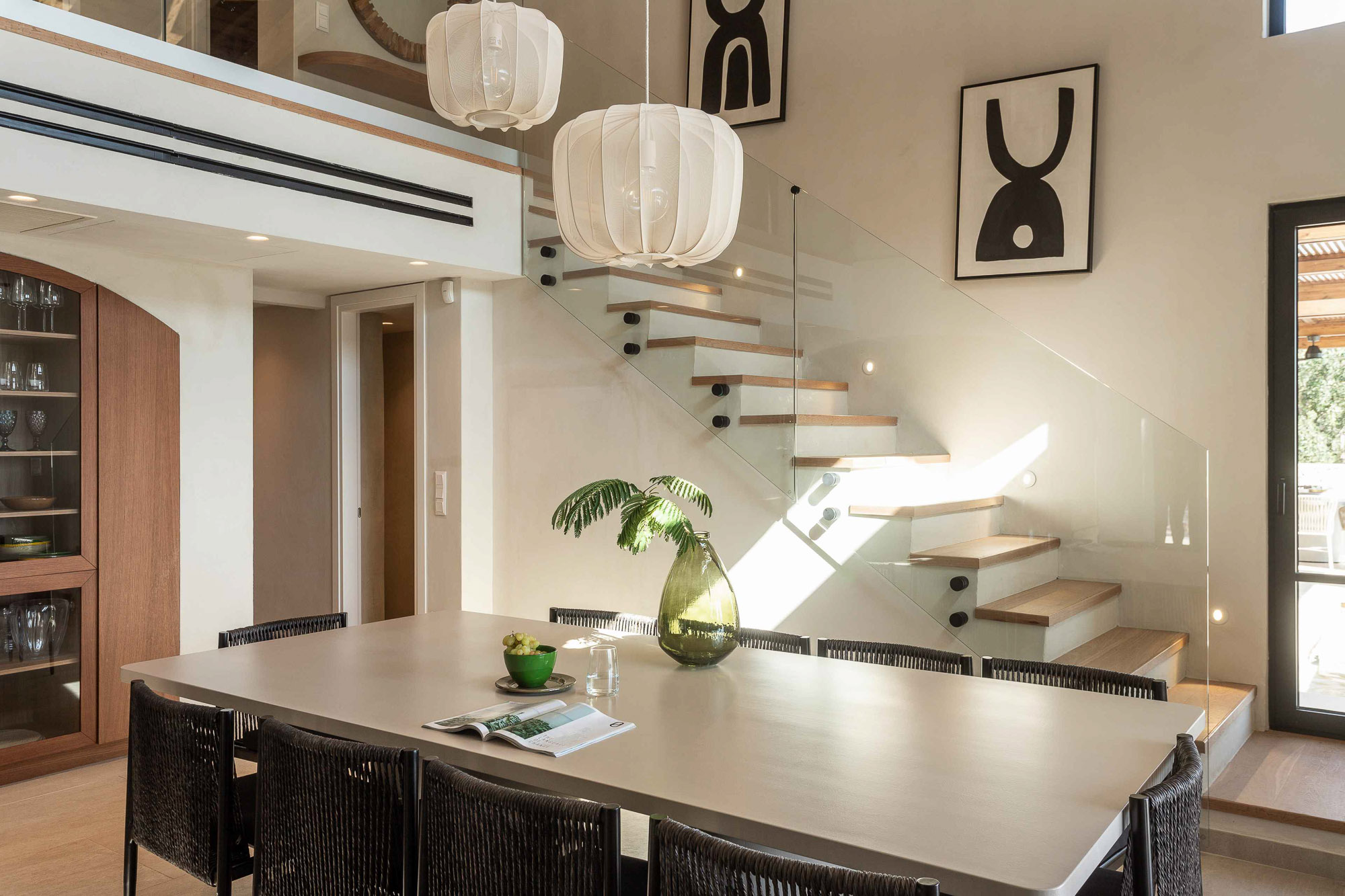 Bedrooms are split across two floors in the main house, and one in the guest house with separate garden access. The open-plan living area has a very well equipped kitchen and large floor to ceiling glass doors opening to the pool terrace, so it feels light and airy.
