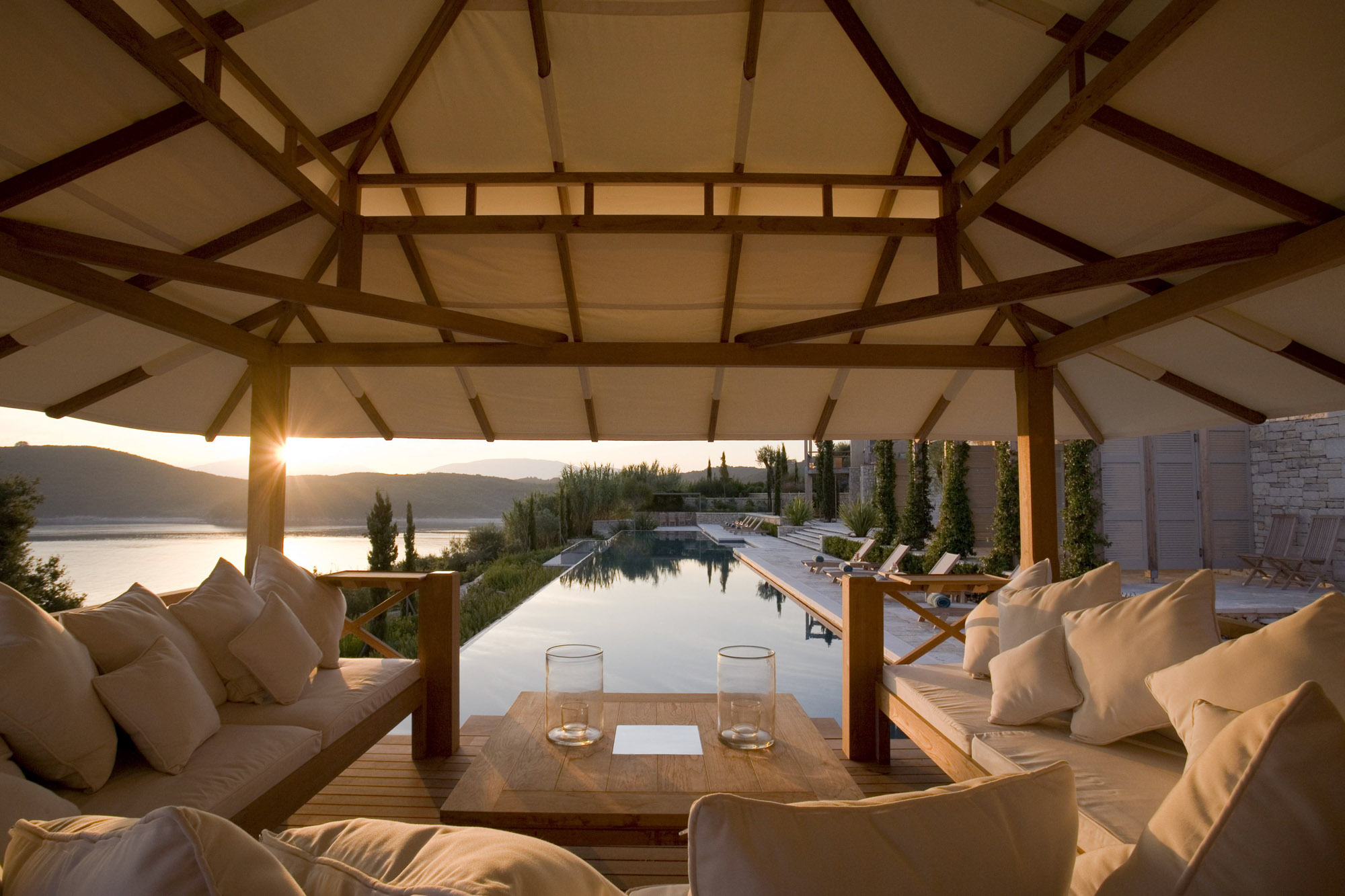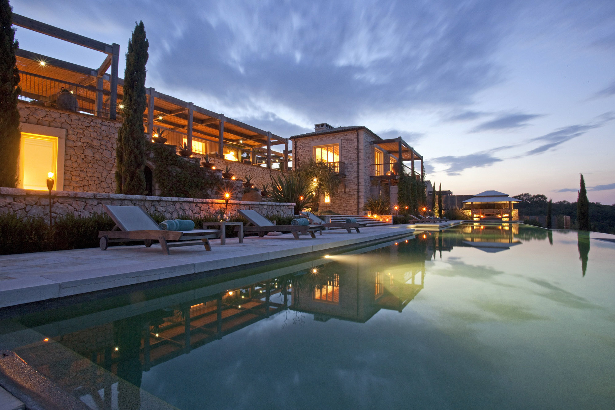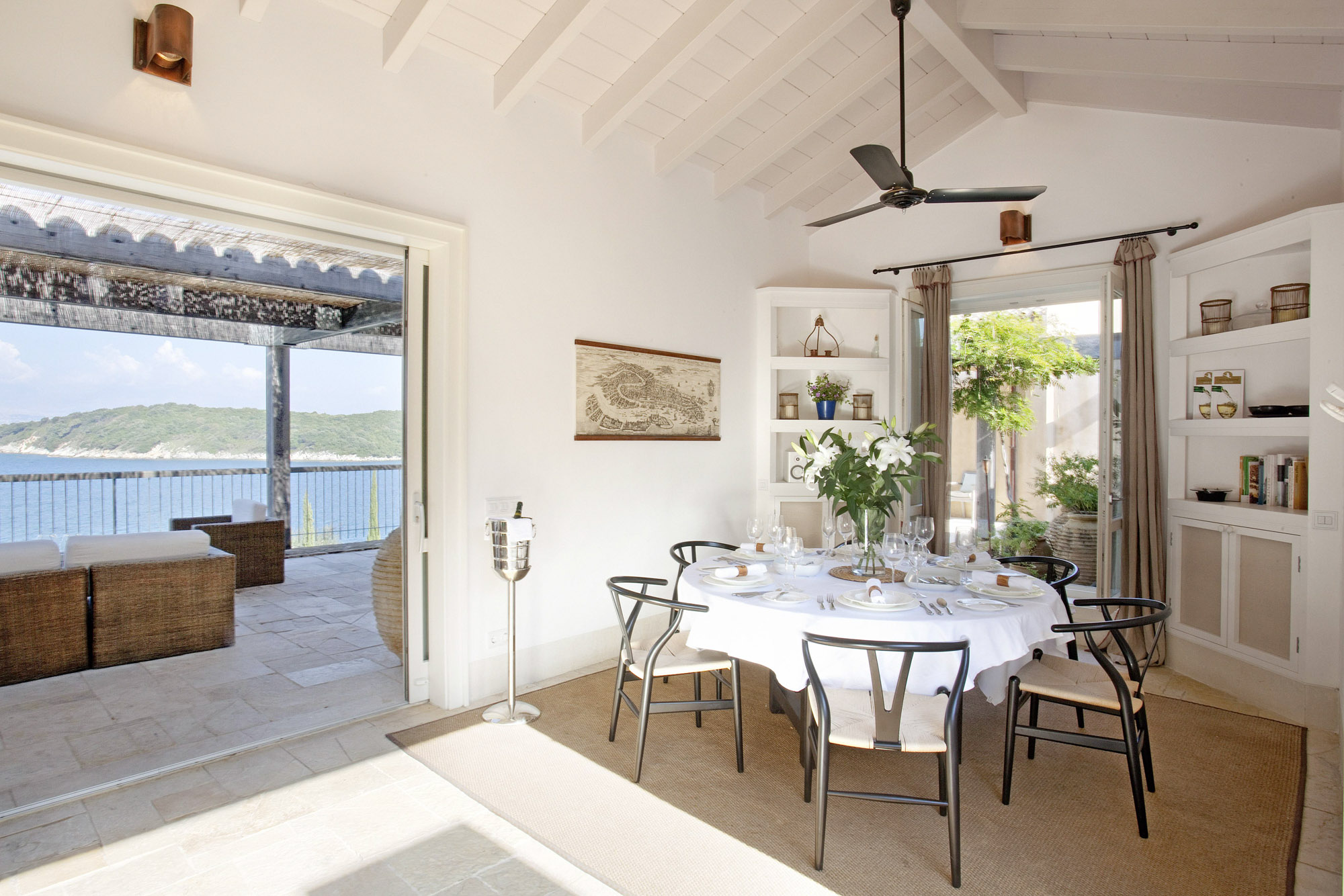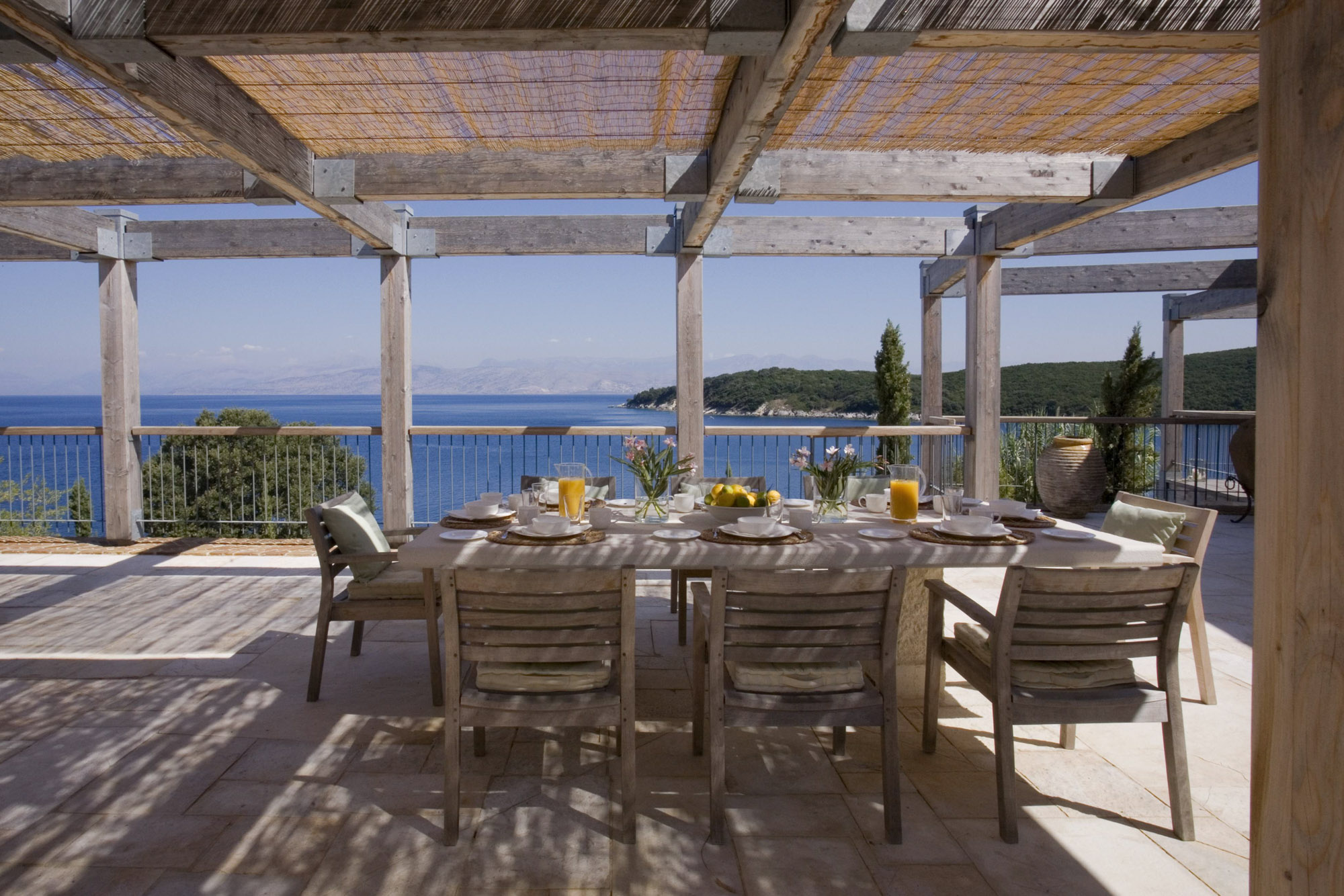 Spacious terraces provide a variety of places to sit, lounge, dine and take in the views. There are sun loungers, pergolas and awnings for shaded seating and, on the top terrace, a verandah with a large dining area for get-togethers and entertaining.