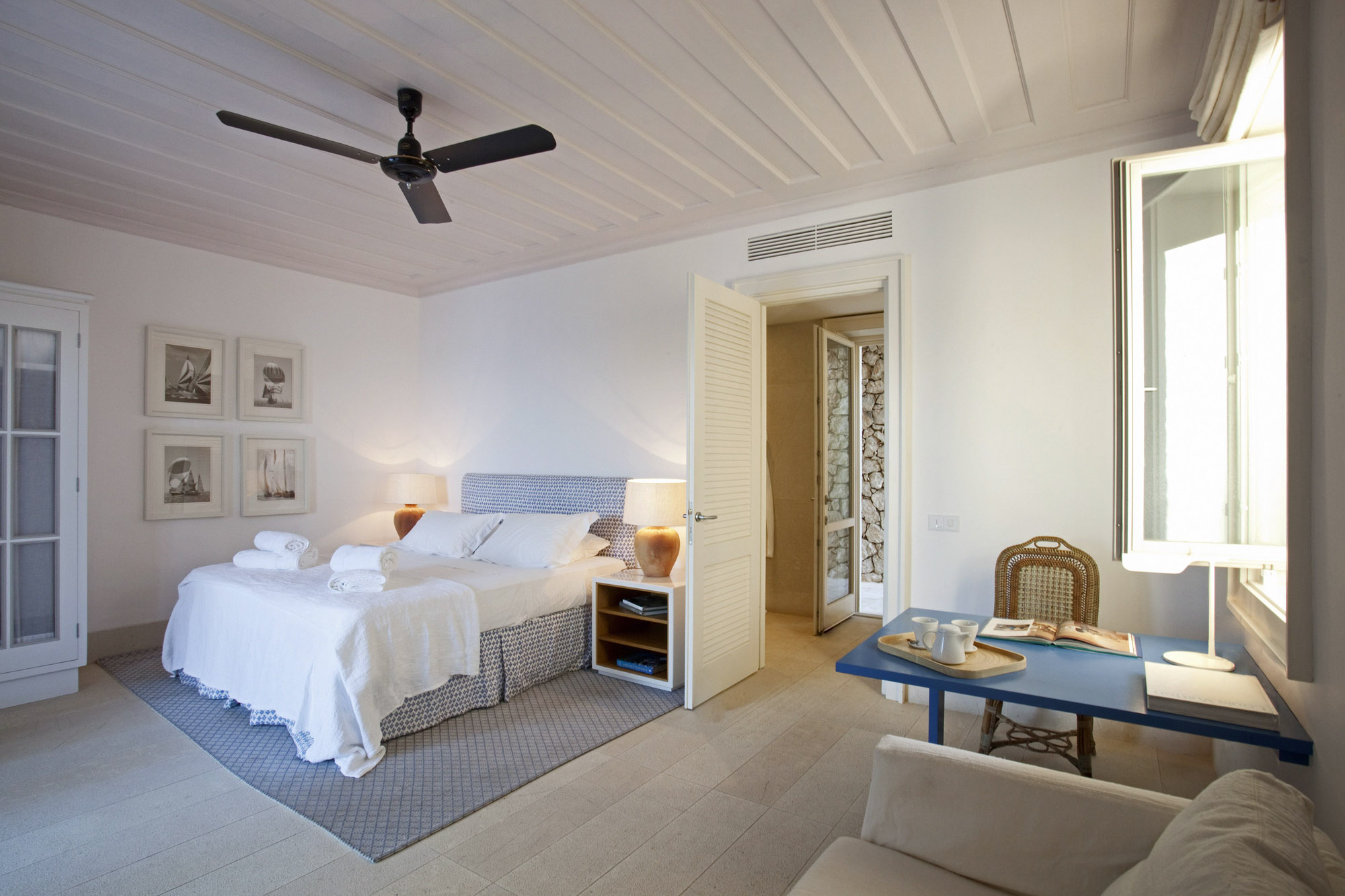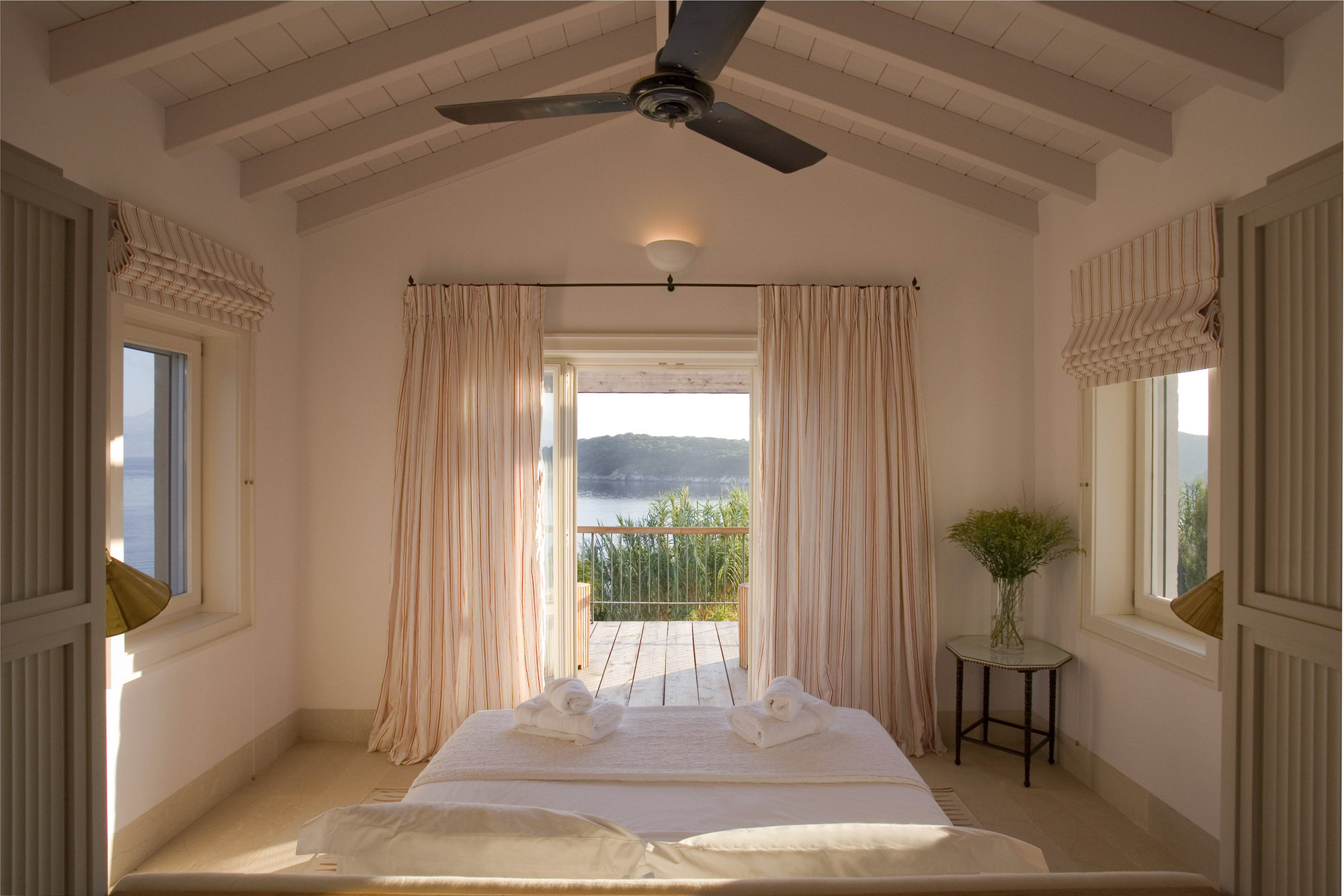 The master suite has both its own balcony and private courtyard with outside shower and seating area. Wellness facilities include a fully equipped, air conditioned, gym, yoga mats and a separate massage/treatment room.