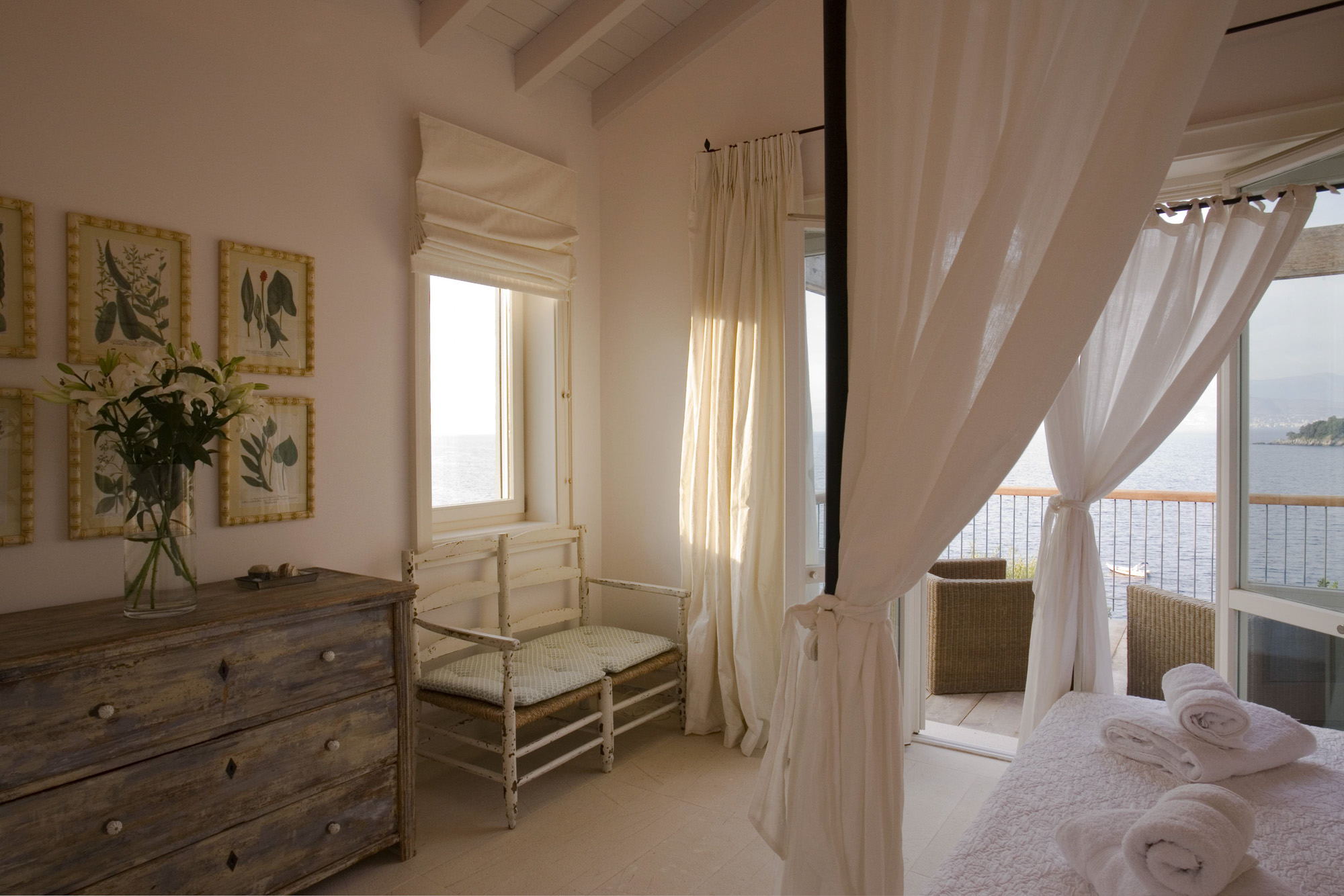 Al fresco dining is a delight, with seating for up to 10. A sparkling pool, complemented by a 4-poster day bed, offers the perfect place to lounge alongside numerous sun beds, outdoor sofas, and chairs. Guests can also enjoy a shared tennis court and table tennis. A short stroll down the path leads to the sea, where you can swim or have a boat delivered to the shared jetty for a day of coastal exploration.