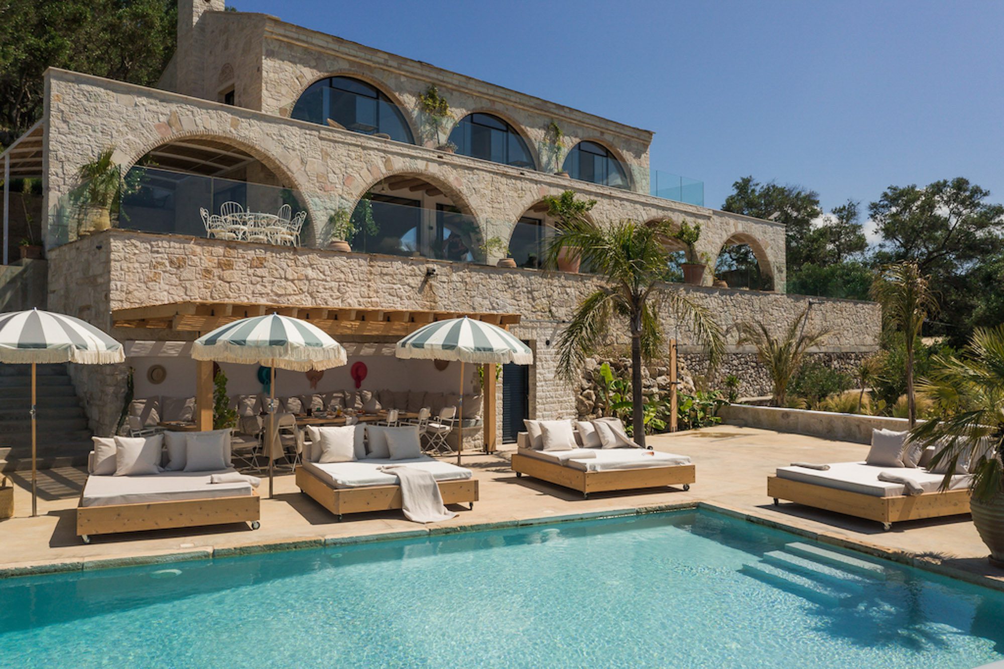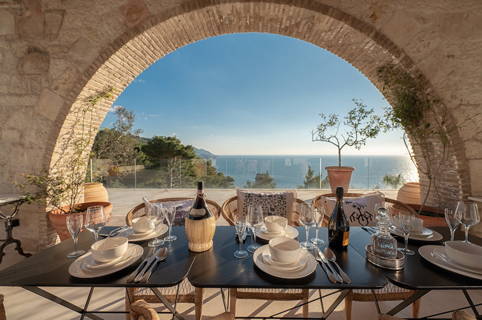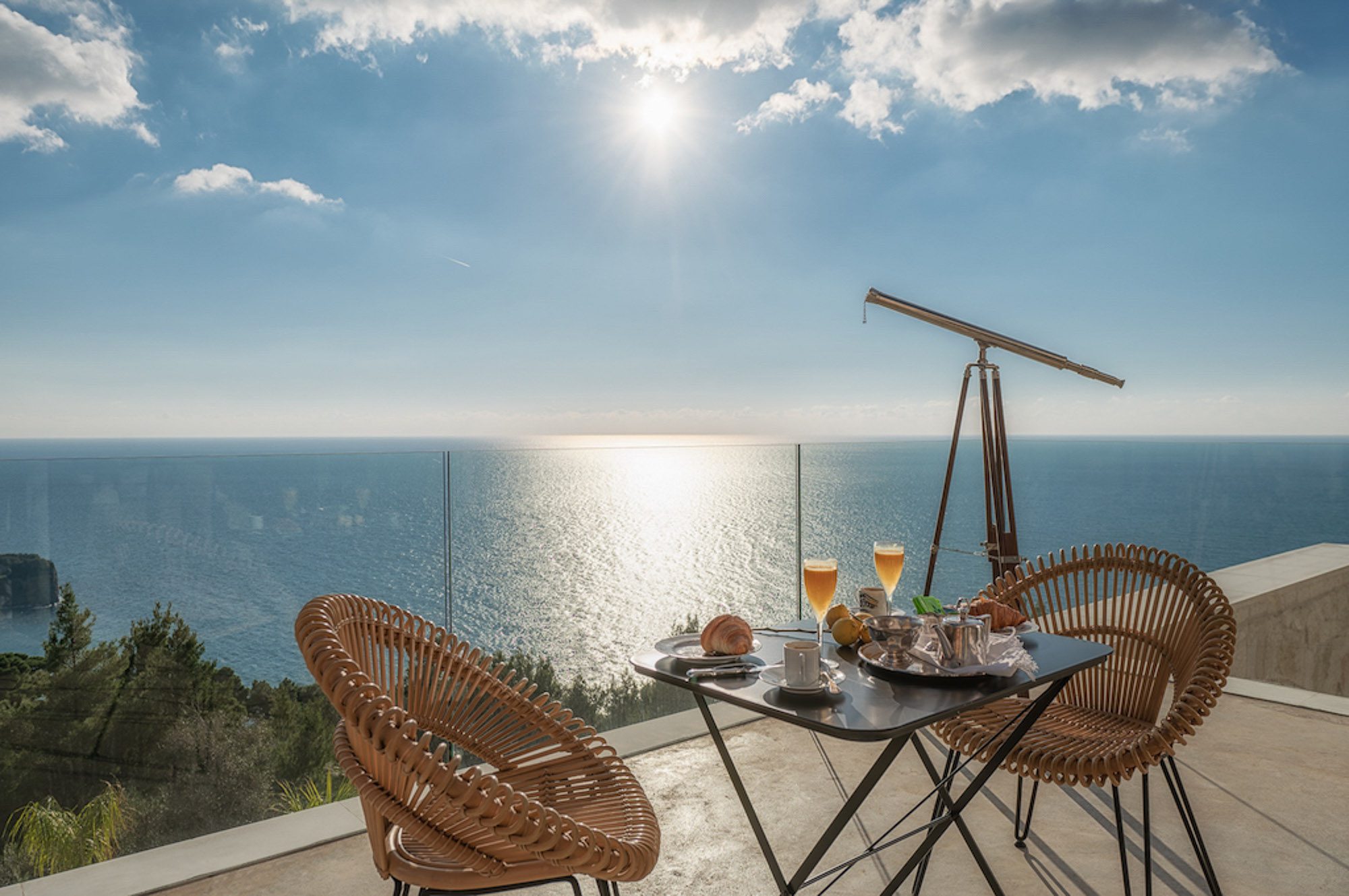 A shaded dining area along the front of the house is ideal for al fresco meals. The lower terrace invites relaxation, with plush double-width sunbeds beside an infinity pool that seems to merge with the horizon. At the back of the villa, a Moroccan-inspired garden shaded by citrus and palm trees offers hammocks, cosy seating, and an array of herbs, flowers, and exotic plants. Here, guests can unwind on soft sofas or in the hot tub, enjoying the tranquillity of a lush retreat.