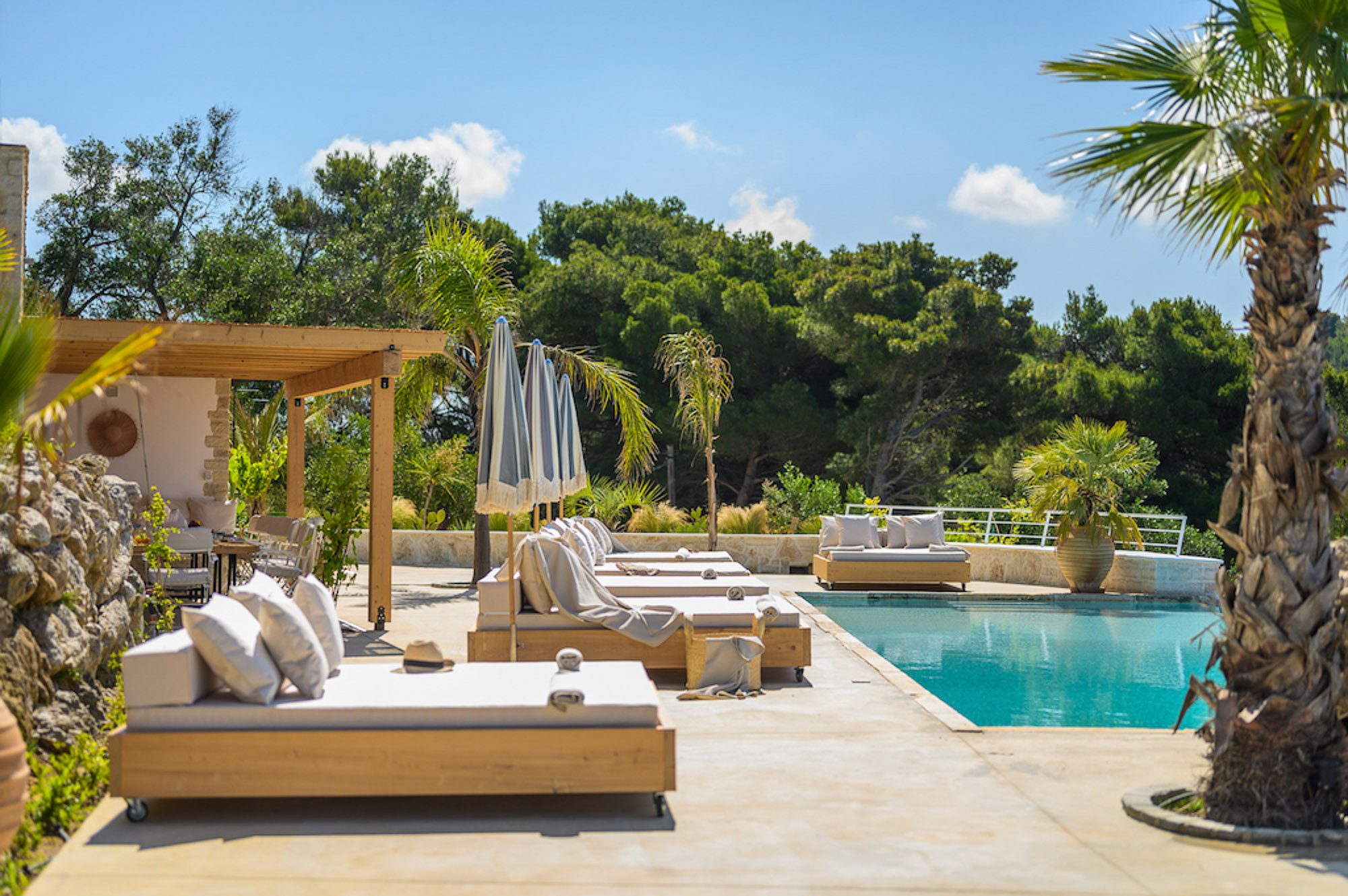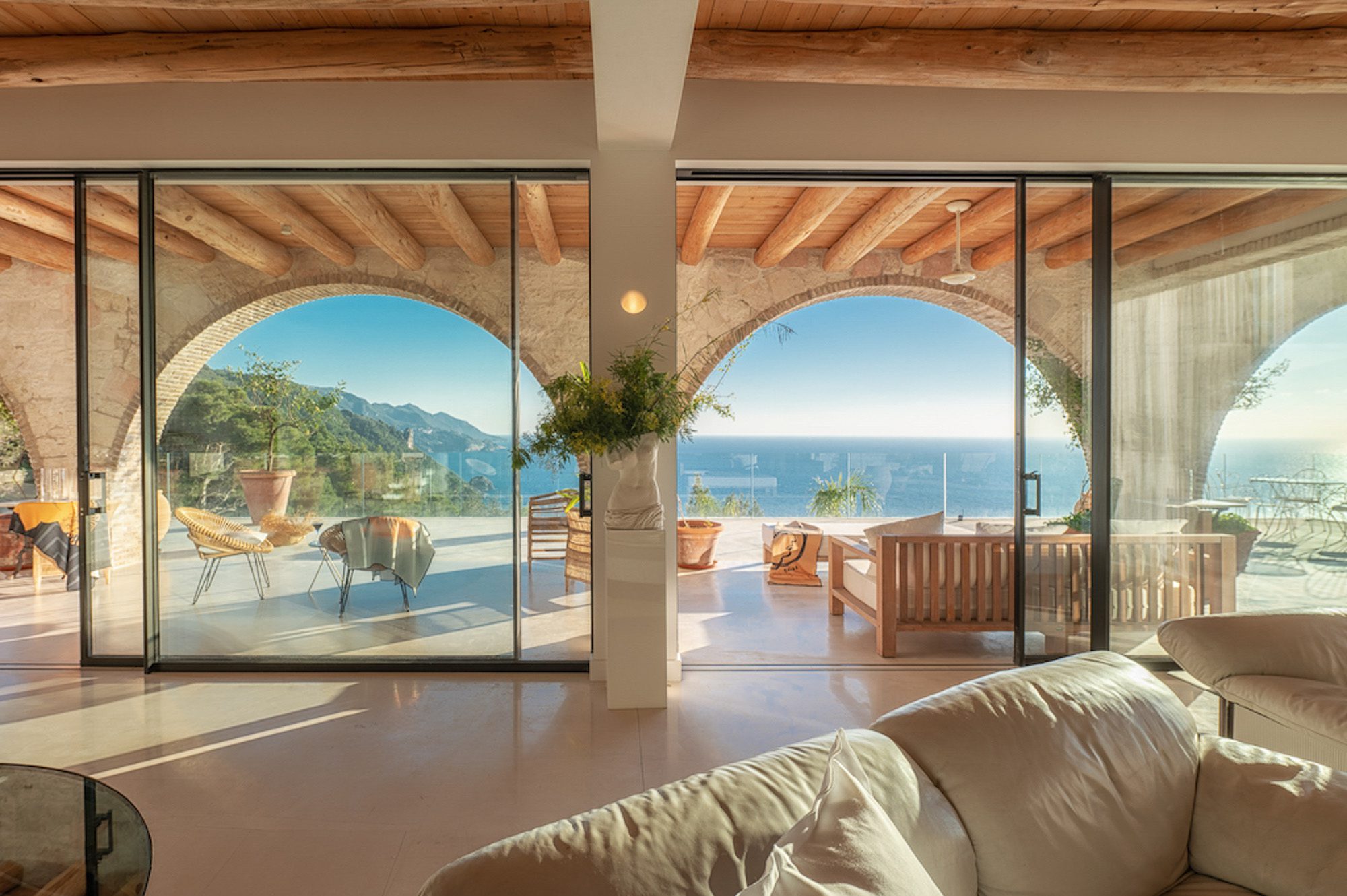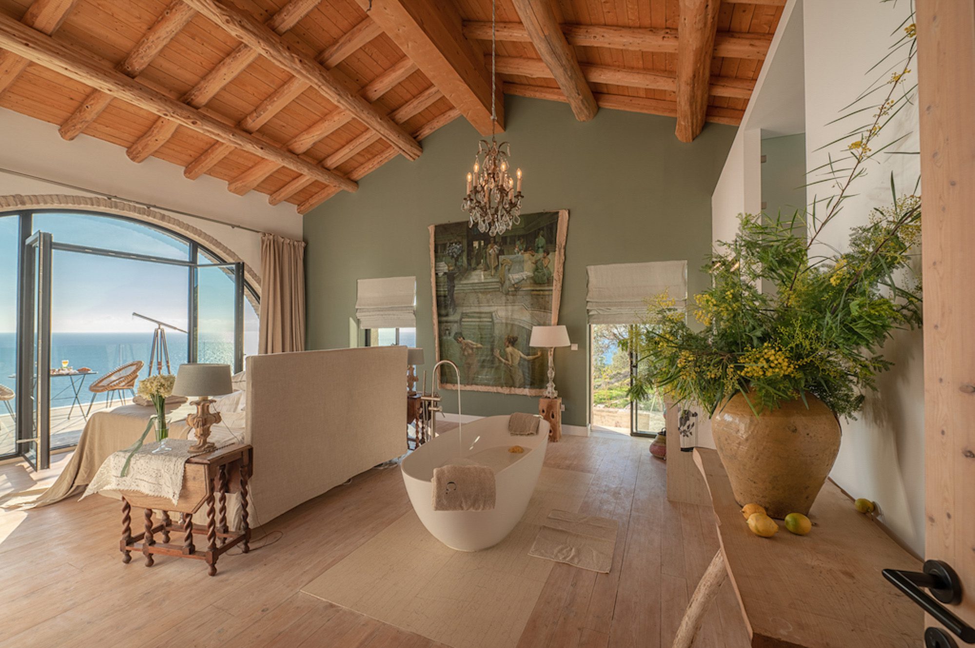 The house is largely built of classic materials that have been restored, imbuing the modern design with a sense of history. Ancient stones and traditional bricks contrast with the wall of glass. Cypress wood, used for beamed ceilings and upper floors, fills the house with its subtle perfume. The property features a private home cinema, jacuzzi, and sauna. Down below, a glass section of flooring in the living room highlights the circular wine bar beneath. The villa offers four bedrooms on the first floor and two on the lower floor.