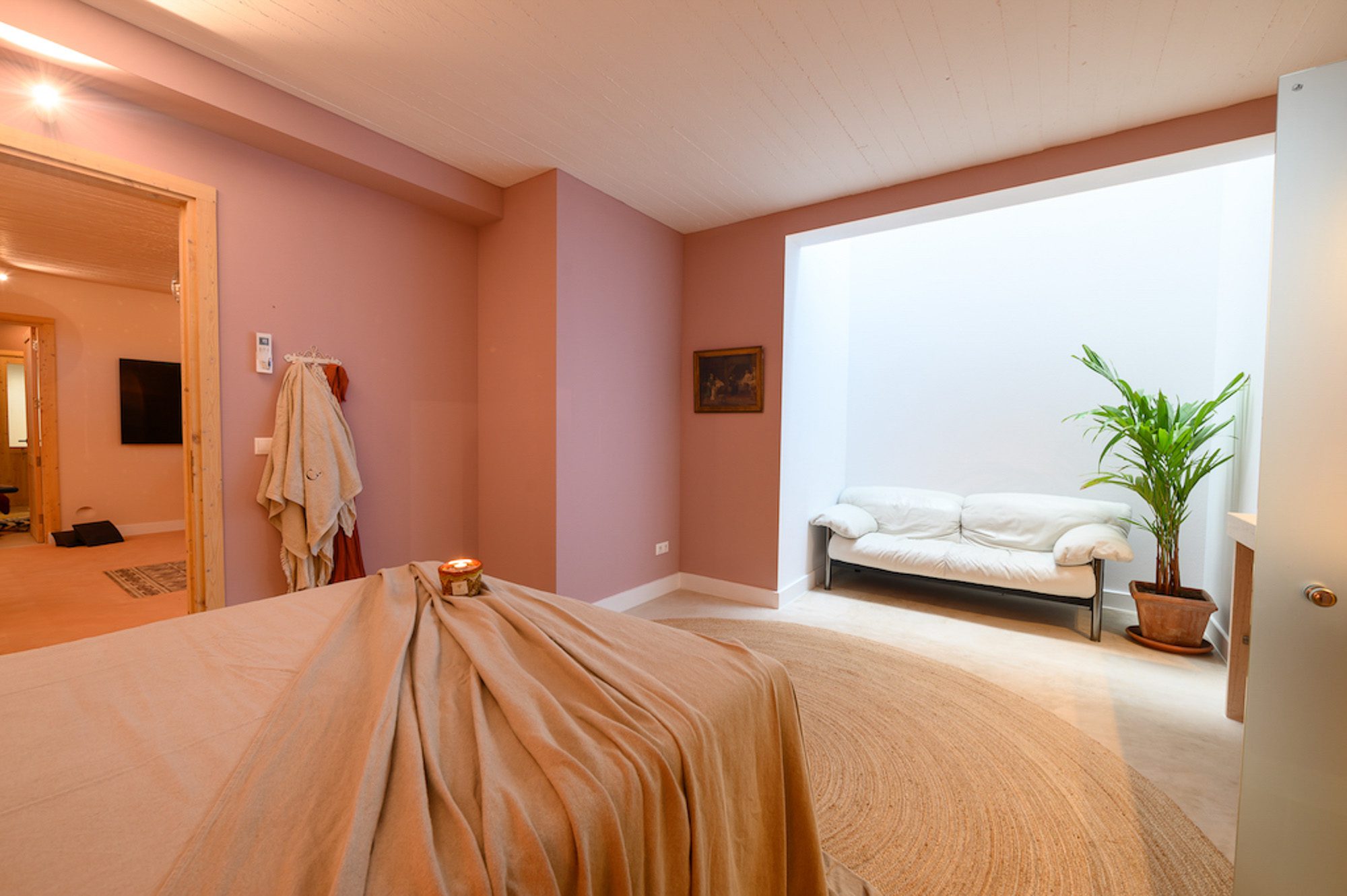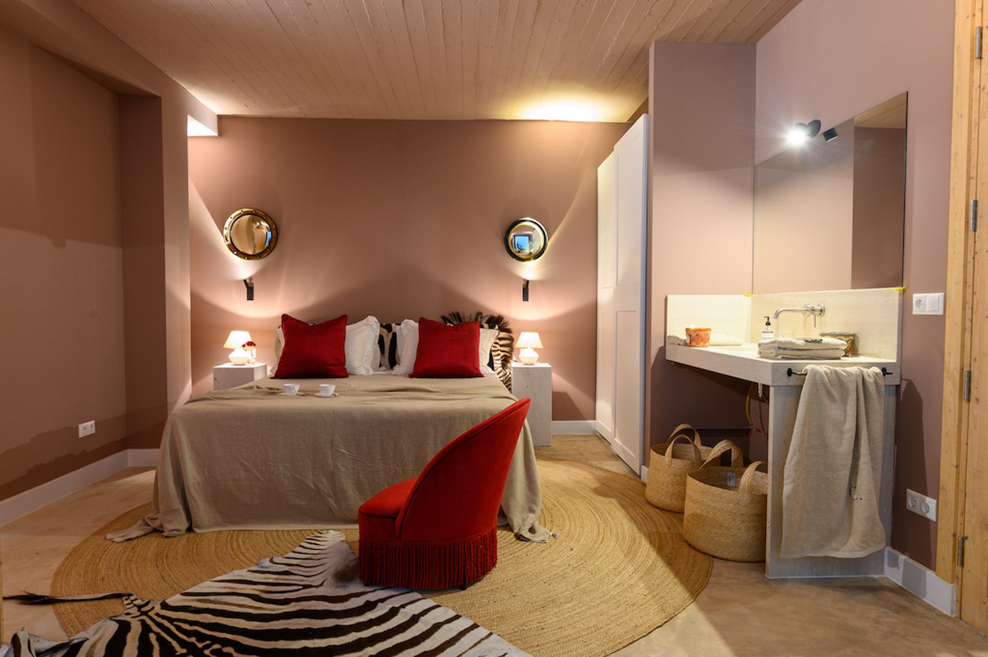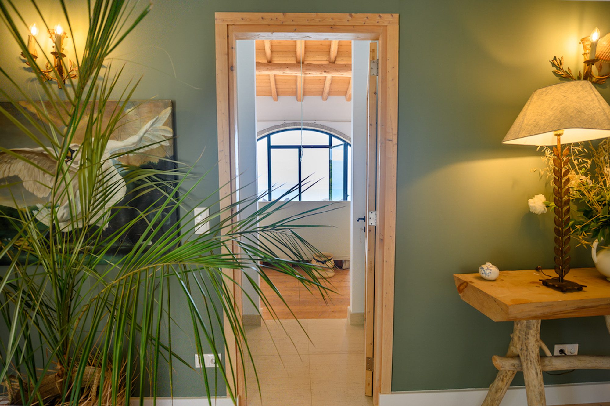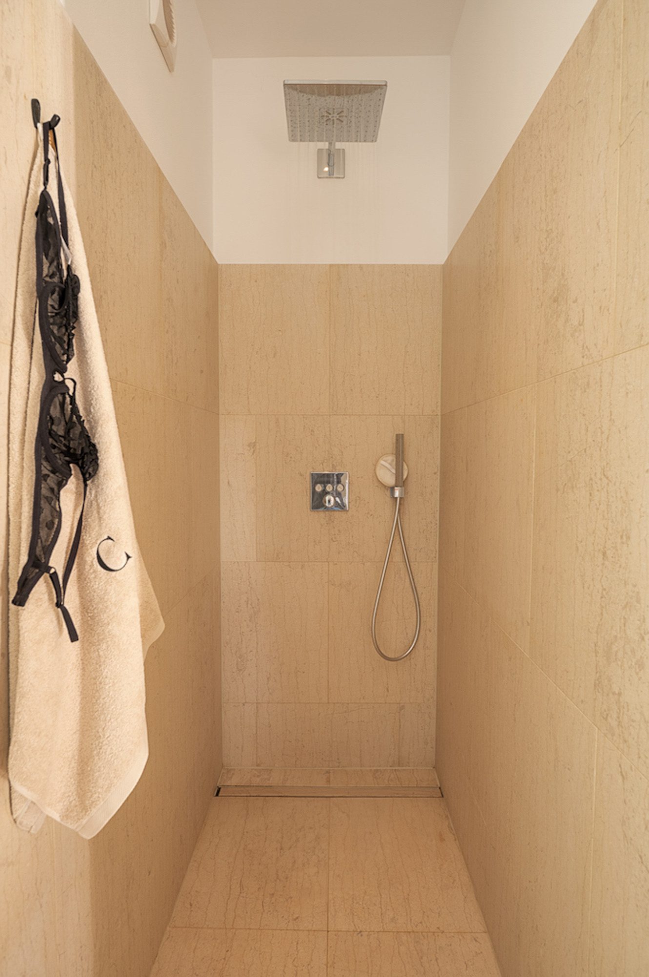 The house is largely built of classic materials that have been restored, imbuing the modern design with a sense of history. Ancient stones and traditional bricks contrast with the wall of glass. Cypress wood, used for beamed ceilings and upper floors, fills the house with its subtle perfume. The property features a private home cinema, jacuzzi, and sauna. Down below, a glass section of flooring in the living room highlights the circular wine bar beneath. The villa offers four bedrooms on the first floor and two on the lower floor.