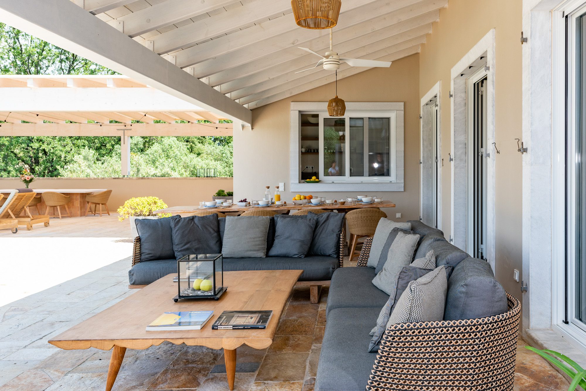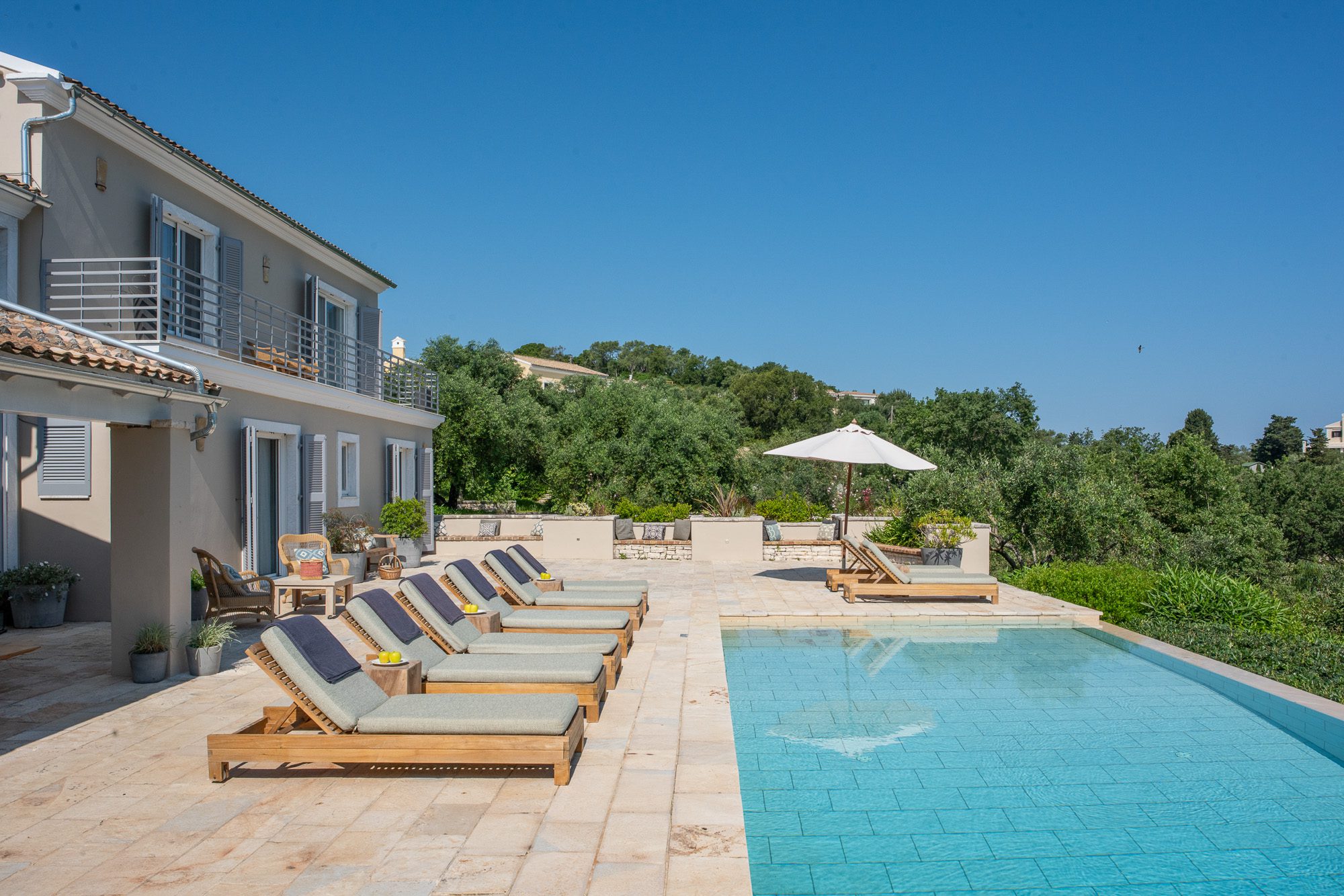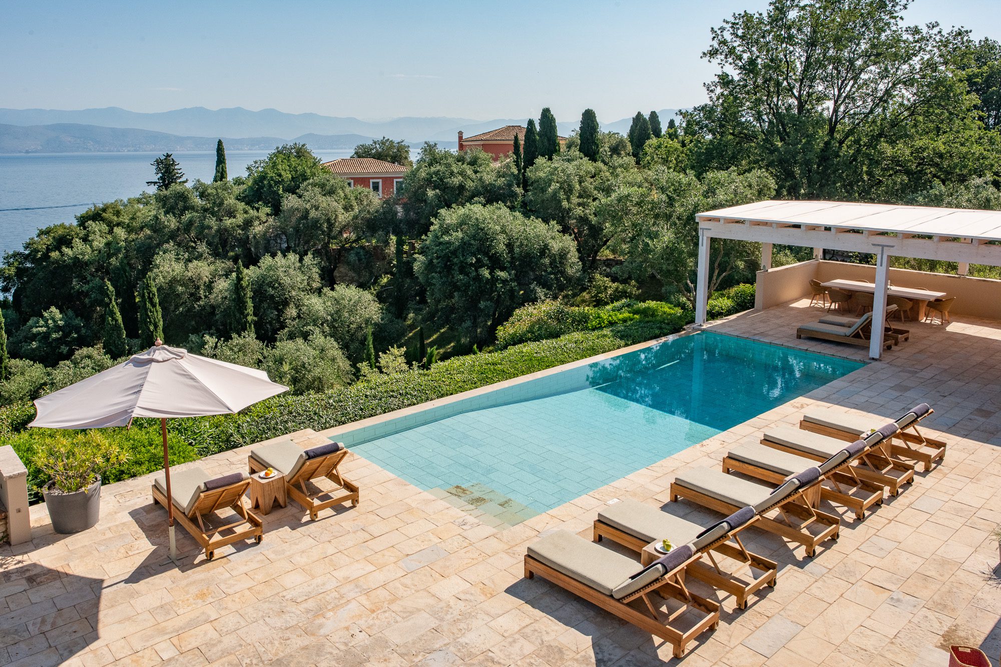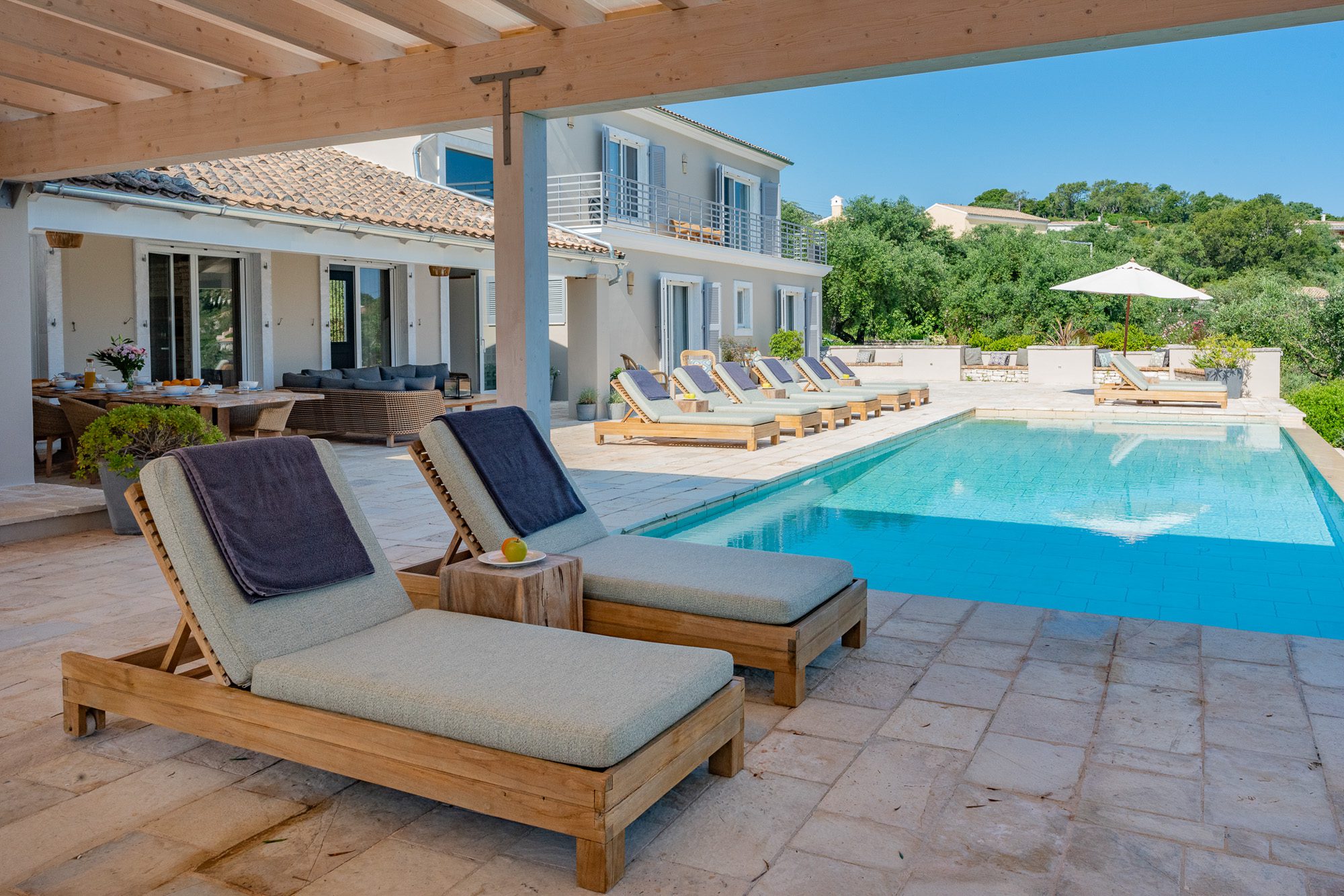 French doors lead from the house to a shaded outdoor dining area and comfortable lounge. The long wooden table comfortably seats 12 here and there's a further table and chairs under a poolside pergola. Around the terrace, there's plenty of space to position the cushioned, wooden sun loungers to relax in the sun or shade, and if you fancy a dip in the sea, you can take the path leading down through the grounds to the little beach and the estate jetty. Zogita is a wonderful place for a memorable Corfu family holiday.