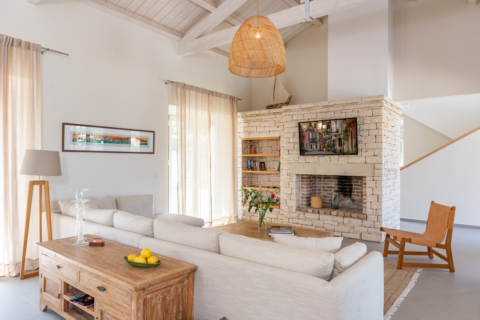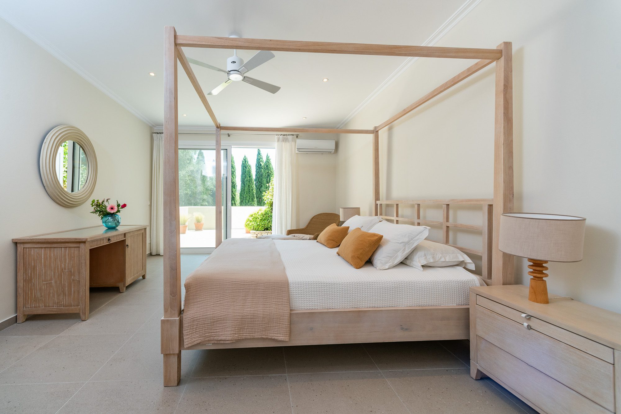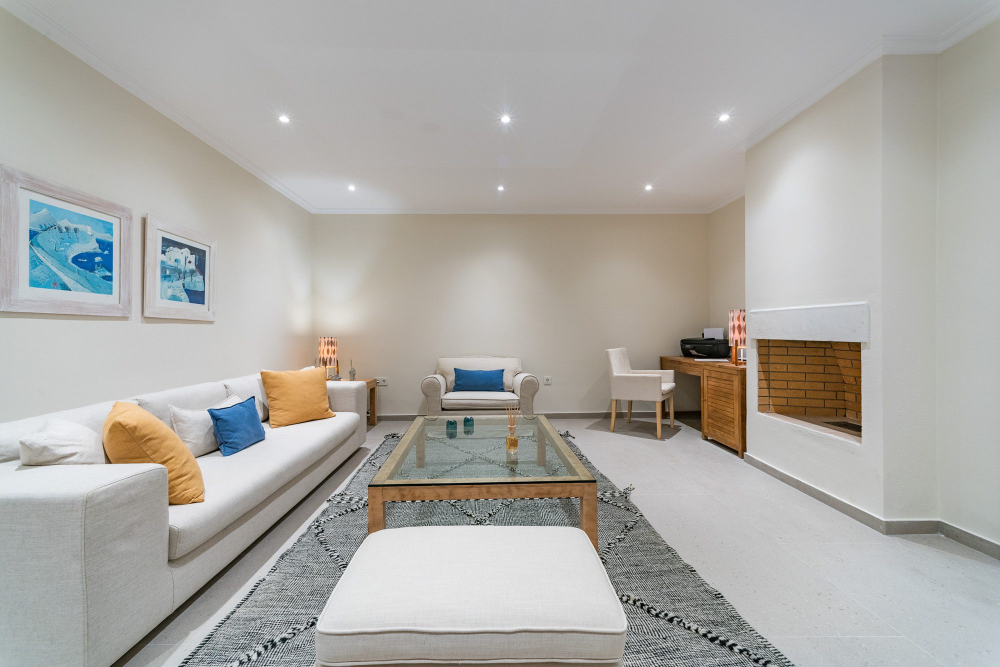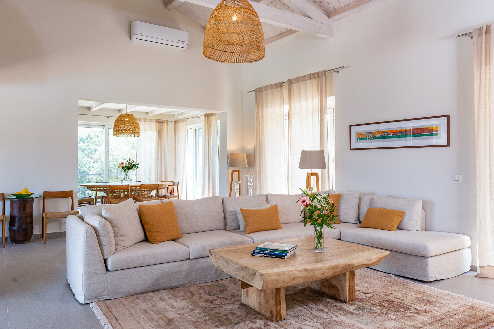 A range of contemporary wooden furniture, deep pale sofas, clean lines, and predominantly off-white interiors keep the spaces feeling light, bright, and spacious. Accommodation is set over three levels with five bedrooms, bathrooms, and ample living space. Ground-floor bedrooms have access to the pool terrace; the master bedroom on the first floor has a private balcony with far-reaching views. It is a practically designed house for a large gathering, giving guests both privacy and space to gather together.