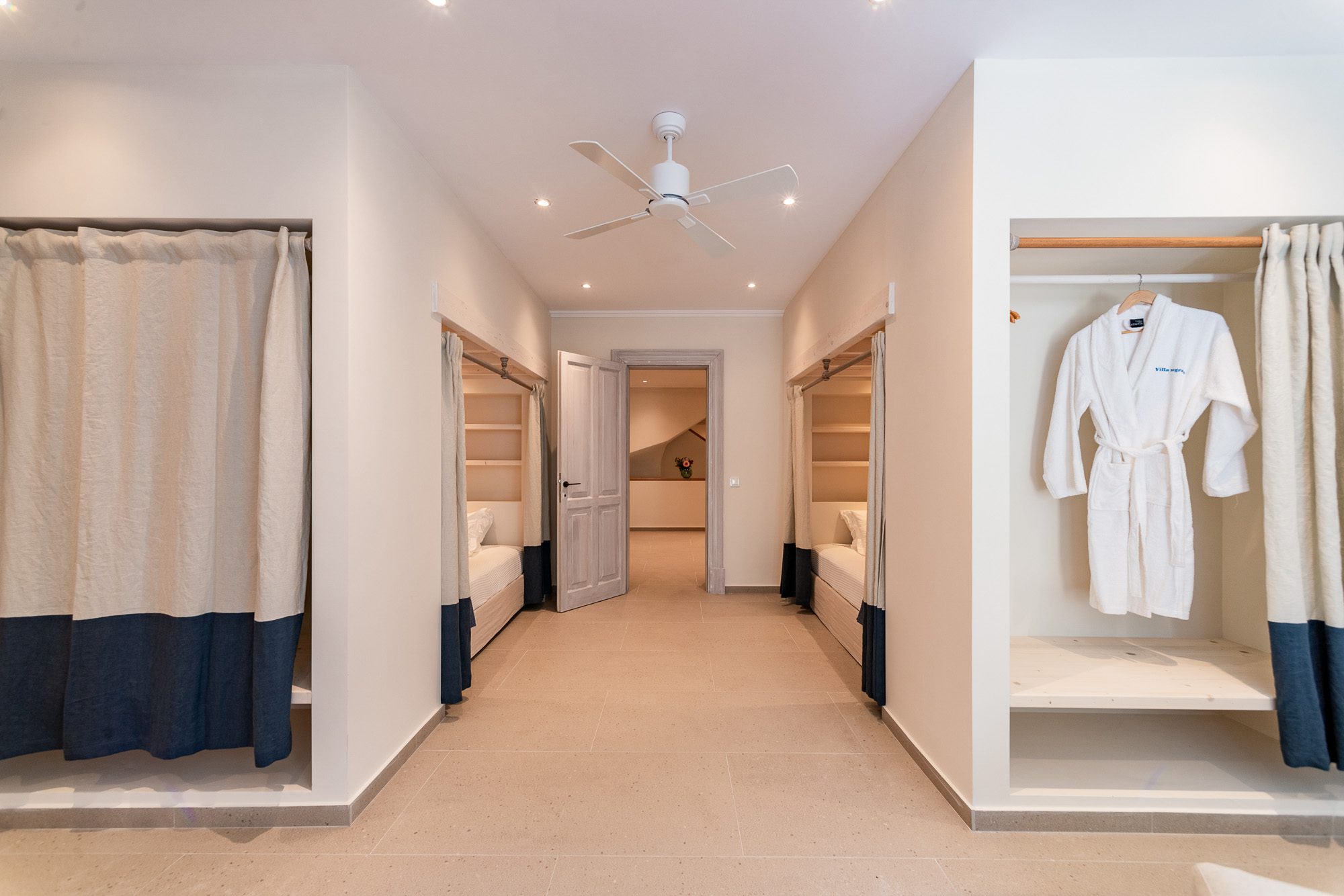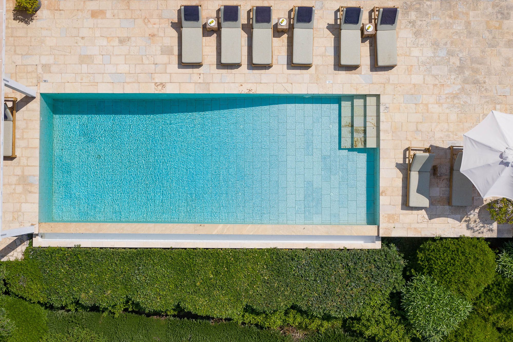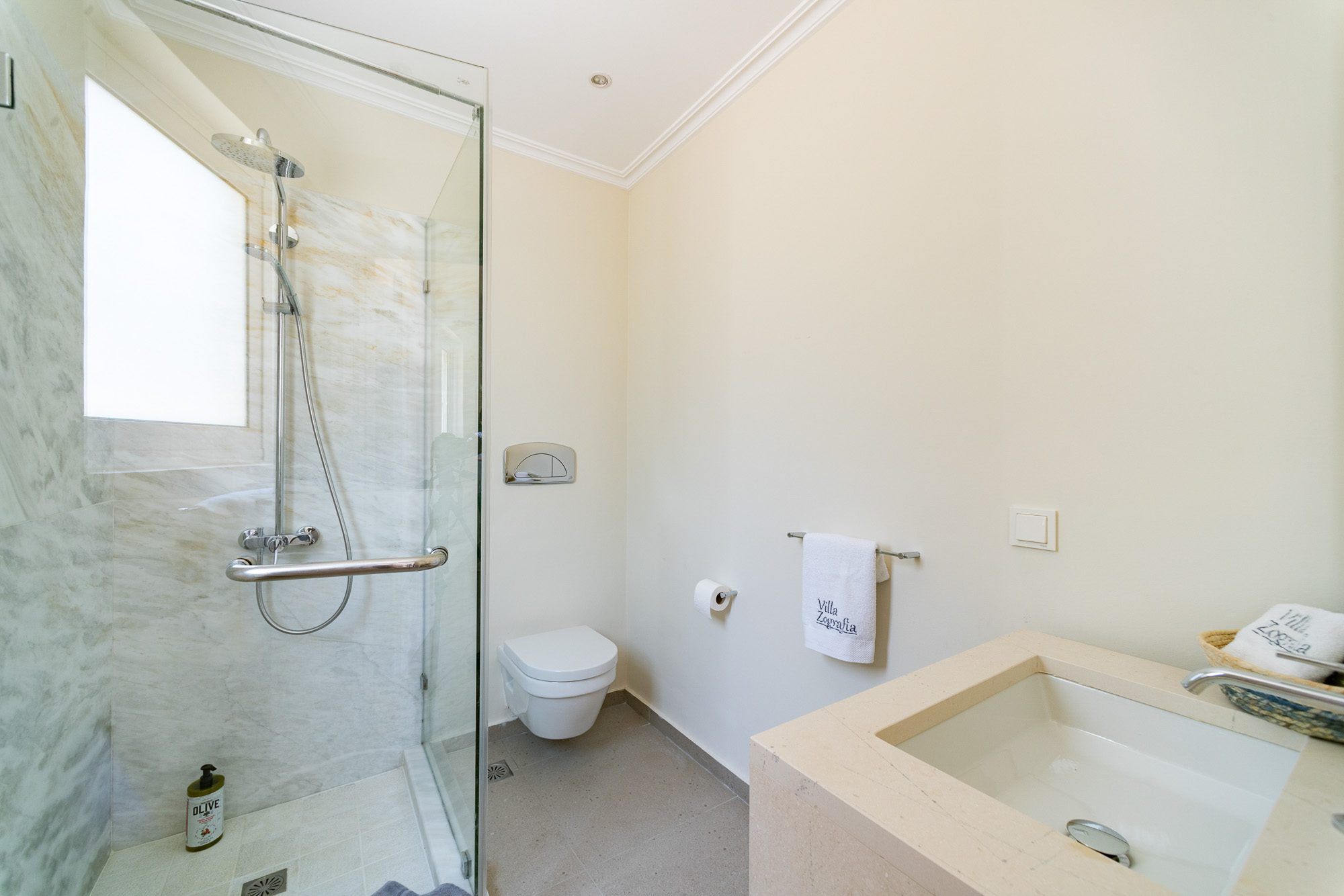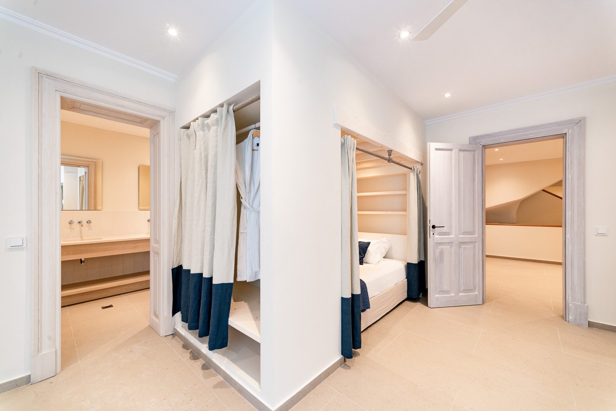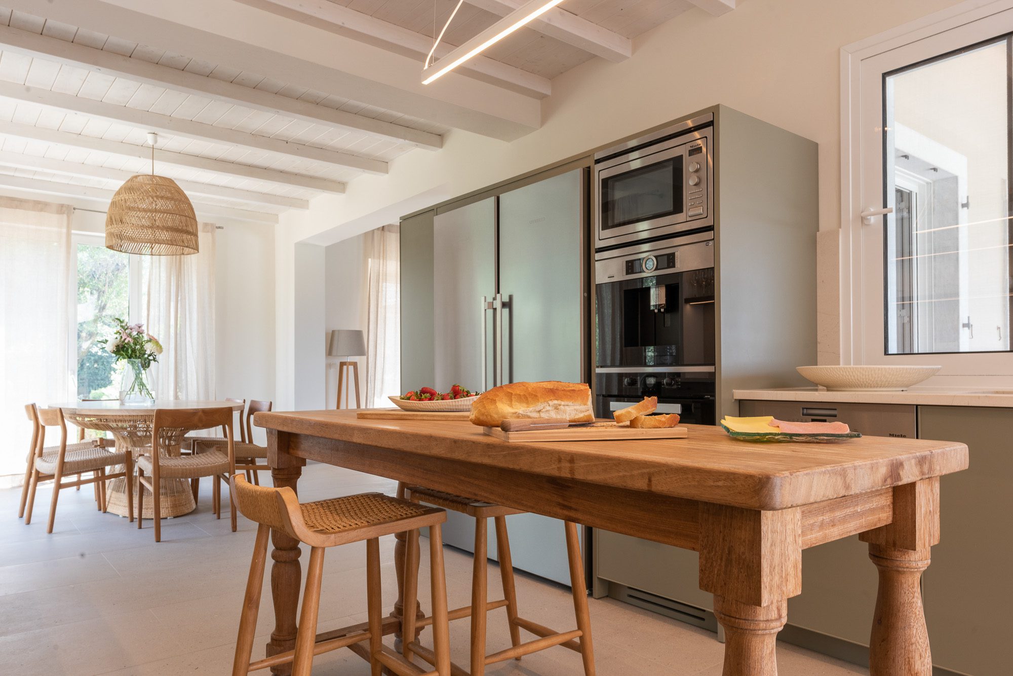 A range of contemporary wooden furniture, deep pale sofas, clean lines, and predominantly off-white interiors keep the spaces feeling light, bright, and spacious. Accommodation is set over three levels with five bedrooms, bathrooms, and ample living space. Ground-floor bedrooms have access to the pool terrace; the master bedroom on the first floor has a private balcony with far-reaching views. It is a practically designed house for a large gathering, giving guests both privacy and space to gather together.