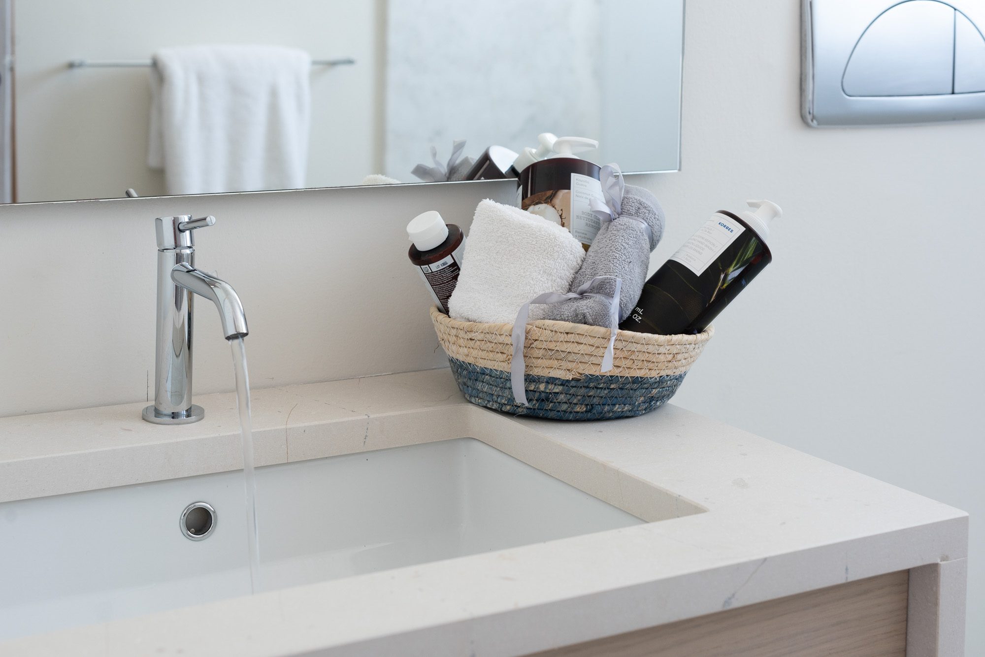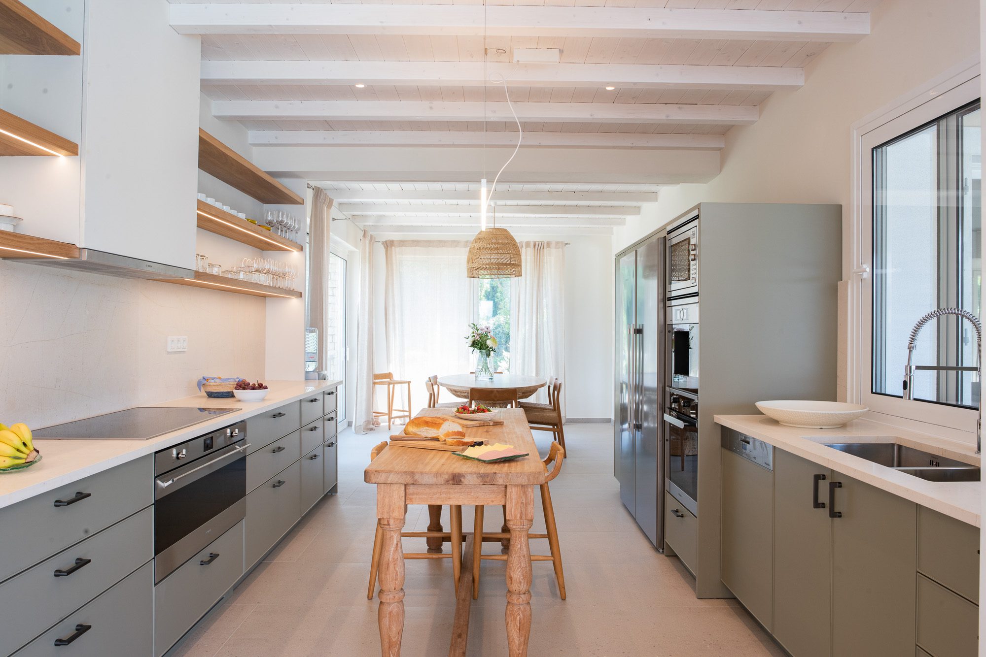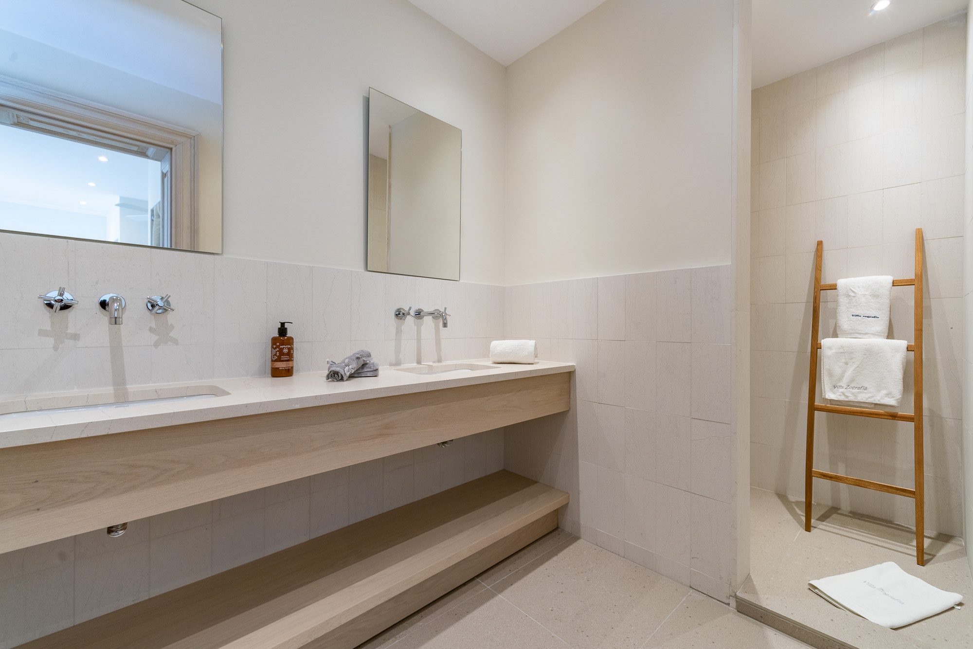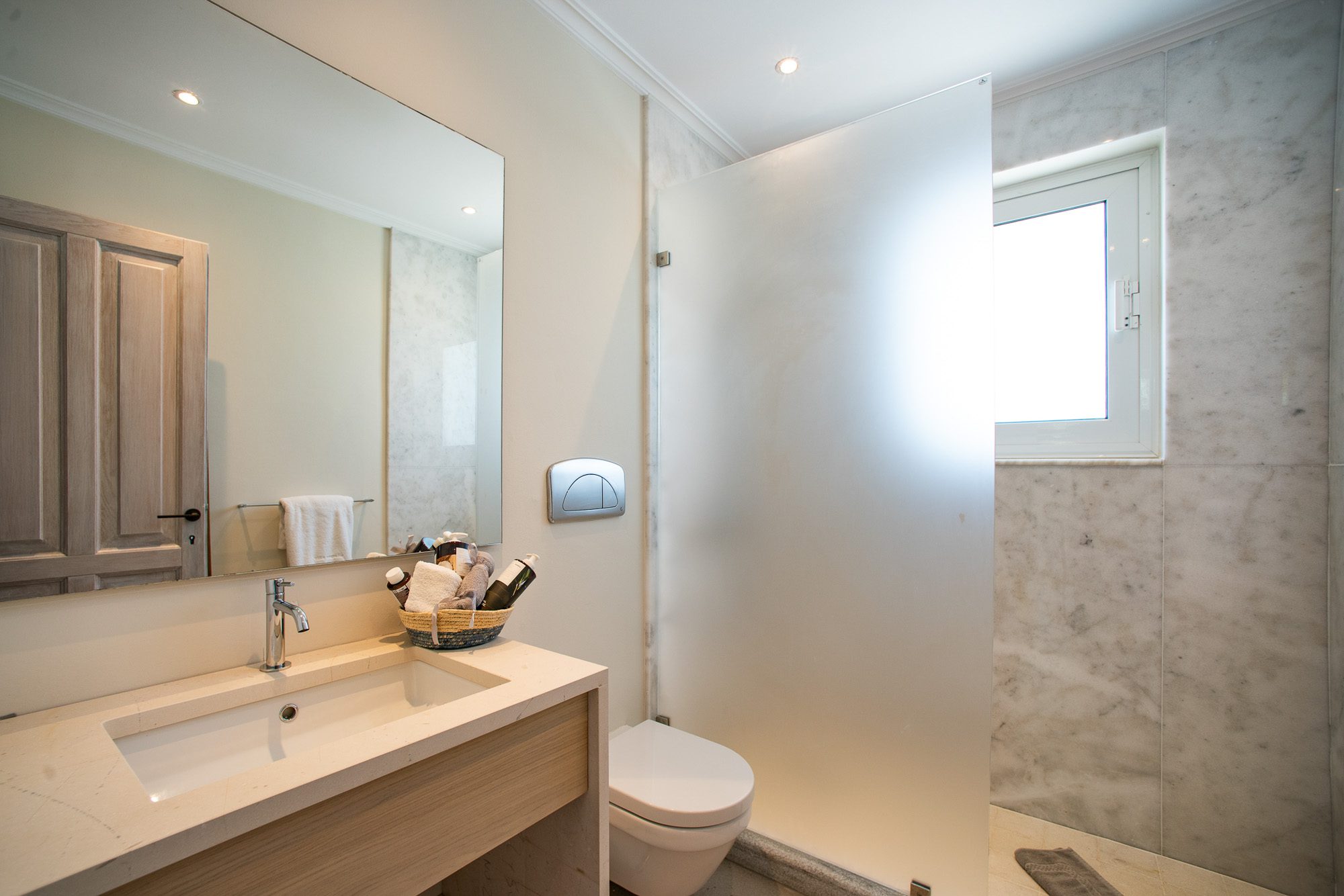 A range of contemporary wooden furniture, deep pale sofas, clean lines, and predominantly off-white interiors keep the spaces feeling light, bright, and spacious. Accommodation is set over three levels with five bedrooms, bathrooms, and ample living space. Ground-floor bedrooms have access to the pool terrace; the master bedroom on the first floor has a private balcony with far-reaching views. It is a practically designed house for a large gathering, giving guests both privacy and space to gather together.