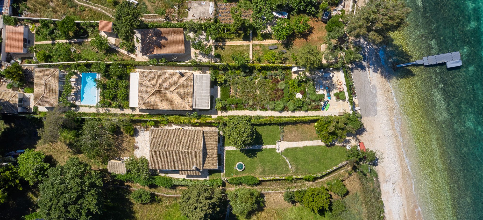 The villa comprises three separate cottages surrounded by colourful, scented gardens. An easy 15-minute walk via an olive grove leads to the tavernas and bars of Kassiopi or a 15-minute walk south takes you to Avlaki. The best way to explore the coastline however is by boat from the villas jetty.