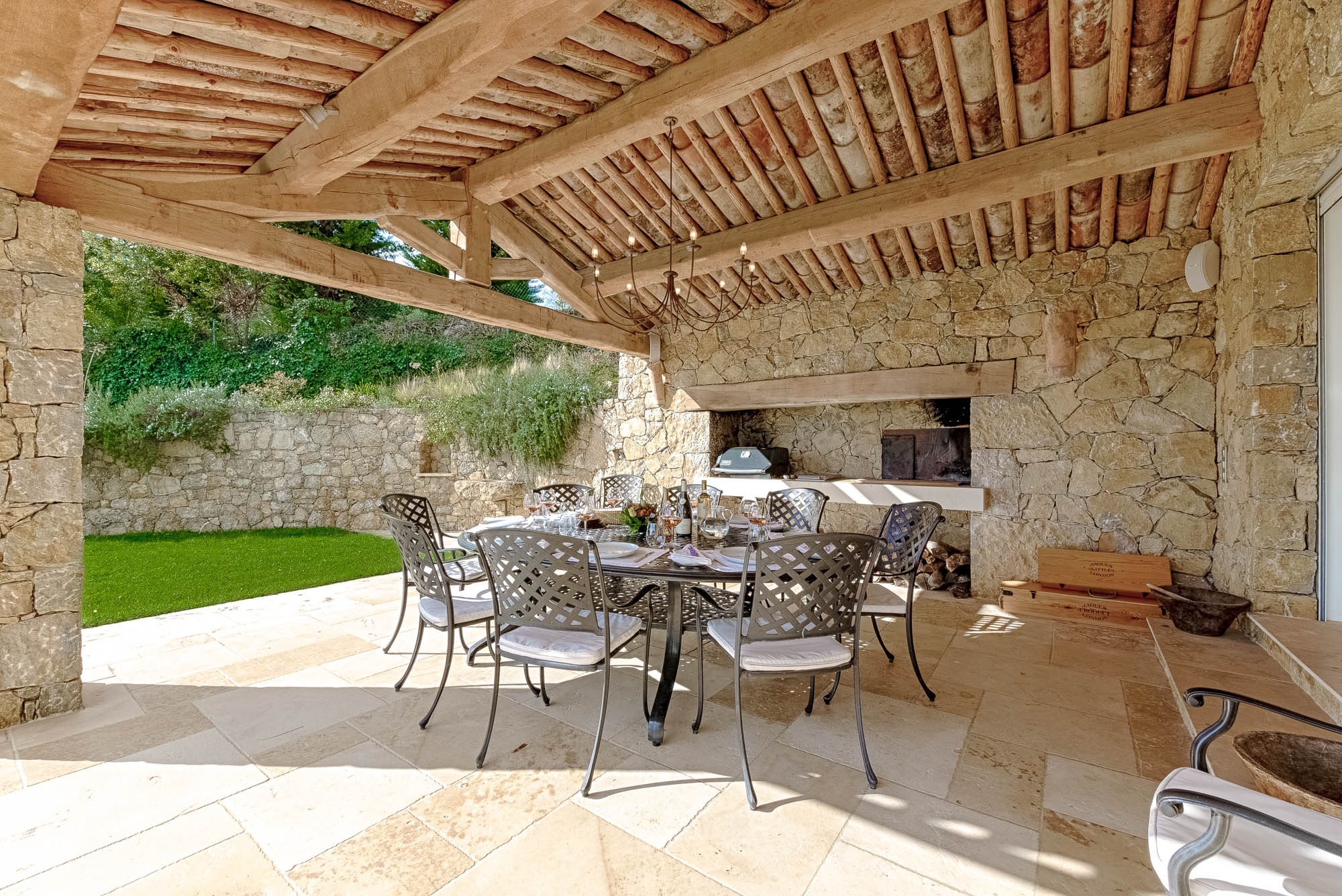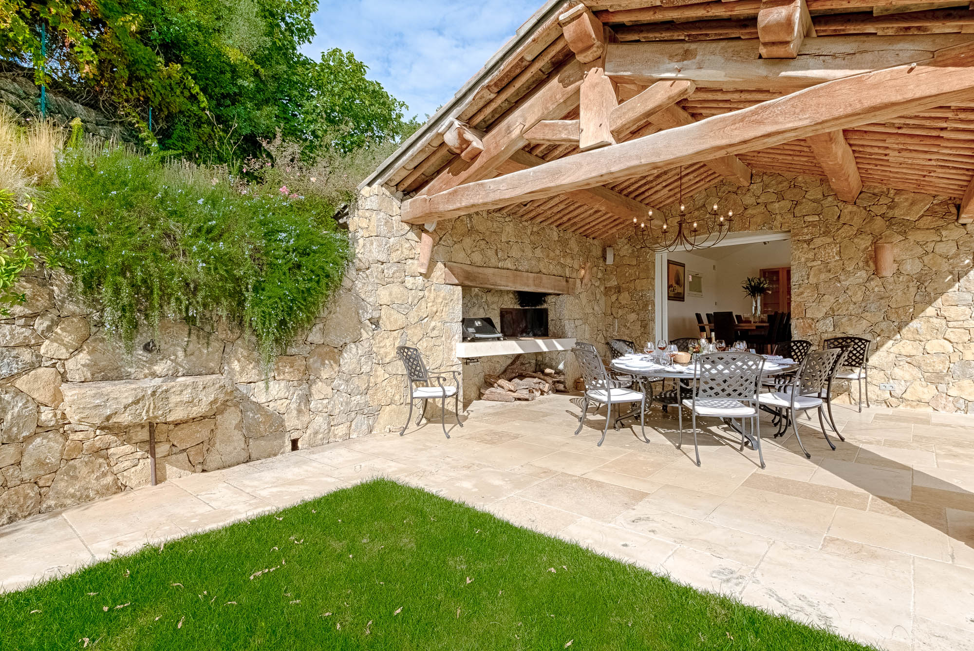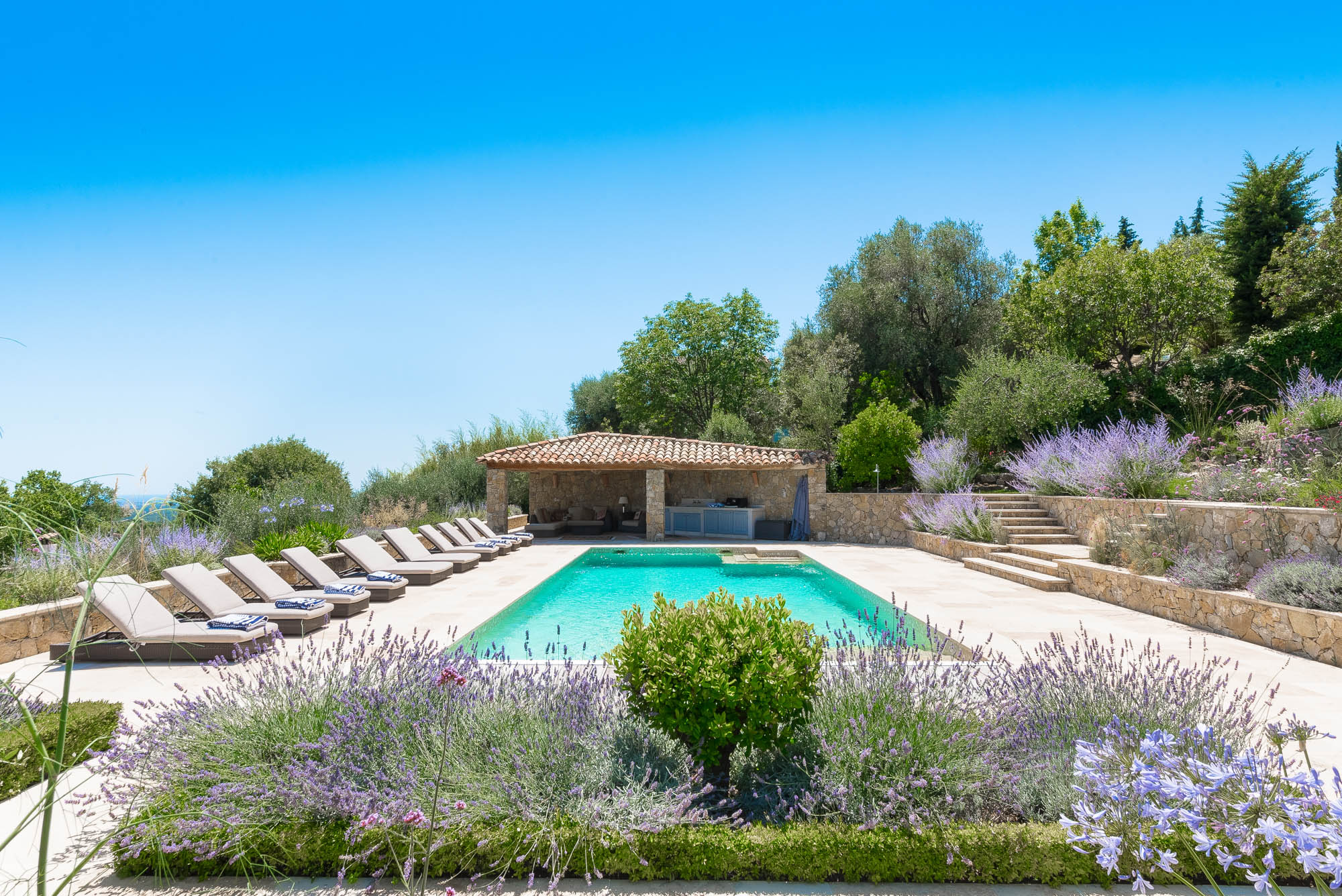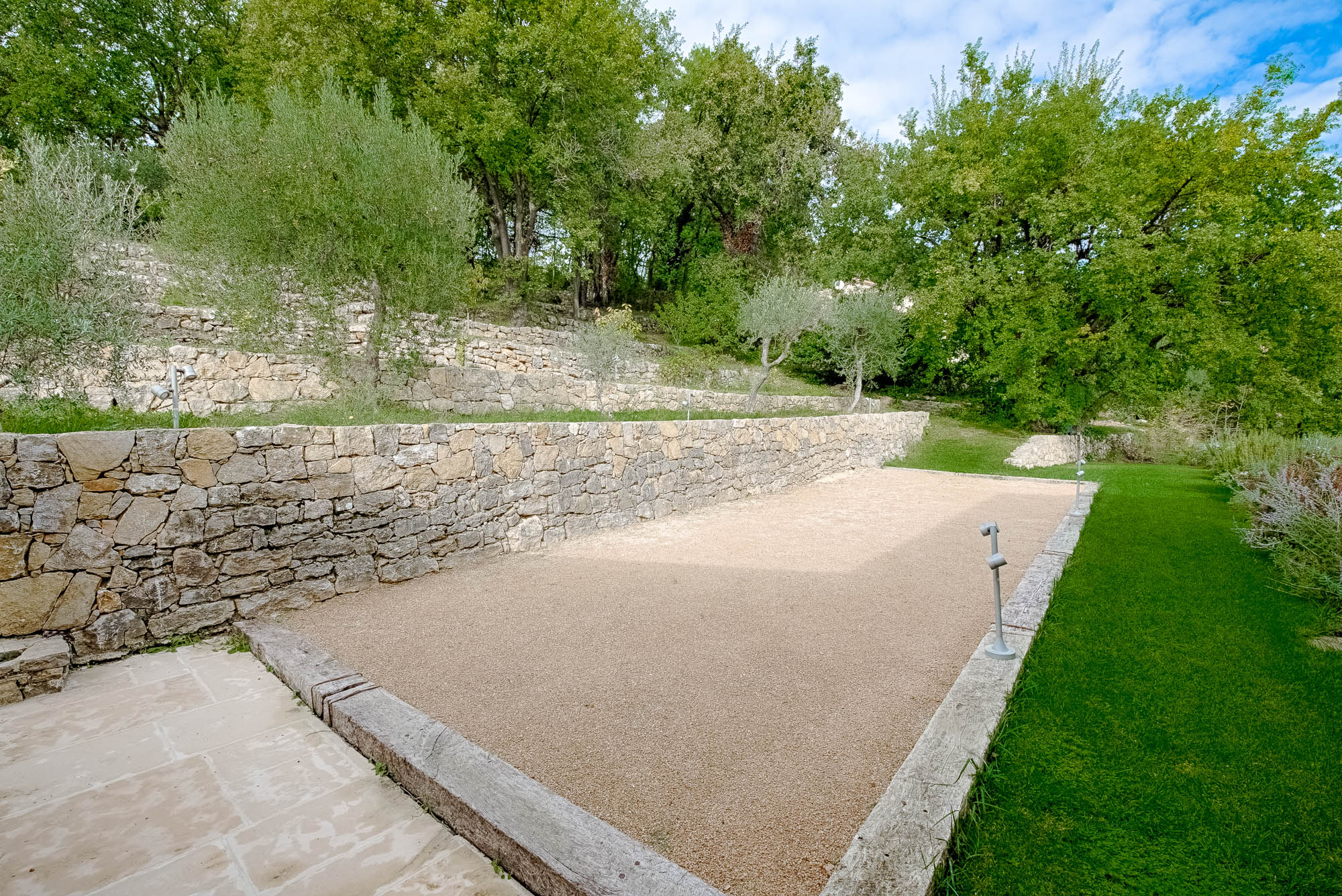 The extensive grounds include terraces, lawns, and Mediterranean plants, offering shaded areas perfect for relaxation. There’s a boules court with night-time lighting, a swimming pool, and a pool house with a Weber BBQ and drinks fridge. A large covered dining area opens out from the kitchen. The garden spans 12,000 sqm and features olive terraces and Mediterranean landscaping.