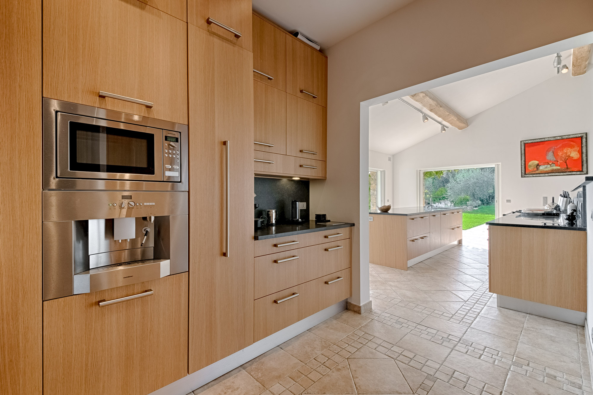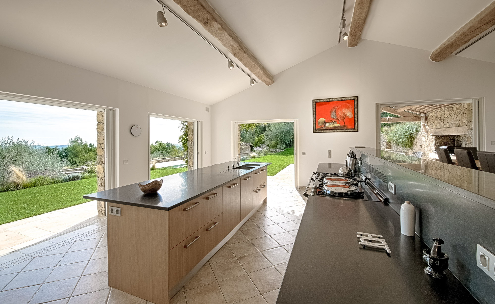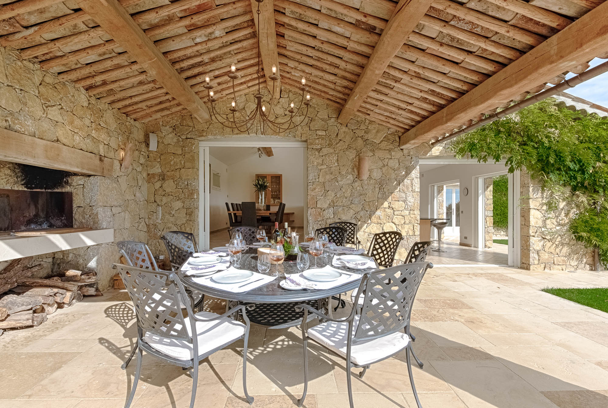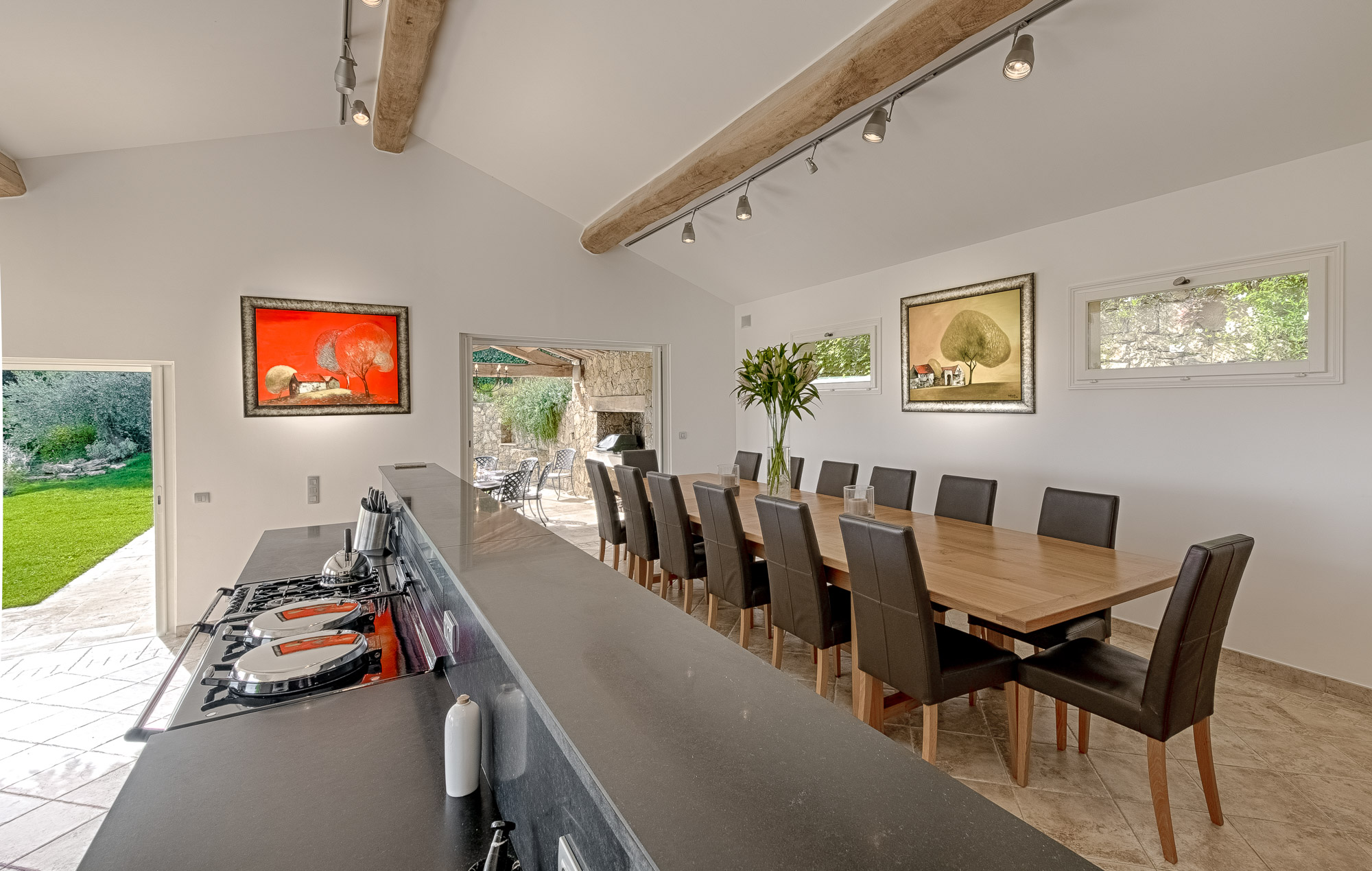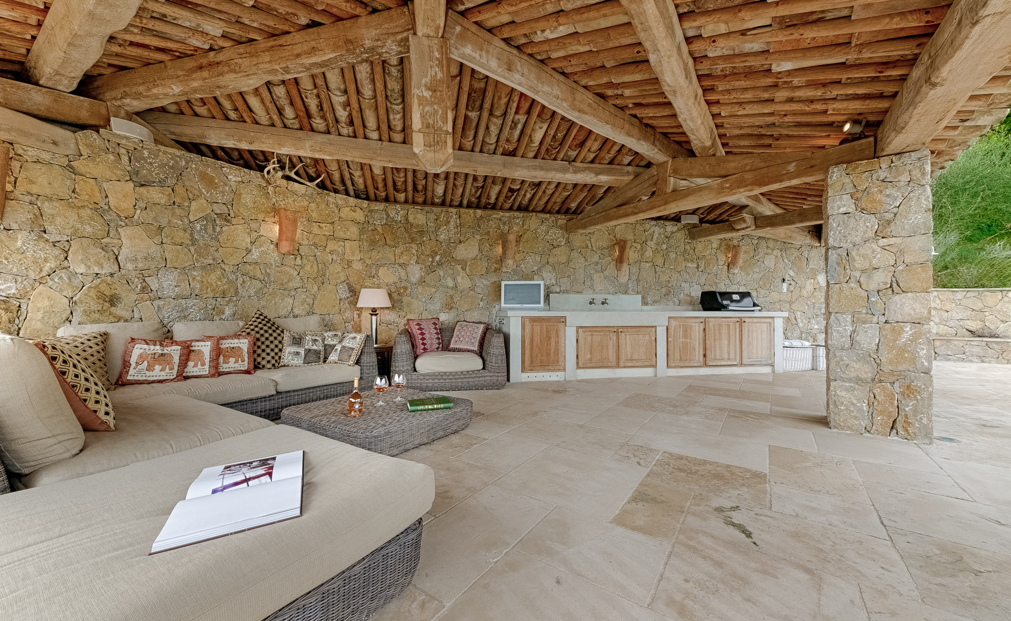 The extensive grounds include terraces, lawns, and Mediterranean plants, offering shaded areas perfect for relaxation. There’s a boules court with night-time lighting, a swimming pool, and a pool house with a Weber BBQ and drinks fridge. A large covered dining area opens out from the kitchen. The garden spans 12,000 sqm and features olive terraces and Mediterranean landscaping.