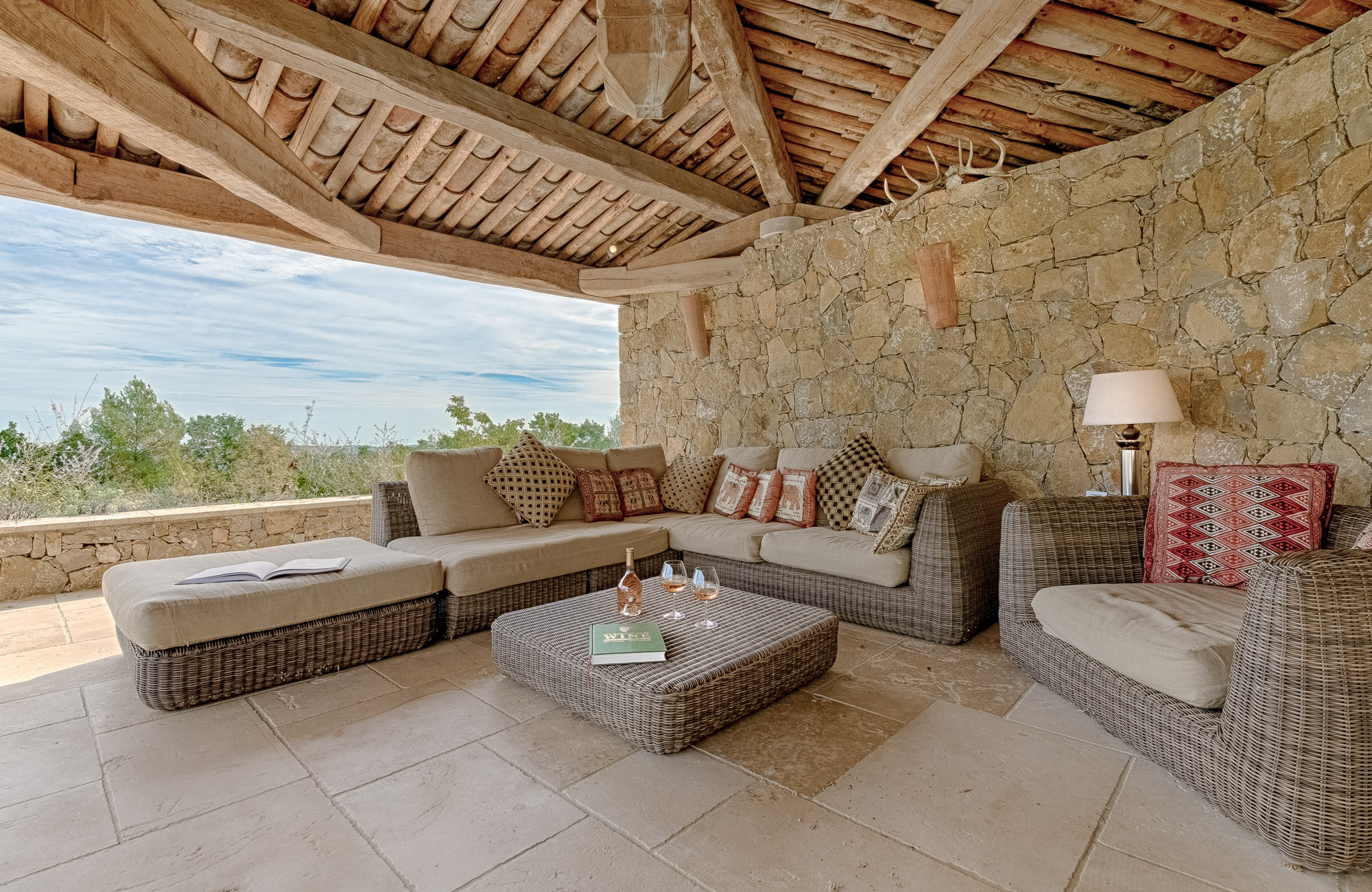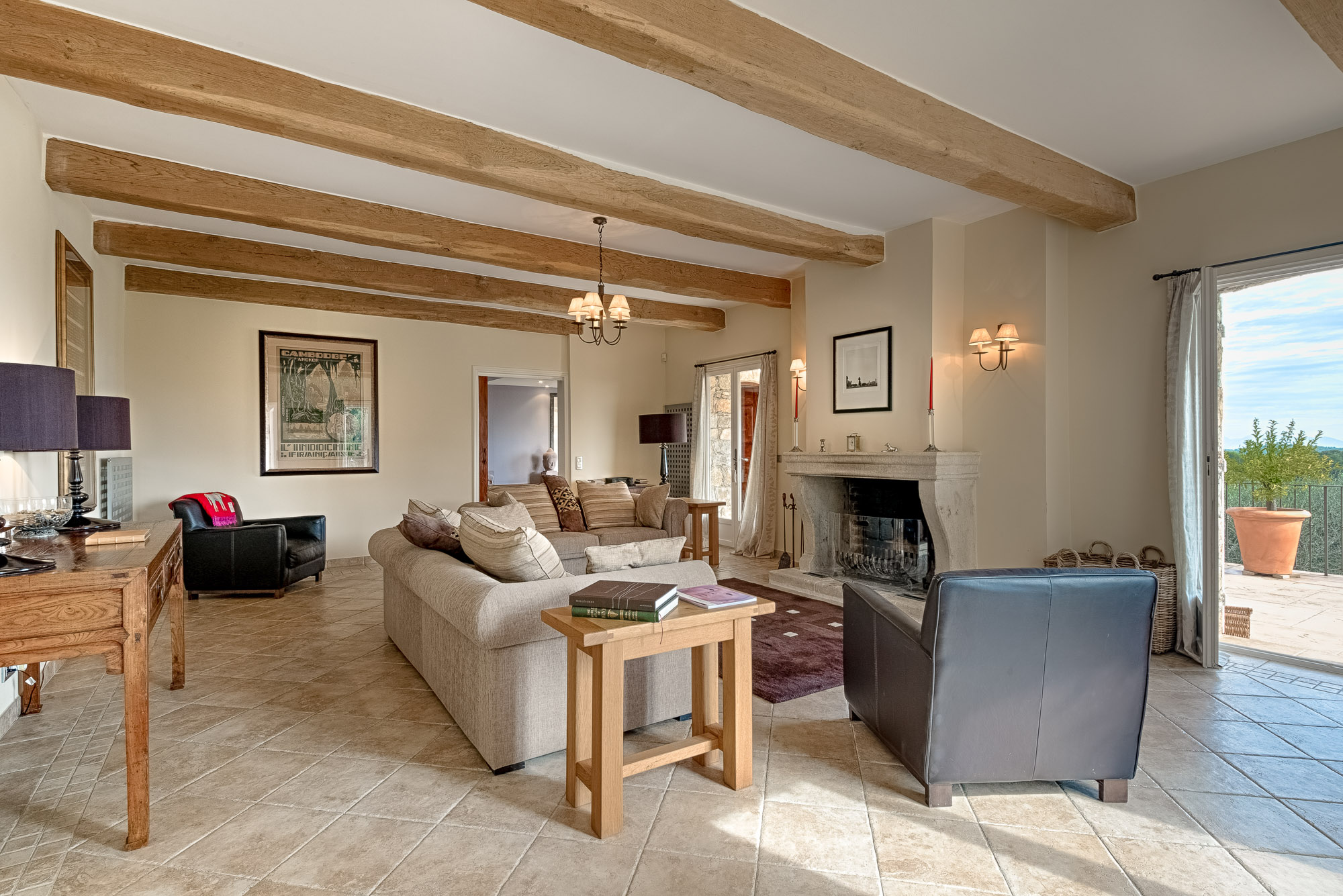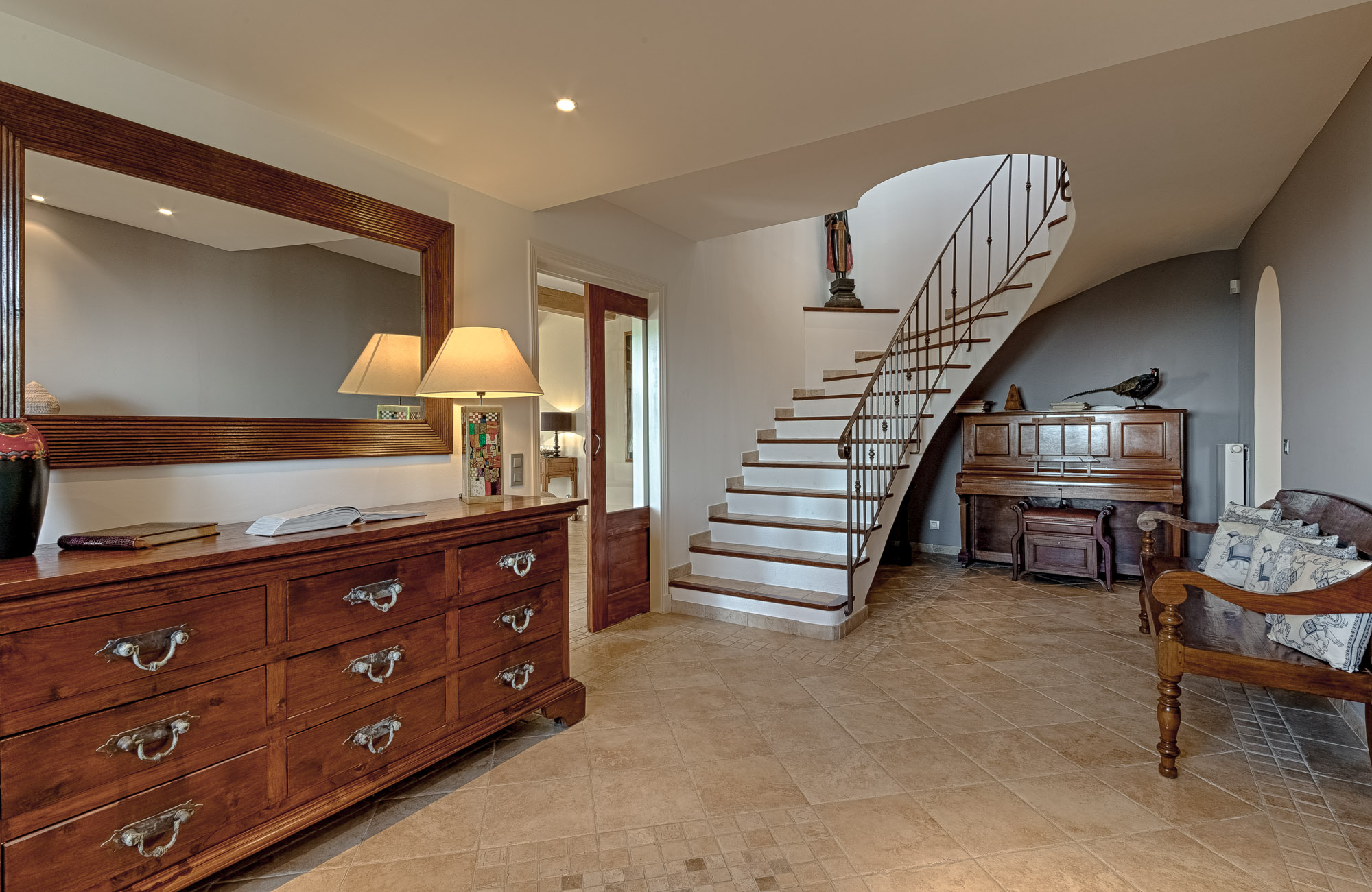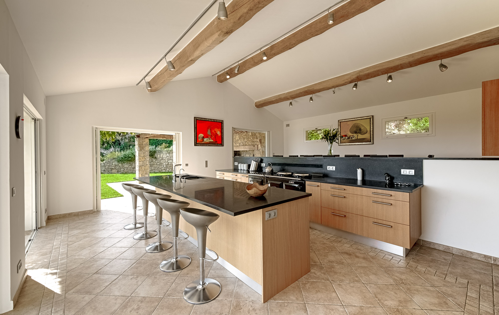 The extensive grounds include terraces, lawns, and Mediterranean plants, offering shaded areas perfect for relaxation. There’s a boules court with night-time lighting, a swimming pool, and a pool house with a Weber BBQ and drinks fridge. A large covered dining area opens out from the kitchen. The garden spans 12,000 sqm and features olive terraces and Mediterranean landscaping.