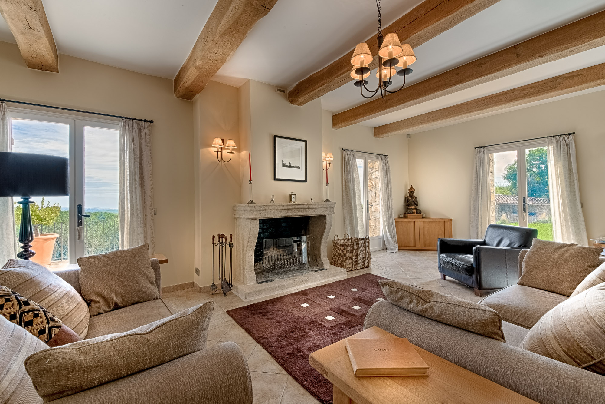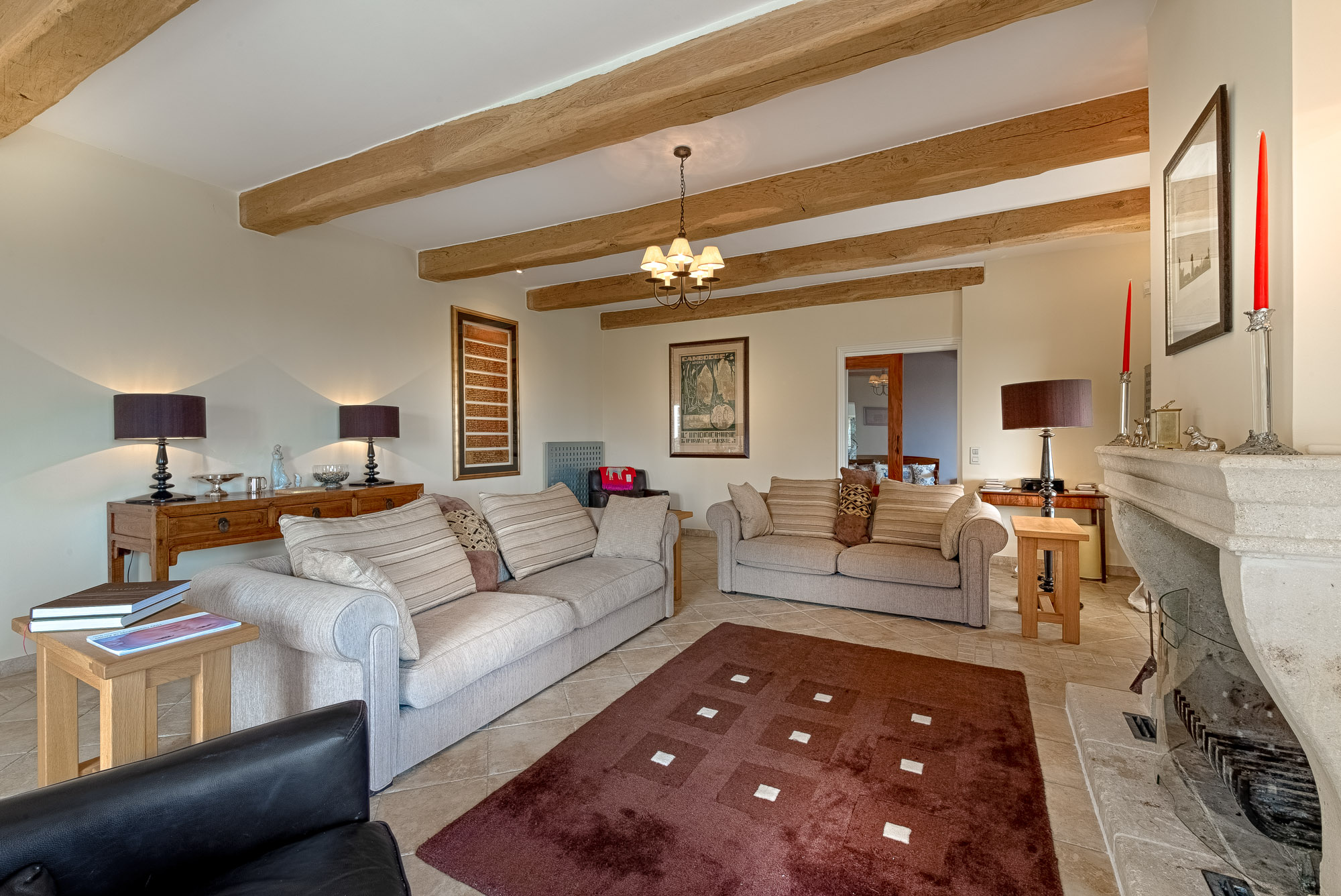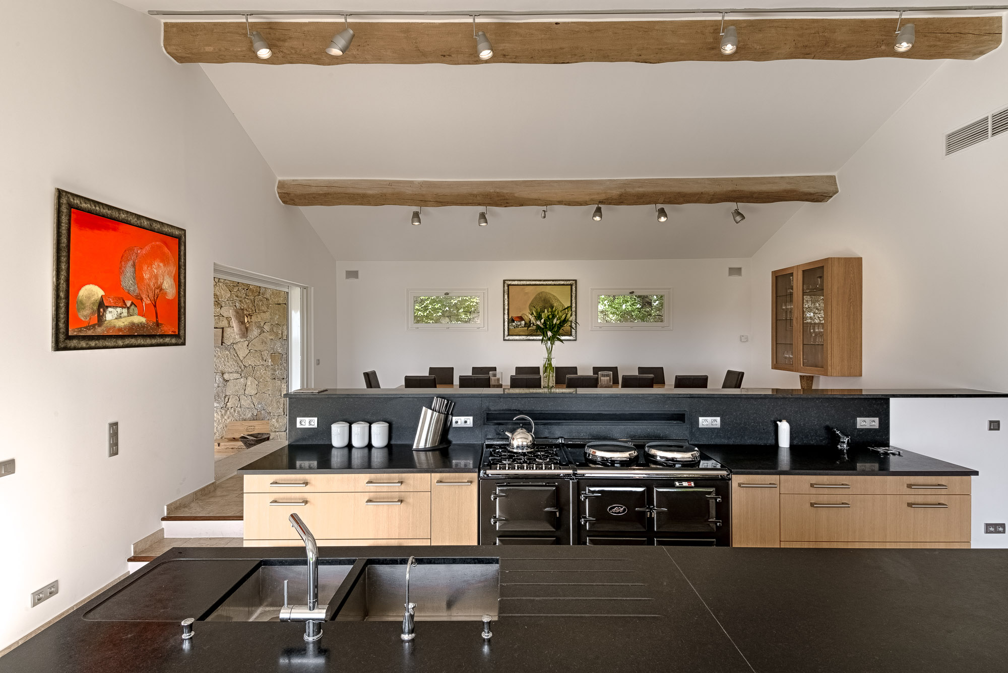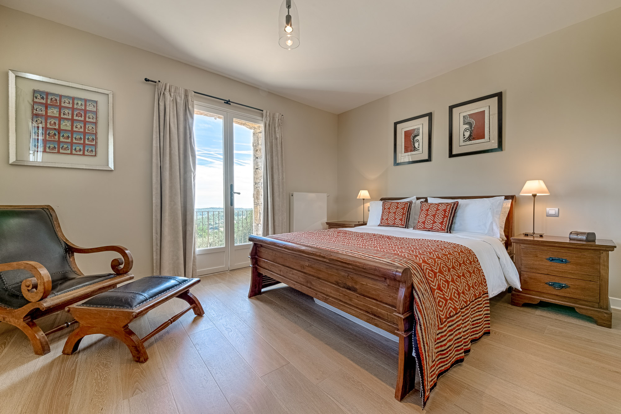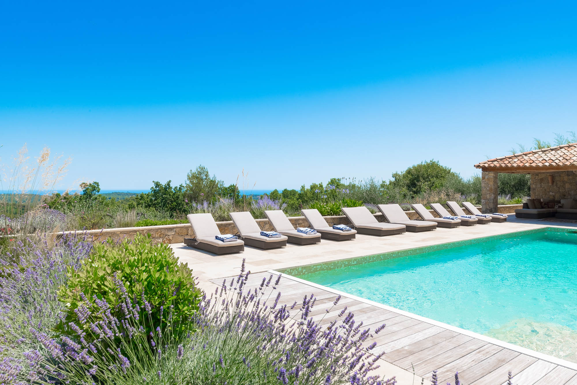 The extensive grounds include terraces, lawns, and Mediterranean plants, offering shaded areas perfect for relaxation. There’s a boules court with night-time lighting, a swimming pool, and a pool house with a Weber BBQ and drinks fridge. A large covered dining area opens out from the kitchen. The garden spans 12,000 sqm and features olive terraces and Mediterranean landscaping.
