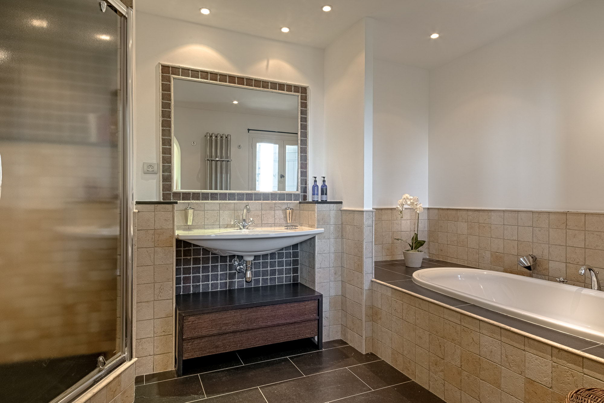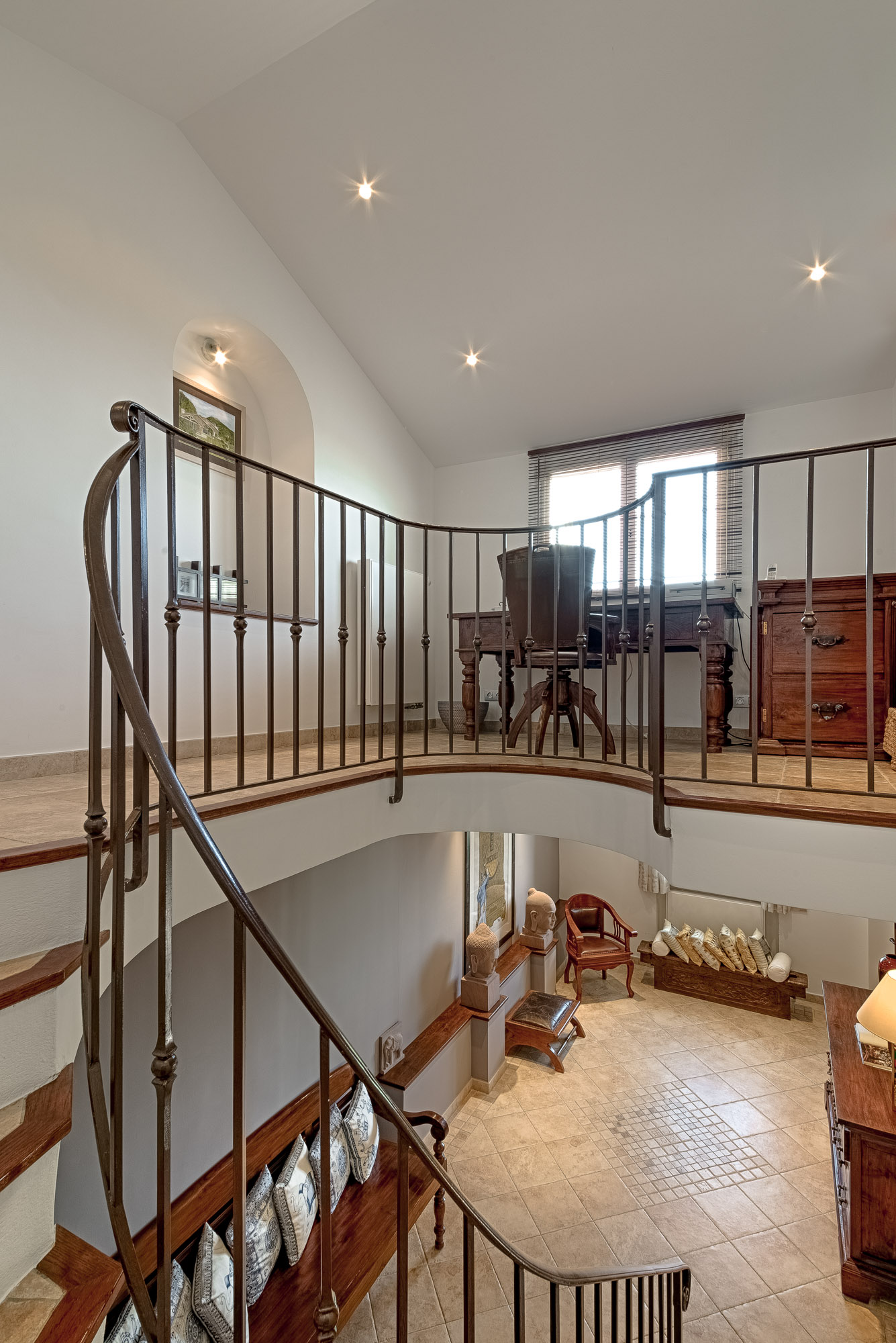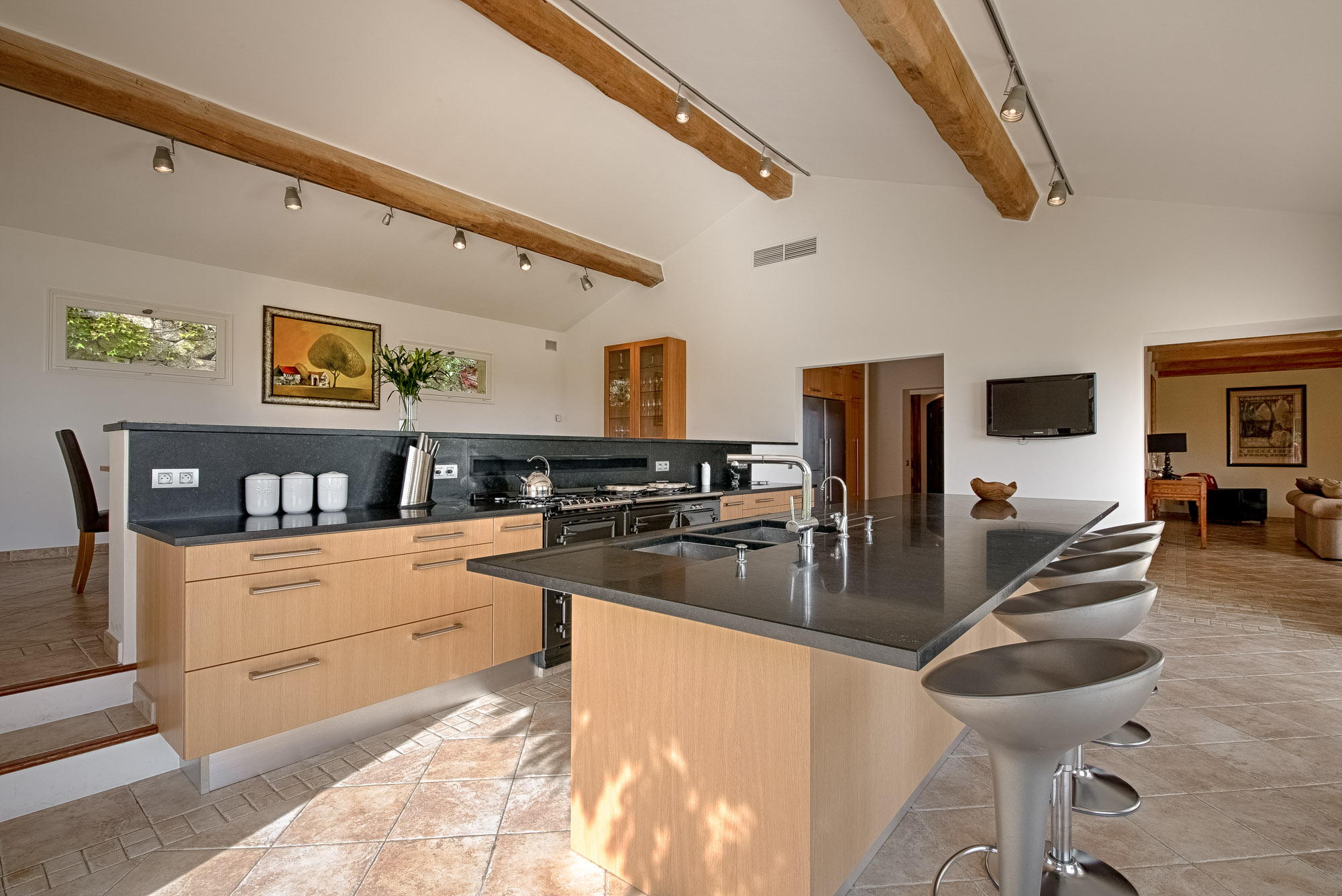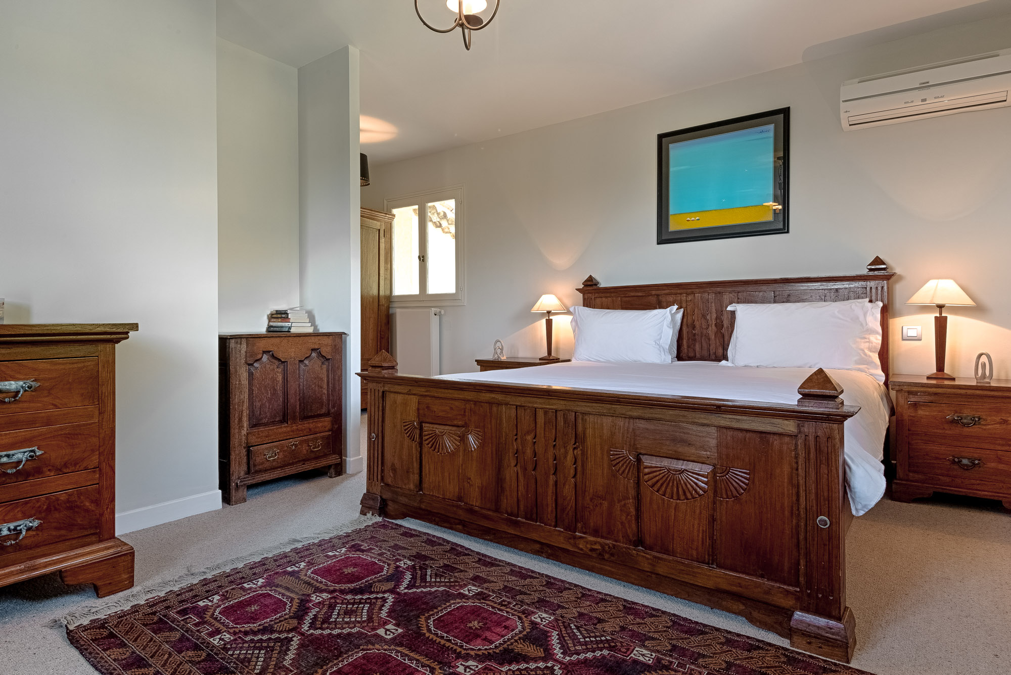 The extensive grounds include terraces, lawns, and Mediterranean plants, offering shaded areas perfect for relaxation. There’s a boules court with night-time lighting, a swimming pool, and a pool house with a Weber BBQ and drinks fridge. A large covered dining area opens out from the kitchen. The garden spans 12,000 sqm and features olive terraces and Mediterranean landscaping.