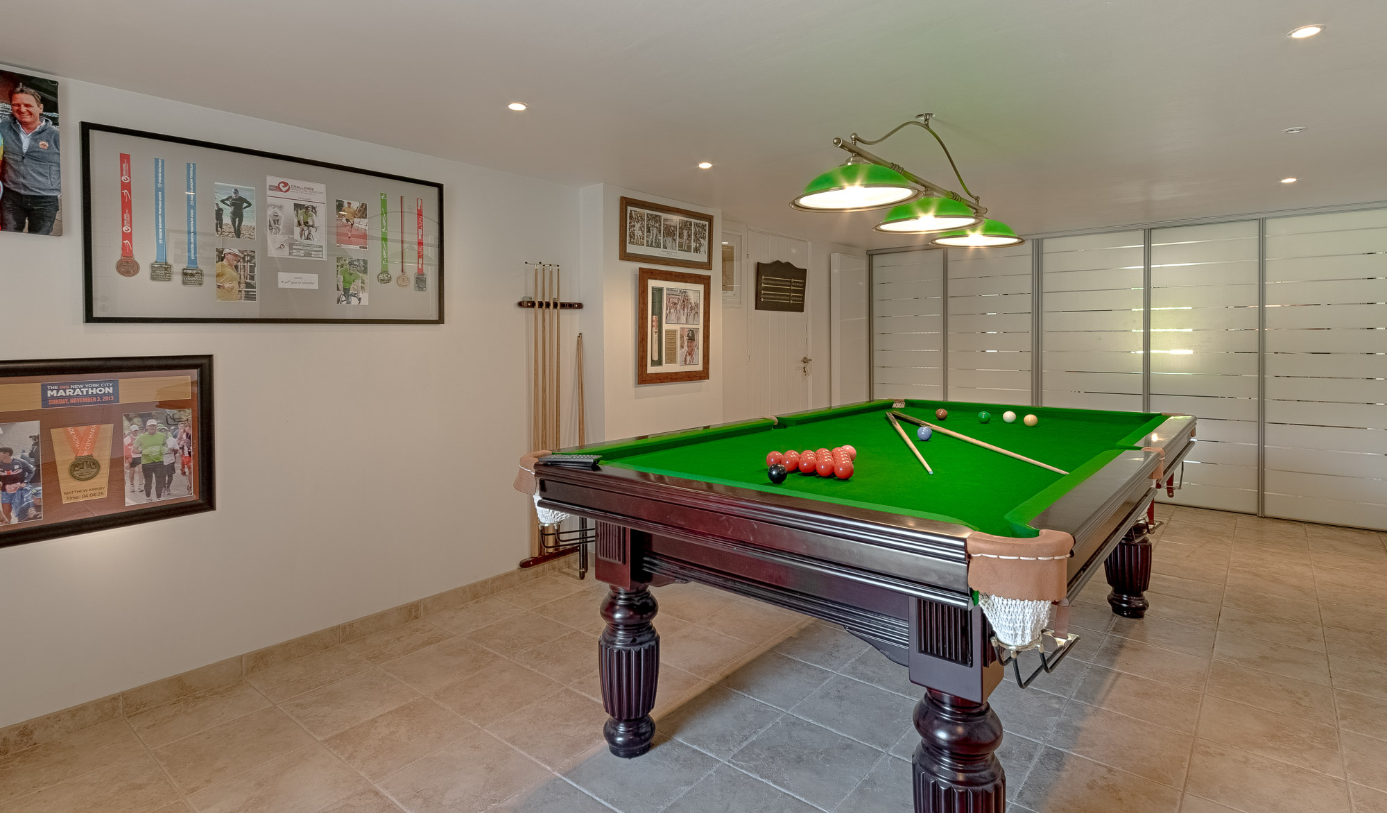 The ground level includes a spacious sitting room and an open-concept kitchen/dining area. Four of the six bedrooms are equipped with en-suite bathrooms and all offer scenic views of the gardens. Some feature private terraces. Guests can enjoy a cinema room with a large projector screen and a dedicated snooker room for entertainment.