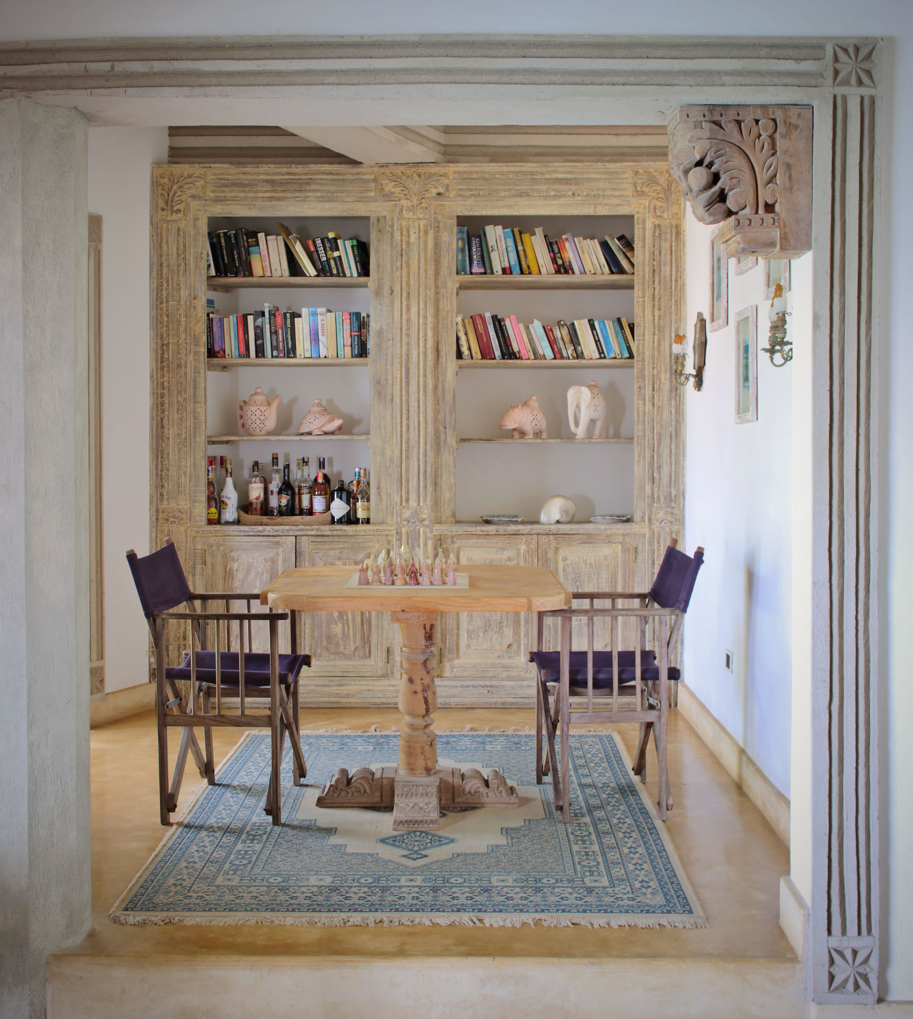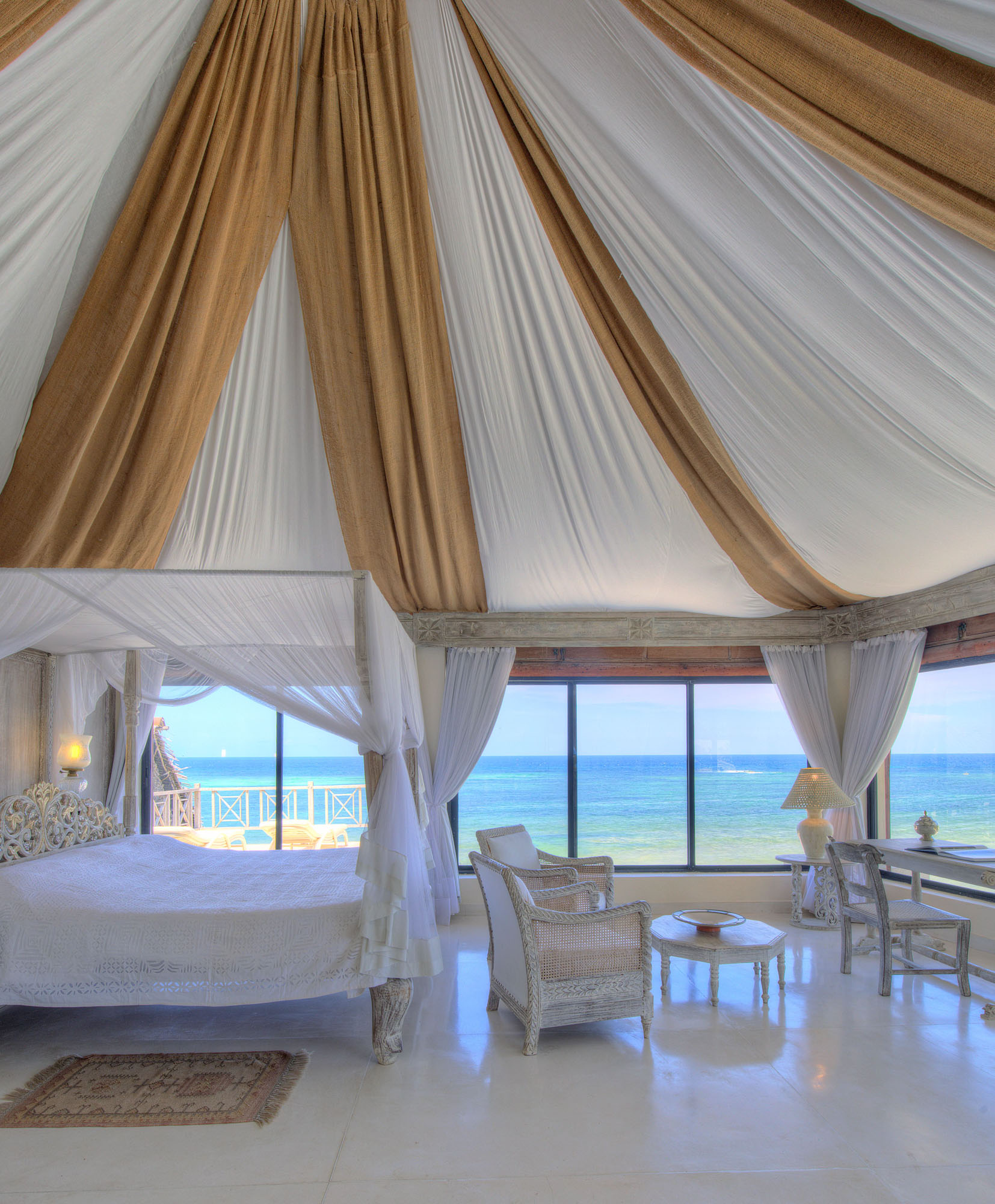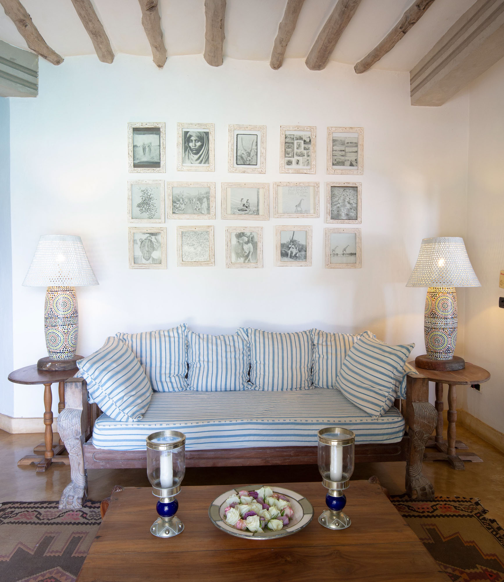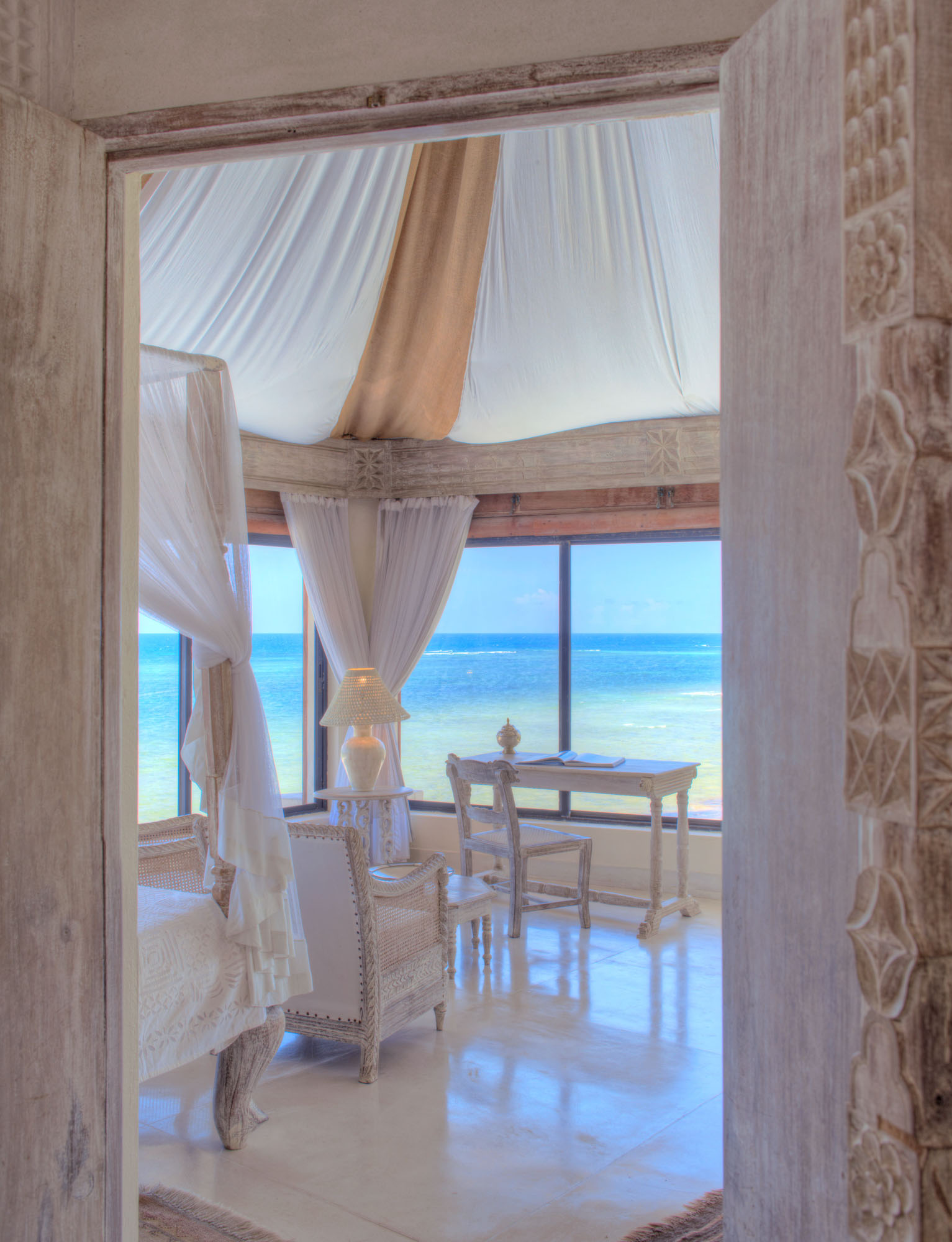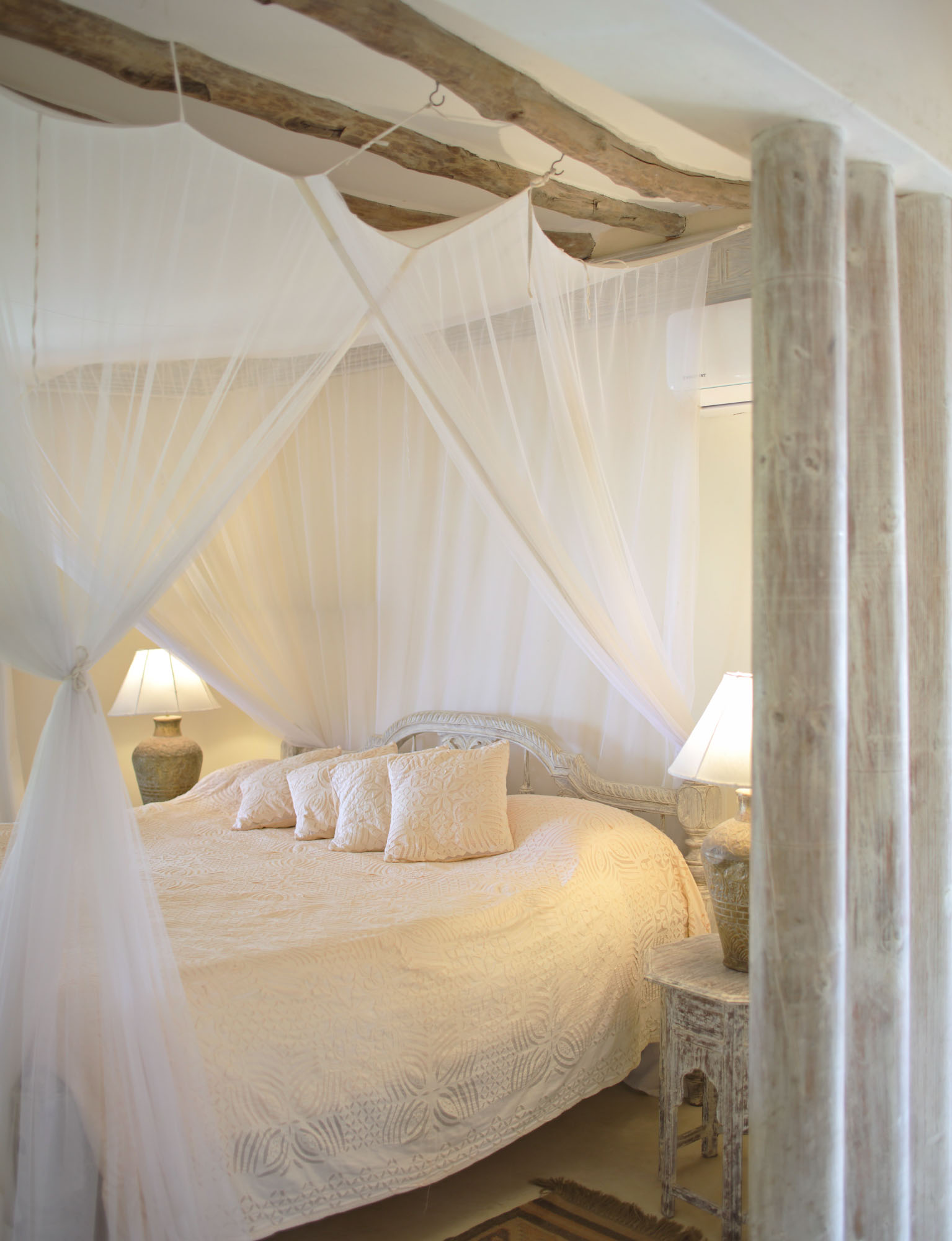 Bright and breezy, the interiors are adorned with flowing fabrics, East African artefacts, and traditional carved Lamu doors, creating a warm and inviting atmosphere. The villa’s spacious rooms feature wooden beams and hand-carved furniture, complementing the natural surroundings. The large veranda, with its hand-carved sofas and cushions, invites you to relax while enjoying the panoramic views. The villa offers four luxurious bedrooms, each designed for comfort and style, with large en suite bathrooms, air conditioning, and mosquito nets.