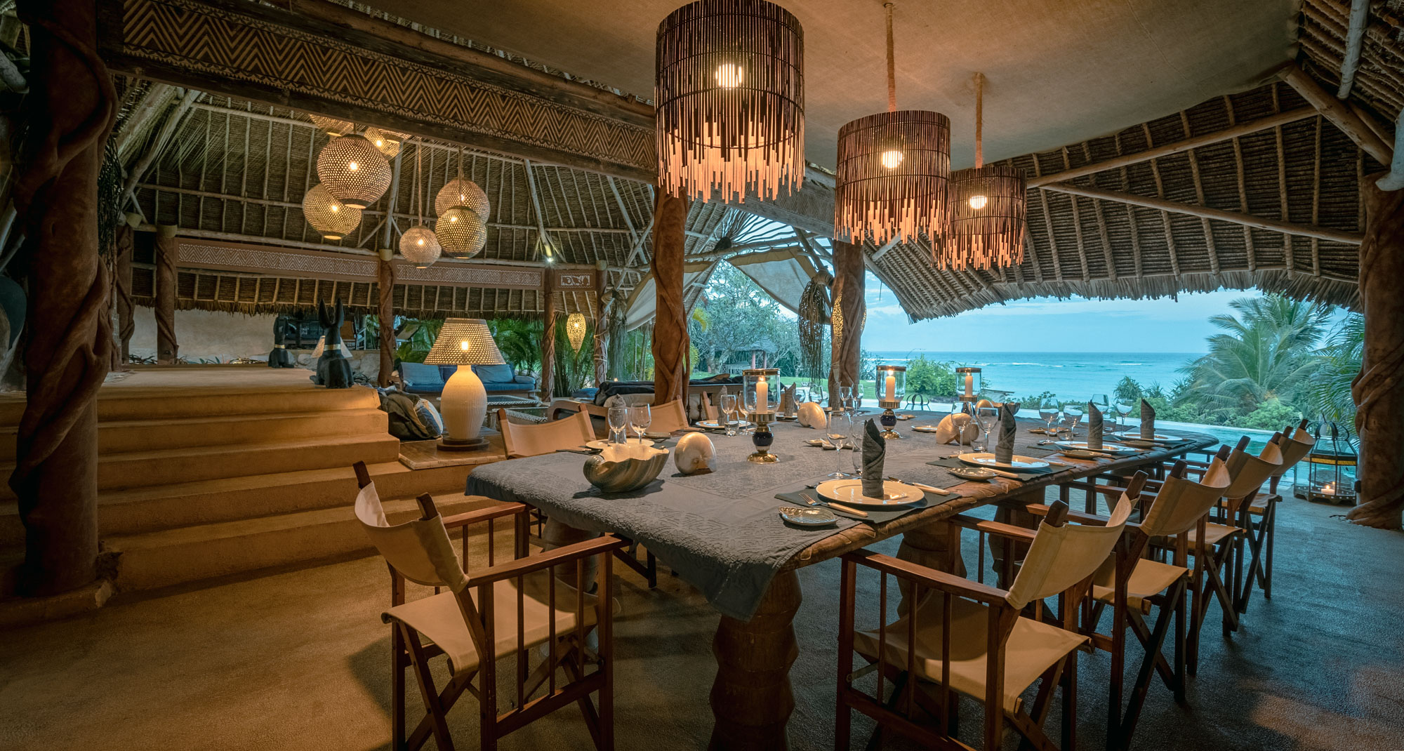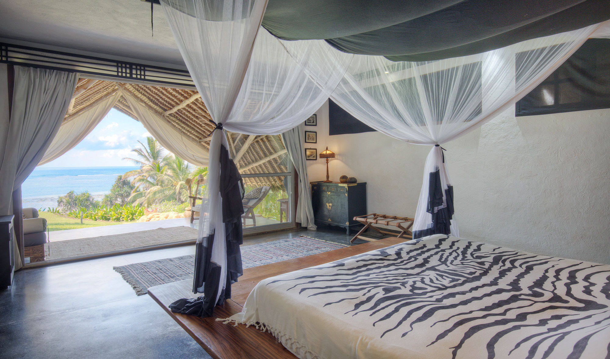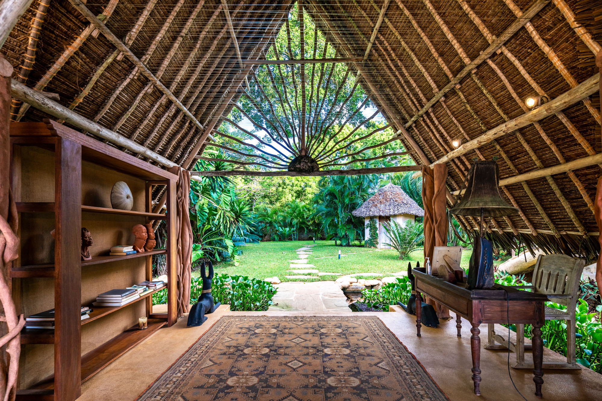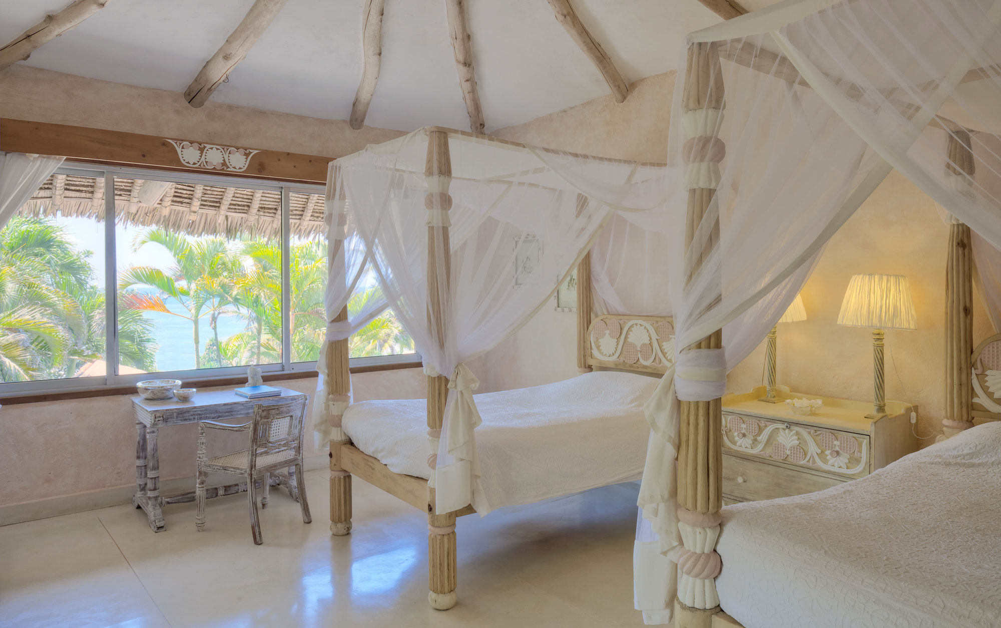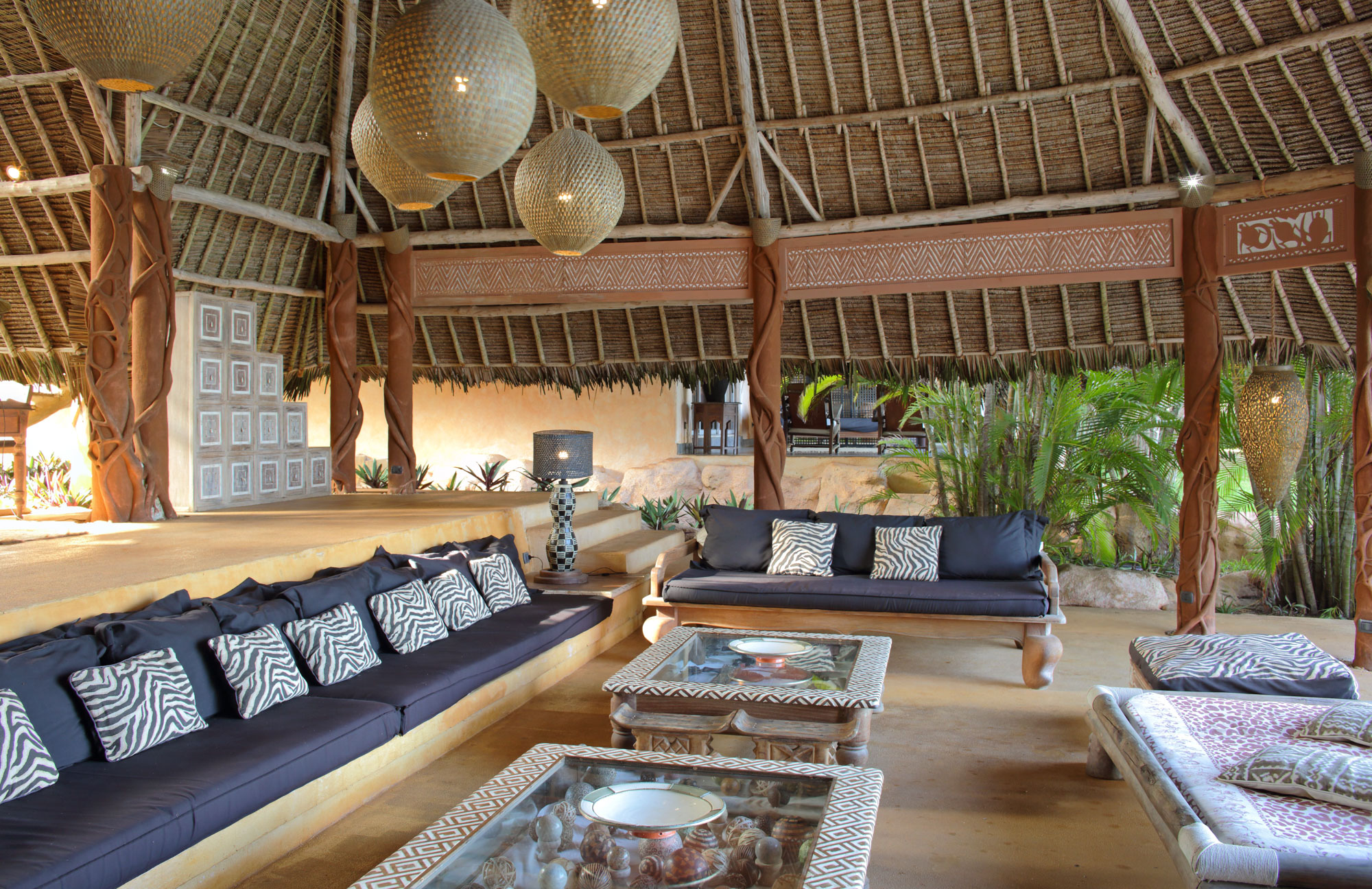 The expansive main veranda, beneath a grand Makuti roof, serves as the heart of the villa. Inside, the villa boasts okra flooring, wooden beams, and carefully selected artifacts that enhance its exceptional design. The living areas are open and inviting, with ample seating for socializing and enjoying the ocean views. The four spacious bedrooms, each with its own distinct interior style, offer both privacy and charm. All rooms are air-conditioned and equipped with mosquito nets, ensuring a comfortable stay.