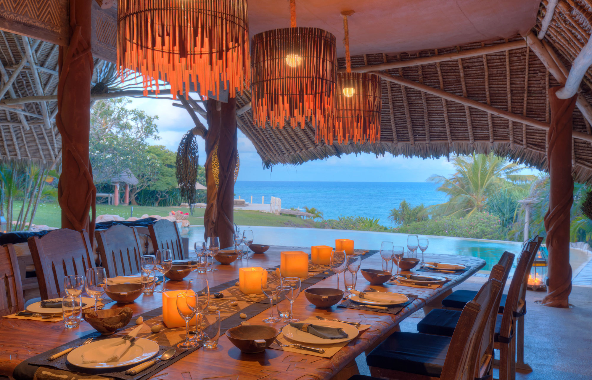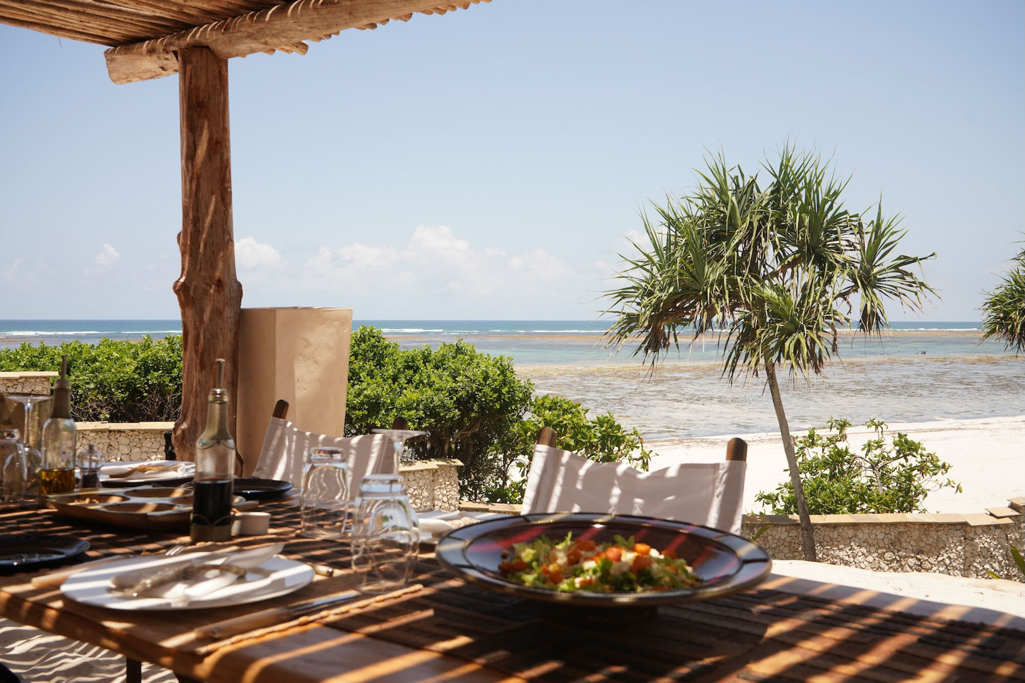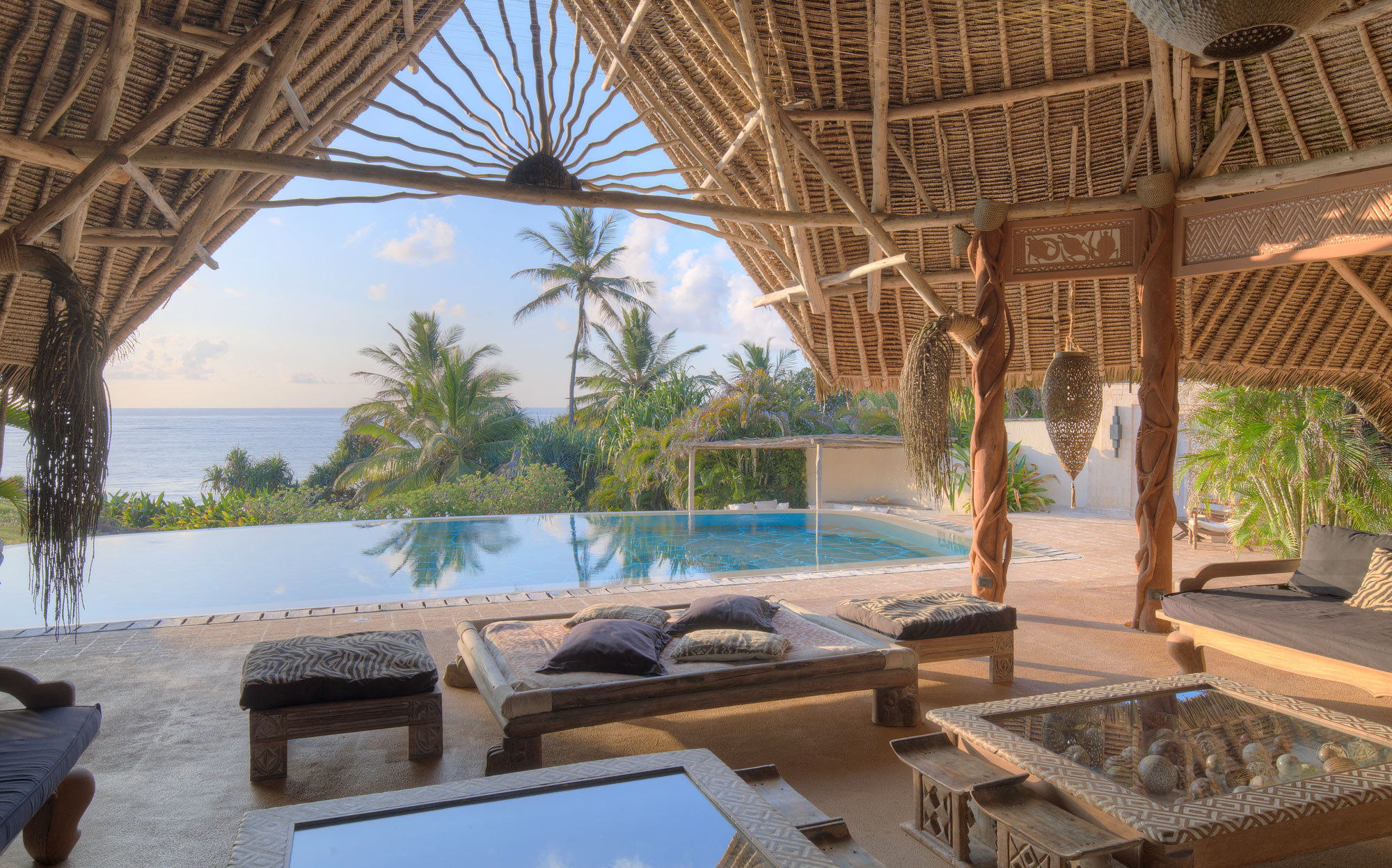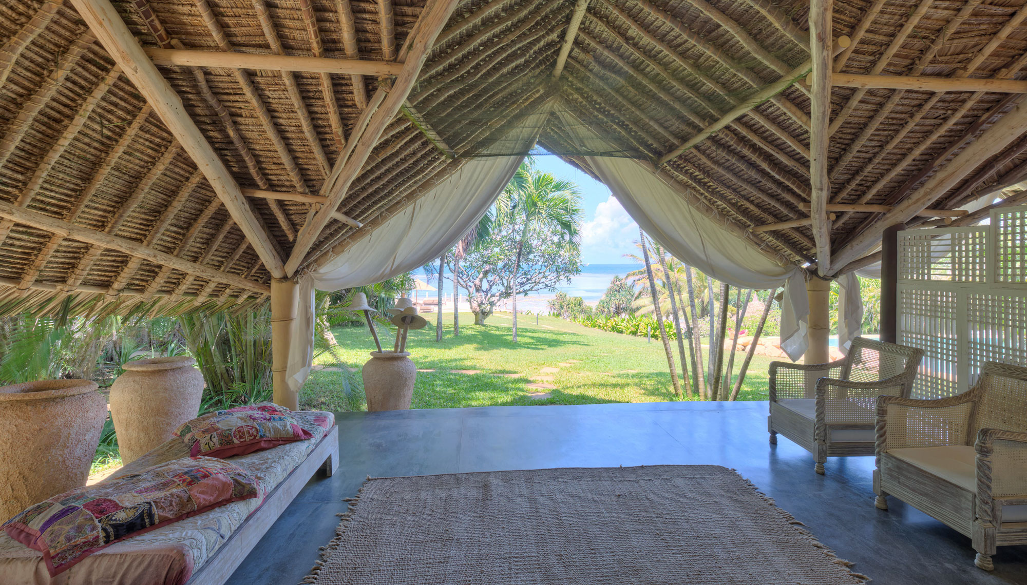 The expansive main veranda, beneath a grand Makuti roof, serves as the heart of the villa. Inside, the villa boasts okra flooring, wooden beams, and carefully selected artifacts that enhance its exceptional design. The living areas are open and inviting, with ample seating for socializing and enjoying the ocean views. The four spacious bedrooms, each with its own distinct interior style, offer both privacy and charm. All rooms are air-conditioned and equipped with mosquito nets, ensuring a comfortable stay.