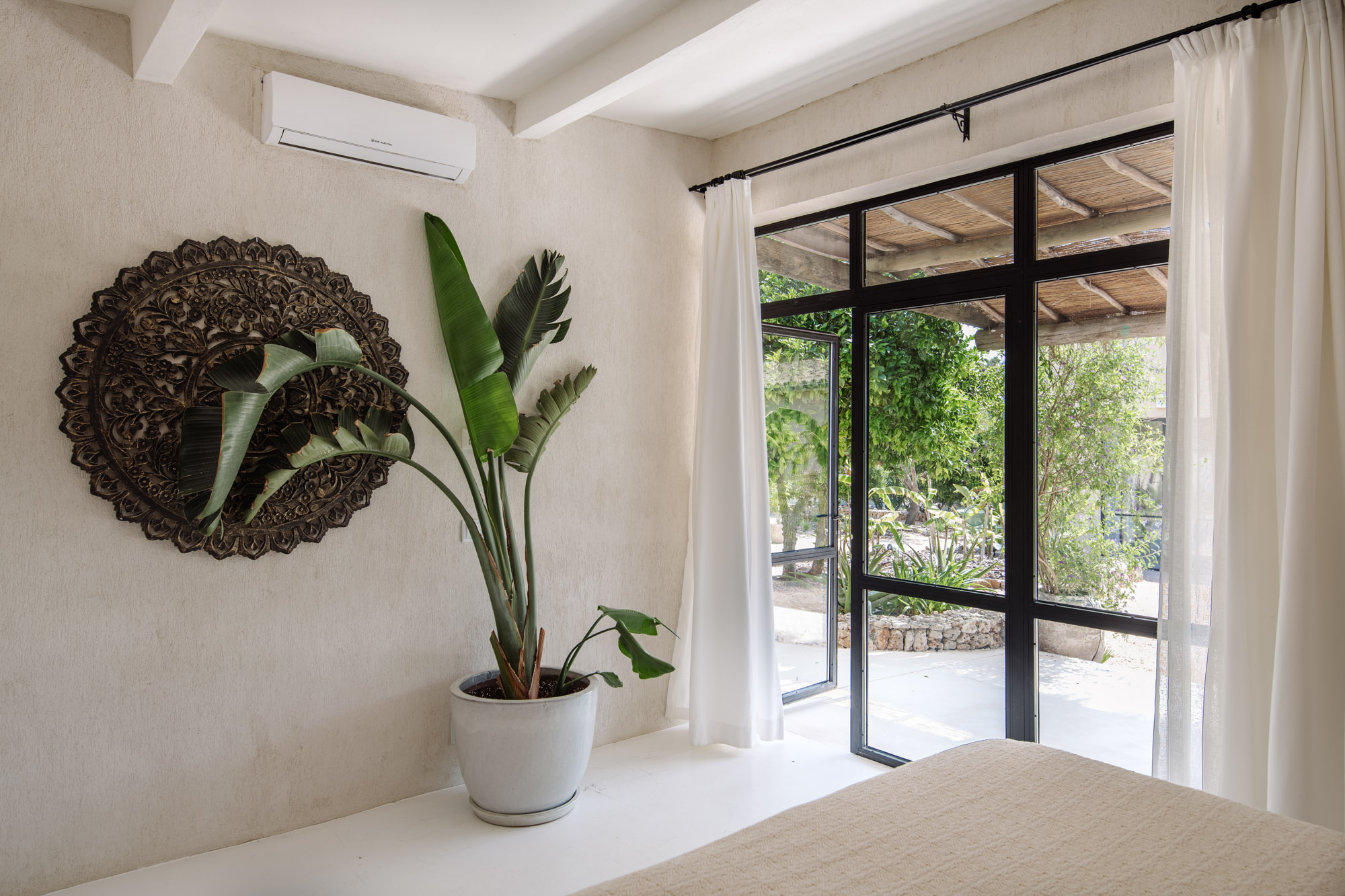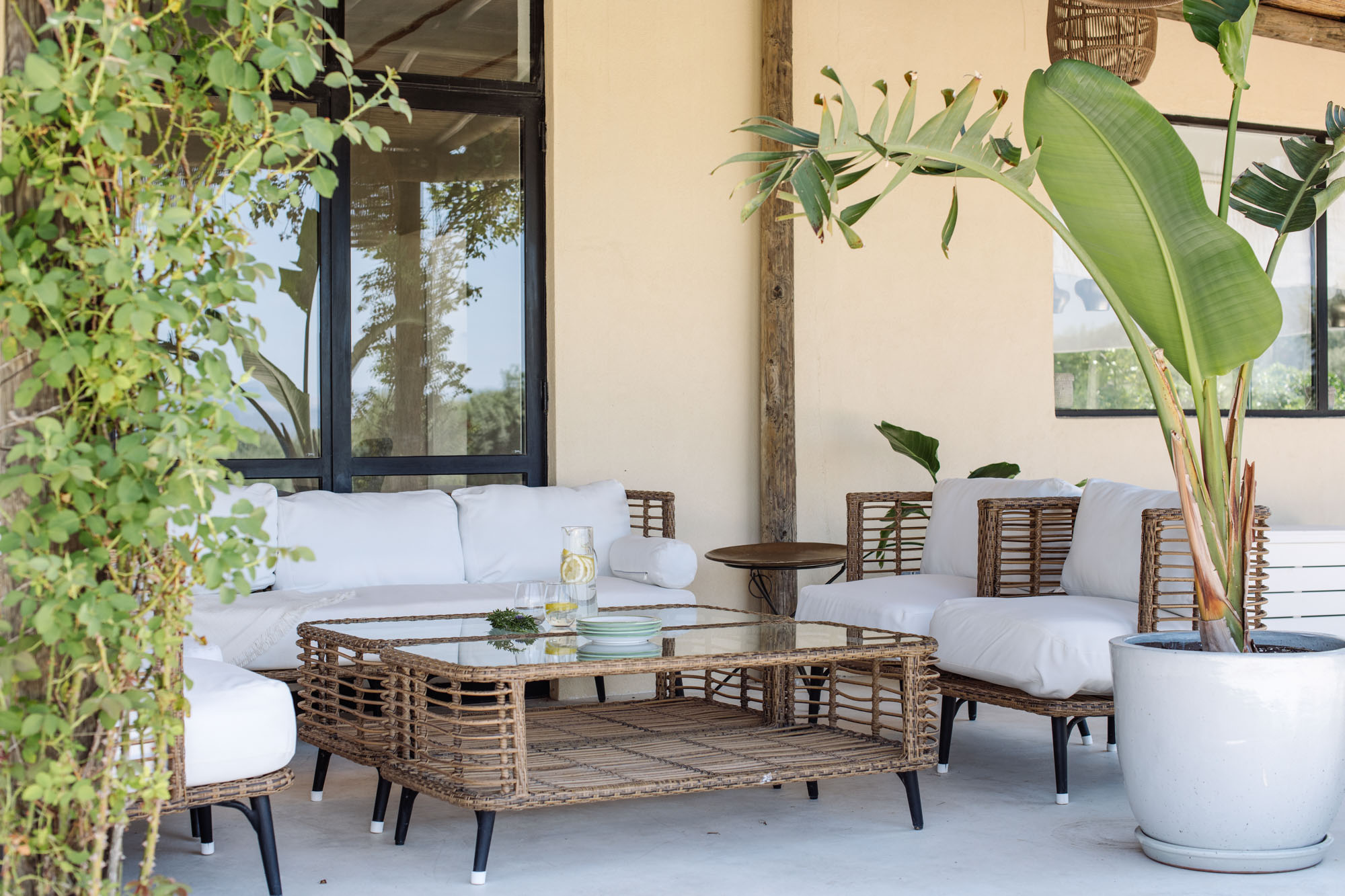 An eclectic mix of decorative elements adds interest and colour. The main living spaces flow seamlessly into one another, giving access to the large surrounding terrace. All five en suite bedrooms have views of the gardens and surrounding nature, and each has a door leading to seating on the terrace.