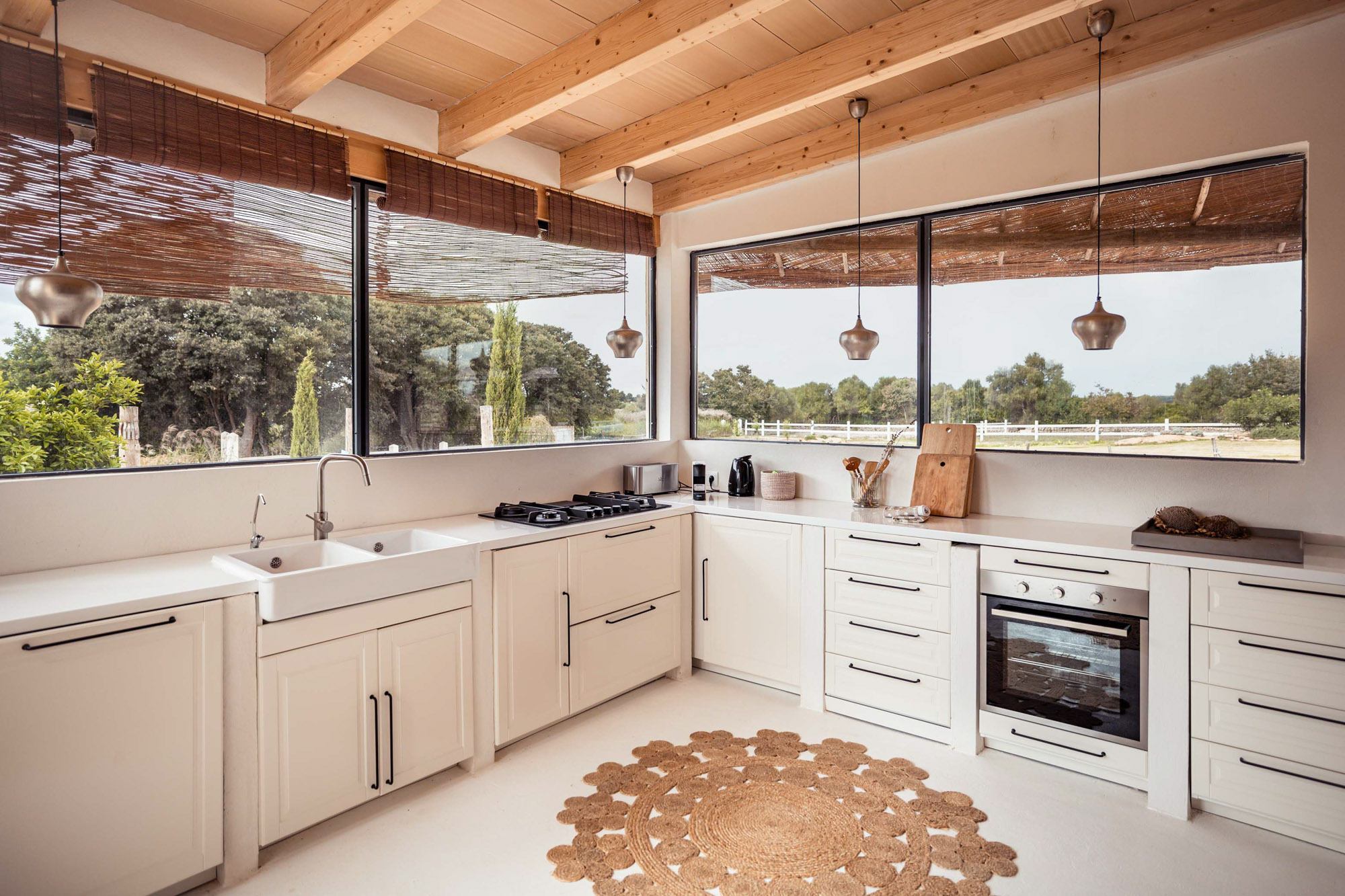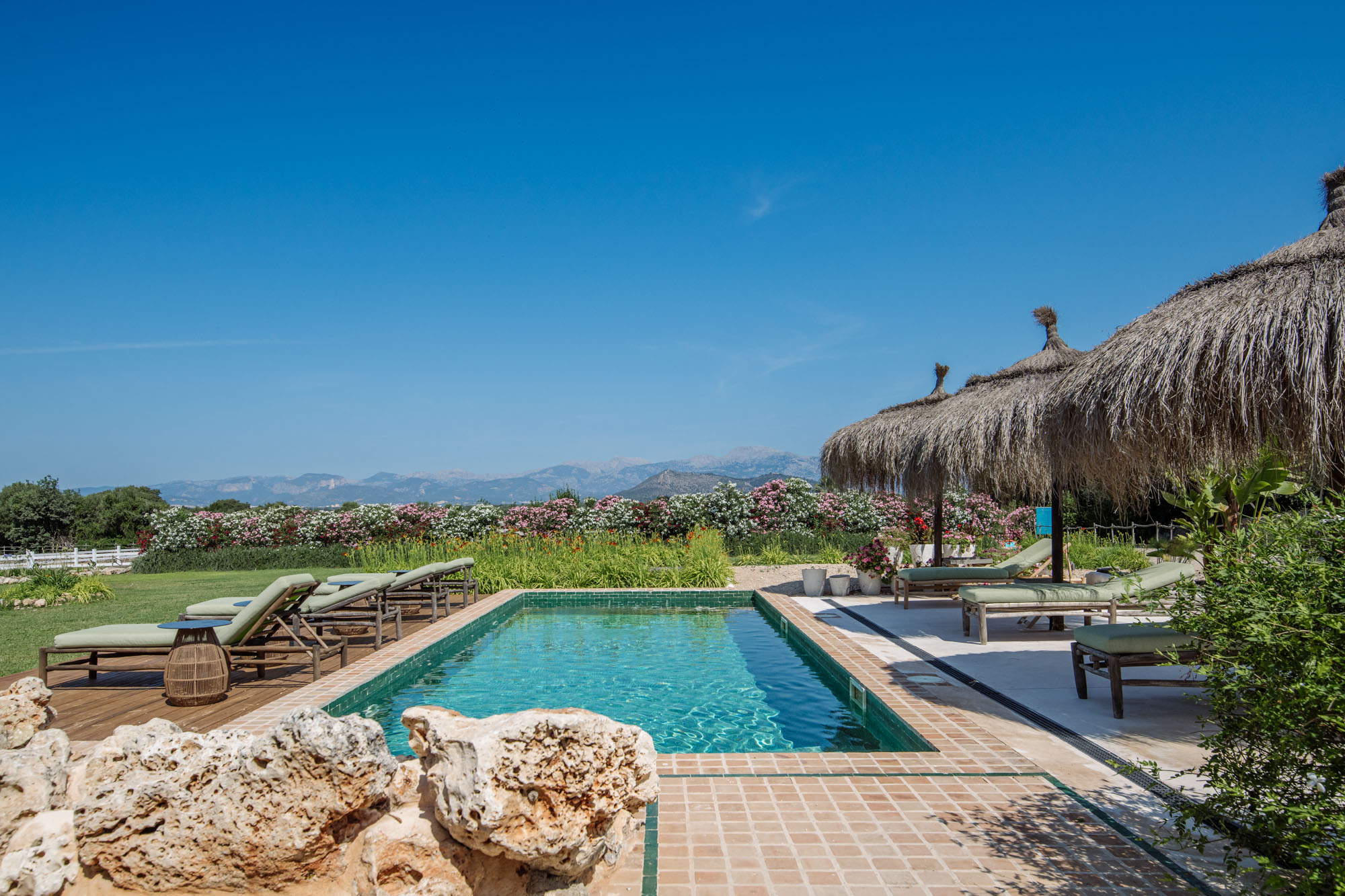 Within the Mediterranean gardens, there’s an inviting tiled pool with handmade wooden loungers and large parasols on the surrounding terrace. There’s also a pétanque court. Fresh vegetables are grown in the organic garden, fruit in the orchard, and olive oil and honey are produced from the Finca’s 100 olive trees and 15 beehives. Riding, yoga instruction, and bike hire can be arranged.