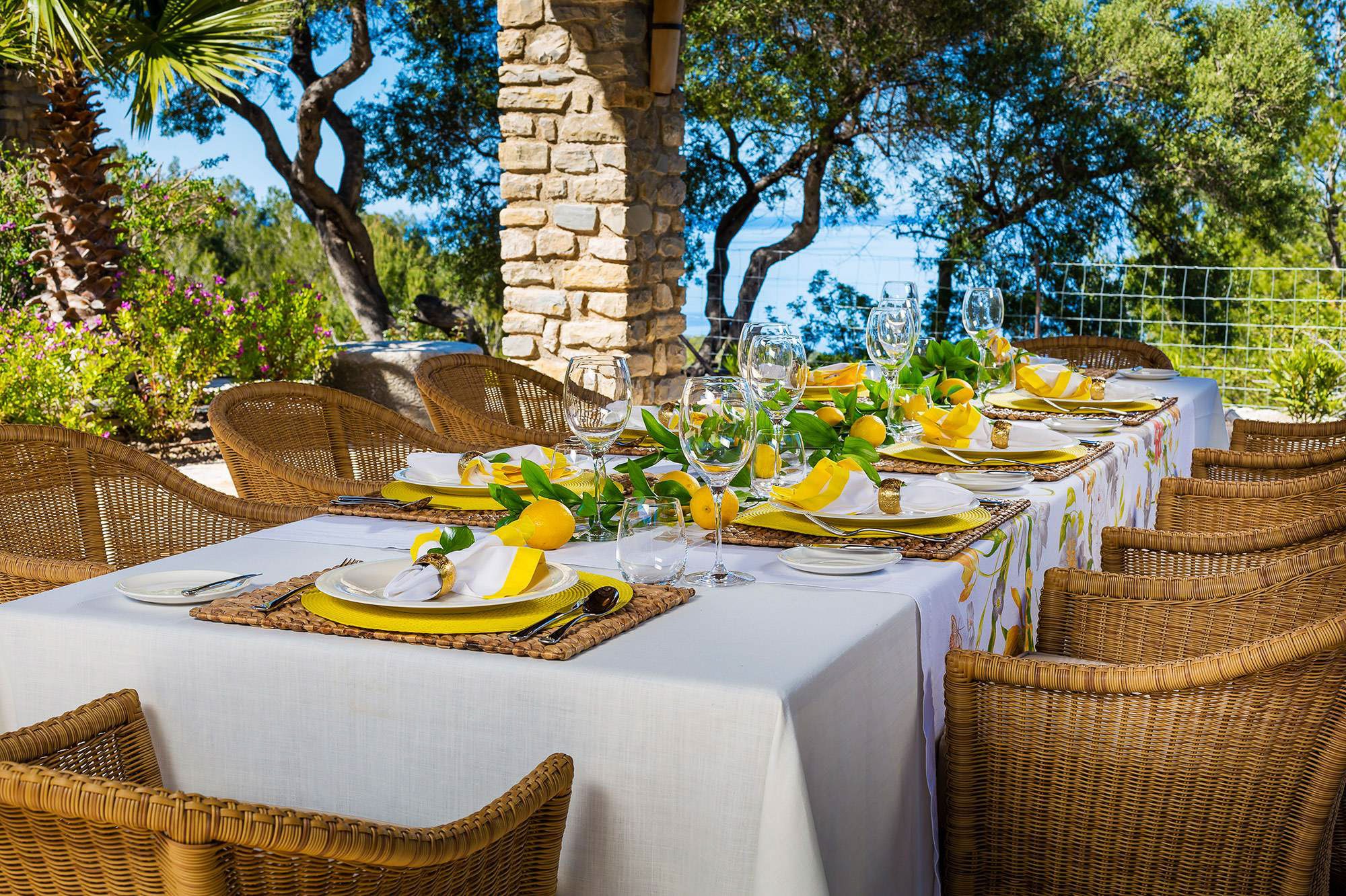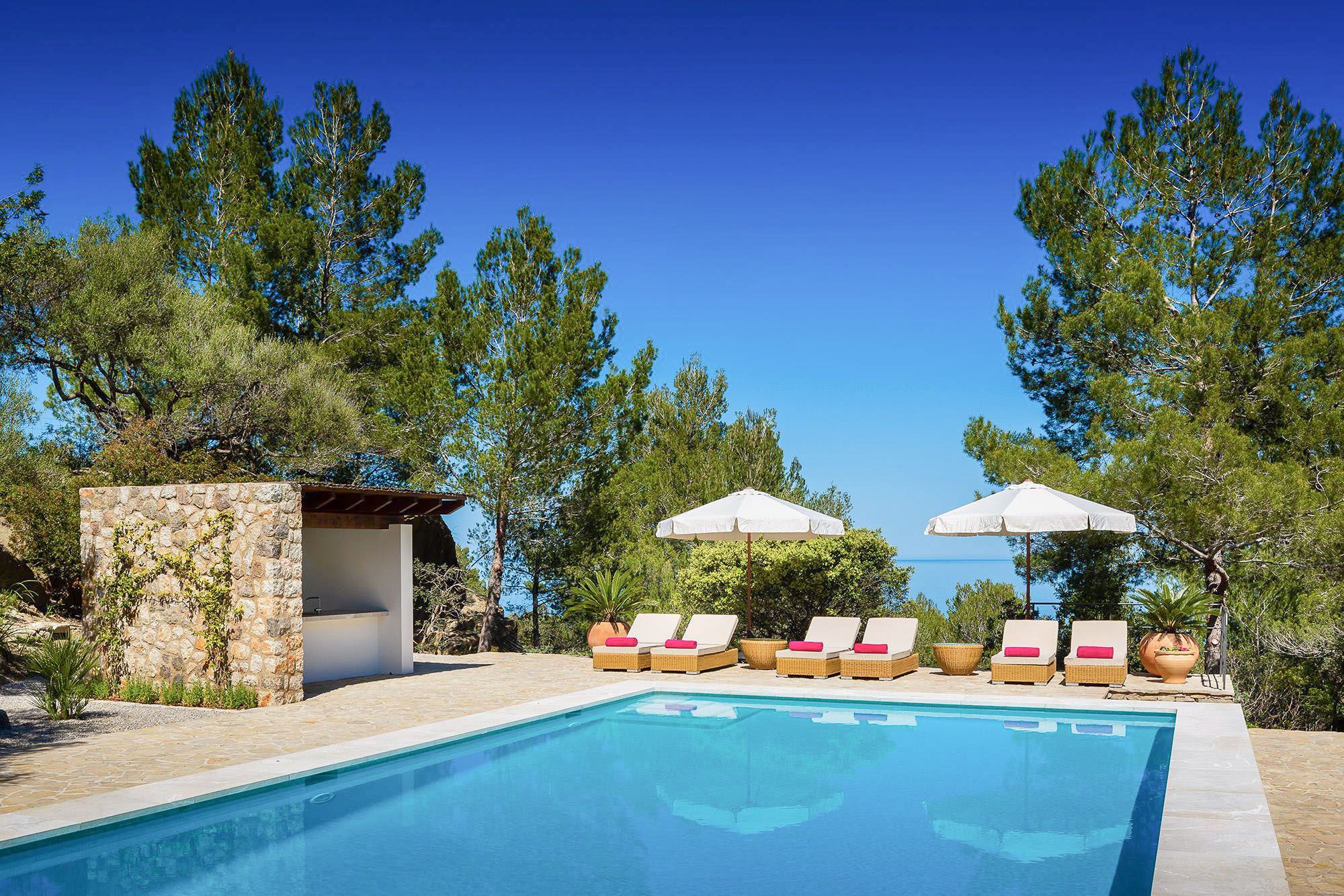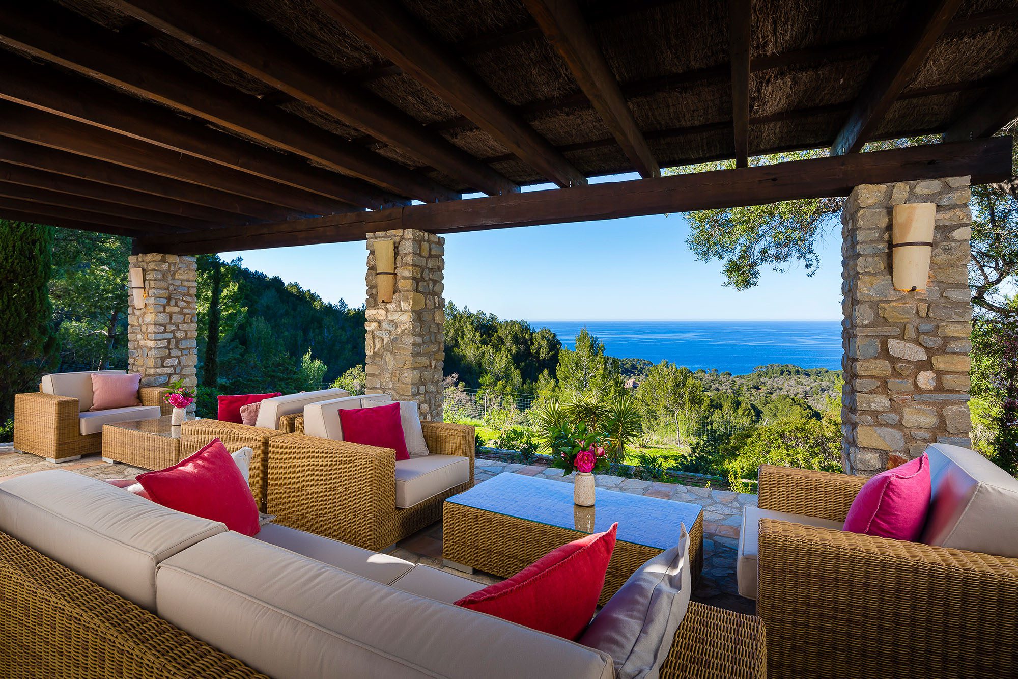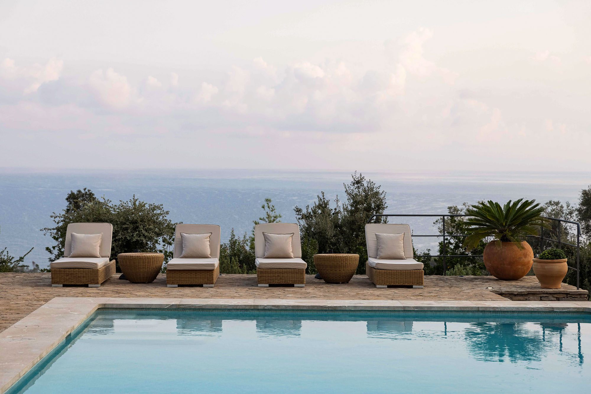 A covered area provides shade over large sofas and armchairs, offering views across the gardens to the sea. Steps lead down to the 12-meter pool, which features comfortable sun loungers on the surrounding stone terrace, secluded by trees and shrubs. Flowers, evergreens, and palms in terracotta pots grace the courtyard and terraces. Guests have access to a shared tennis court a few minutes drive away, along with two other villas.
