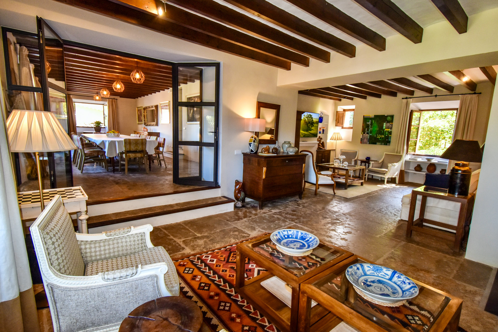 Sleeping up to 26 guests across 13 bedrooms, each decorated with its own character and flair. Four poster beds are complemented by colourful painted shutters, vibrant artwork and mountain views that are magical to wake up to. Each room is also complete with excellent Wi-Fi and air-conditioning. A two-floor living and dining area provides a plethora of tempting seats, perfect for sinking into and wiling away an evening over a game of chess.