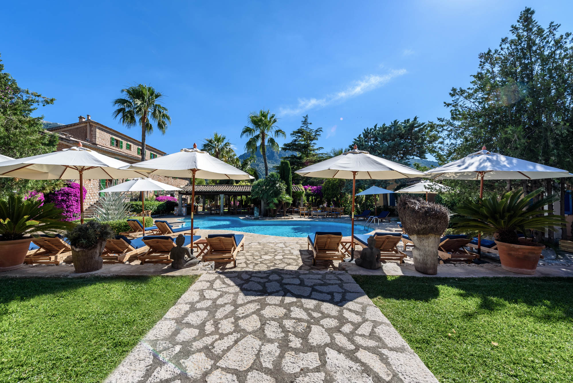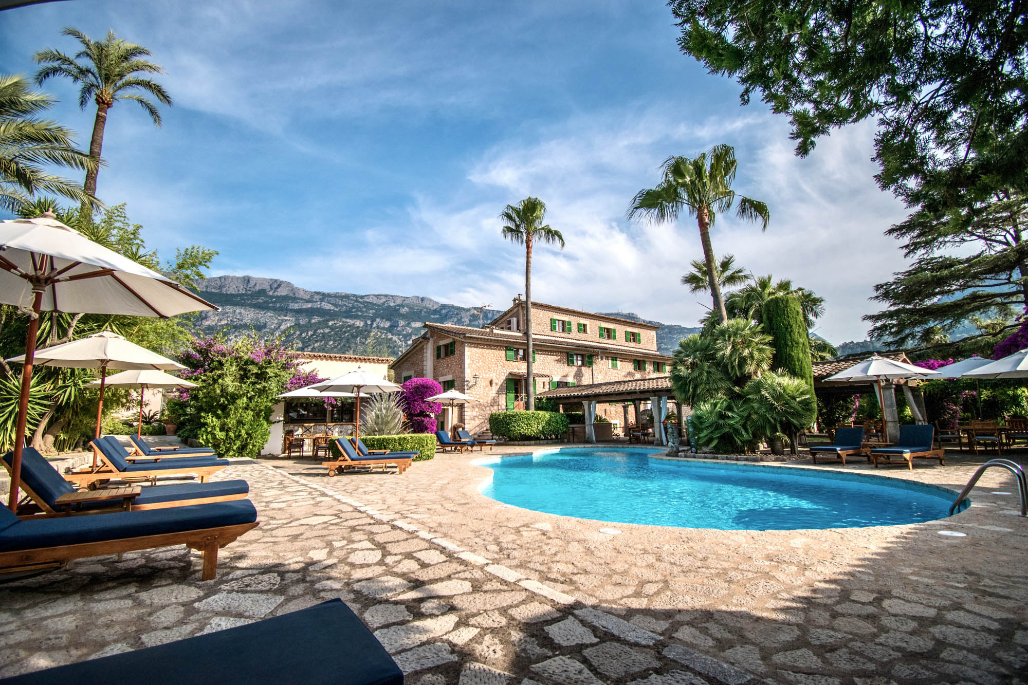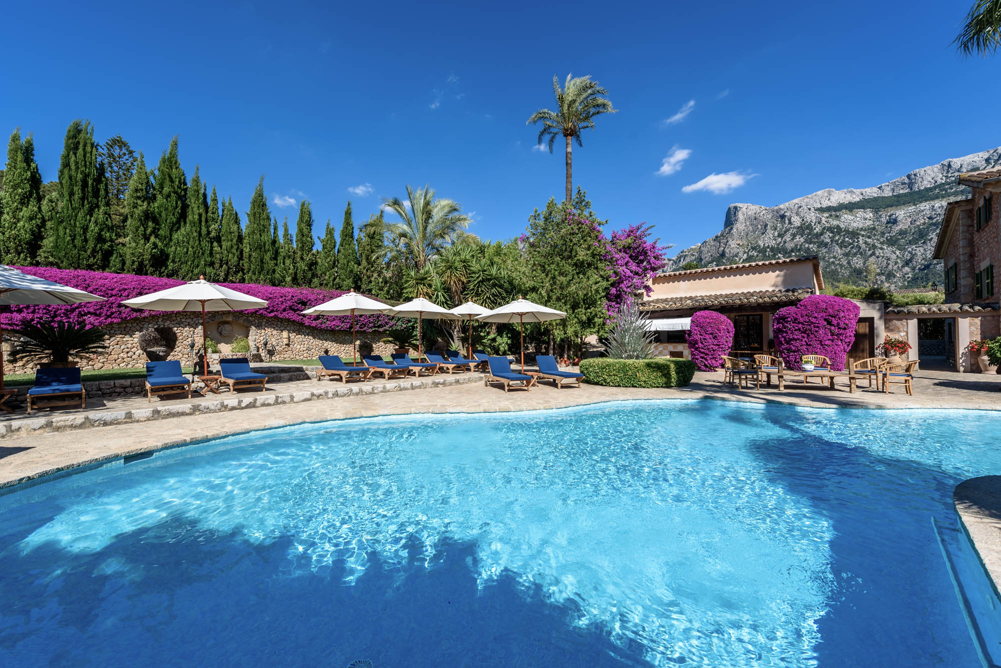 At Villa Son Grec, guests can truly have it all. This sweeping space has spacious suites, a private gym, and shady, lush green gardens that encircle a large pool surrounded by clusters of inviting sun loungers. It is peaceful and self-contained yet just a leisurely ten-minute stroll from Sóller’s bustling town square.