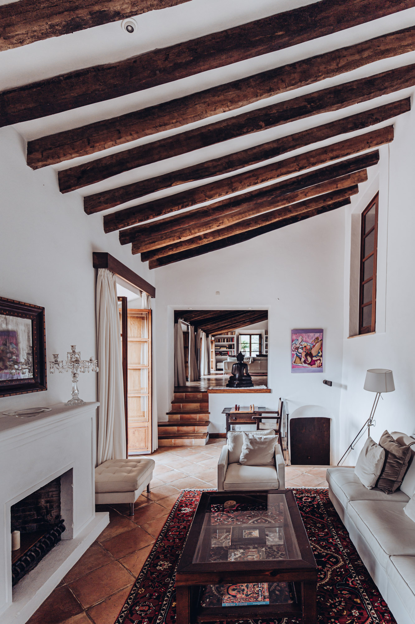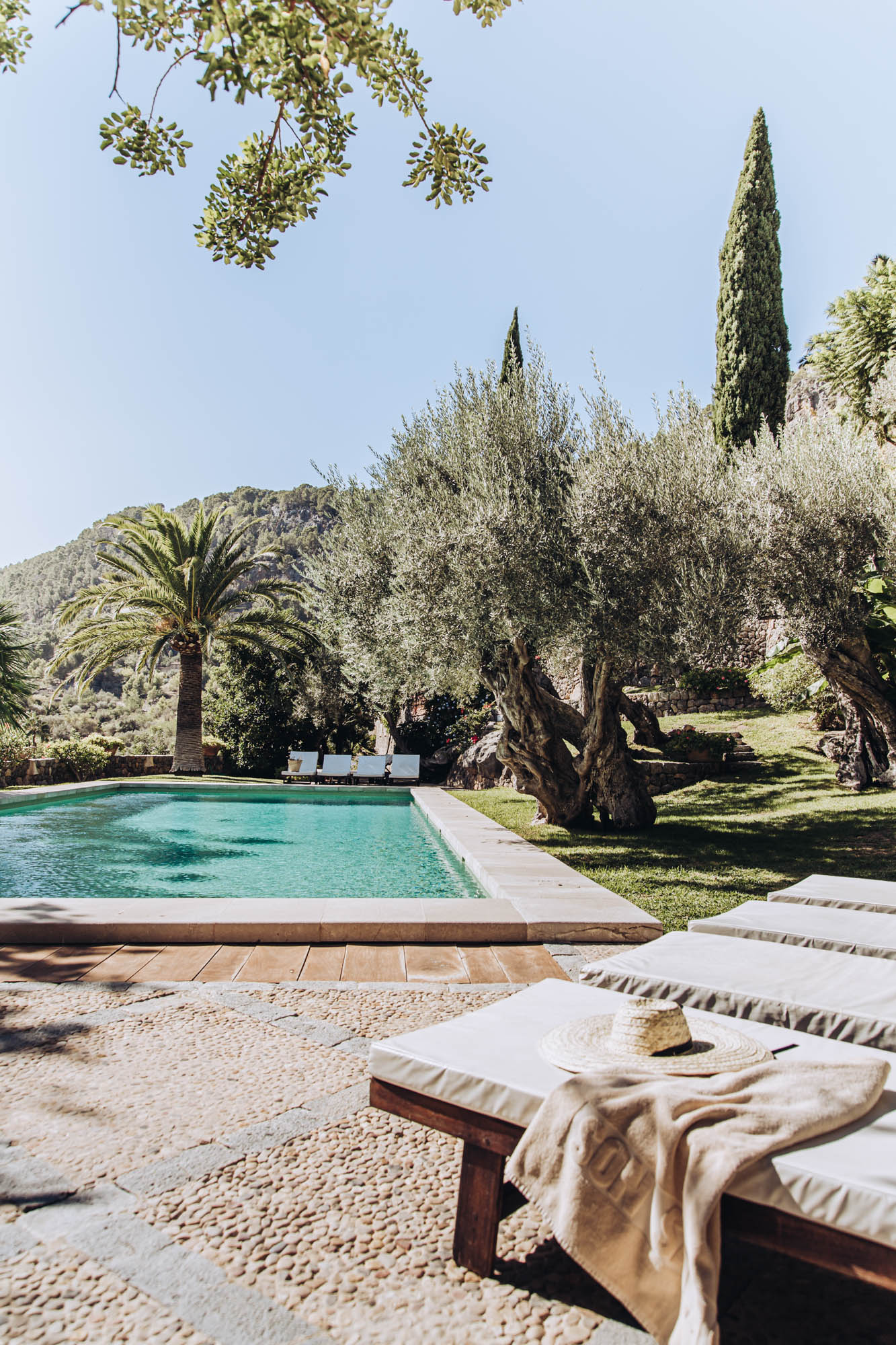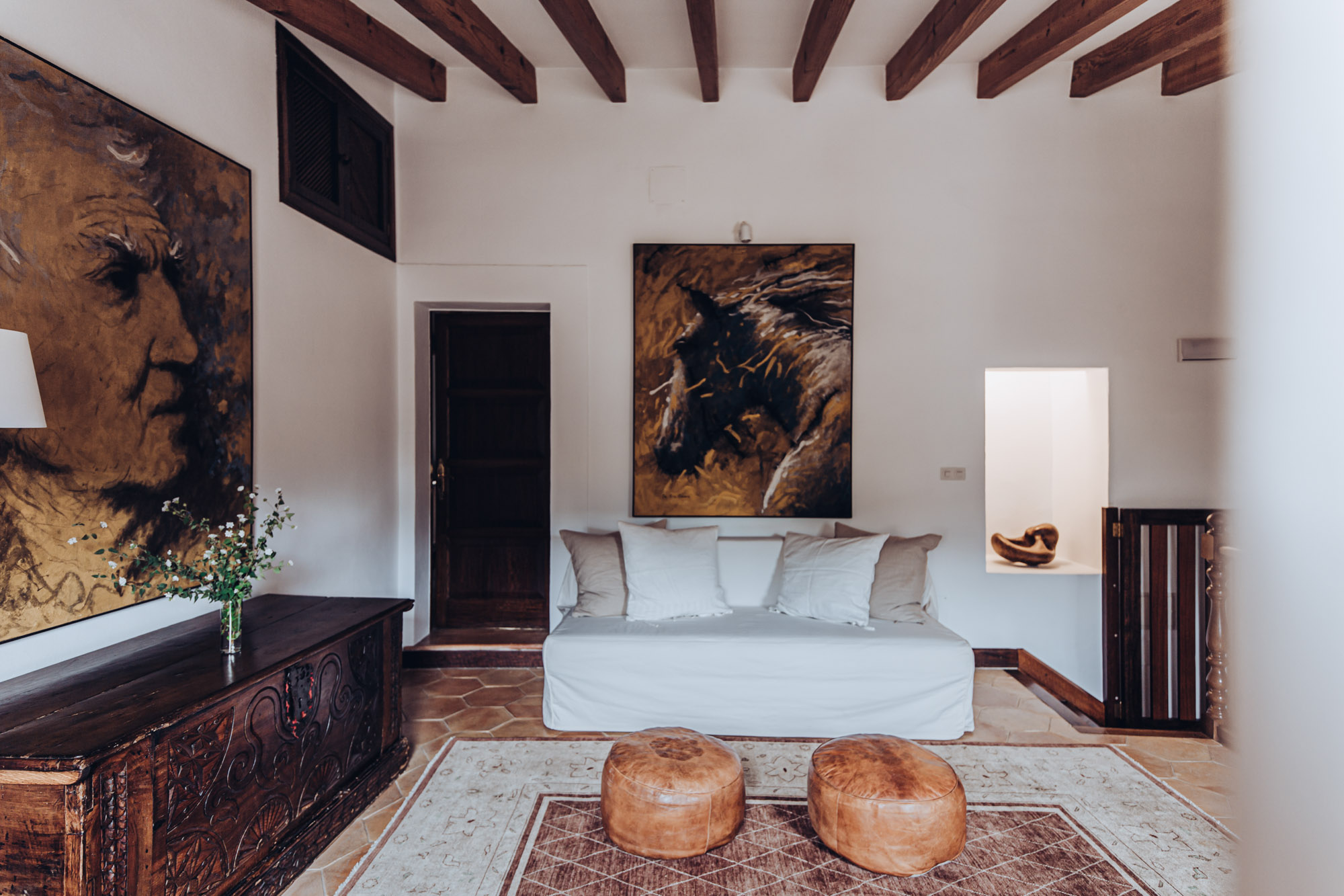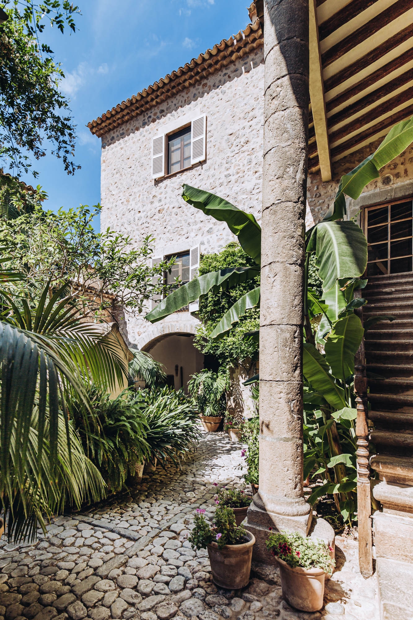 As the amber sun sets across the valley, you could watch the colours of the mountains turn pink from this privileged spot — nestled high in the hills, and far away from the crowds. Originally used to produce olive oil, Son Salas is now centred around a verdant courtyard, the heart of the home. The dining room still features large stone pieces from the original pressing system.