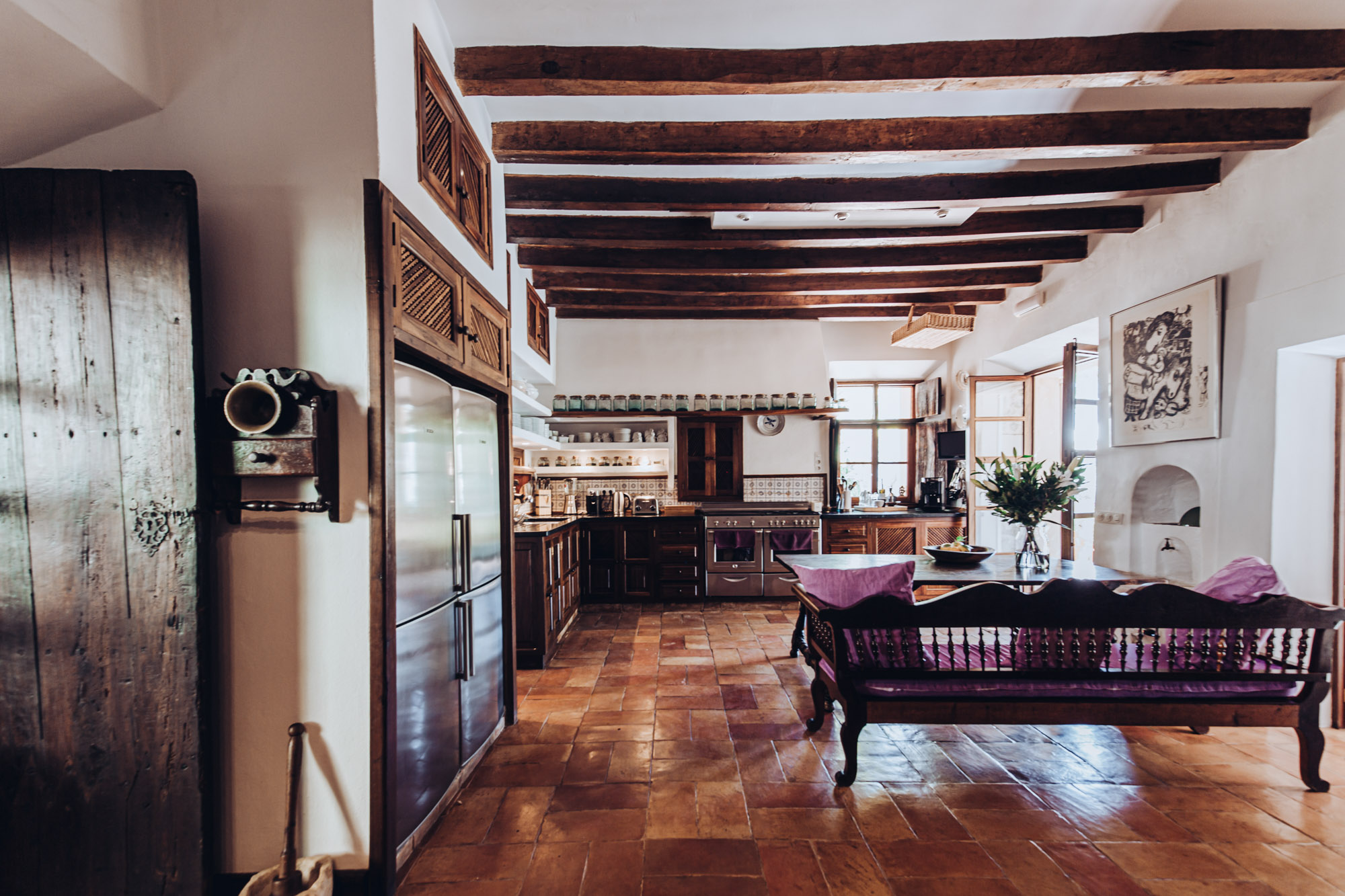 Each ensuite bedroom is equipped with local, organic toiletries. Exposed wooden beams and whitewashed walls give an iconic, rustic farmhouse feel, with white bedding and airy windows that flood each corner with sunshine. There are three kitchens—a client kitchen, an industrial kitchen for chefs/catering, an outdoor kitchen with barbecue, and two additional smaller kitchenettes in each apartment suite. A total of four living rooms provides ample space to unwind, and children will delight in the indoor games and cinema den.