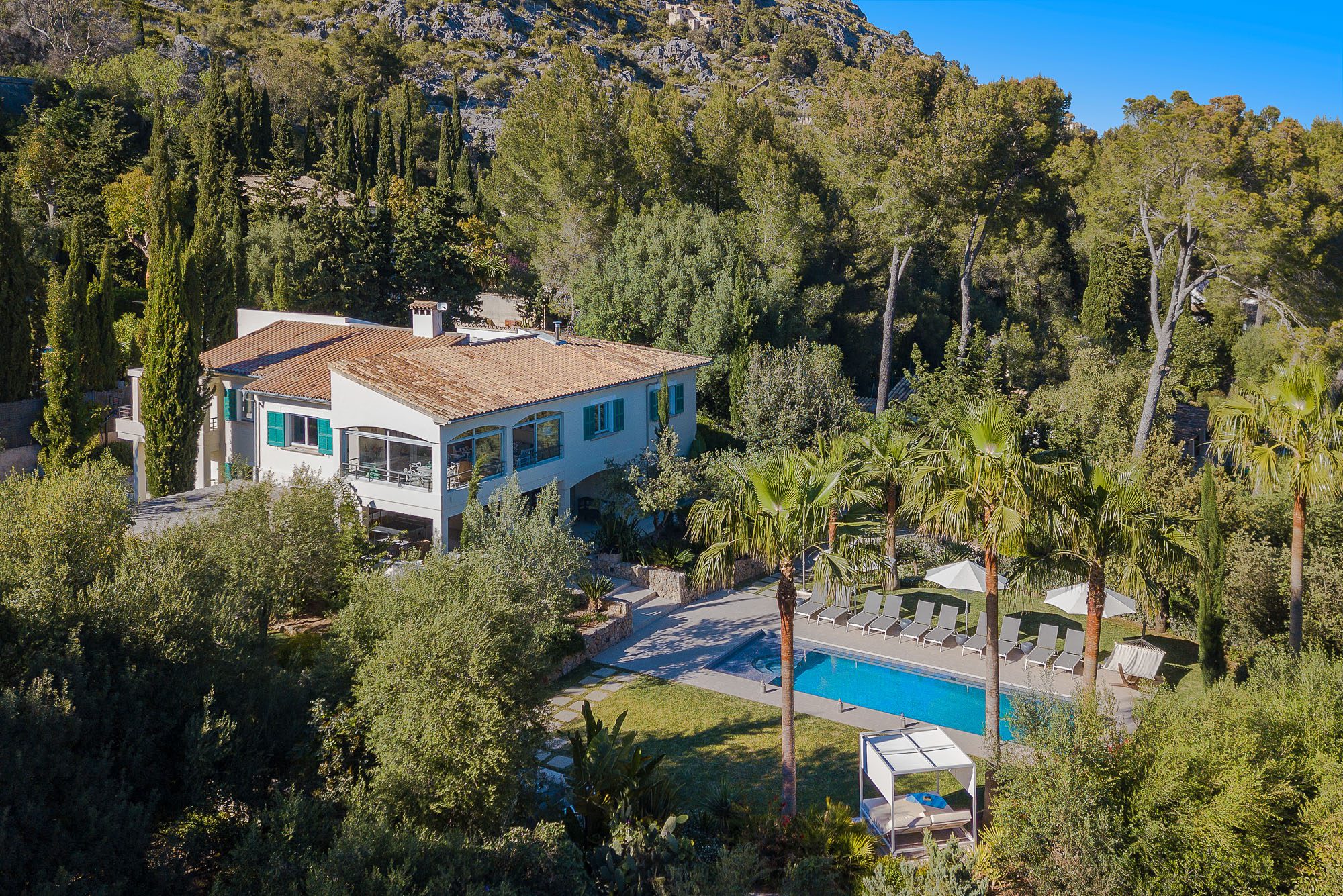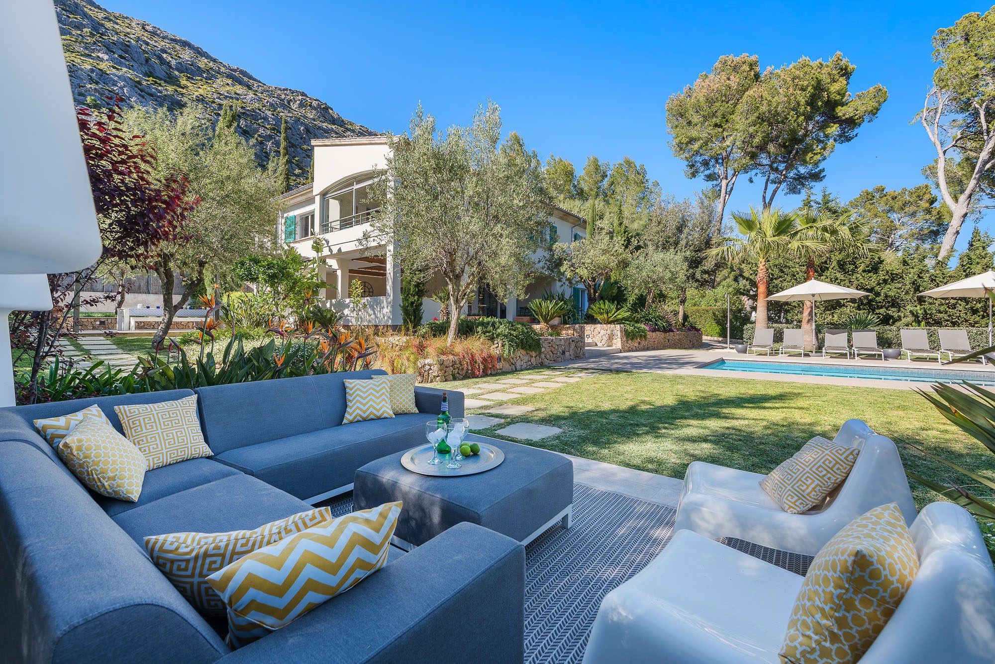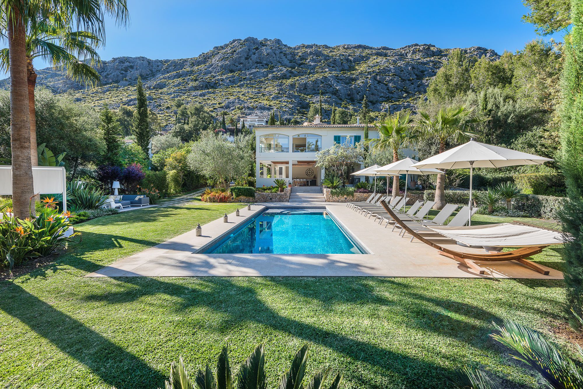 There's a lovely first-floor, light-filled, open-plan sitting room/sunroom/office space with huge windows and balconies at either end. Below, the equally spacious living/dining/kitchen area houses a large dining table, big deep sofas and large doors to the covered terrace. One of the bedrooms, with a private terrace, is on the ground floor, the other four on the first floor, and the one at the rear has a private terrace and mountain views. All bedrooms have stylish en-suite bathrooms.