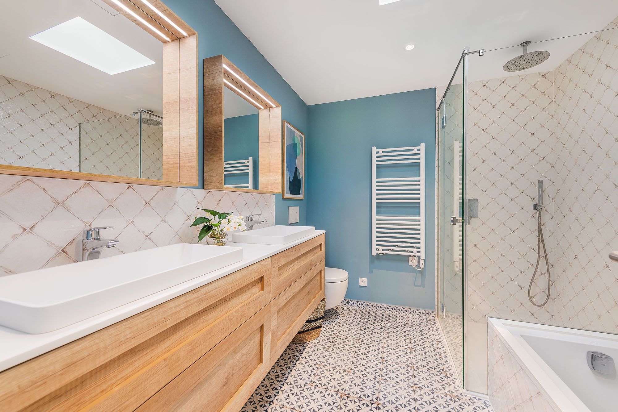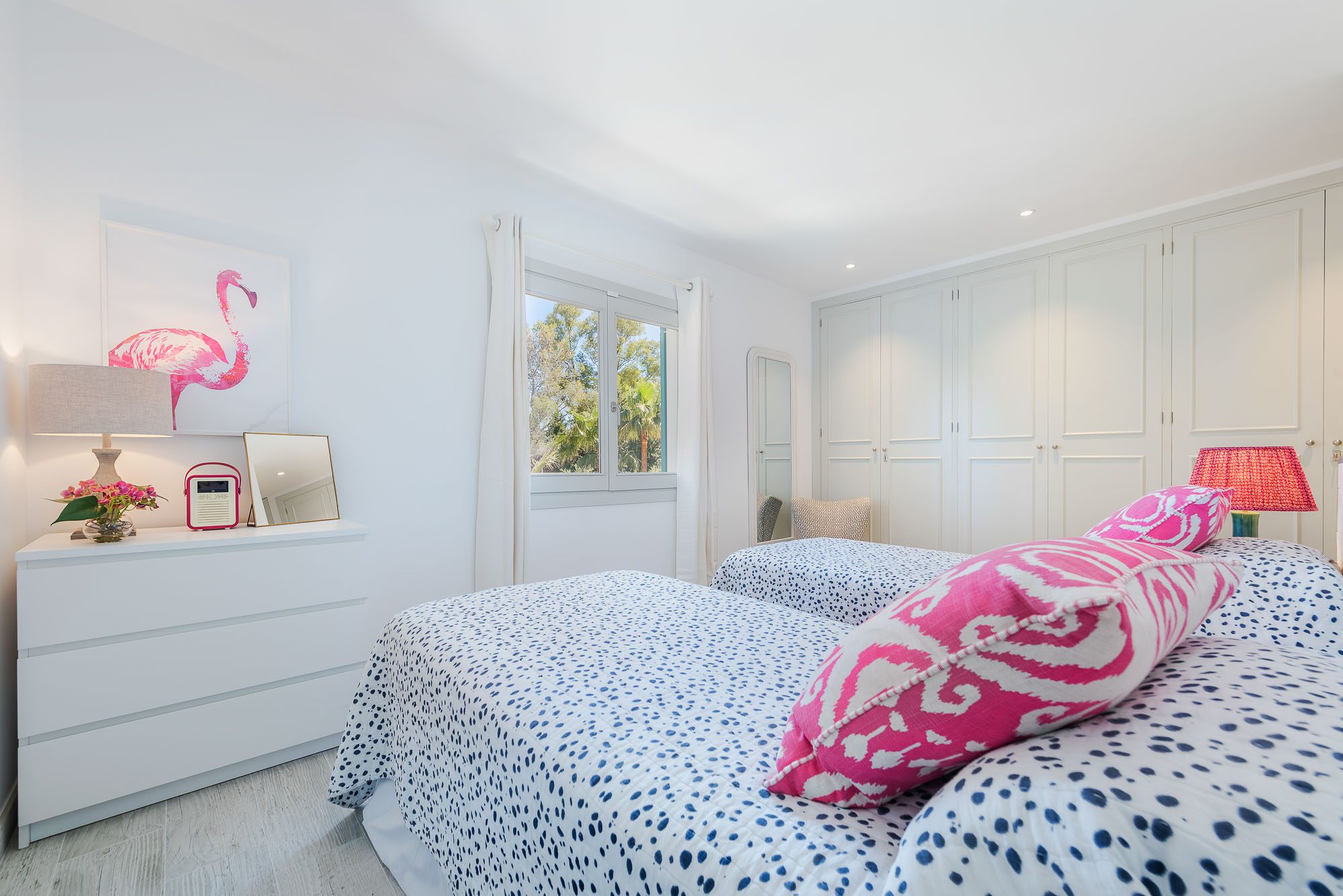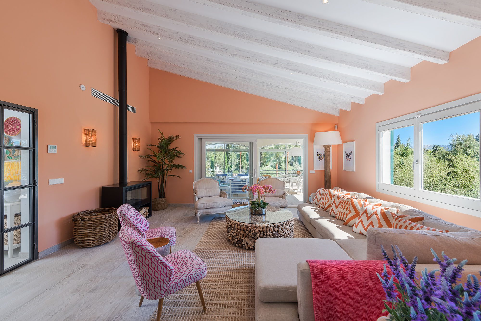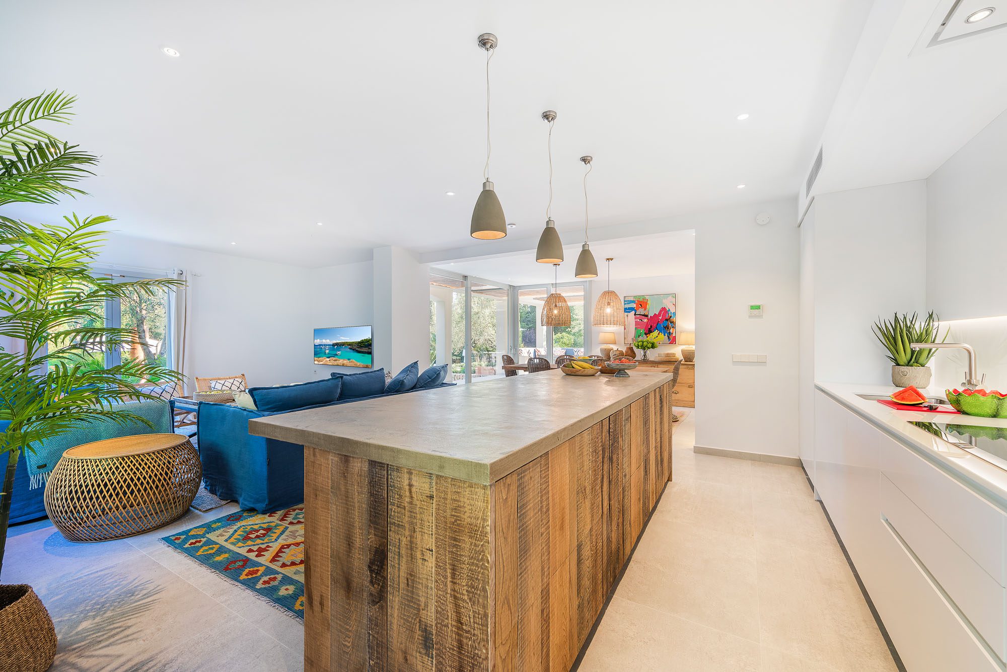 There's a lovely first-floor, light-filled, open-plan sitting room/sunroom/office space with huge windows and balconies at either end. Below, the equally spacious living/dining/kitchen area houses a large dining table, big deep sofas and large doors to the covered terrace. One of the bedrooms, with a private terrace, is on the ground floor, the other four on the first floor, and the one at the rear has a private terrace and mountain views. All bedrooms have stylish en-suite bathrooms.