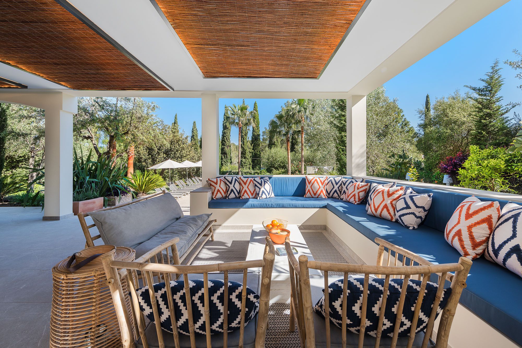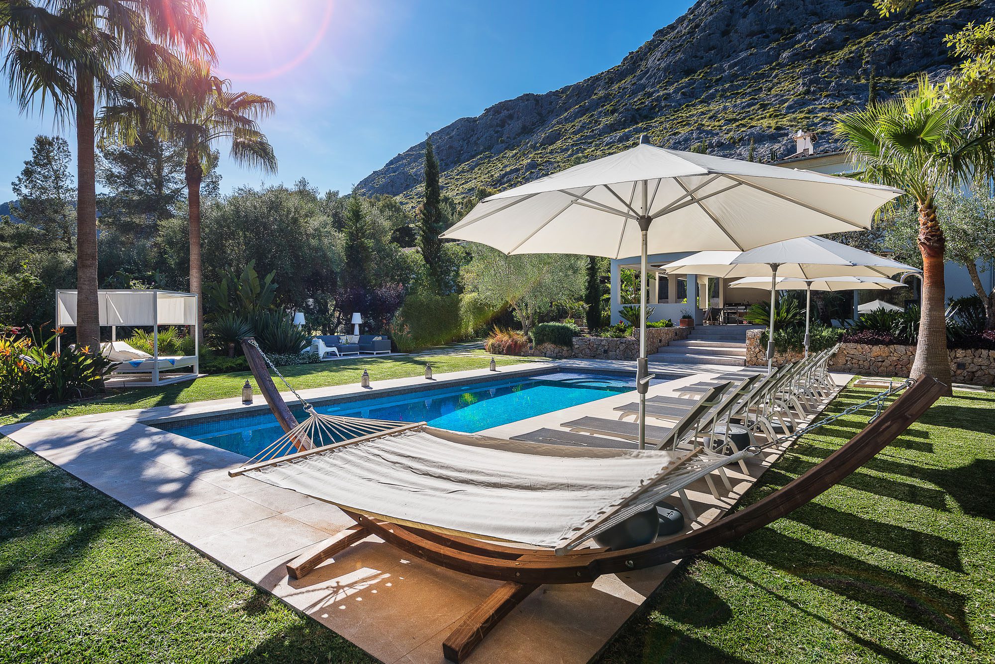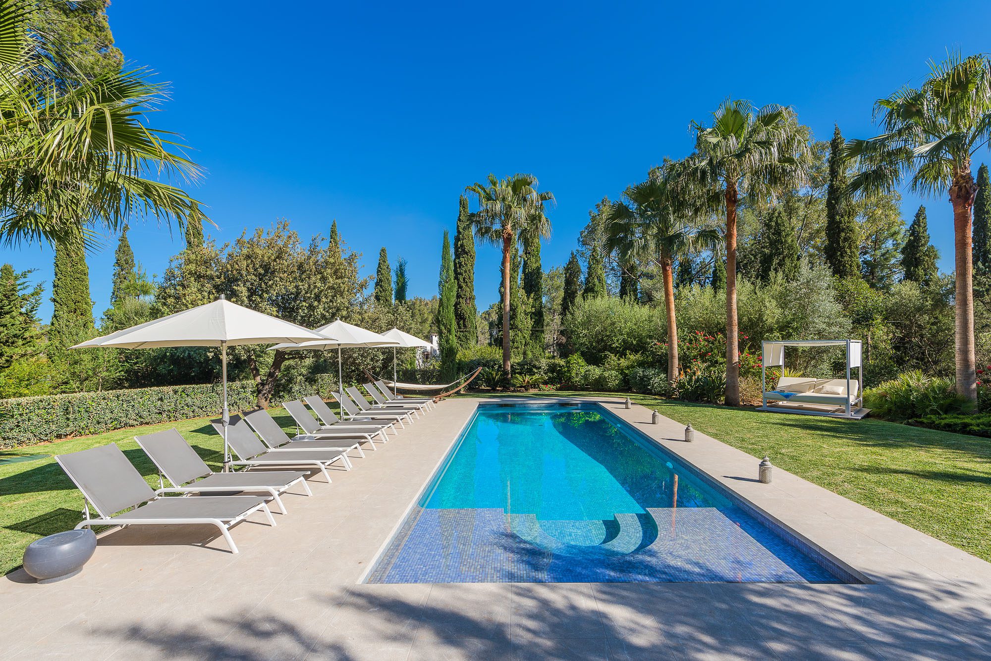 A pergola shades a dining table and benches for up to 20 people. The garden is laid out with lawns, large palm trees, and exotic plants. Sunbeds, a teak hammock, and a daybed sit on the terrace surrounding the 11-meter pool. A further outdoor lounge area is tucked away in the garden. There are lots of sporting opportunities nearby, from tennis and golf to watersports, cycling, and hiking, as well as a basketball hoop in the garden.