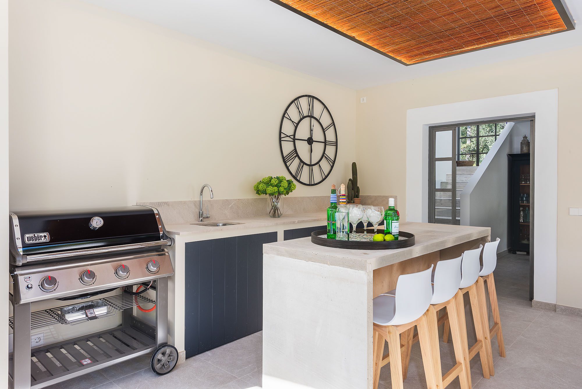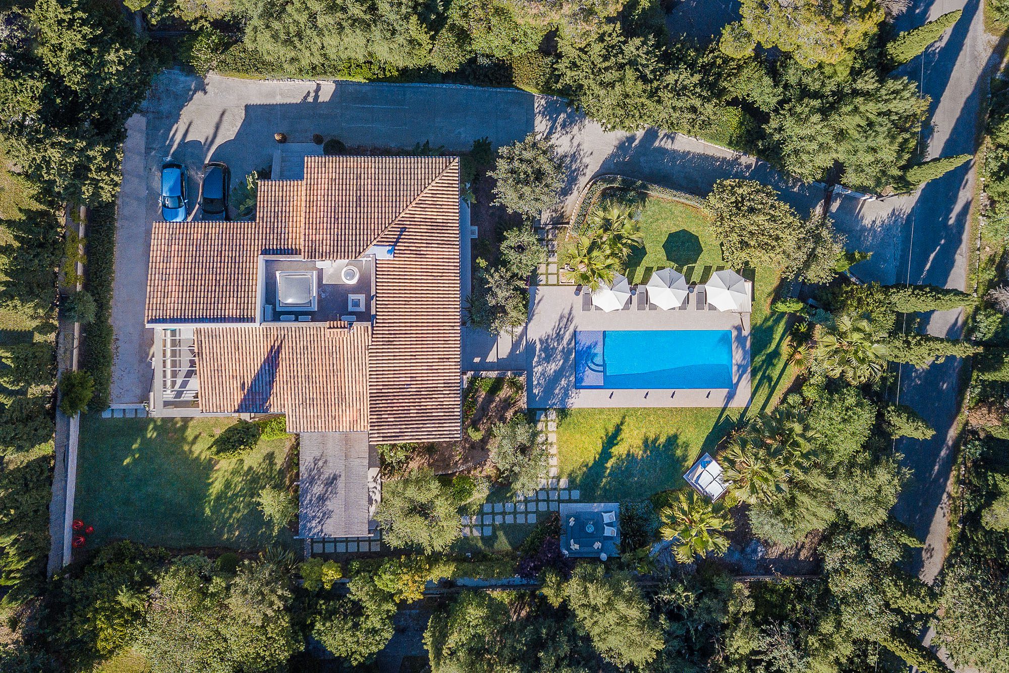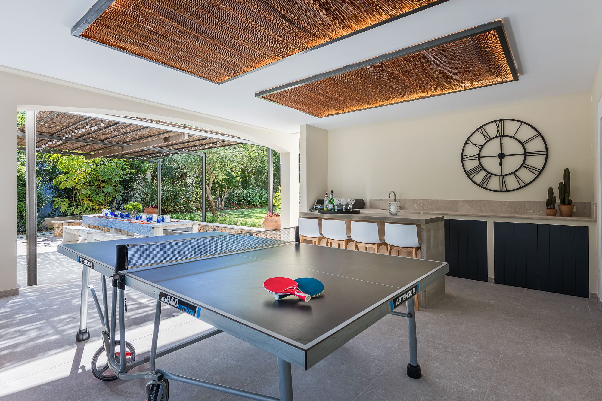 A pergola shades a dining table and benches for up to 20 people. The garden is laid out with lawns, large palm trees, and exotic plants. Sunbeds, a teak hammock, and a daybed sit on the terrace surrounding the 11-meter pool. A further outdoor lounge area is tucked away in the garden. There are lots of sporting opportunities nearby, from tennis and golf to watersports, cycling, and hiking, as well as a basketball hoop in the garden.