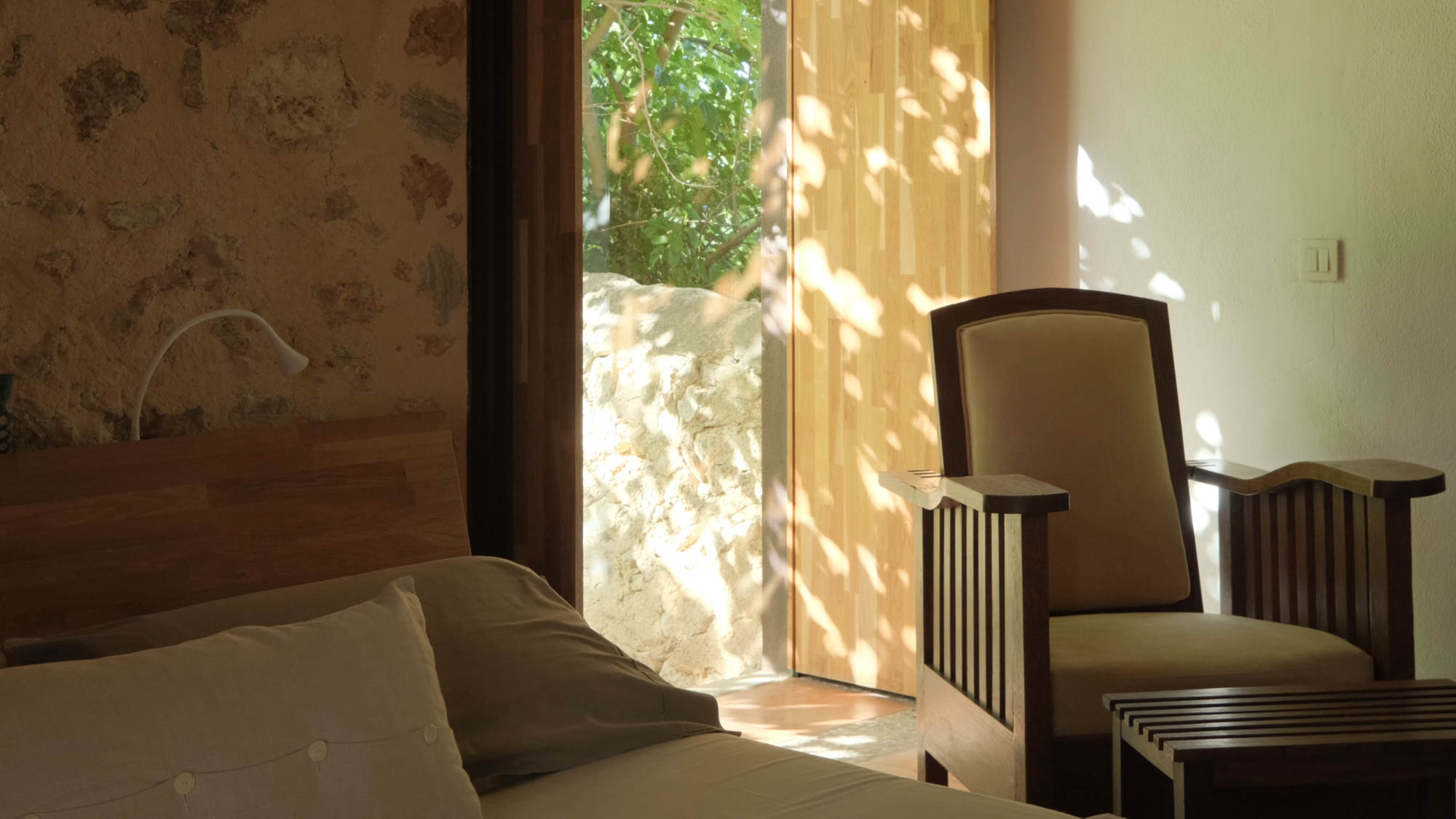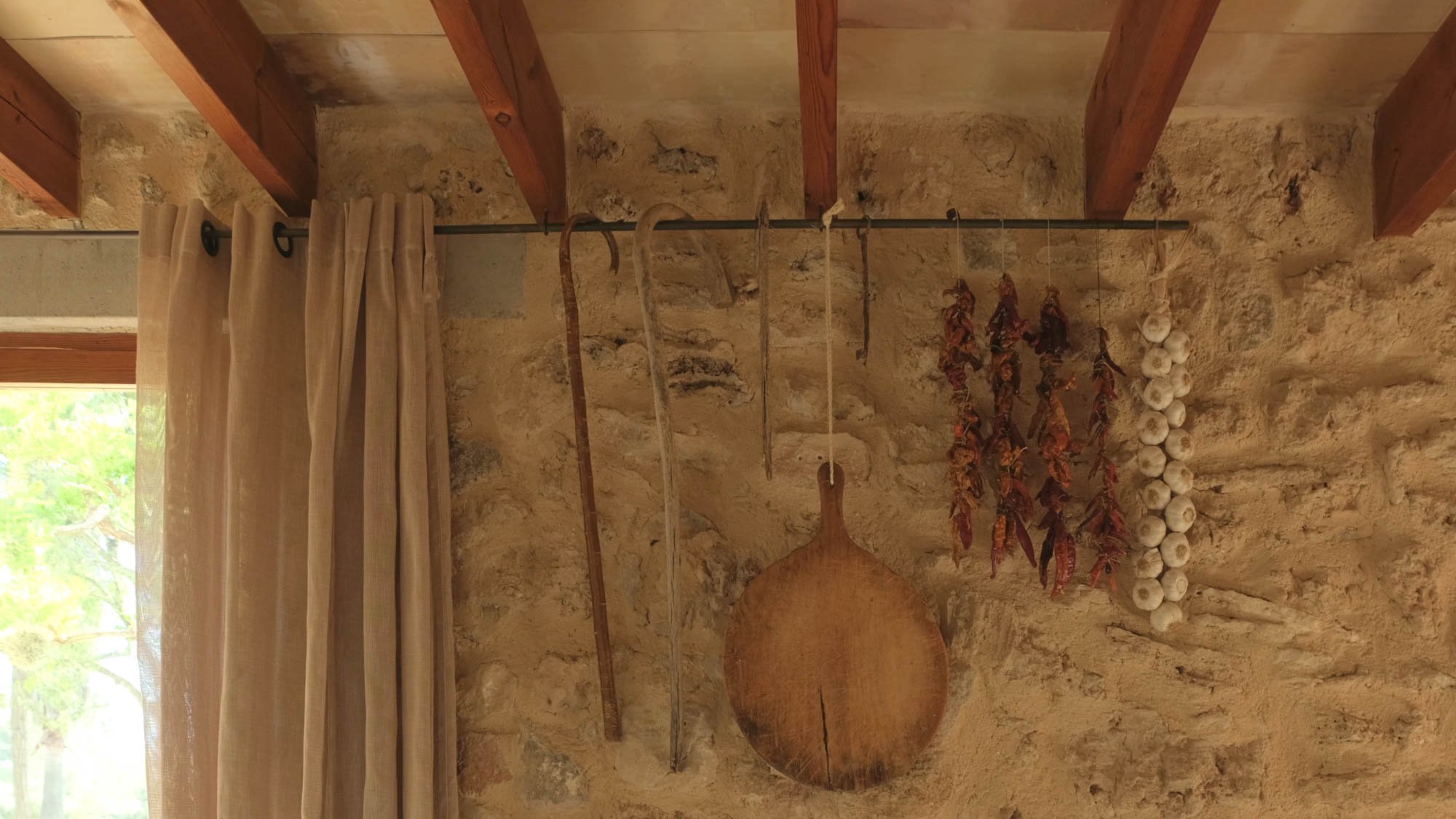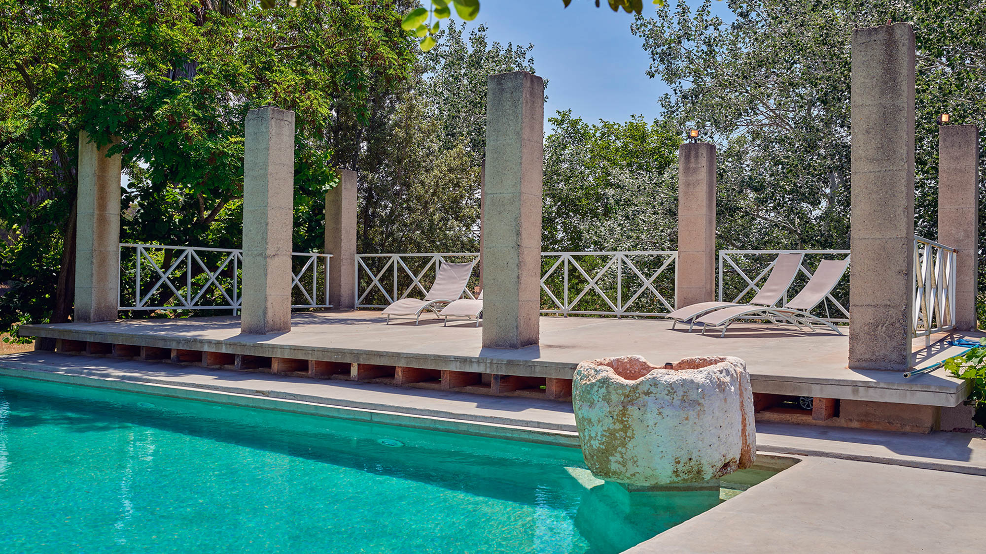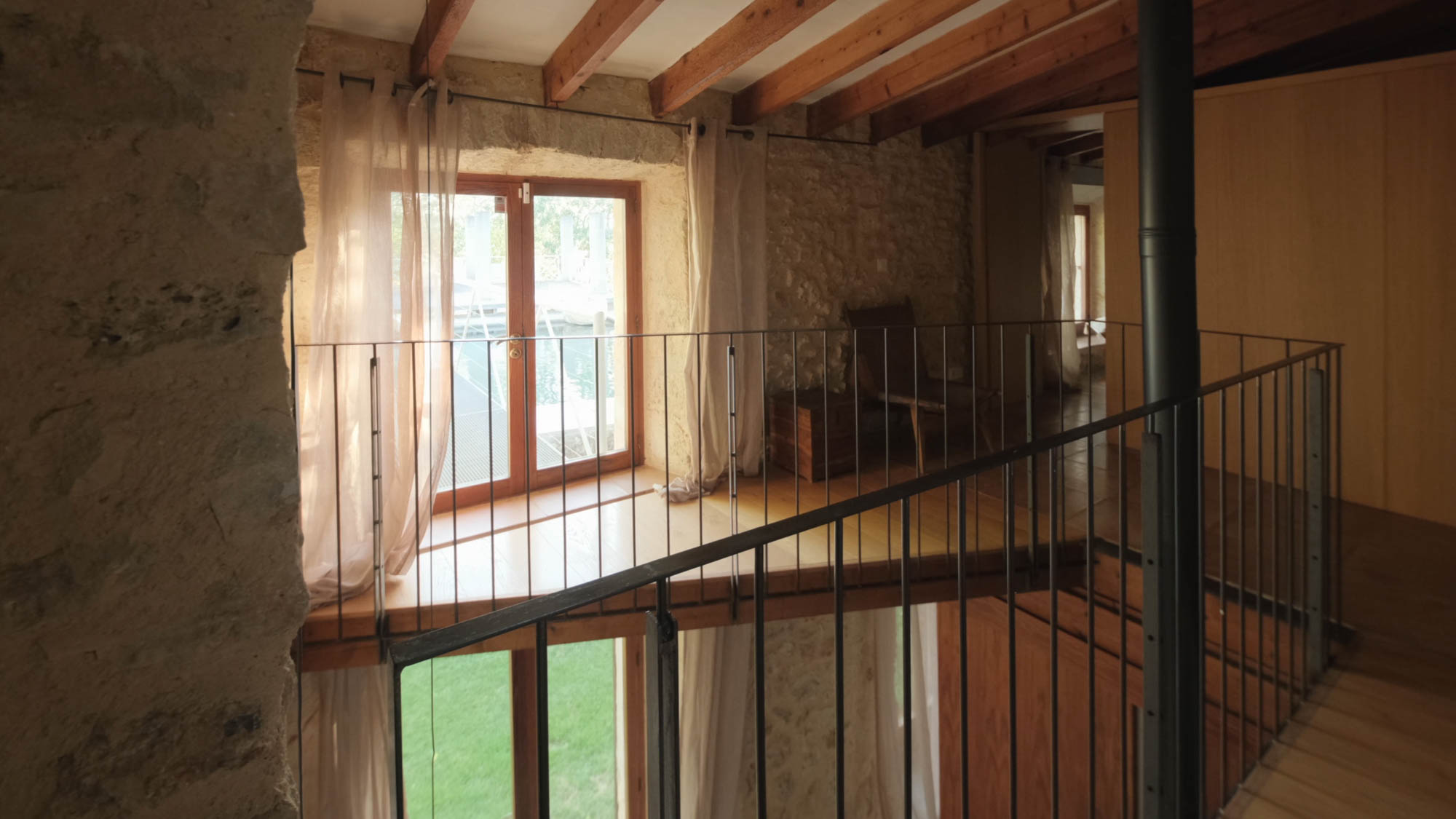 It's an architecturally interesting house created from the restoration of rustic farm buildings. The innovative use of old and new materials is evident; the waterwheel survives, and the original irrigation pool has been transformed into a spectacular swimming pool. It's a place of both great style and wonderful tranquillity.